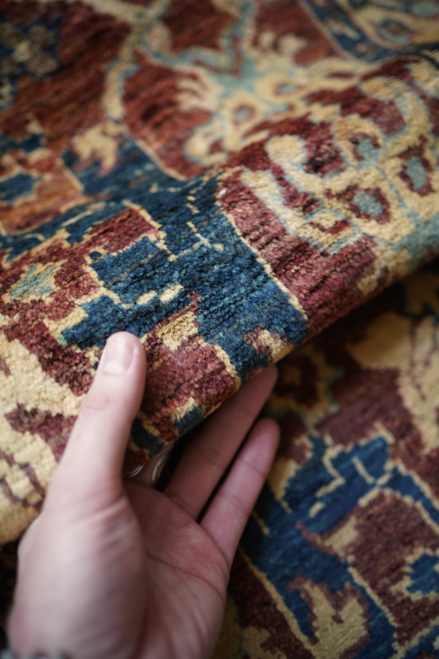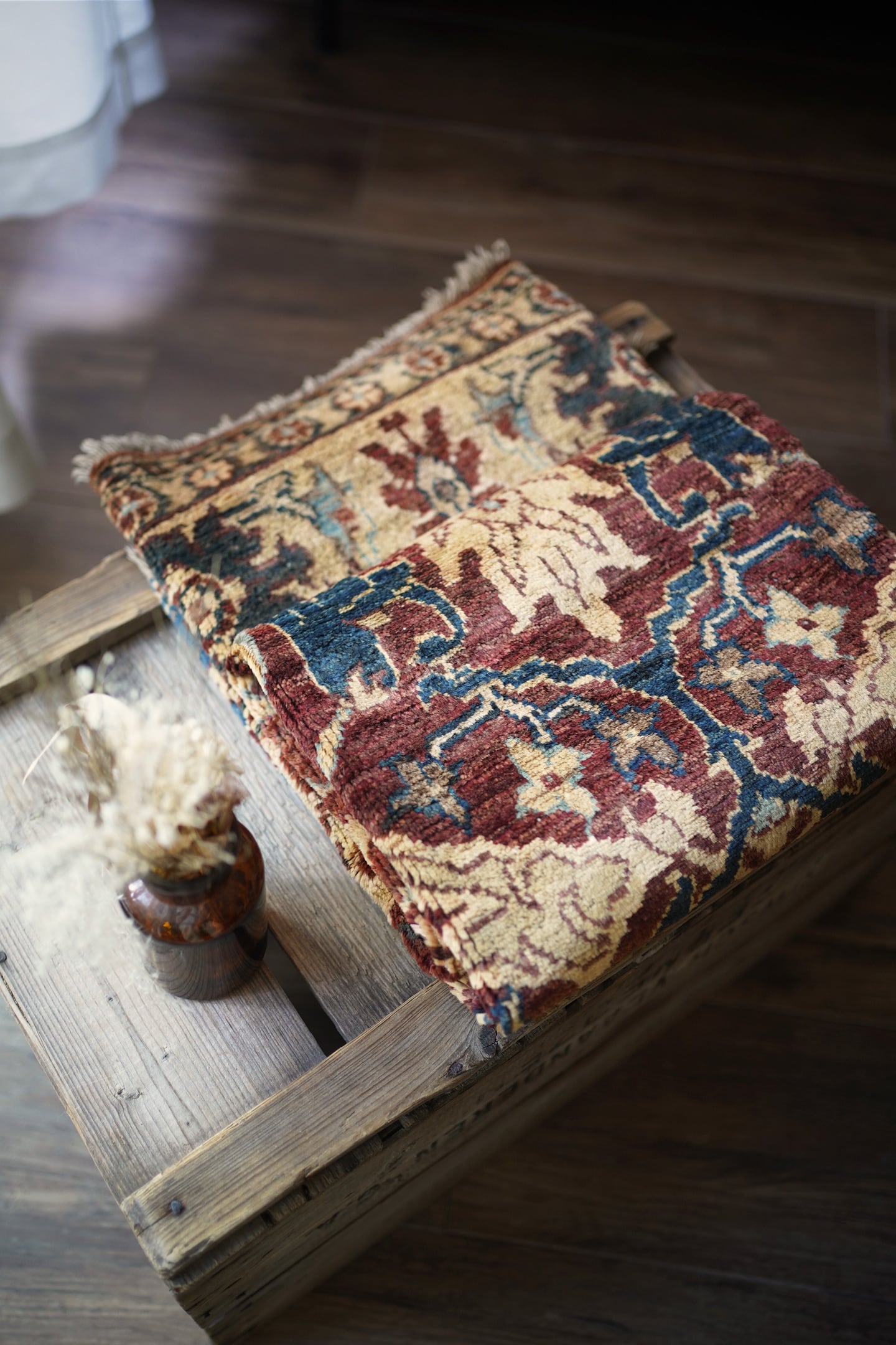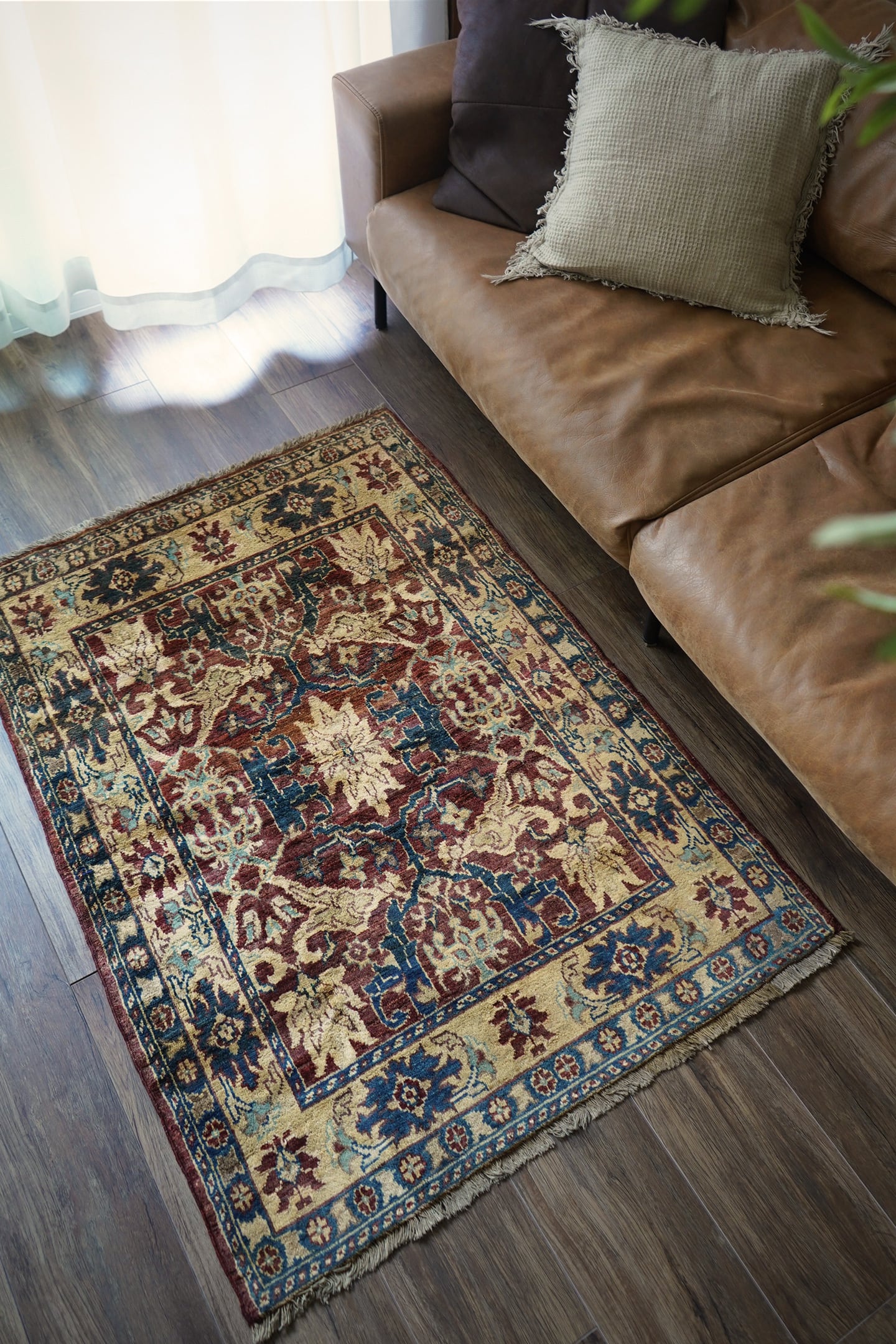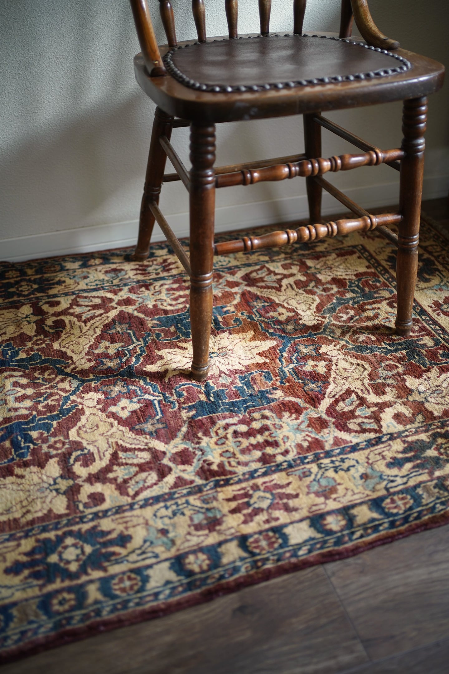 エレガントな花モチーフのデザインが目を惹くアフガニスタンの首都カブールで織られたラグです。少しオレンジが入ったベージュ、暗いエメラルドグリーン、ブラウン、水色などの珍しい配色の掛け合わせが非常に魅力的です。キャビネットや大きめのラック前などに敷くとお気に入りのスペースをより一層華やかに彩ってくれるかと思います。表面はふわっと滑らかな優しい肌触りをしており、厚みは5mm程度。ほんの少しだけ手織り特有の歪みがあり、台形っぽい形になります(ゆらぎを感じられて、素敵な愛着ポイントになってくれるかと思います)。目立ったダメージや補修された跡も見受けられず良好なコンディション。パーソナルチェア(1人掛けチェア)と合わせても良さそうですね♫
