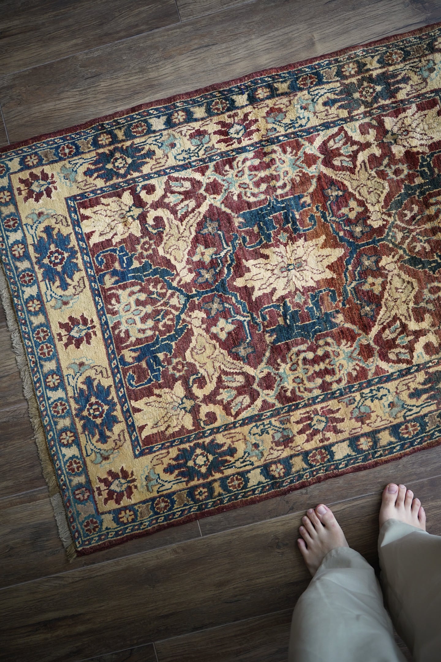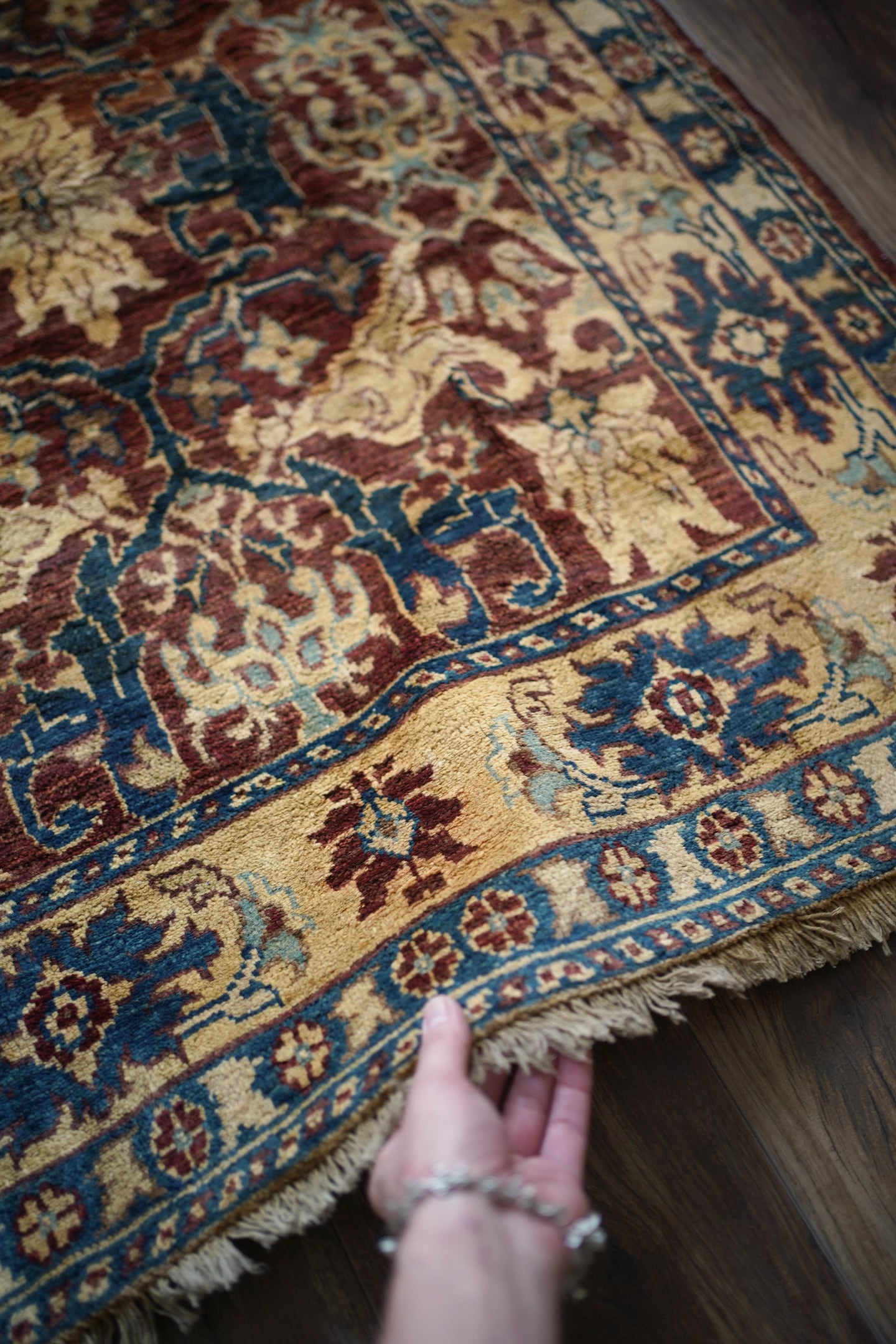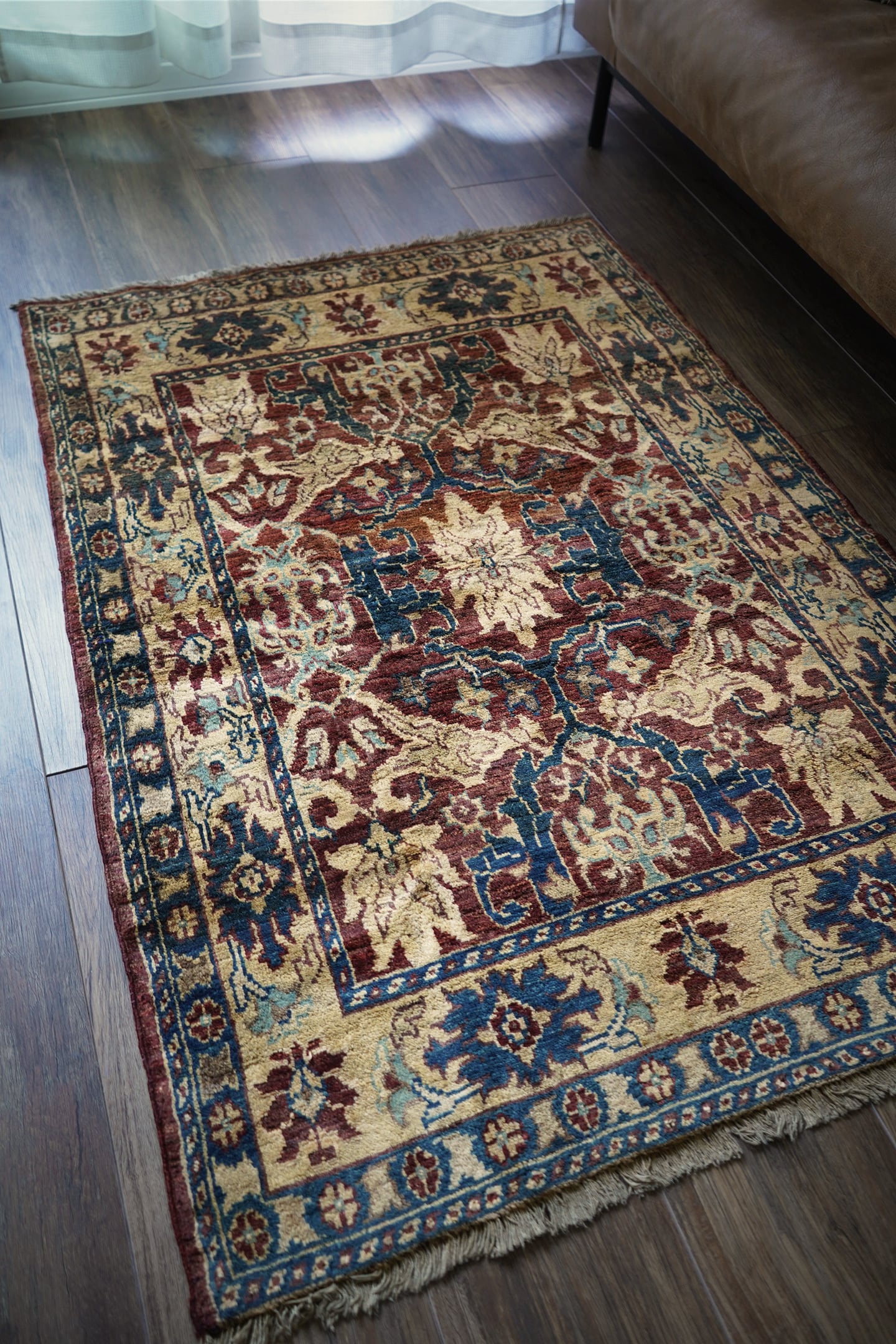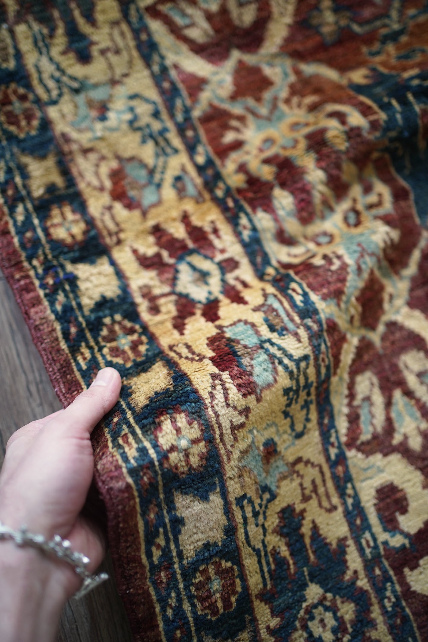エレガントな花モチーフのデザインが目を惹くアフガニスタンの首都カブールで織られたラグです。少しオレンジが入ったベージュ、暗いエメラルドグリーン、ブラウン、水色などの珍しい配色の掛け合わせが非常に魅力的です。キャビネットや大きめのラック前などに敷くとお気に入りのスペースをより一層華やかに彩ってくれるかと思います。表面はふわっと滑らかな優しい肌触りをしており、厚みは5mm程度。ほんの少しだけ手織り特有の歪みがあり、台形っぽい形になります(ゆらぎを感じられて、素敵な愛着ポイントになってくれるかと思います)。目立ったダメージや補修された跡も見受けられず良好なコンディション。パーソナルチェア(1人掛けチェア)と合わせても良さそうですね♫