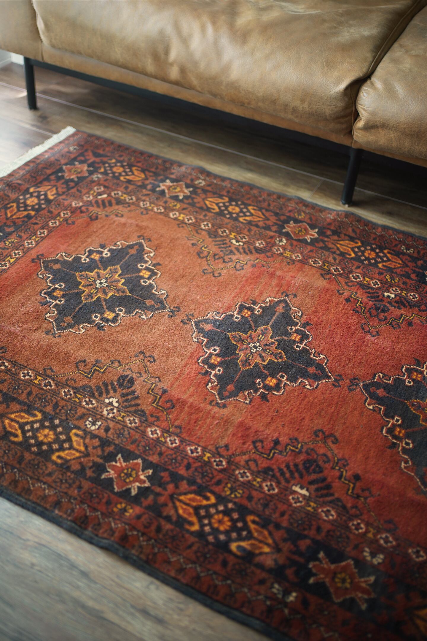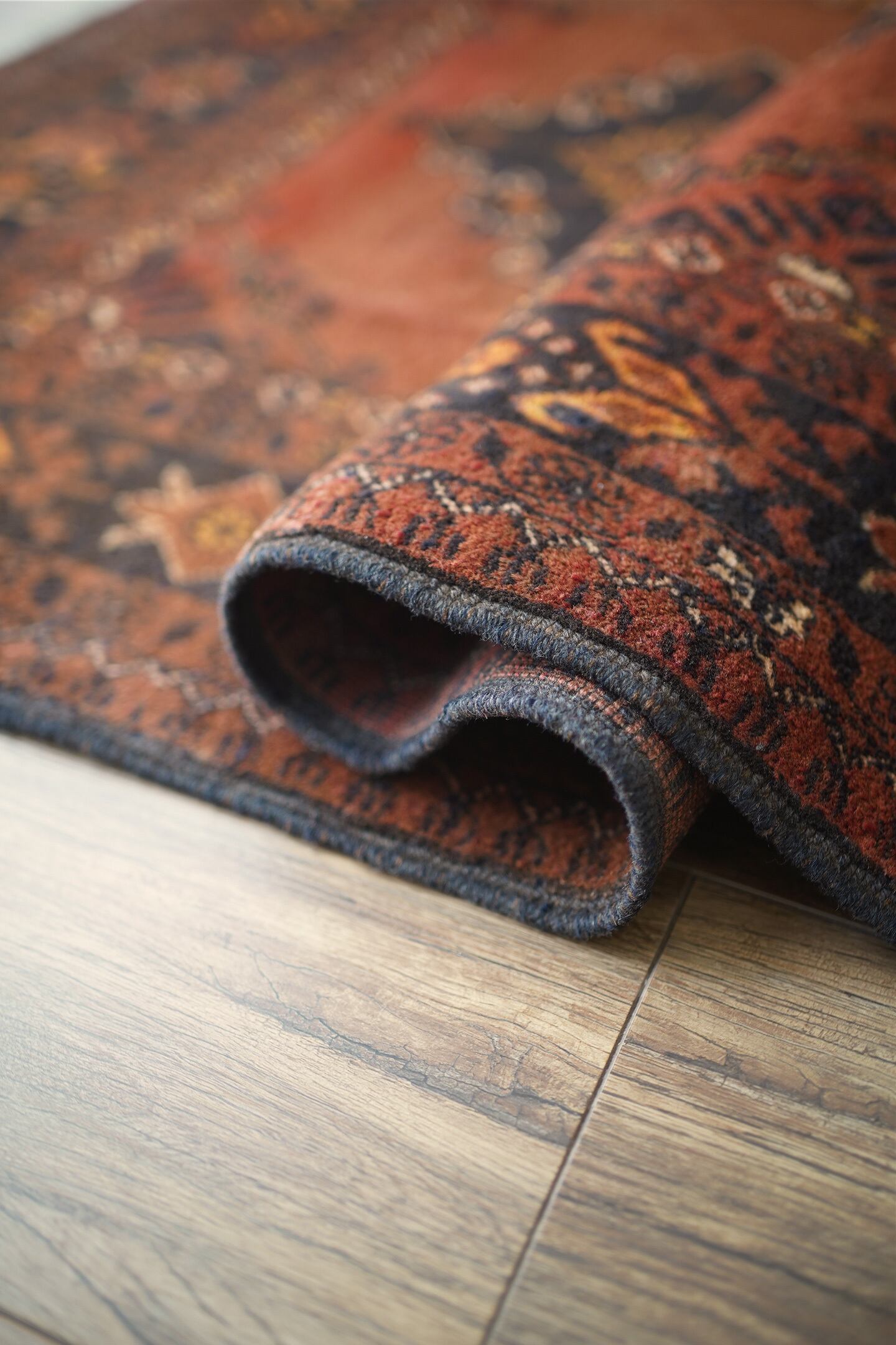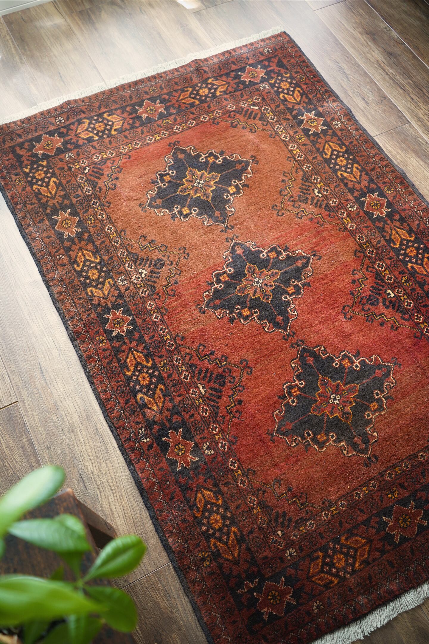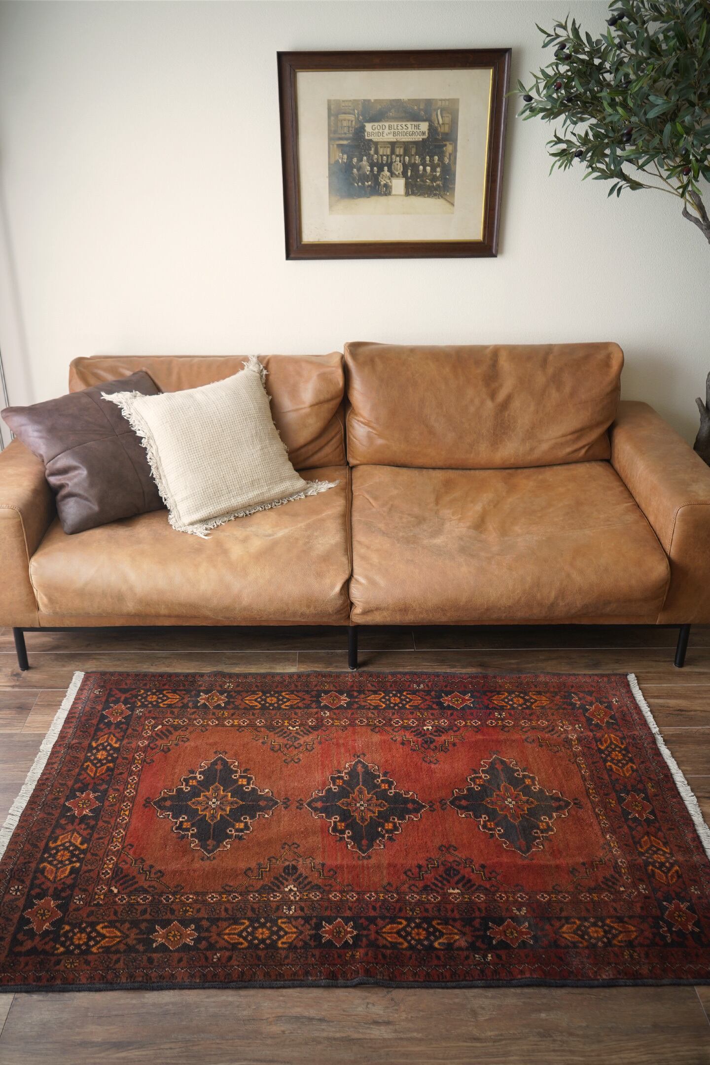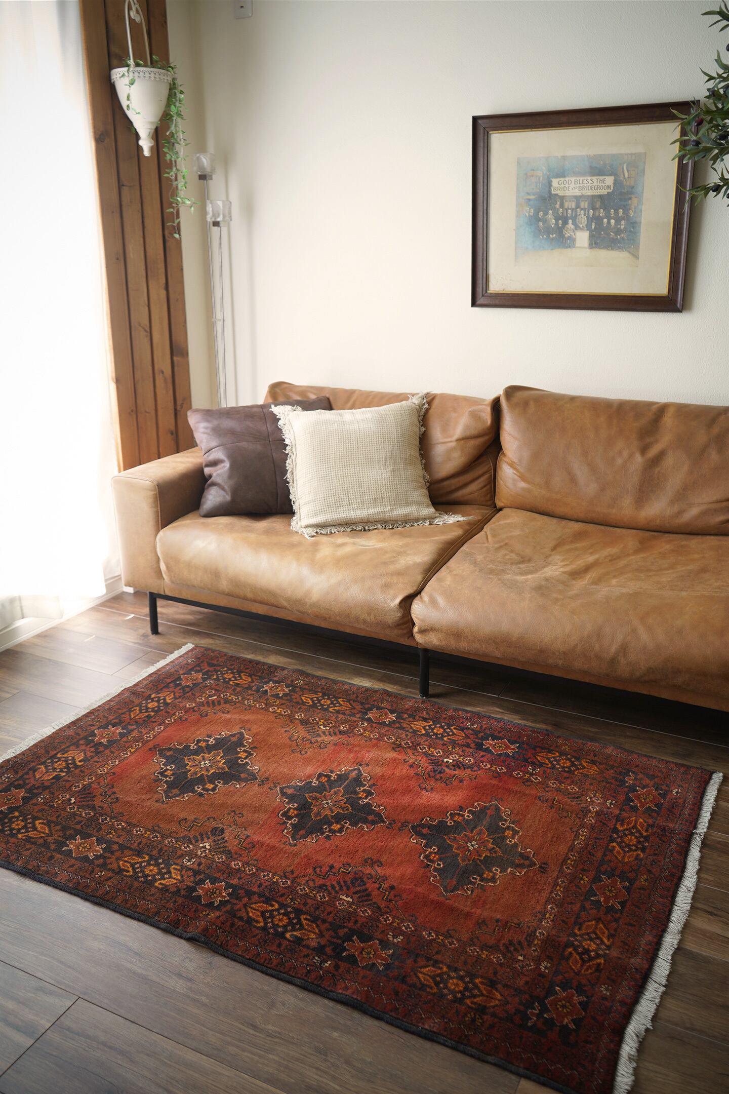 約40年ほど前に織られたアフガニスタン産のトルクメンラグ。"カル・モハマディ(khal mohammadi)"と呼ばれるデザインで、赤いラグの力強さを感じさせつつも、落ち着いた雰囲気が非常に魅力的です。三連メダリオンとボーダーのバランスが取れており、お部屋のインテリアとも合わせやすい印象の一枚です。深い赤茶色、ブラック、オレンジの配色で、ヴィンテージを感じる風合いなのでアンティーク家具とコーディネートしても大変素敵かと思います。表面はサラふわっとした肌触りで、厚みは7mm程度。トルクメン特有のずっしりした重みのある堅牢な作りをしています。状態はダメージや補修跡も見受けられずグッドコンディション。落ち着いた赤い色味のラグをお探しの方にオススメです。