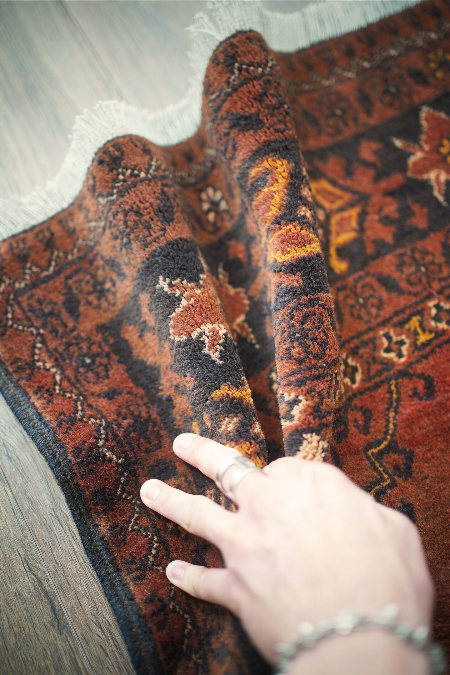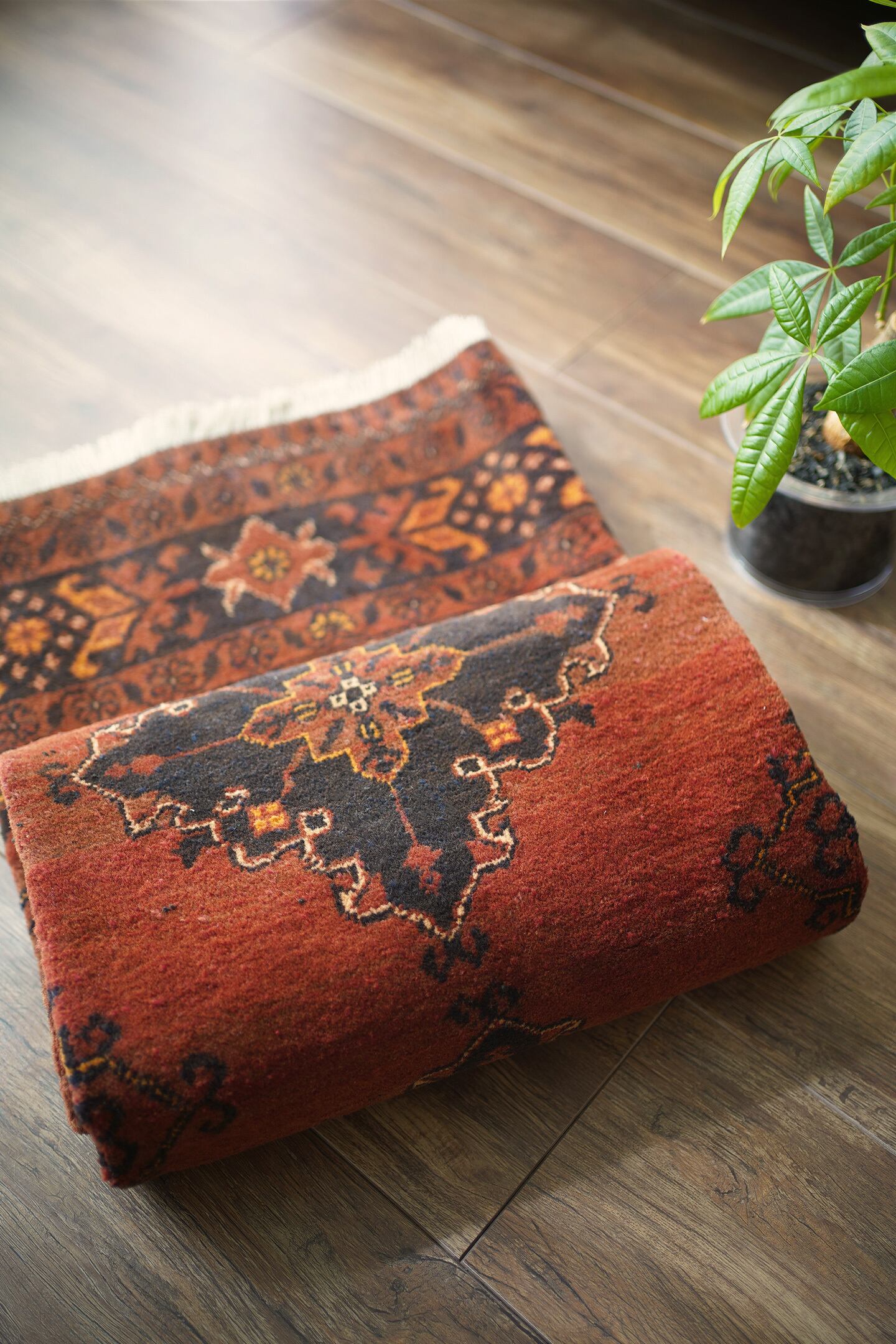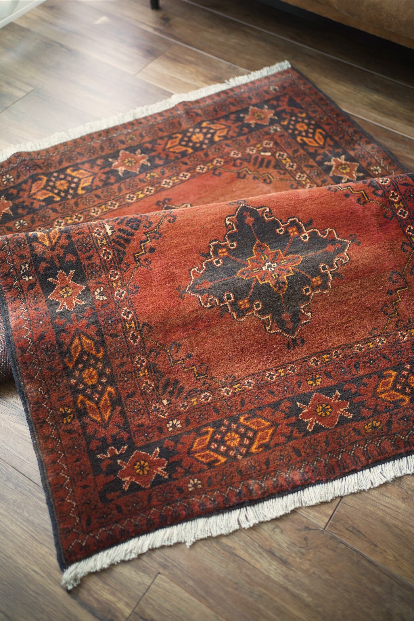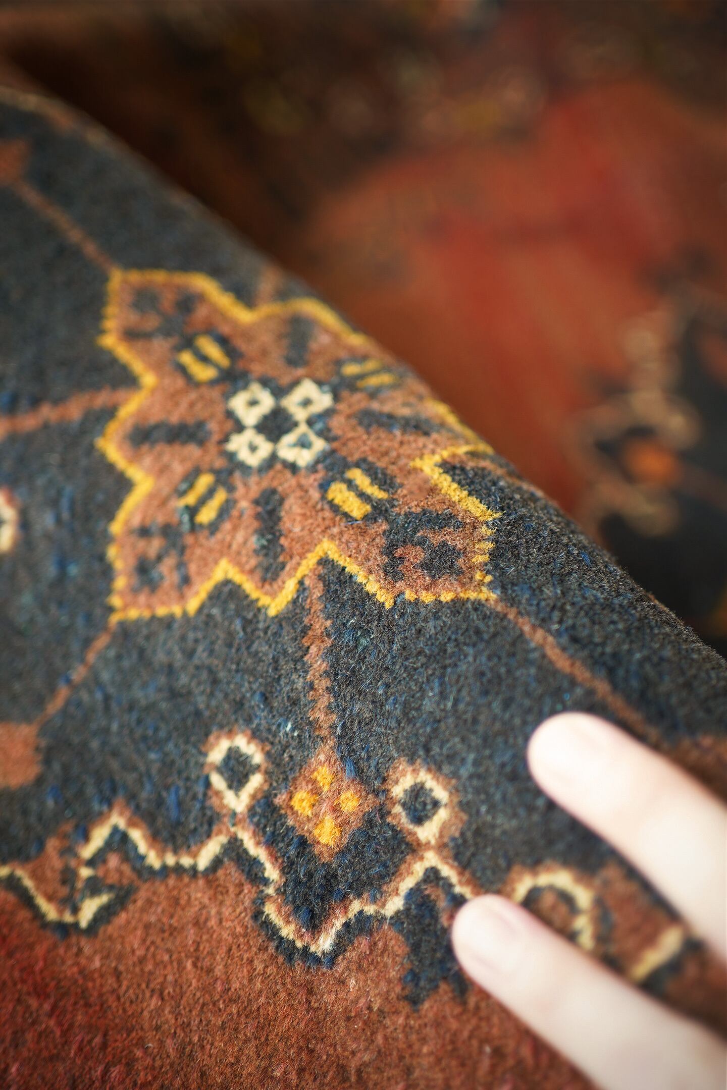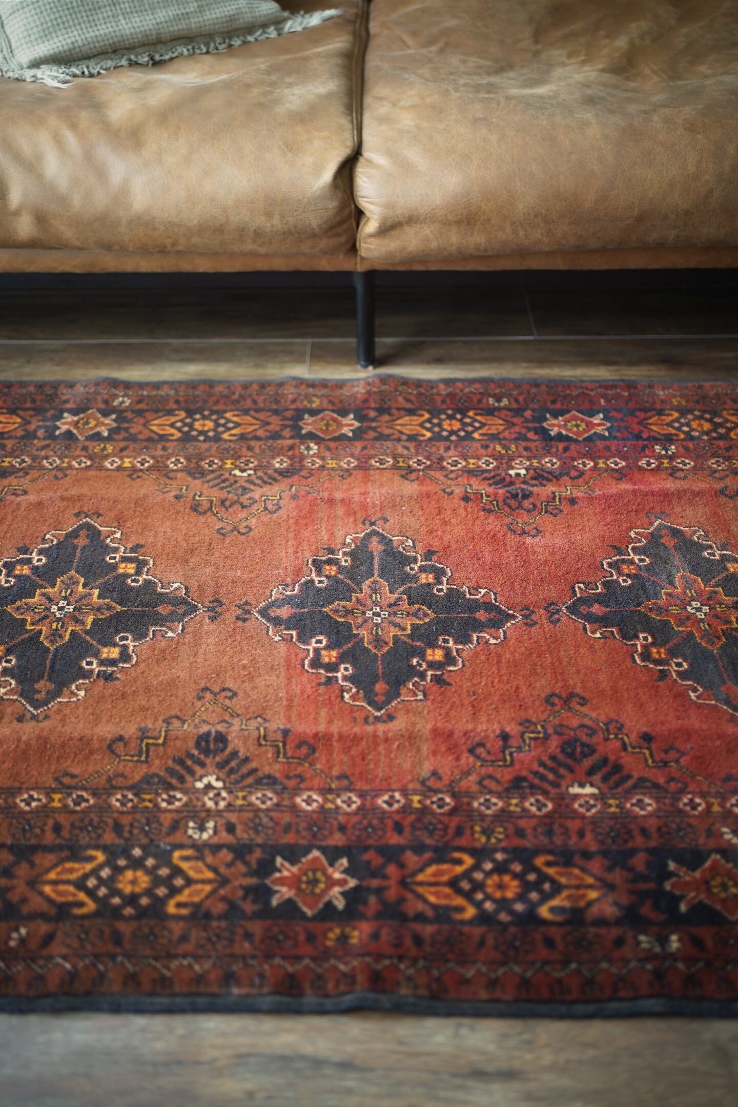 約40年ほど前に織られたアフガニスタン産のトルクメンラグ。"カル・モハマディ(khal mohammadi)"と呼ばれるデザインで、赤いラグの力強さを感じさせつつも、落ち着いた雰囲気が非常に魅力的です。三連メダリオンとボーダーのバランスが取れており、お部屋のインテリアとも合わせやすい印象の一枚です。深い赤茶色、ブラック、オレンジの配色で、ヴィンテージを感じる風合いなのでアンティーク家具とコーディネートしても大変素敵かと思います。表面はサラふわっとした肌触りで、厚みは7mm程度。トルクメン特有のずっしりした重みのある堅牢な作りをしています。状態はダメージや補修跡も見受けられずグッドコンディション。落ち着いた赤い色味のラグをお探しの方にオススメです。