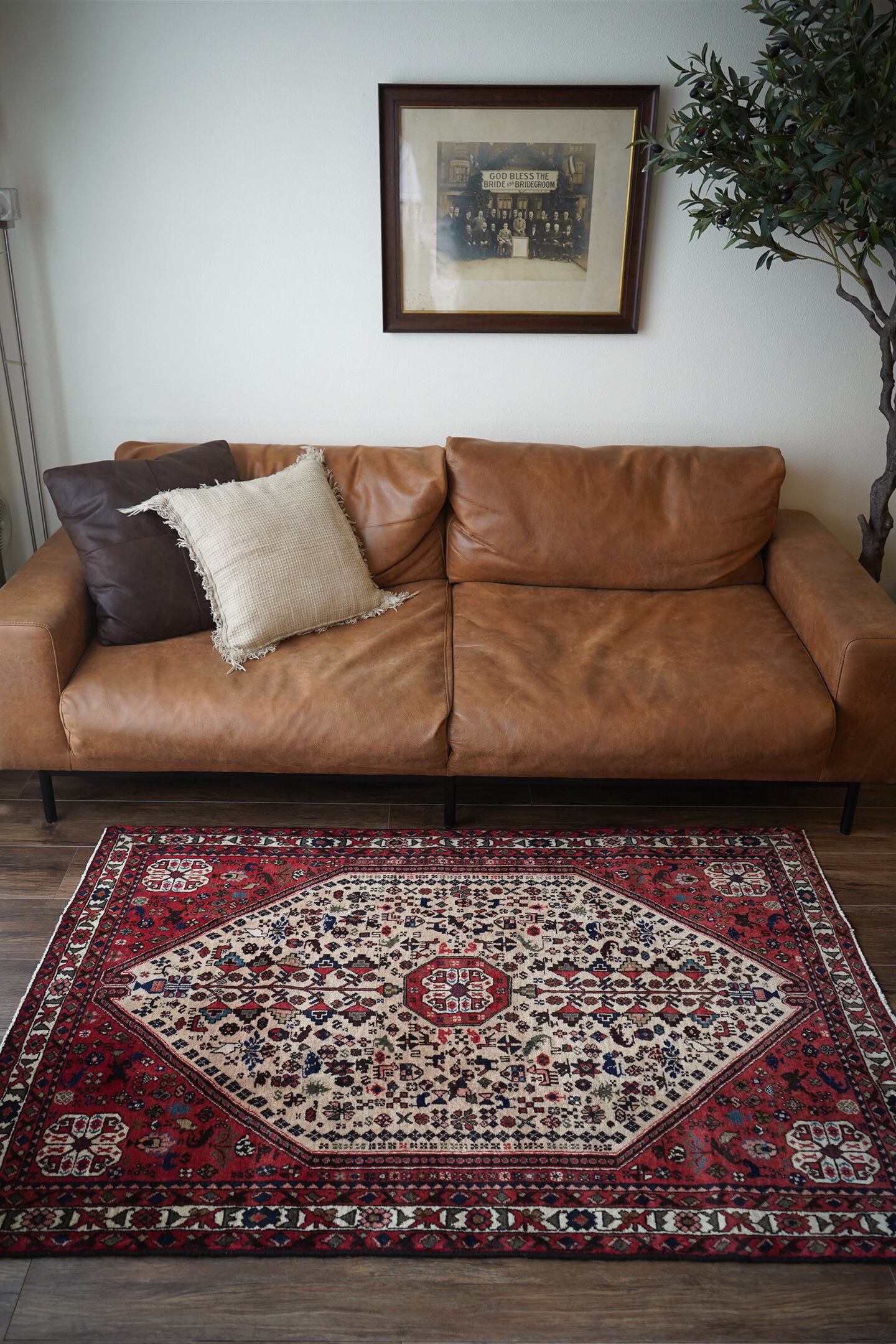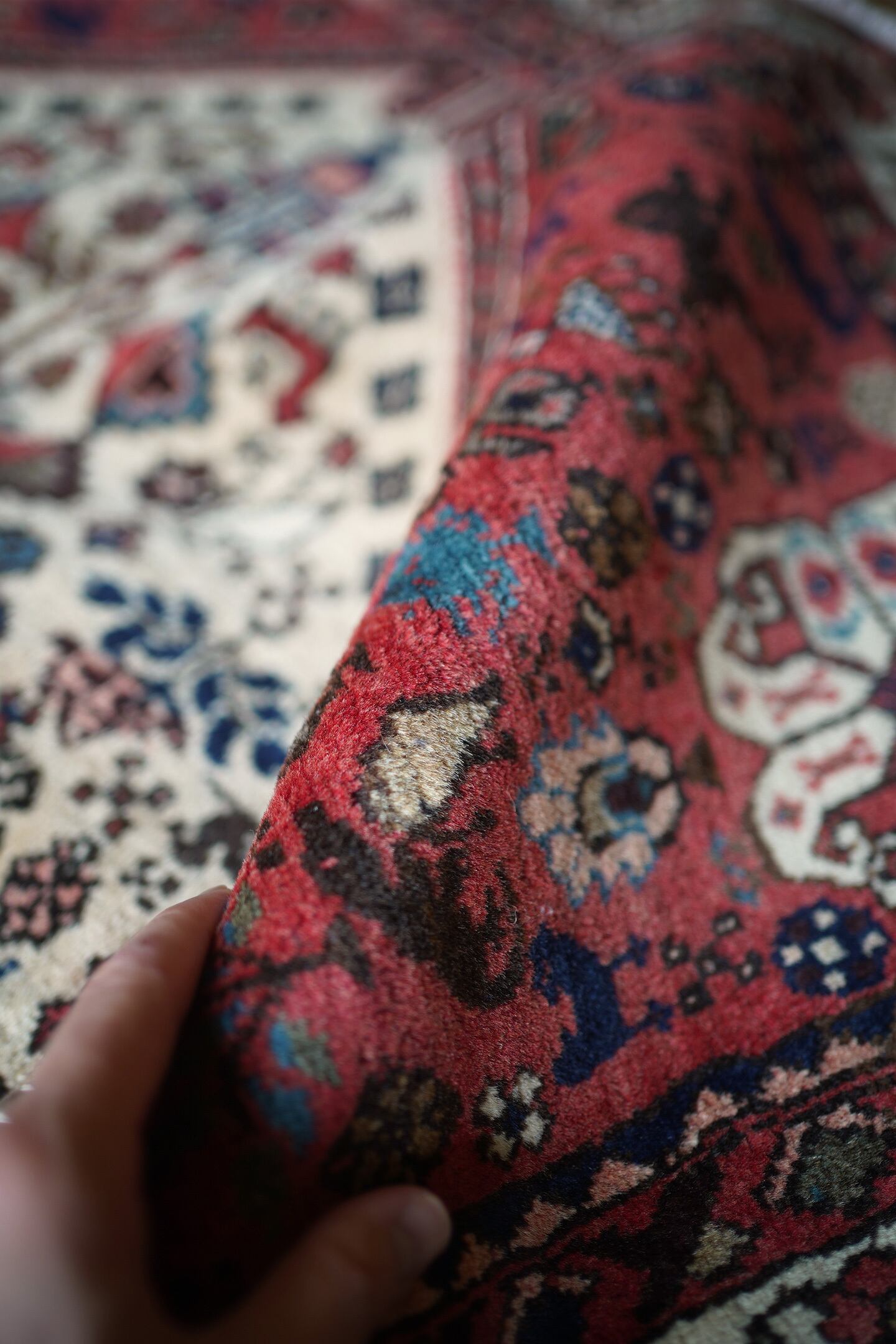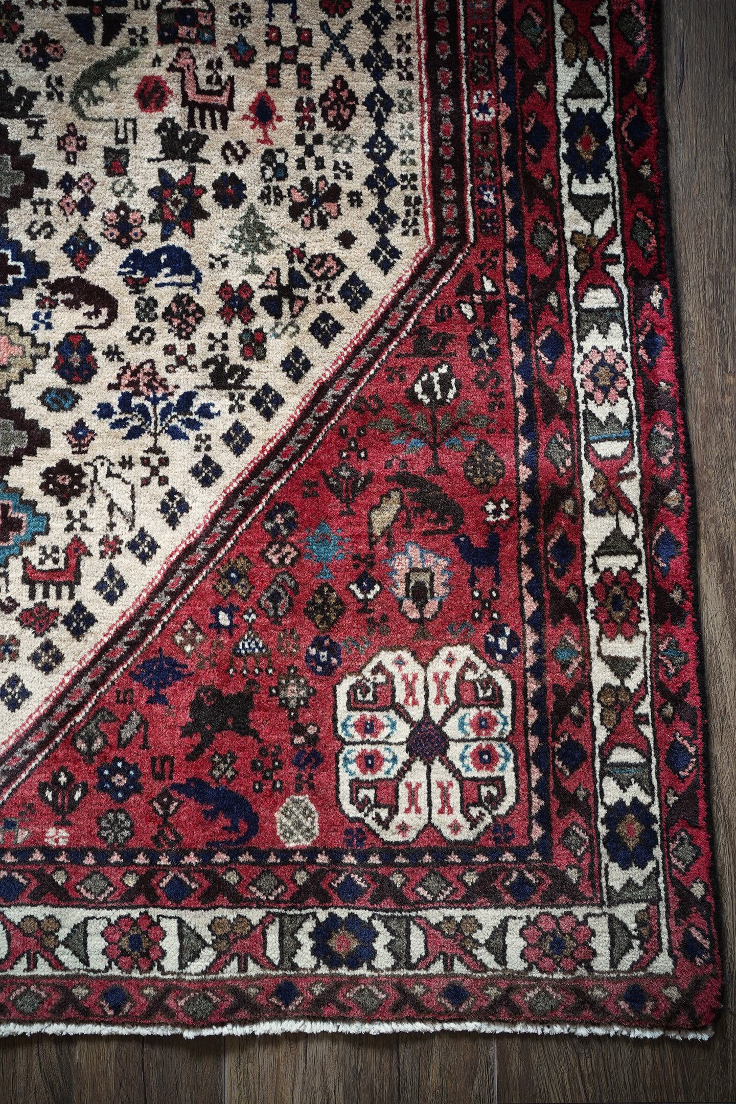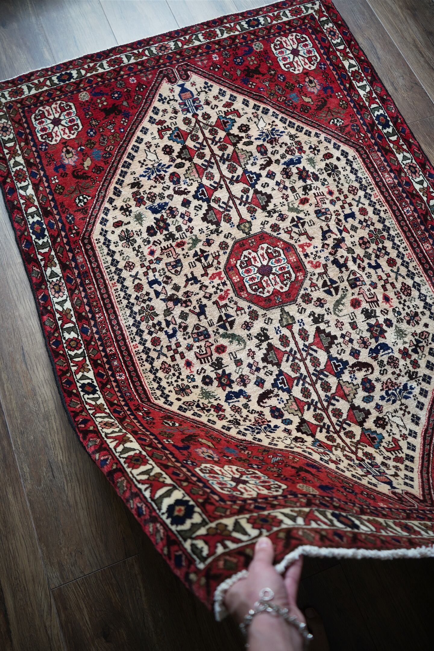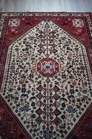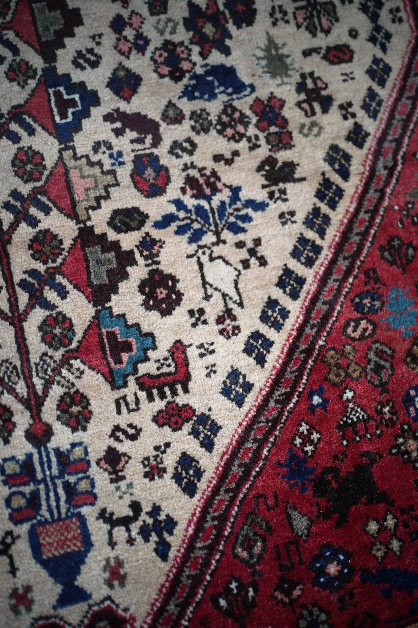 イランのイスファハーンとシラーズの中間に位置するアバデ産のペルシャラグです。繊細に織り込まれた可愛らしい動物の紋様が所狭しと散りばめられたデザインで、眺めているだけでワクワクしてくる素敵な一枚。小鳥をはじめ、馬のような動物や尻尾のある爬虫類のような動物などが描かれており、どんな動物が描かれているのかなと探すのも楽しいです。また花の模様も細かなディテールで織り込まれているなど細部までこだわって作られているのが伝わってきます。配色は朱色から赤へのグラデーションで、中央はベージュ、その他に薄いピンクや濃紺、焦茶、エメラルドグリーンなどがアクセントカラーとして使われています。パイルは短めながら、ソフトウールでもちっと柔らかく大変気持ちの良い肌触り。フラットに整った毛並みで上質感があります。厚みは8mm程度。ダメージもなくパーフェクトなコンディション。デザイン、クオリティ、肌触り、全てにおいて素晴らしいラグです♫