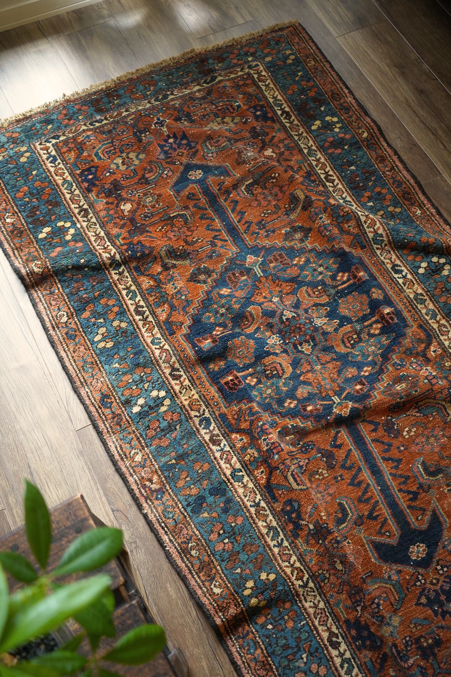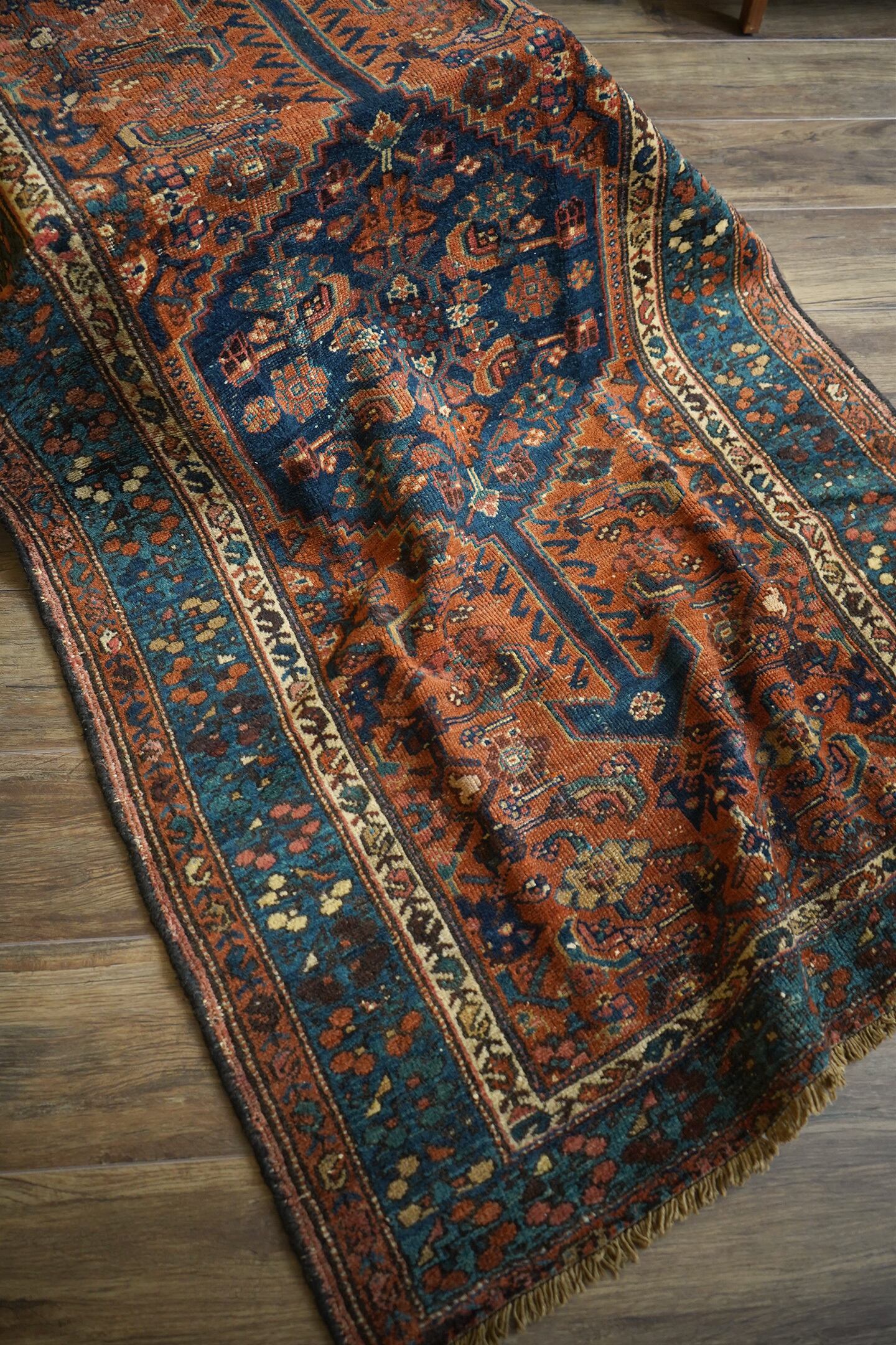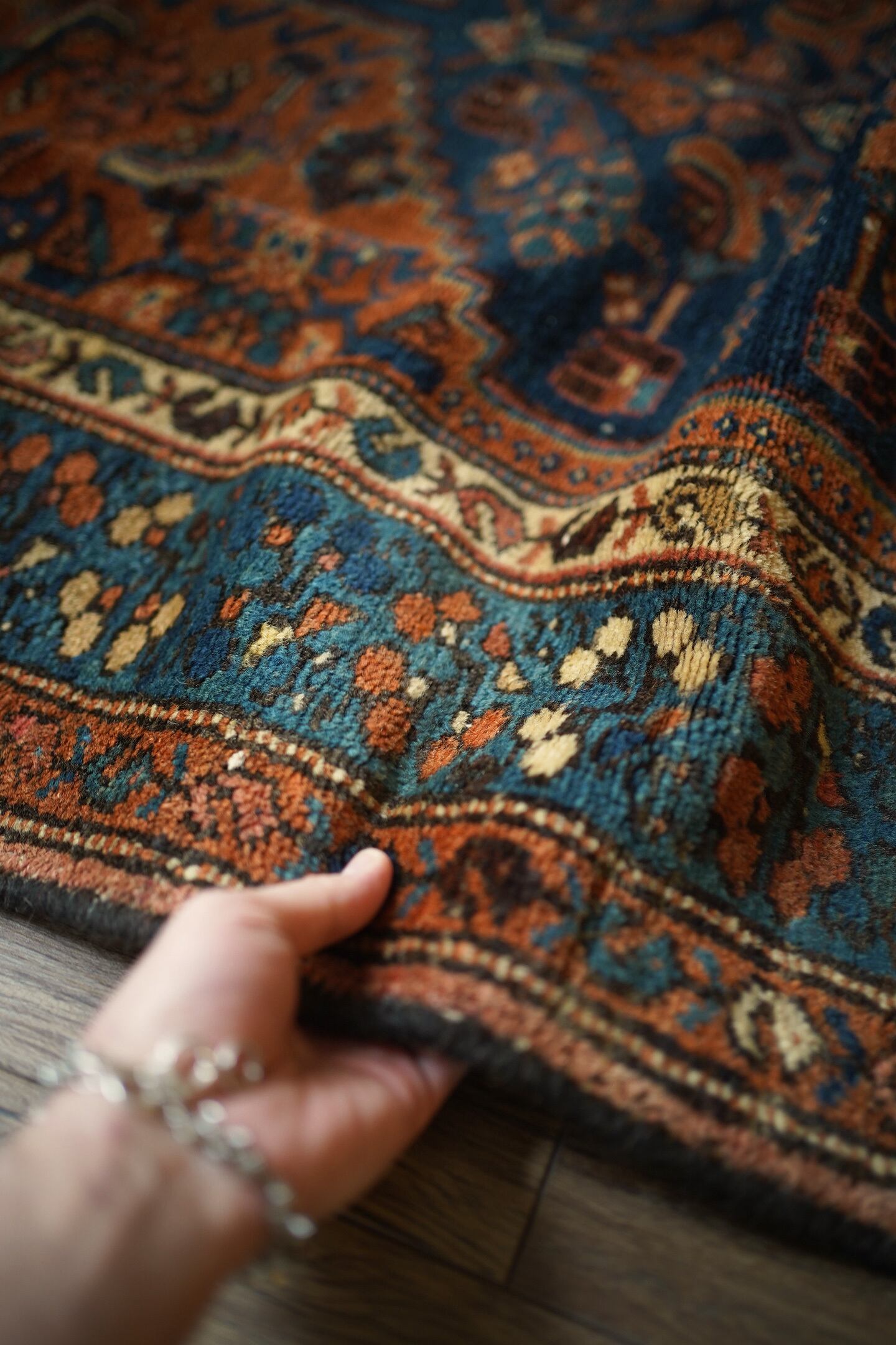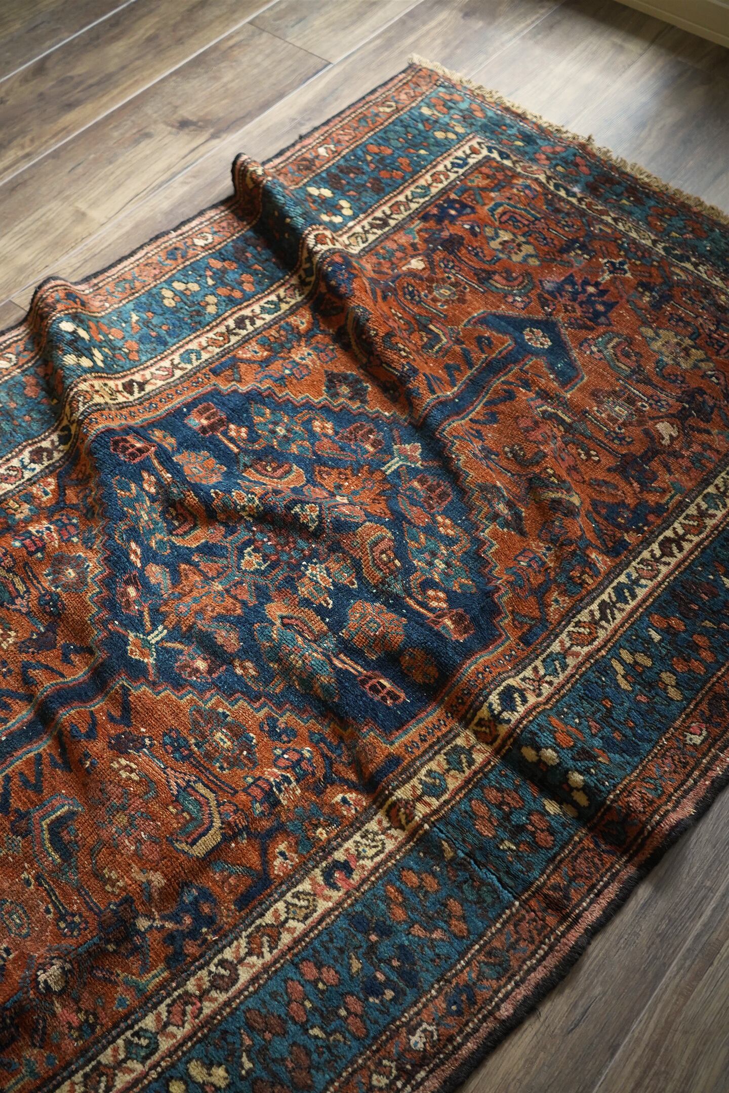 おおよそ80年前に織られたイラン・ハマダン産のセミアンティークラグ。花モチーフのデザインで、深く濃いブルーグリーンとブラウンの組み合わせが絶妙で非常に魅力的です。渋い色合いなのでアンティーク家具との相性も非常によろしいかと思います。経年を感じる風合いですがパイルも全体的に綺麗に残っており、表面はサラふわっとした優しい肌触りをしています。厚みは7mm程度。目立ったダメージや補修された跡も見受けられず良好なコンディション。ソファ前やベッドサイドをはじめ、書斎やウォークインクローゼットなどにも♫
