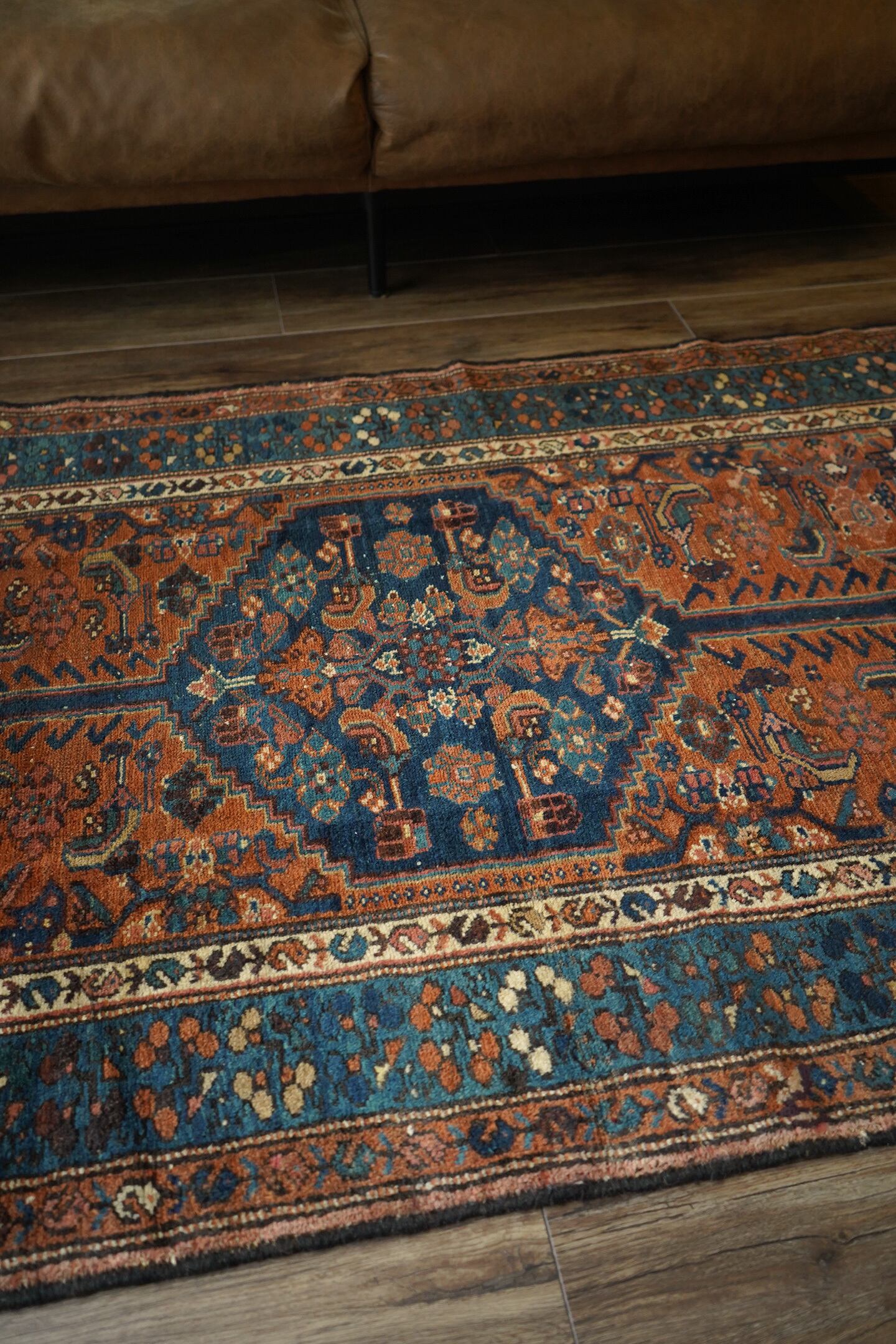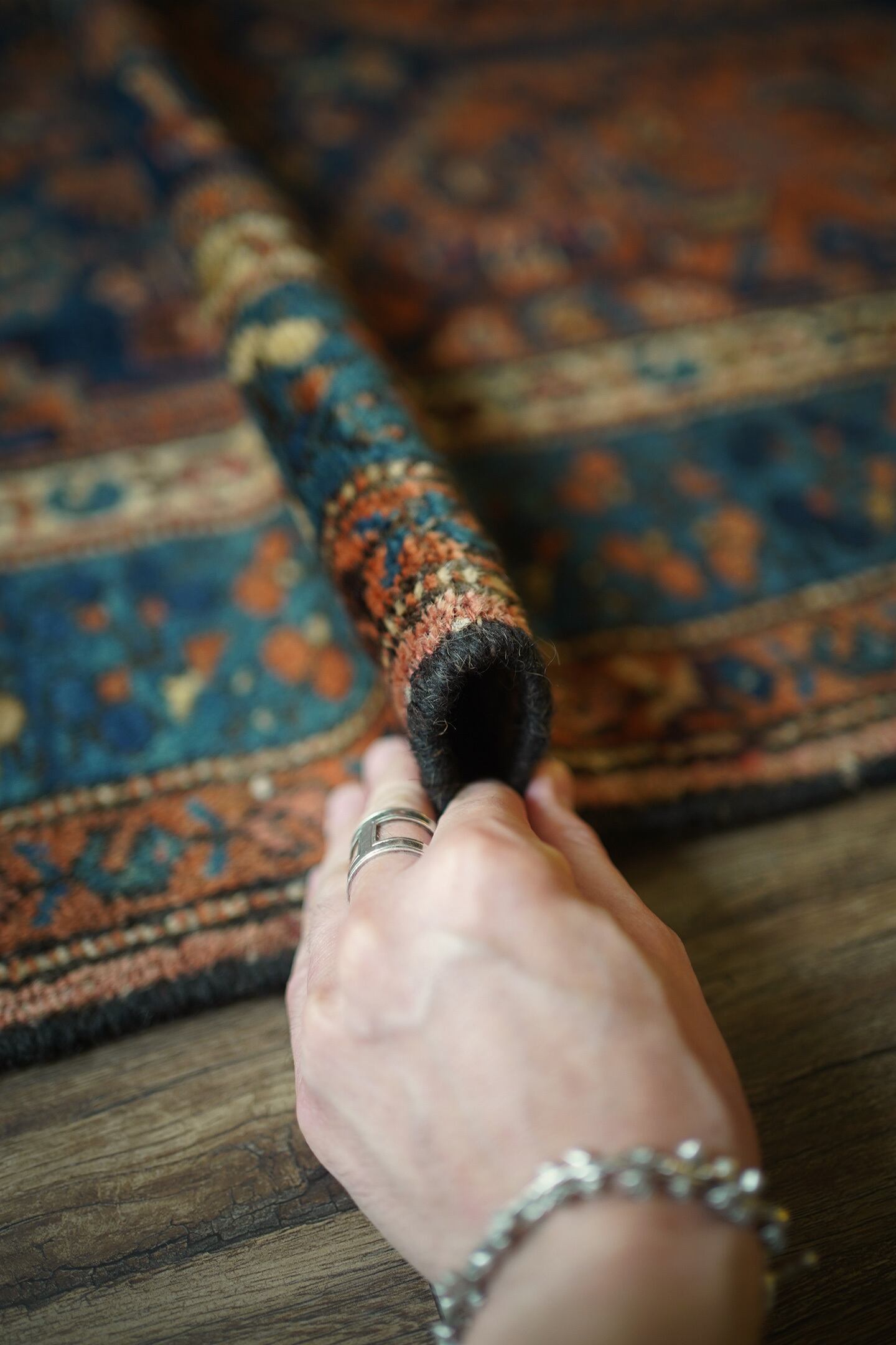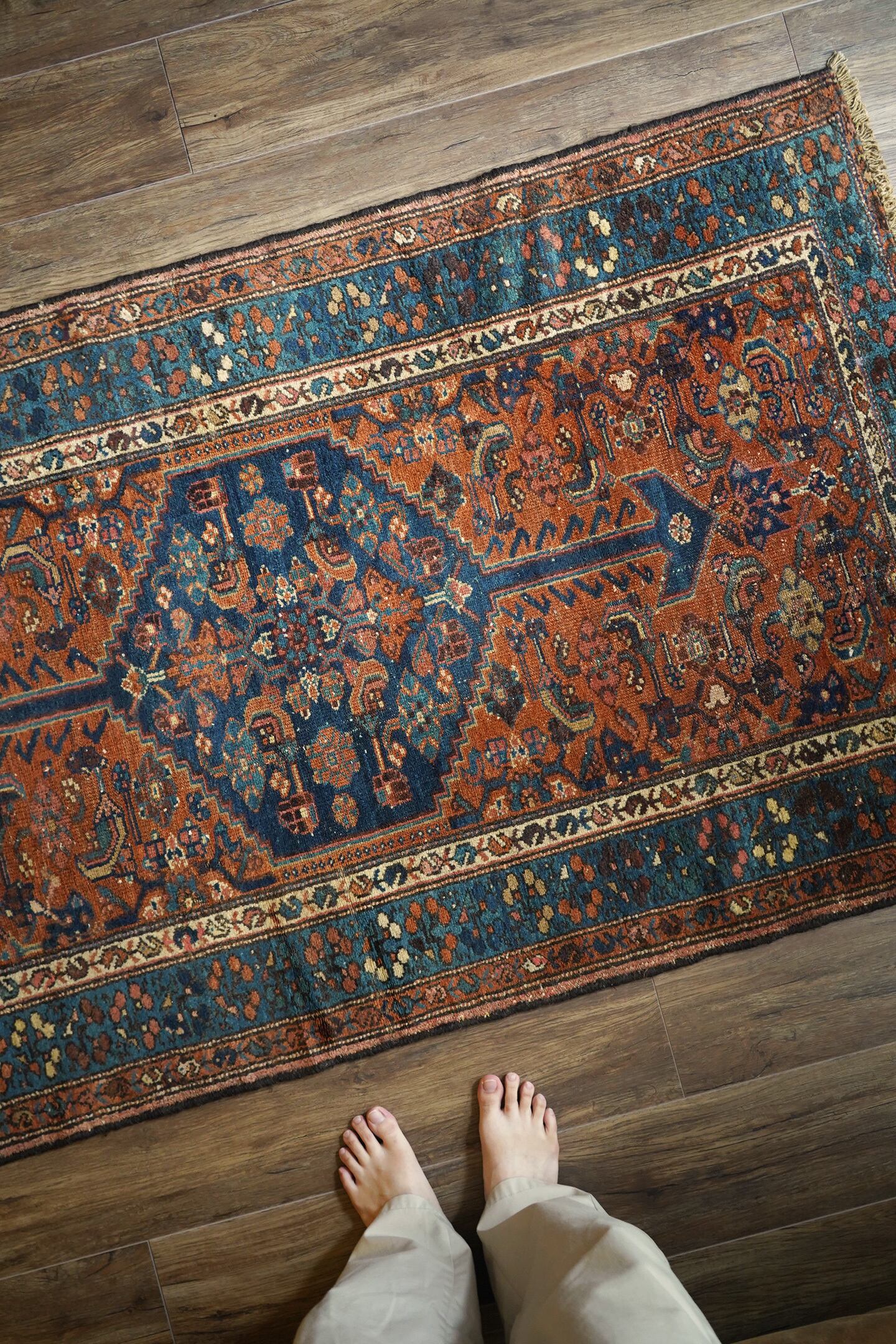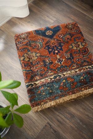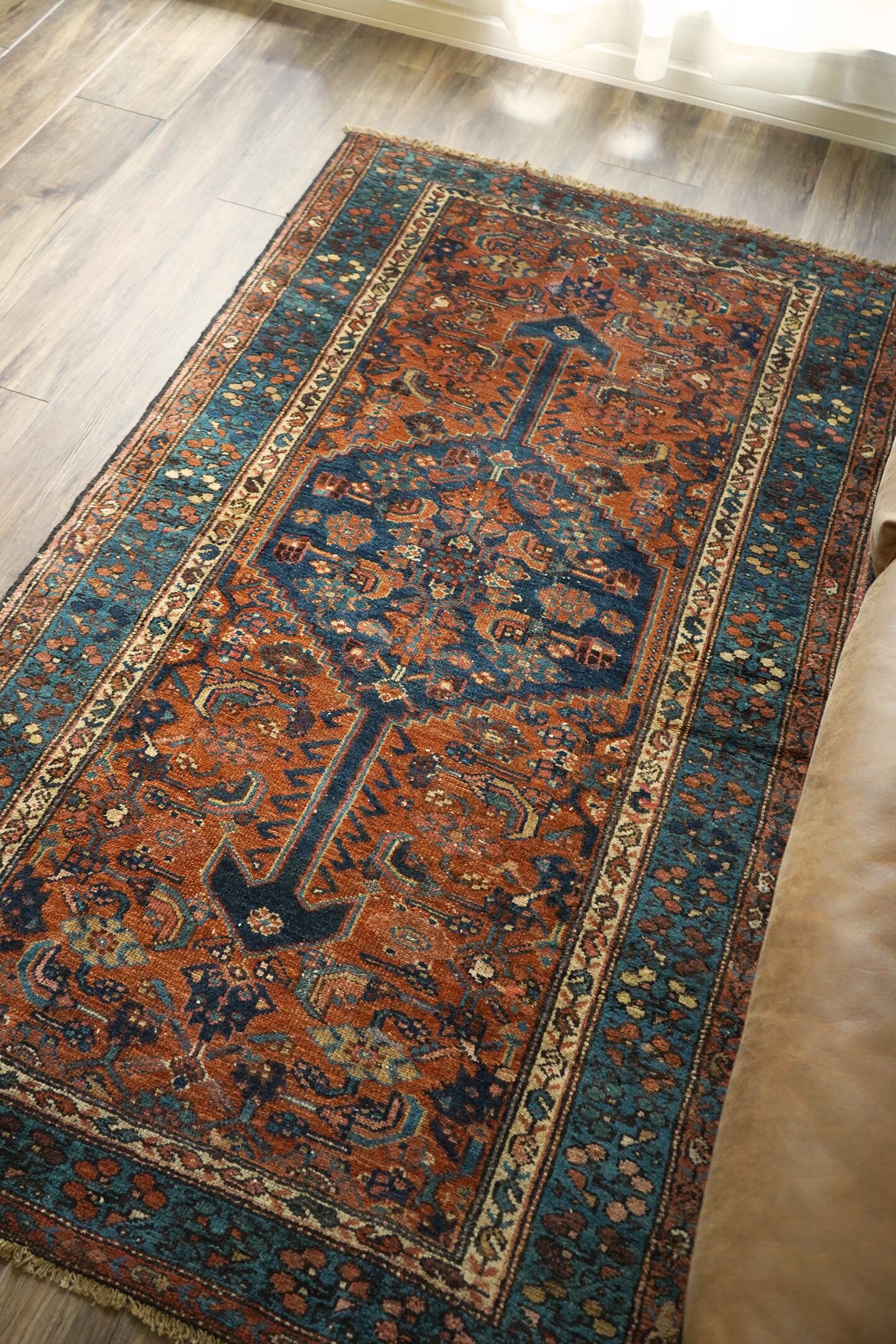 おおよそ80年前に織られたイラン・ハマダン産のセミアンティークラグ。花モチーフのデザインで、深く濃いブルーグリーンとブラウンの組み合わせが絶妙で非常に魅力的です。渋い色合いなのでアンティーク家具との相性も非常によろしいかと思います。経年を感じる風合いですがパイルも全体的に綺麗に残っており、表面はサラふわっとした優しい肌触りをしています。厚みは7mm程度。目立ったダメージや補修された跡も見受けられず良好なコンディション。ソファ前やベッドサイドをはじめ、書斎やウォークインクローゼットなどにも♫