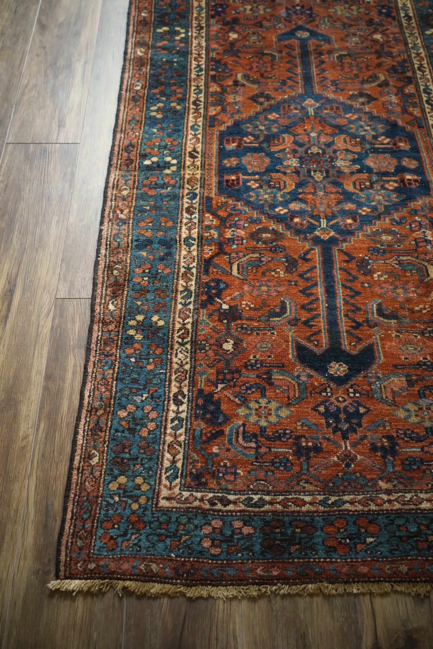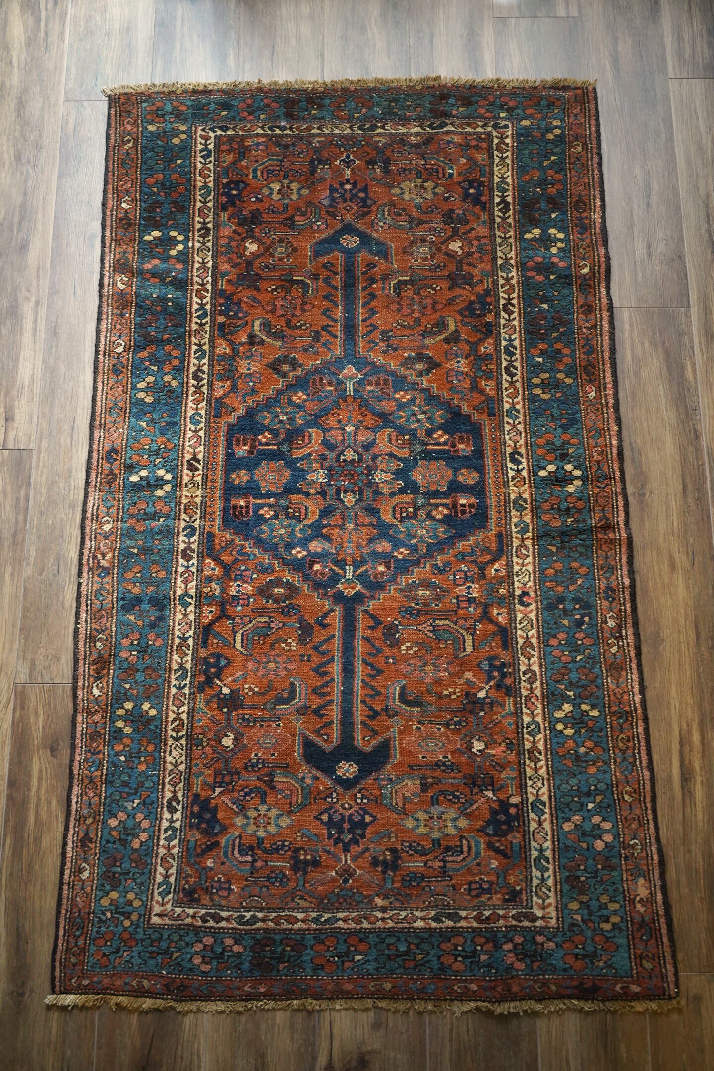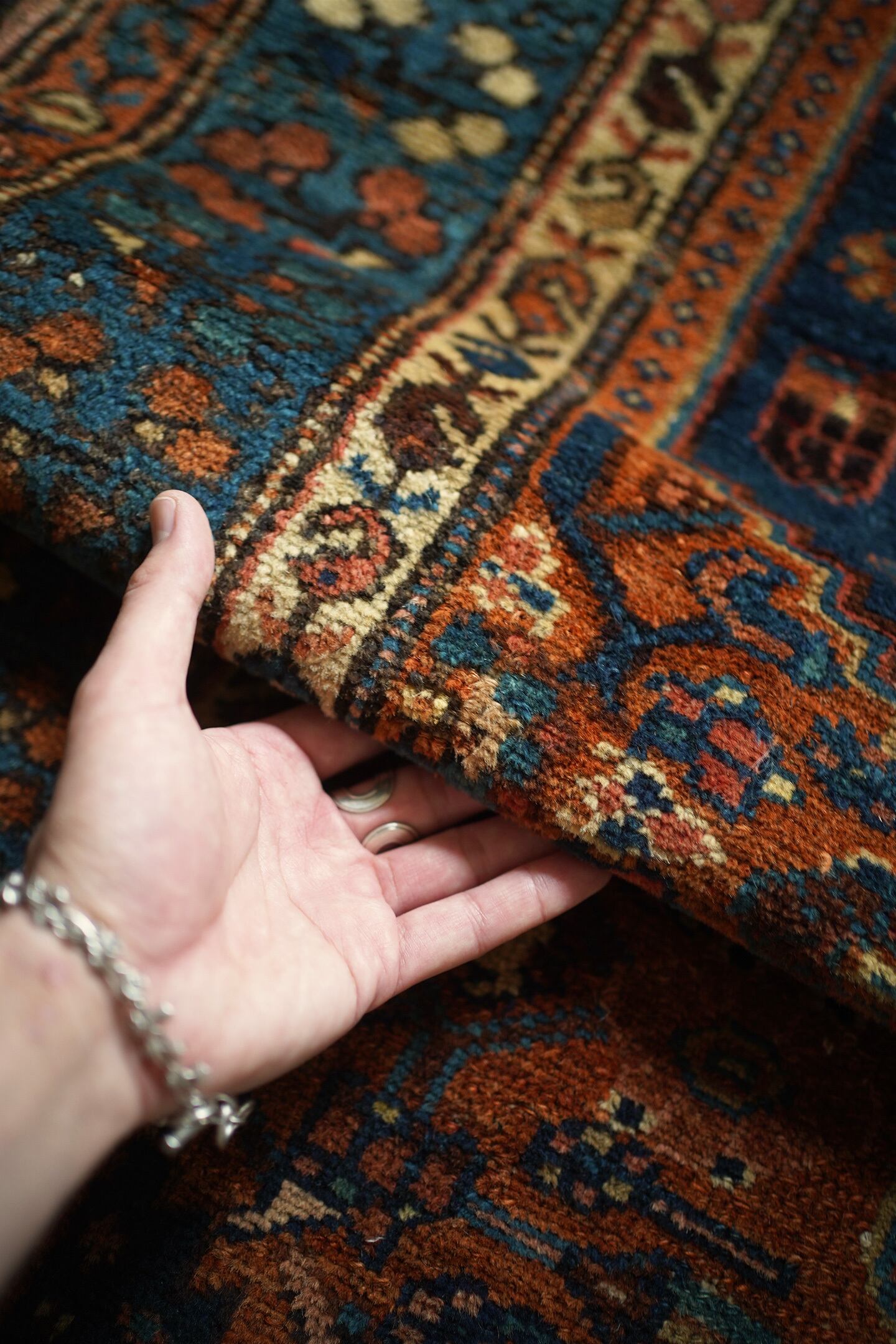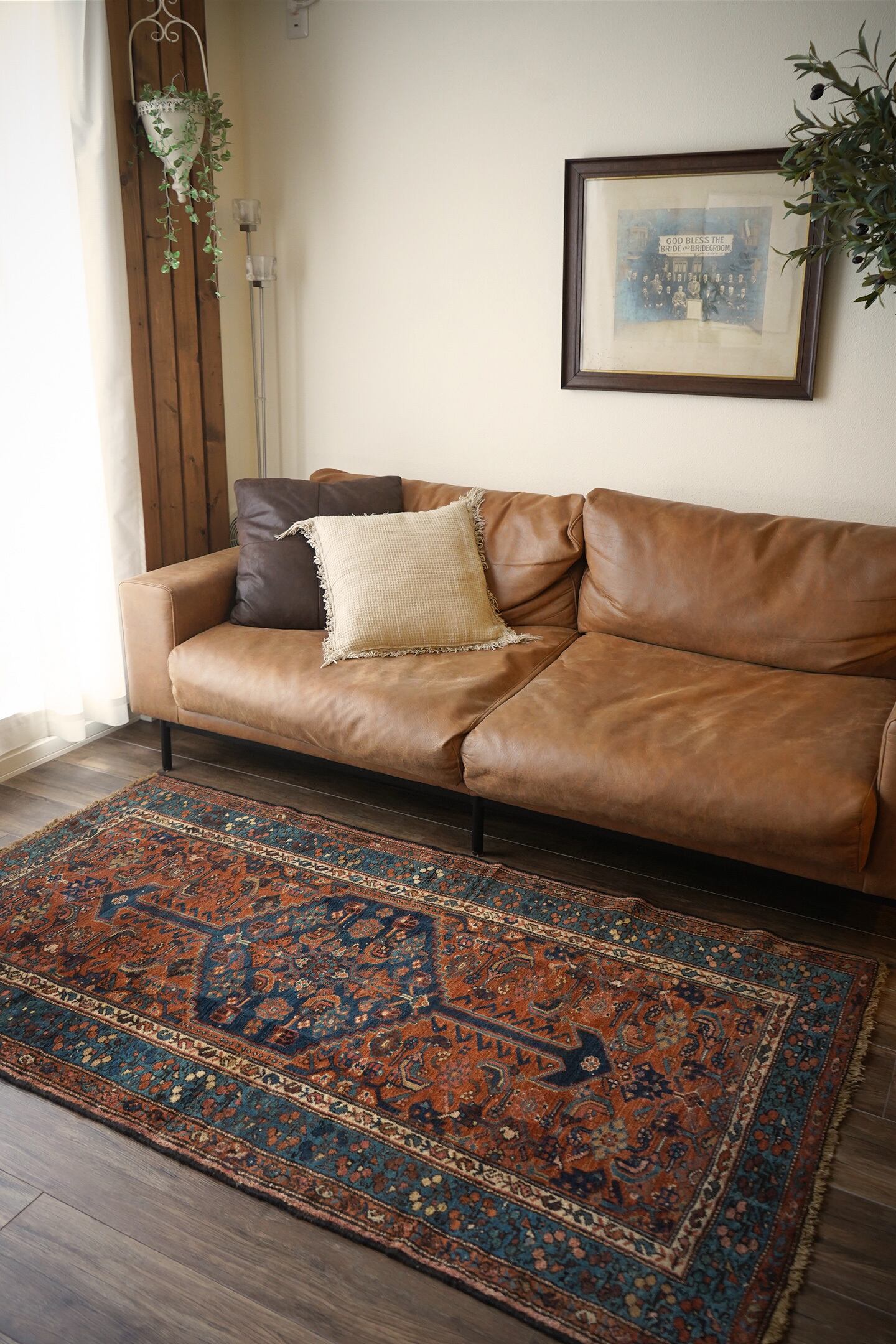 おおよそ80年前に織られたイラン・ハマダン産のセミアンティークラグ。花モチーフのデザインで、深く濃いブルーグリーンとブラウンの組み合わせが絶妙で非常に魅力的です。渋い色合いなのでアンティーク家具との相性も非常によろしいかと思います。経年を感じる風合いですがパイルも全体的に綺麗に残っており、表面はサラふわっとした優しい肌触りをしています。厚みは7mm程度。目立ったダメージや補修された跡も見受けられず良好なコンディション。ソファ前やベッドサイドをはじめ、書斎やウォークインクローゼットなどにも♫