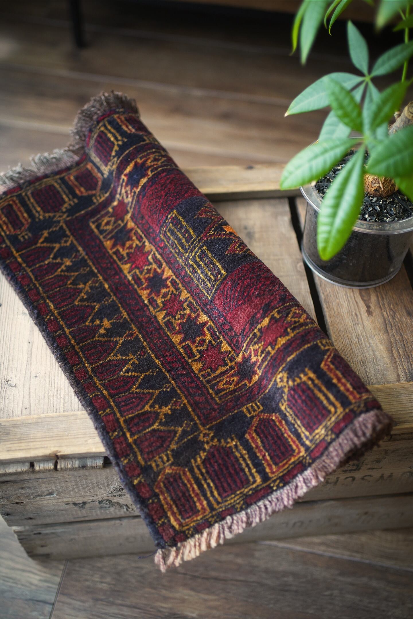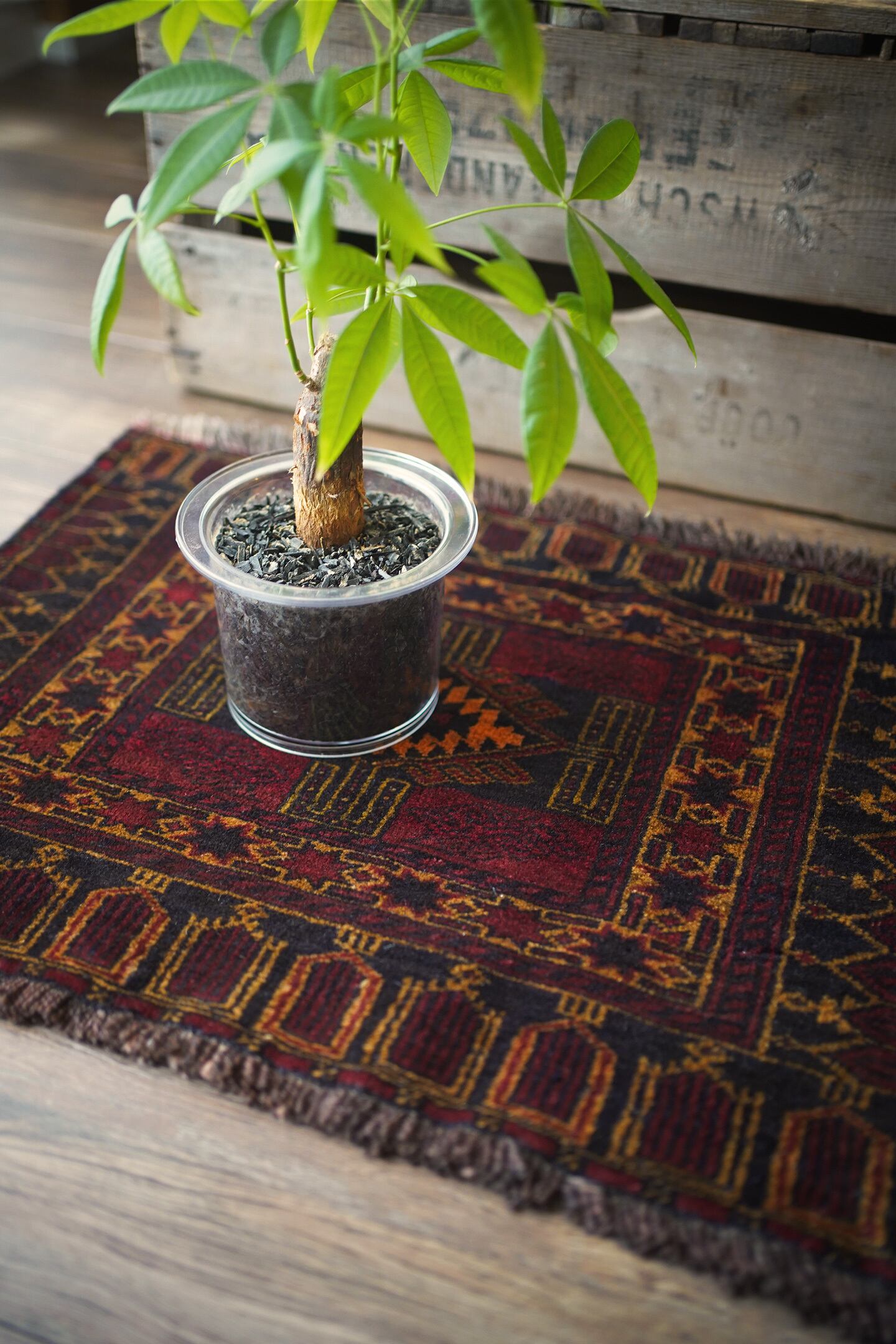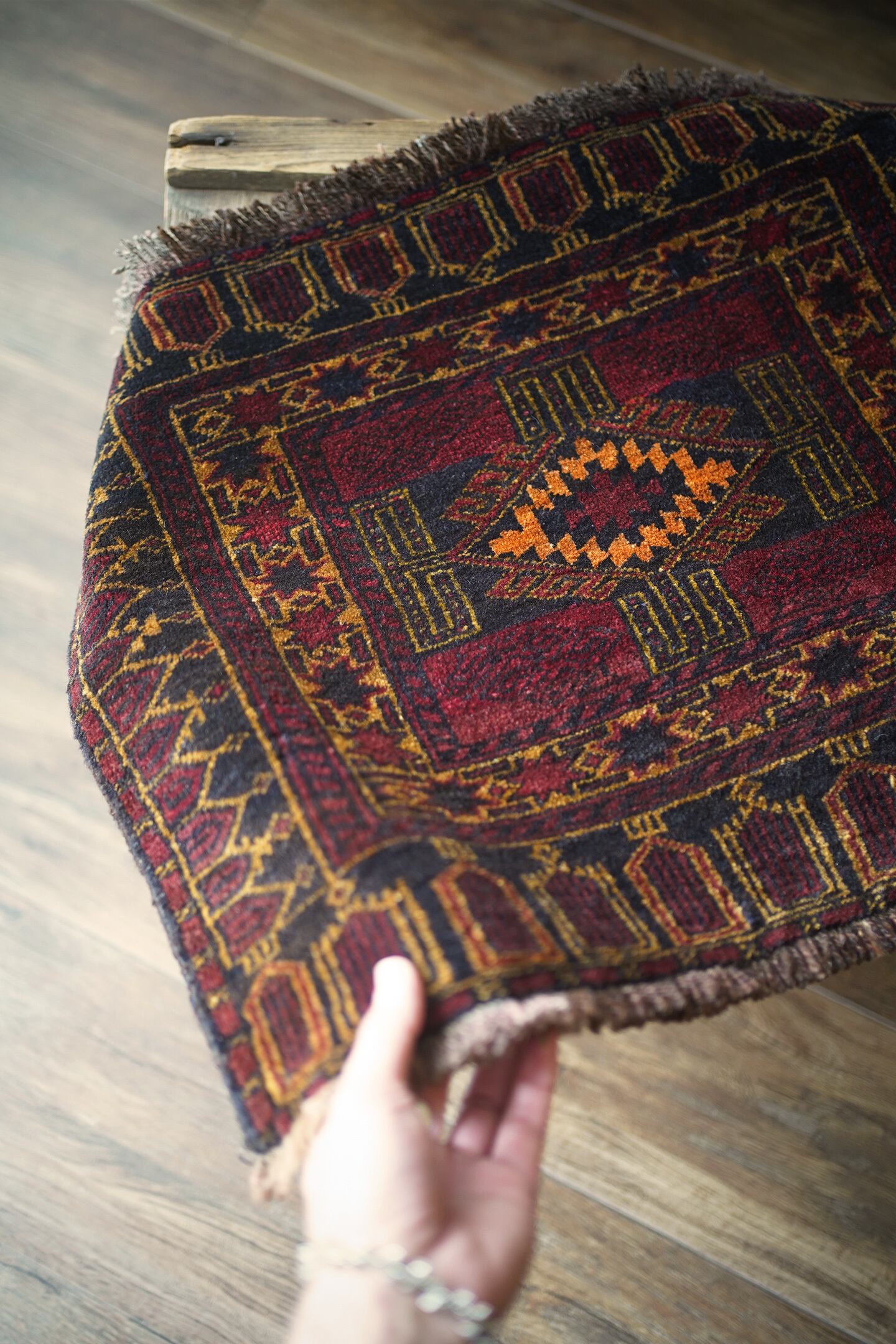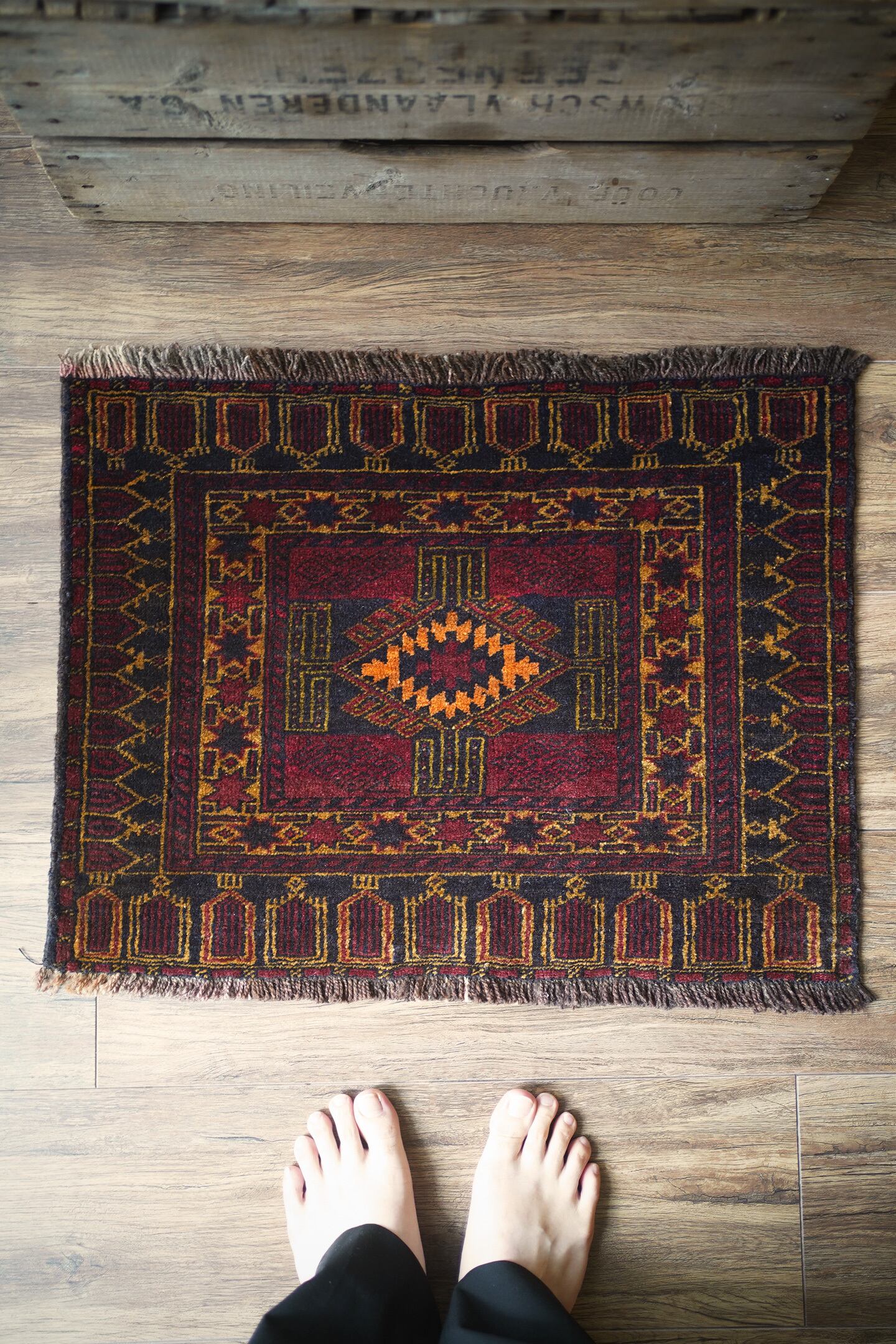正方形タイプのスモールサイズのバルーチラグ。元々、遊牧民が移動する際に家畜のロバや馬の背中に掛けて移動用の袋として利用していたサドルバッグの表面を切り取って作られたラグです。ふわサラッとした優しい肌触りで厚みは6mm程度。目立ったダメージもなく、グッドコンディションです。深めの赤茶をベースに、黄土色と暗めのオレンジの配色でシックな色合いで非常にカッコ良い一枚。観葉植物の下などに♫