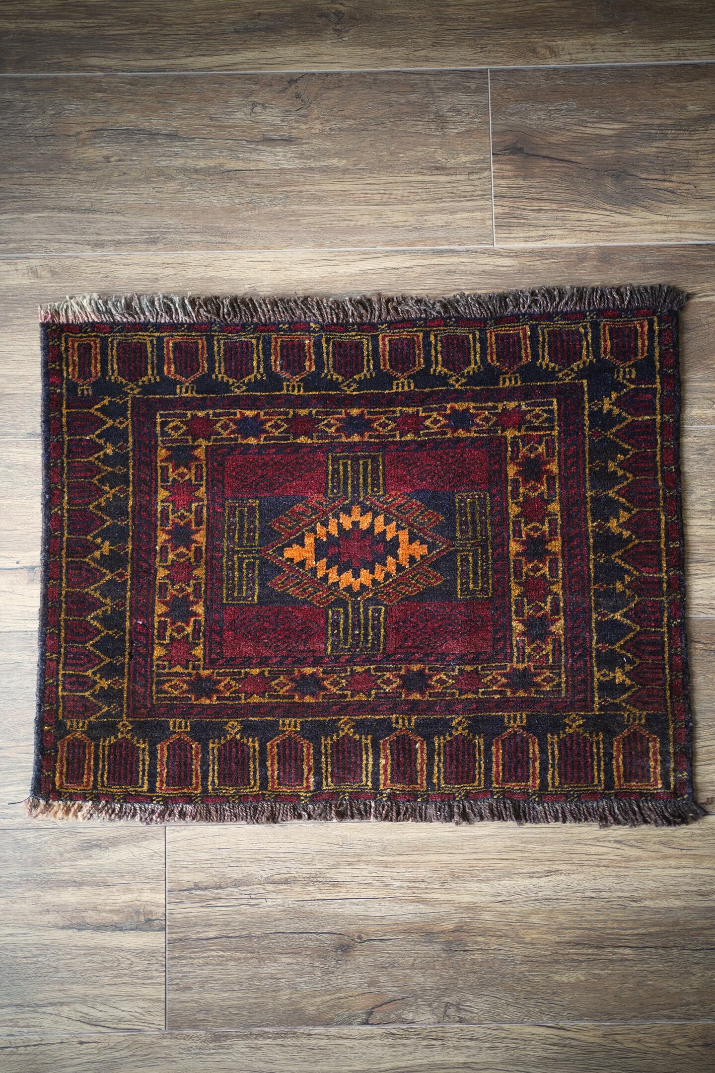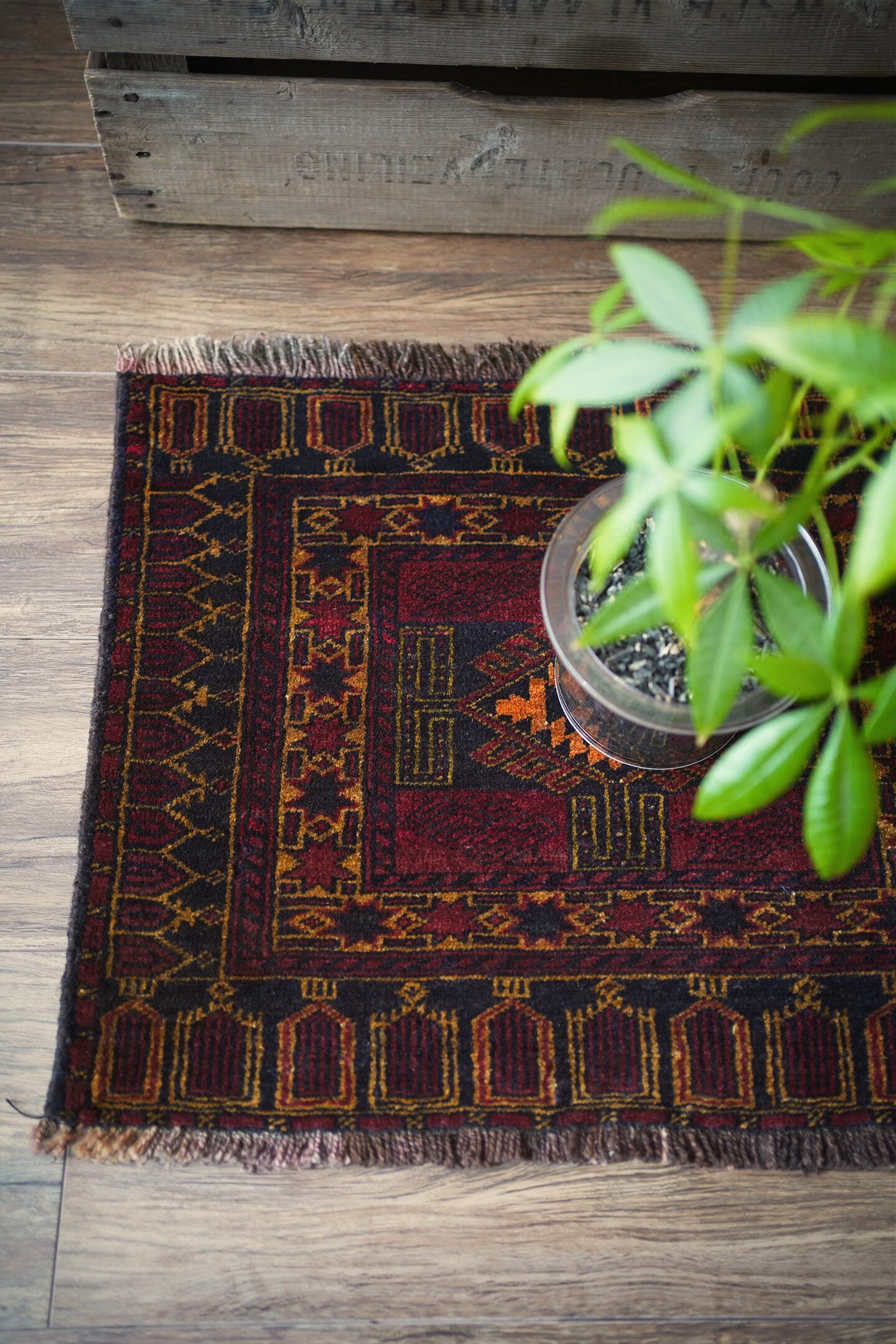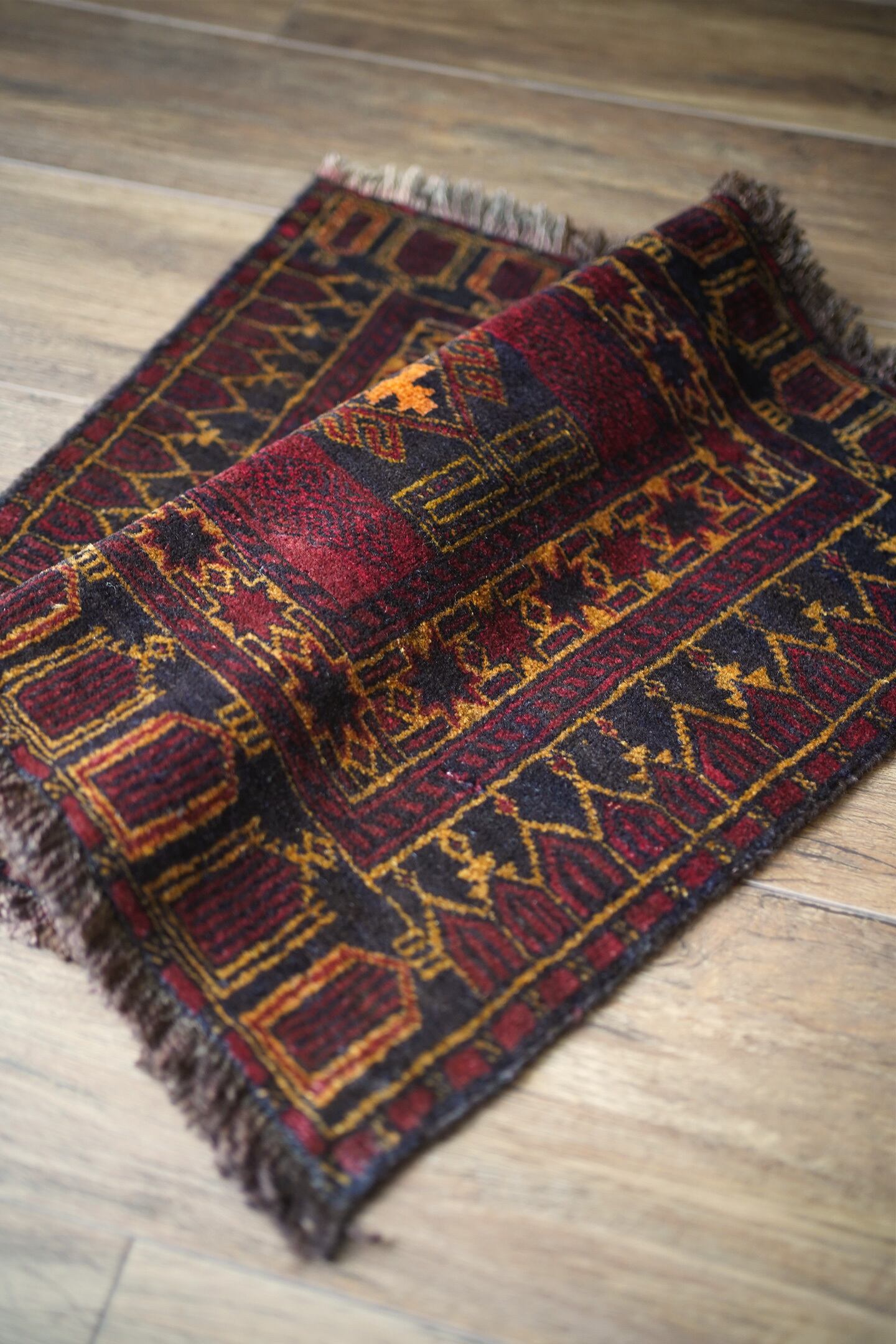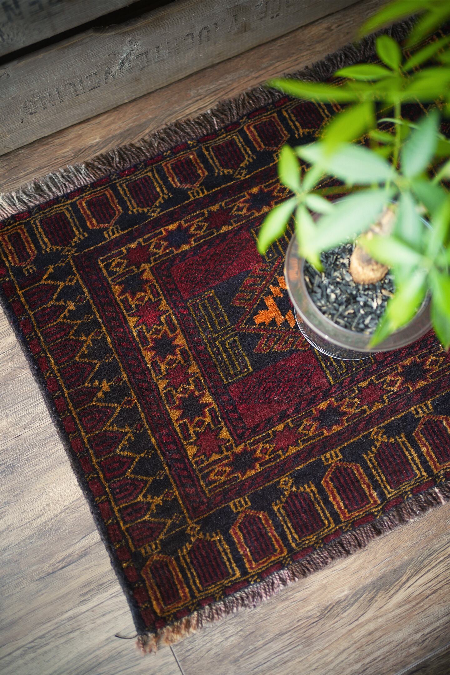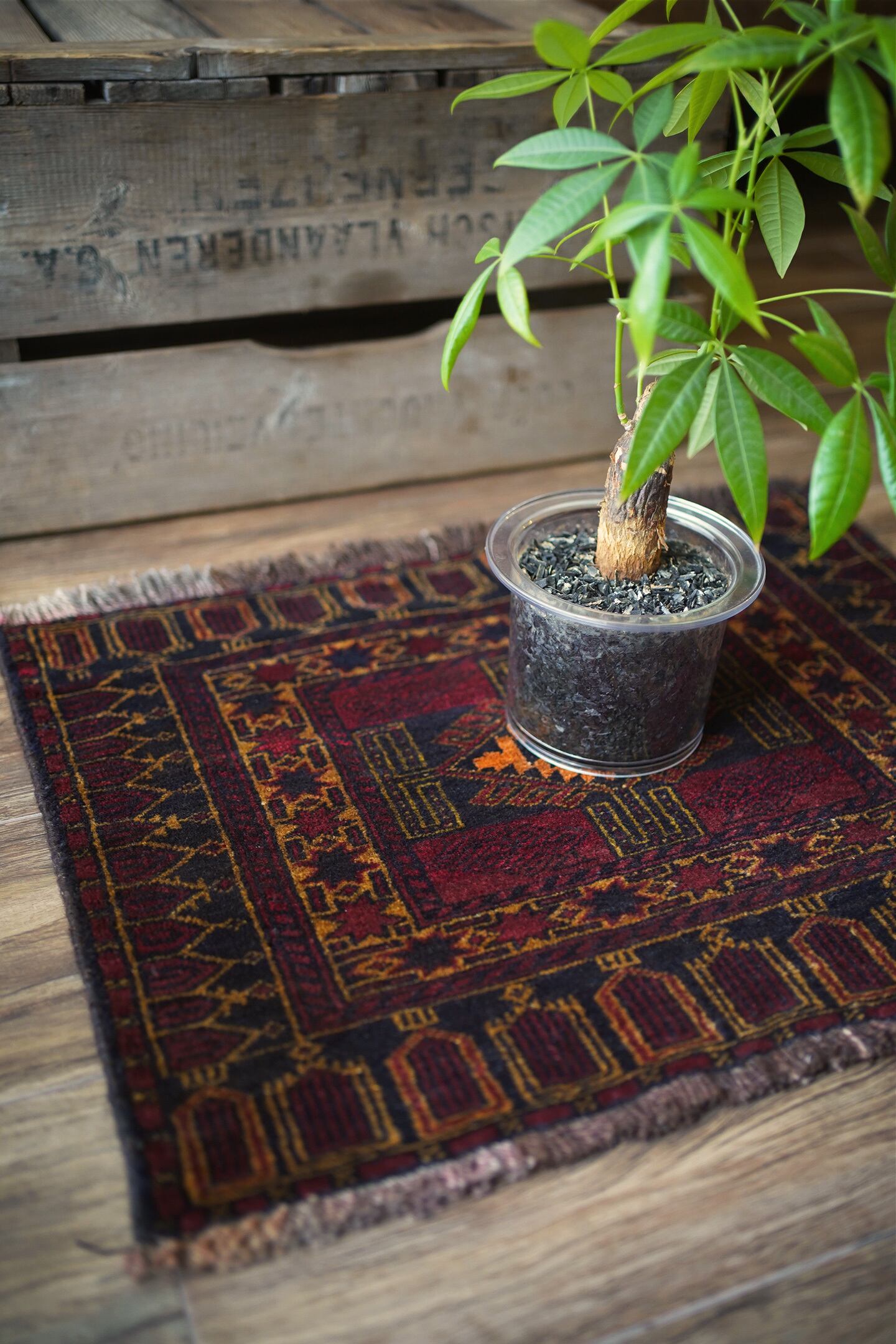 正方形タイプのスモールサイズのバルーチラグ。元々、遊牧民が移動する際に家畜のロバや馬の背中に掛けて移動用の袋として利用していたサドルバッグの表面を切り取って作られたラグです。ふわサラッとした優しい肌触りで厚みは6mm程度。目立ったダメージもなく、グッドコンディションです。深めの赤茶をベースに、黄土色と暗めのオレンジの配色でシックな色合いで非常にカッコ良い一枚。観葉植物の下などに♫