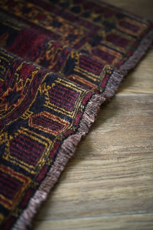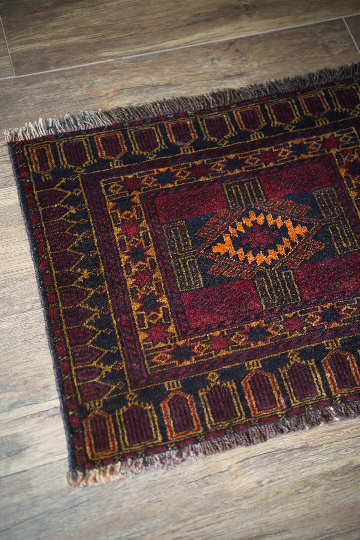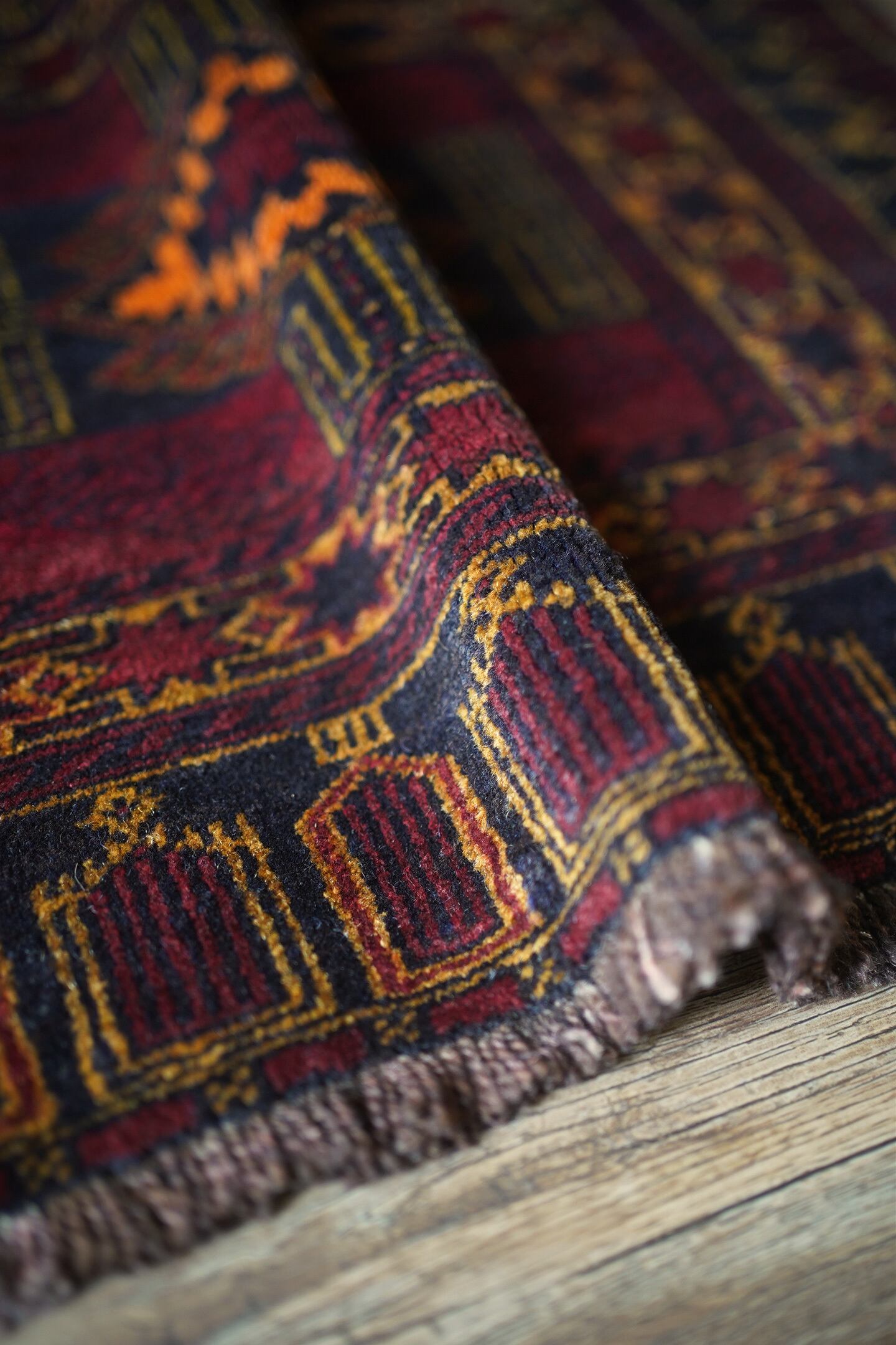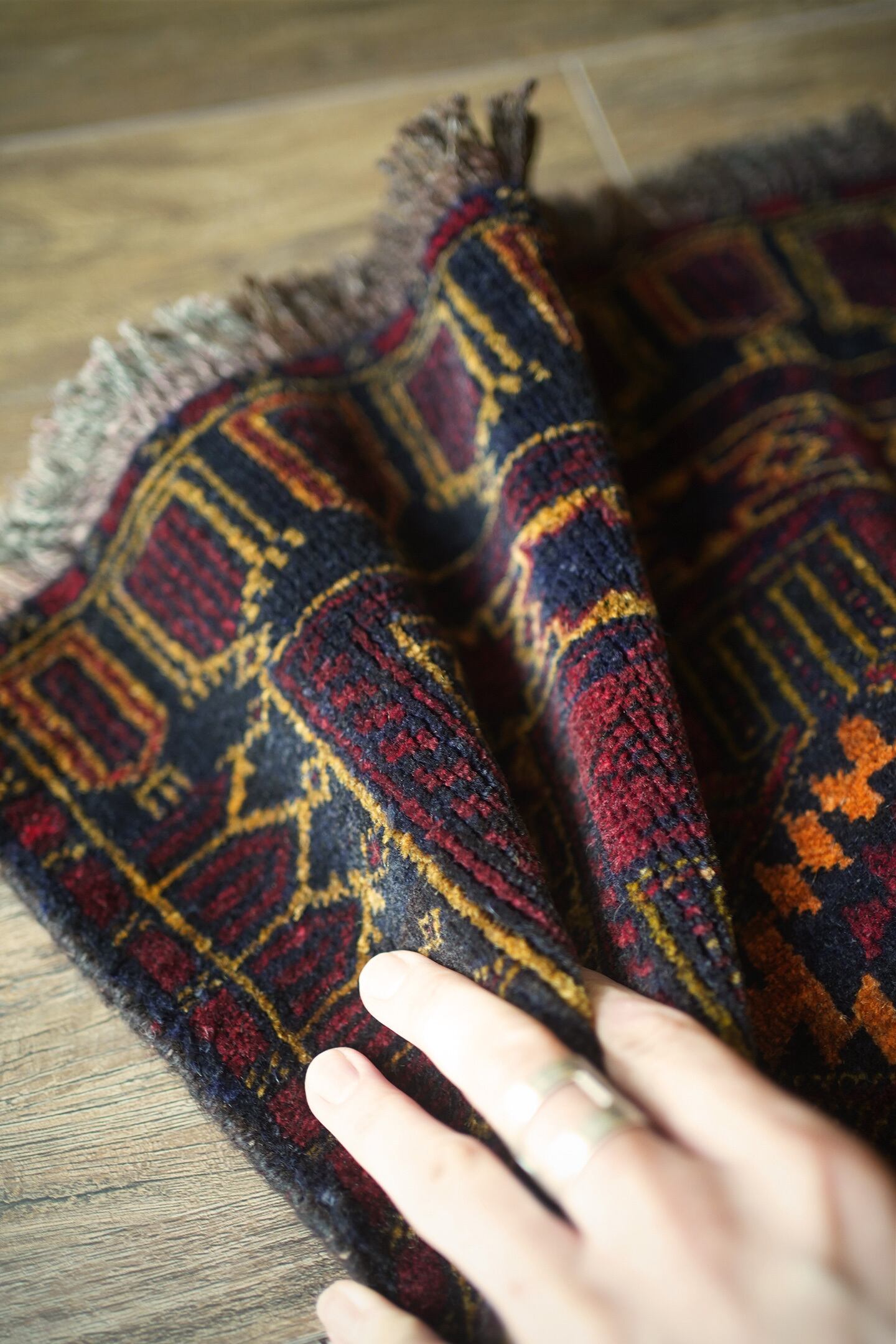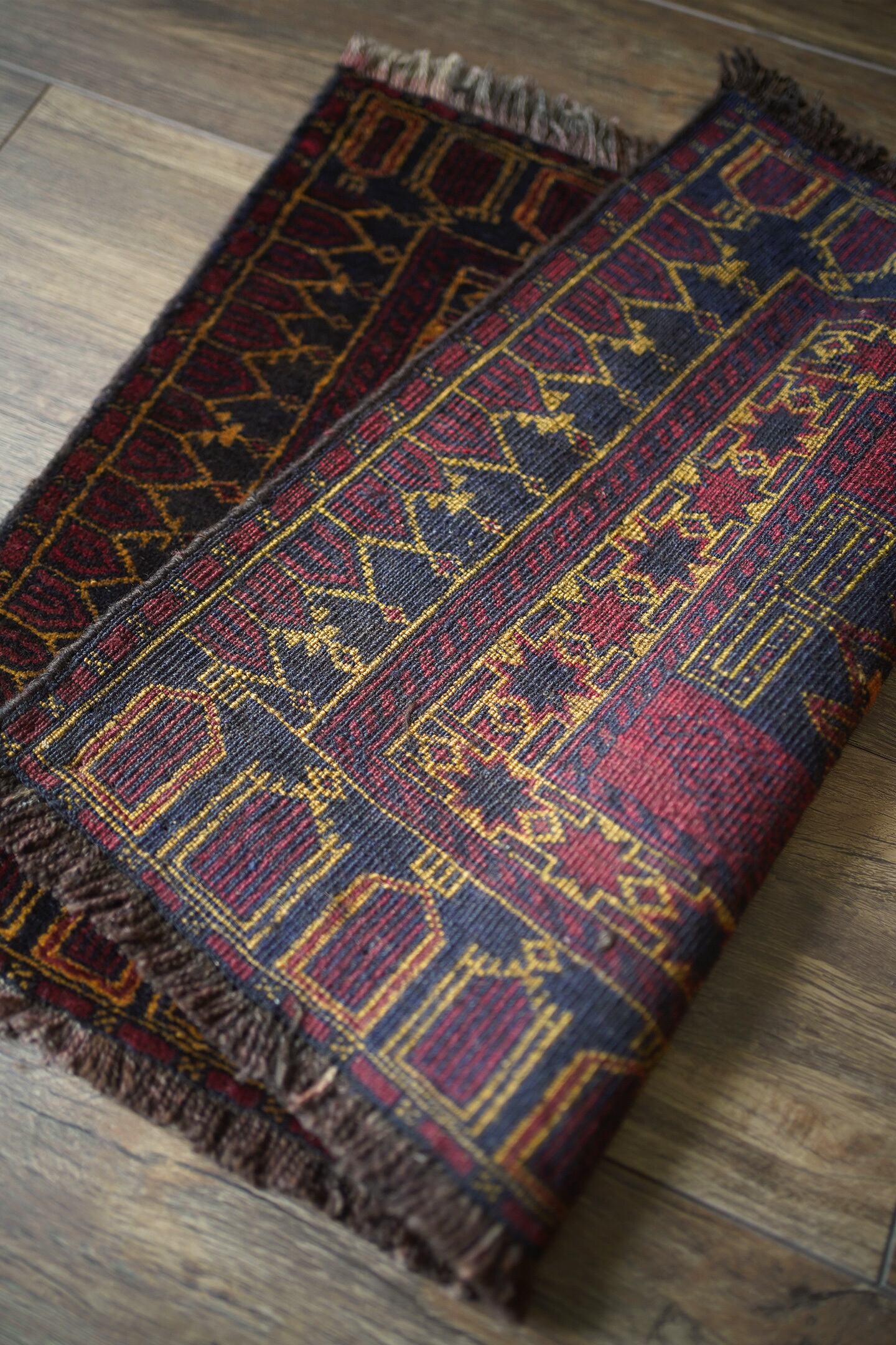 正方形タイプのスモールサイズのバルーチラグ。元々、遊牧民が移動する際に家畜のロバや馬の背中に掛けて移動用の袋として利用していたサドルバッグの表面を切り取って作られたラグです。ふわサラッとした優しい肌触りで厚みは6mm程度。目立ったダメージもなく、グッドコンディションです。深めの赤茶をベースに、黄土色と暗めのオレンジの配色でシックな色合いで非常にカッコ良い一枚。観葉植物の下などに♫