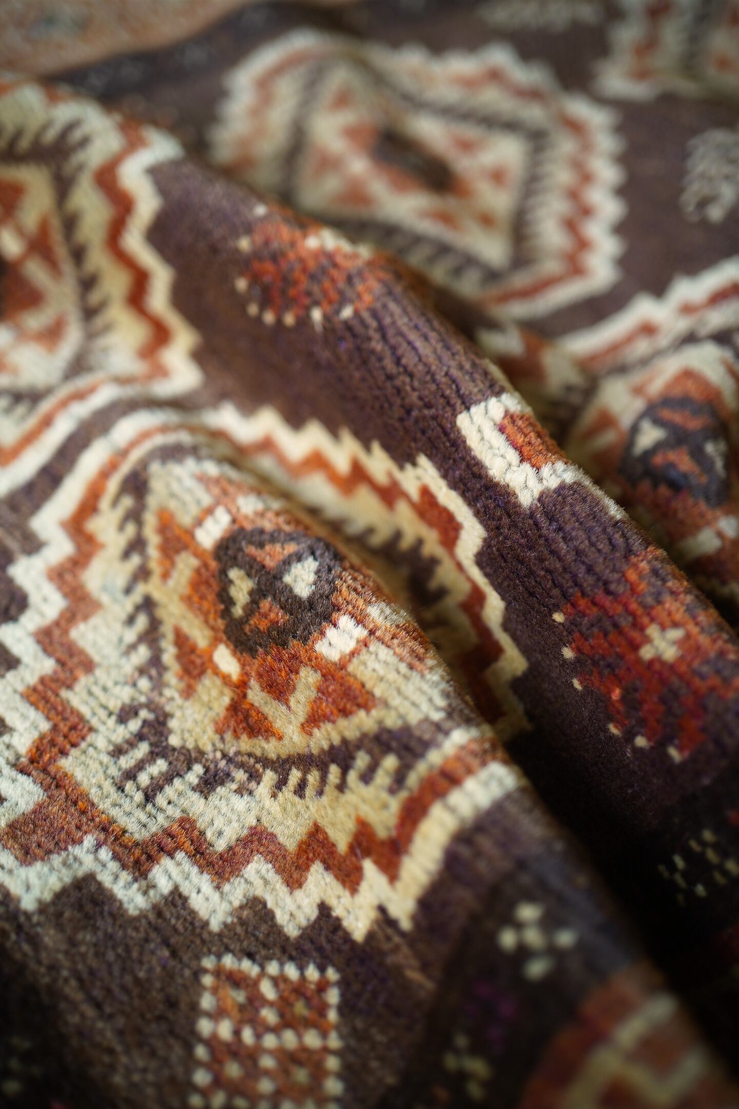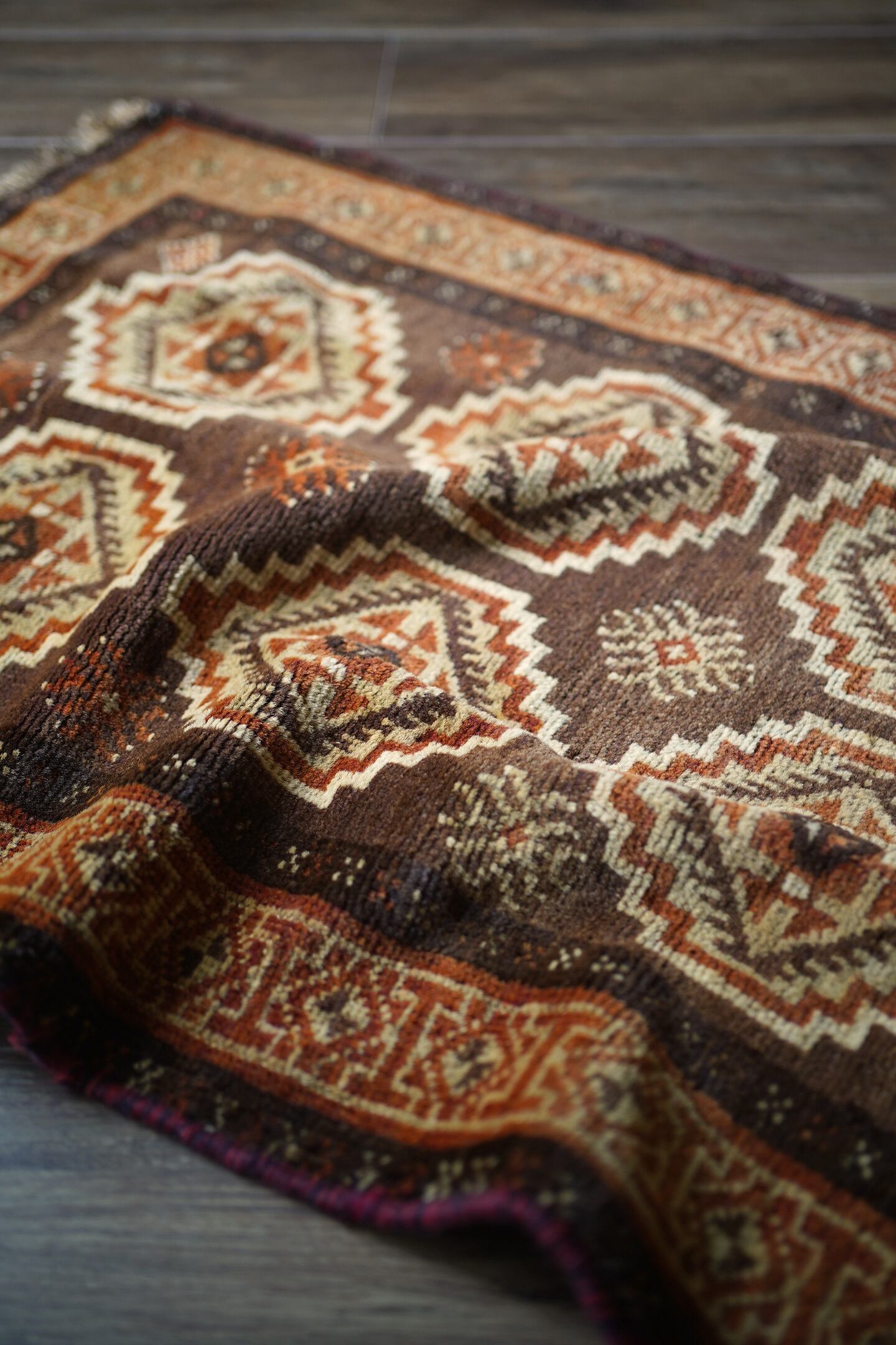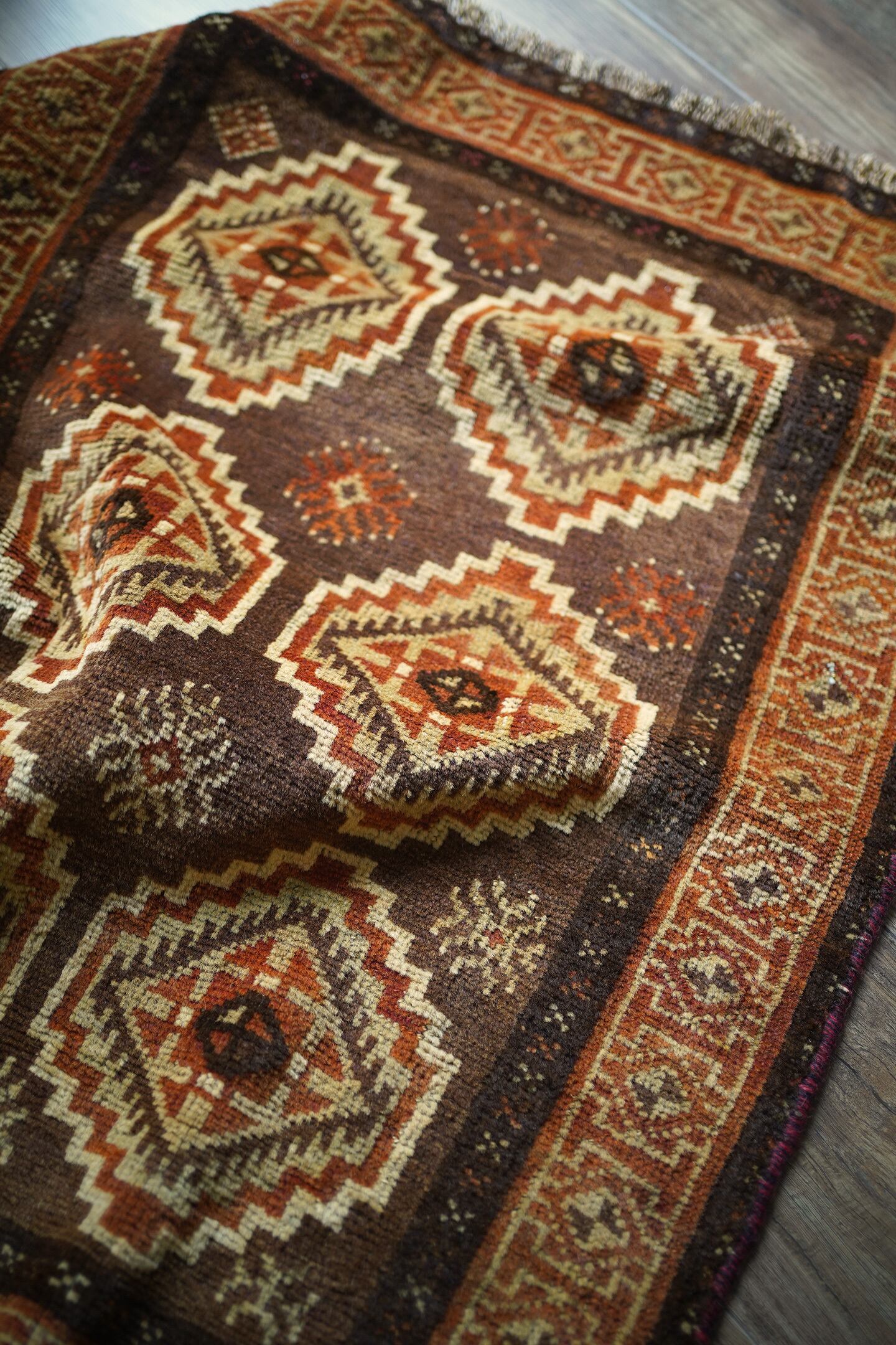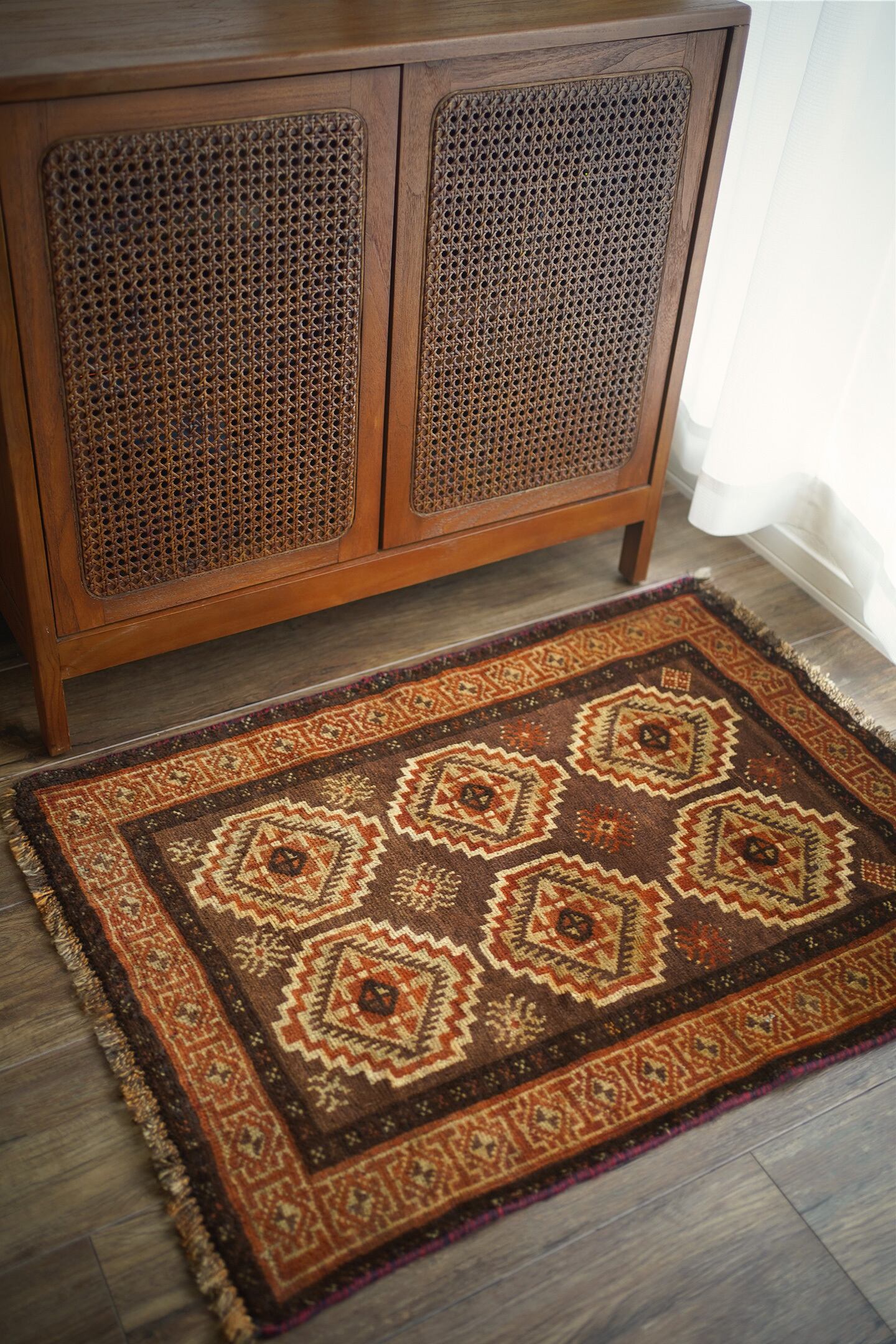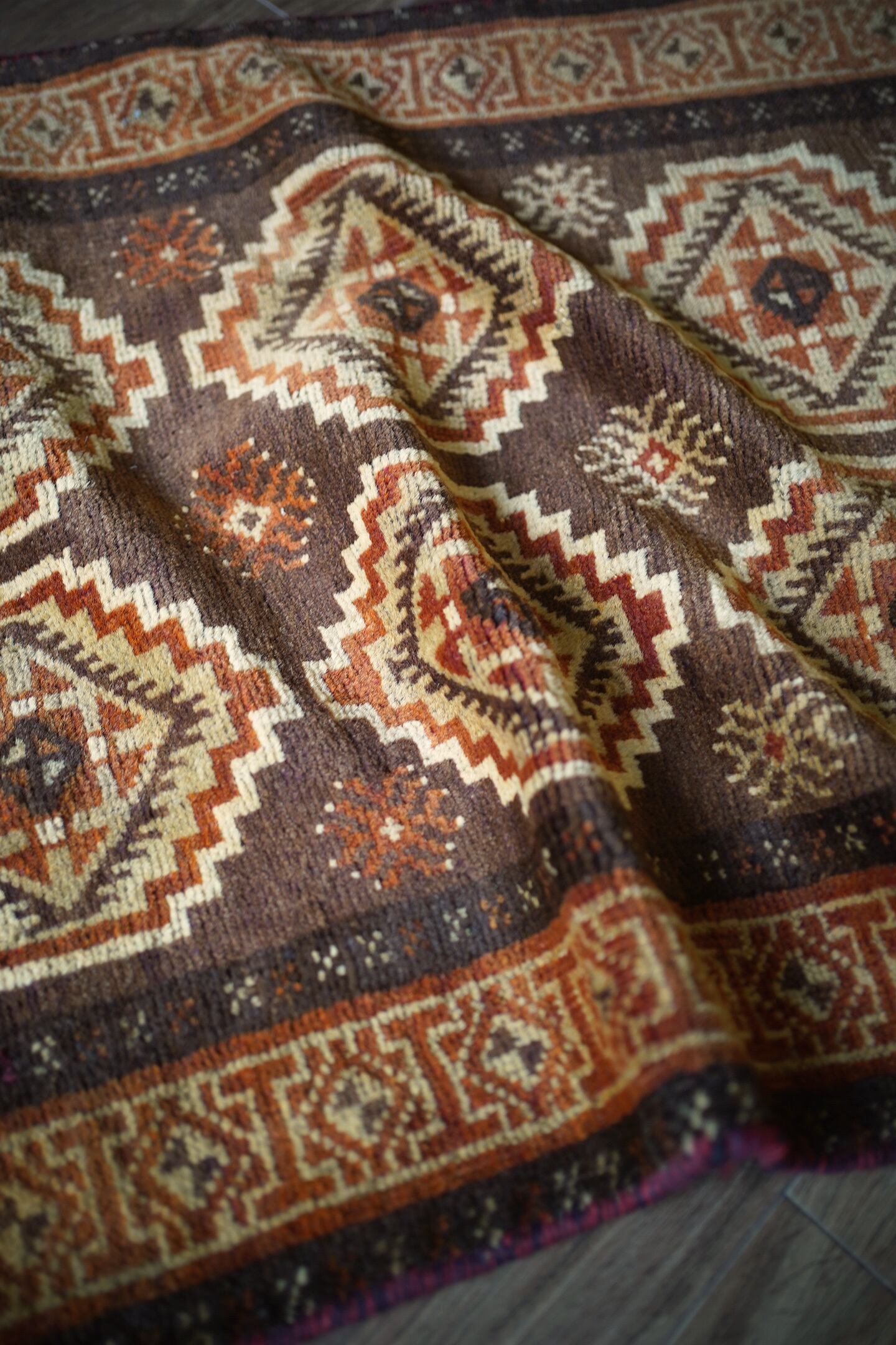経年50年ほどのアフガニスタン産のバルーチラグ。ソフトウールでふわっと滑らかな気持ちの良い肌触りで、菱形紋様モチーフの洗練されたデザインがお洒落な一枚です。ブラウン、焦茶、ベージュ、暗いキャロットオレンジなどの配色で統一感のある色味が◎。厚みは5mm〜6mm程度。目立ったダメージや補修された跡もなく良好なコンディション。玄関や洗面スペース、キャビネット前などに♫