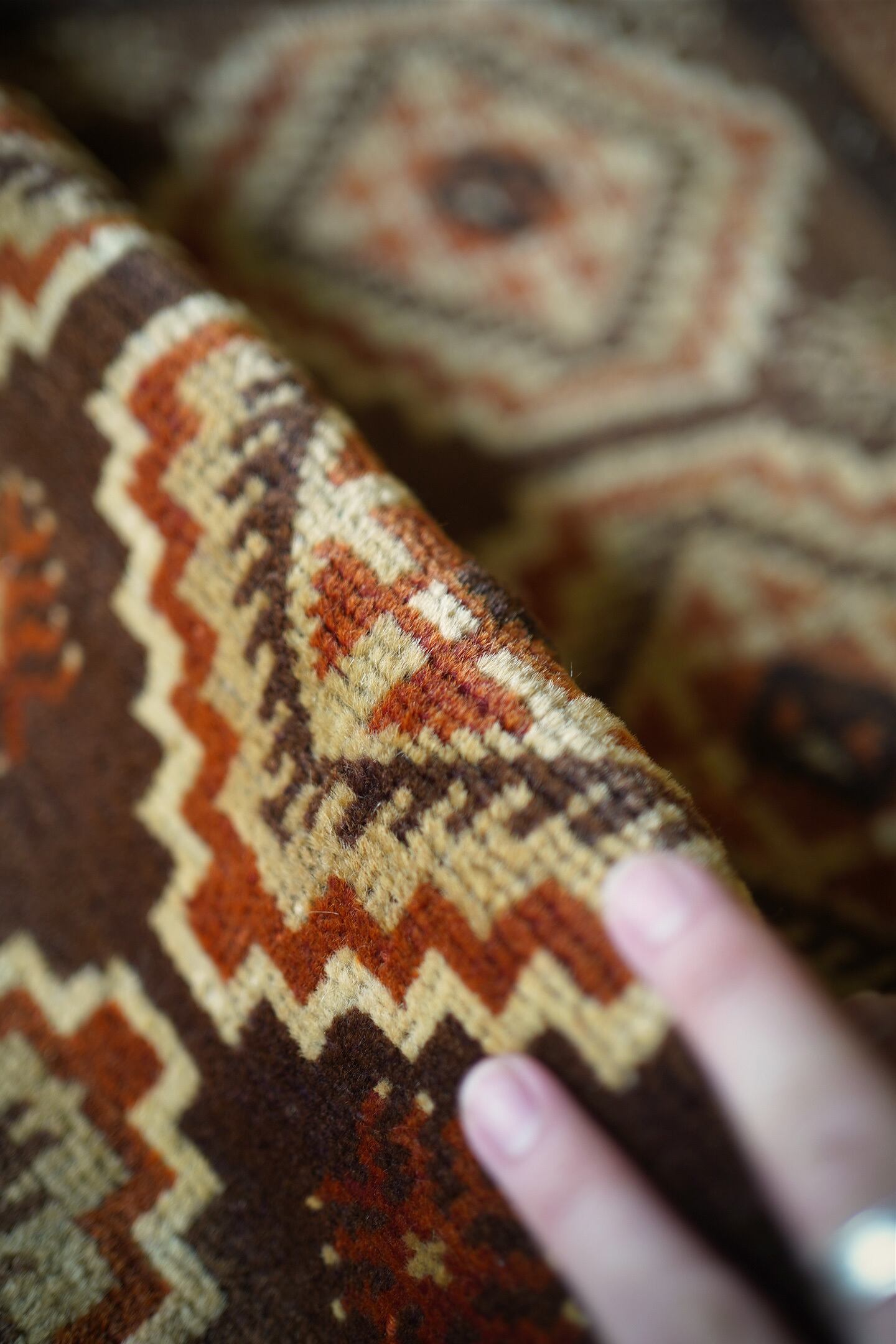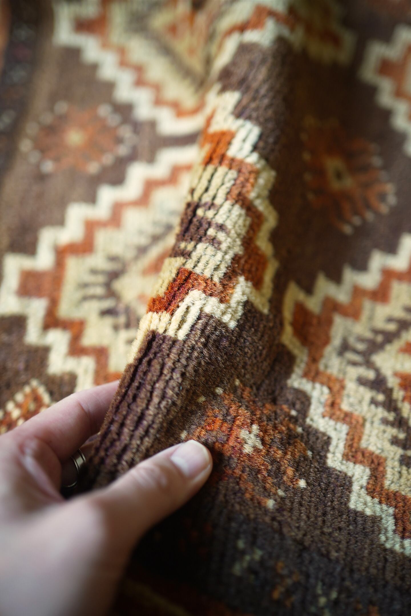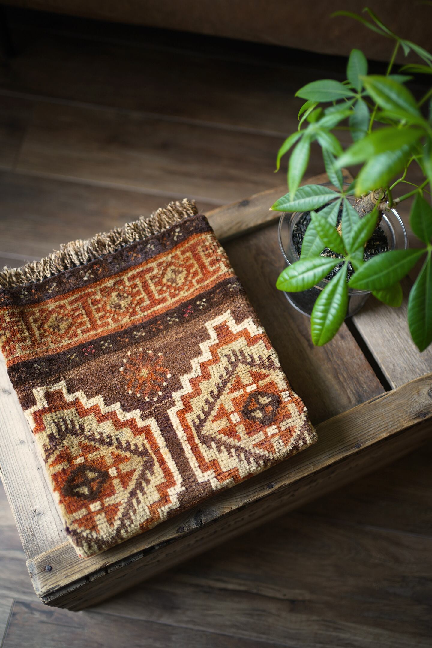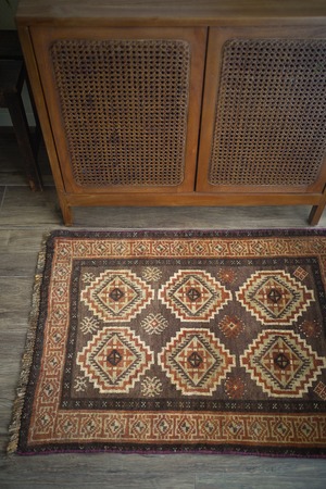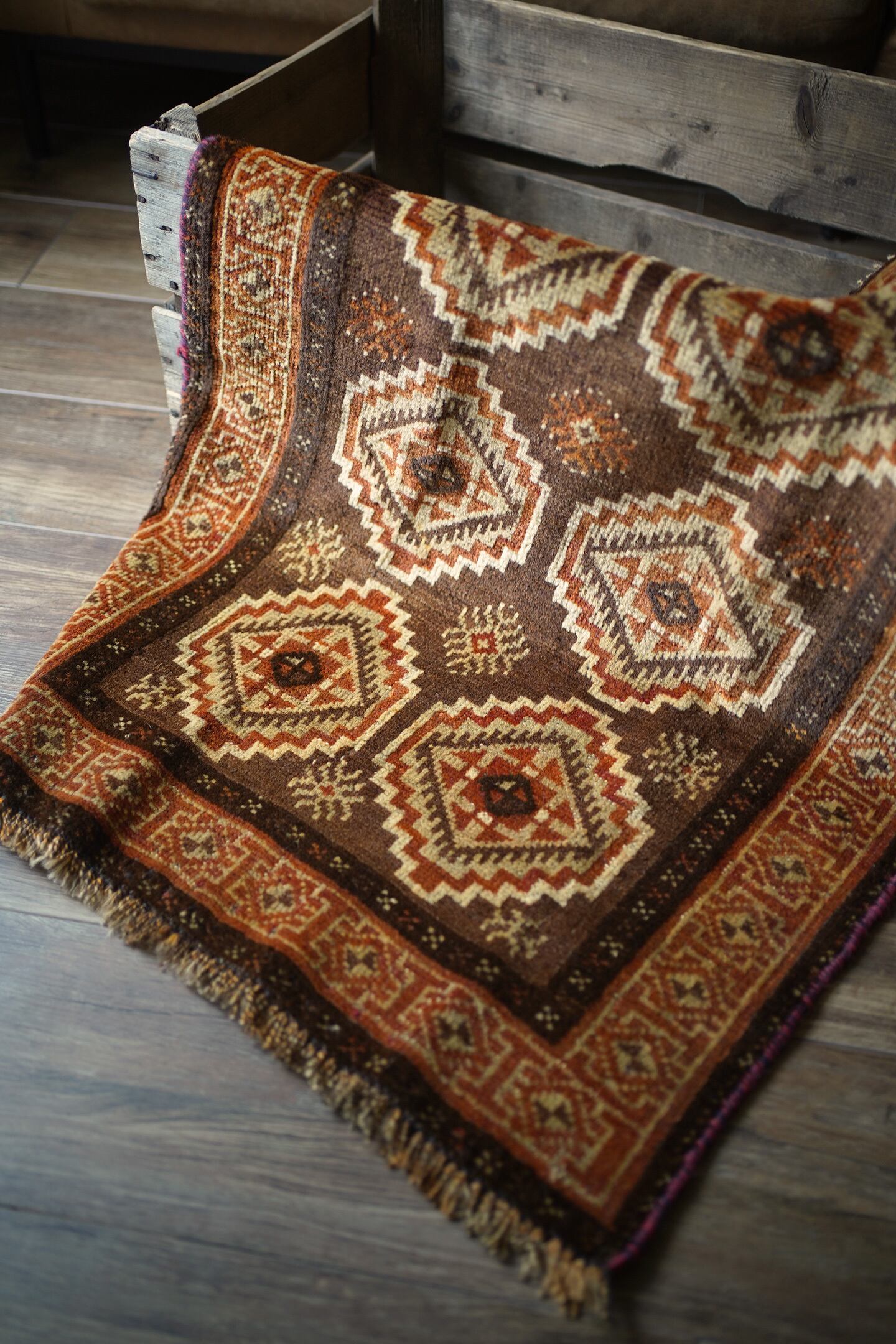 経年50年ほどのアフガニスタン産のバルーチラグ。ソフトウールでふわっと滑らかな気持ちの良い肌触りで、菱形紋様モチーフの洗練されたデザインがお洒落な一枚です。ブラウン、焦茶、ベージュ、暗いキャロットオレンジなどの配色で統一感のある色味が◎。厚みは5mm〜6mm程度。目立ったダメージや補修された跡もなく良好なコンディション。玄関や洗面スペース、キャビネット前などに♫