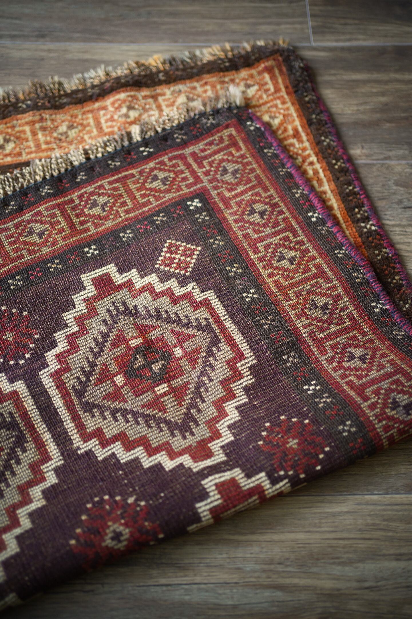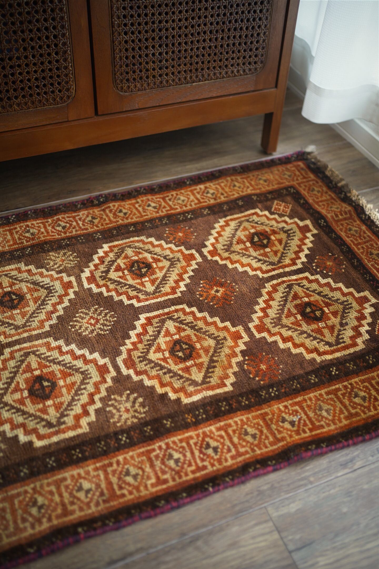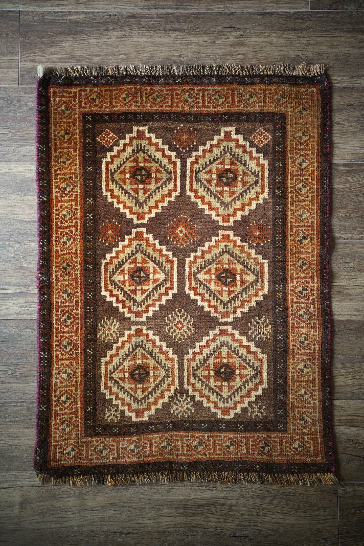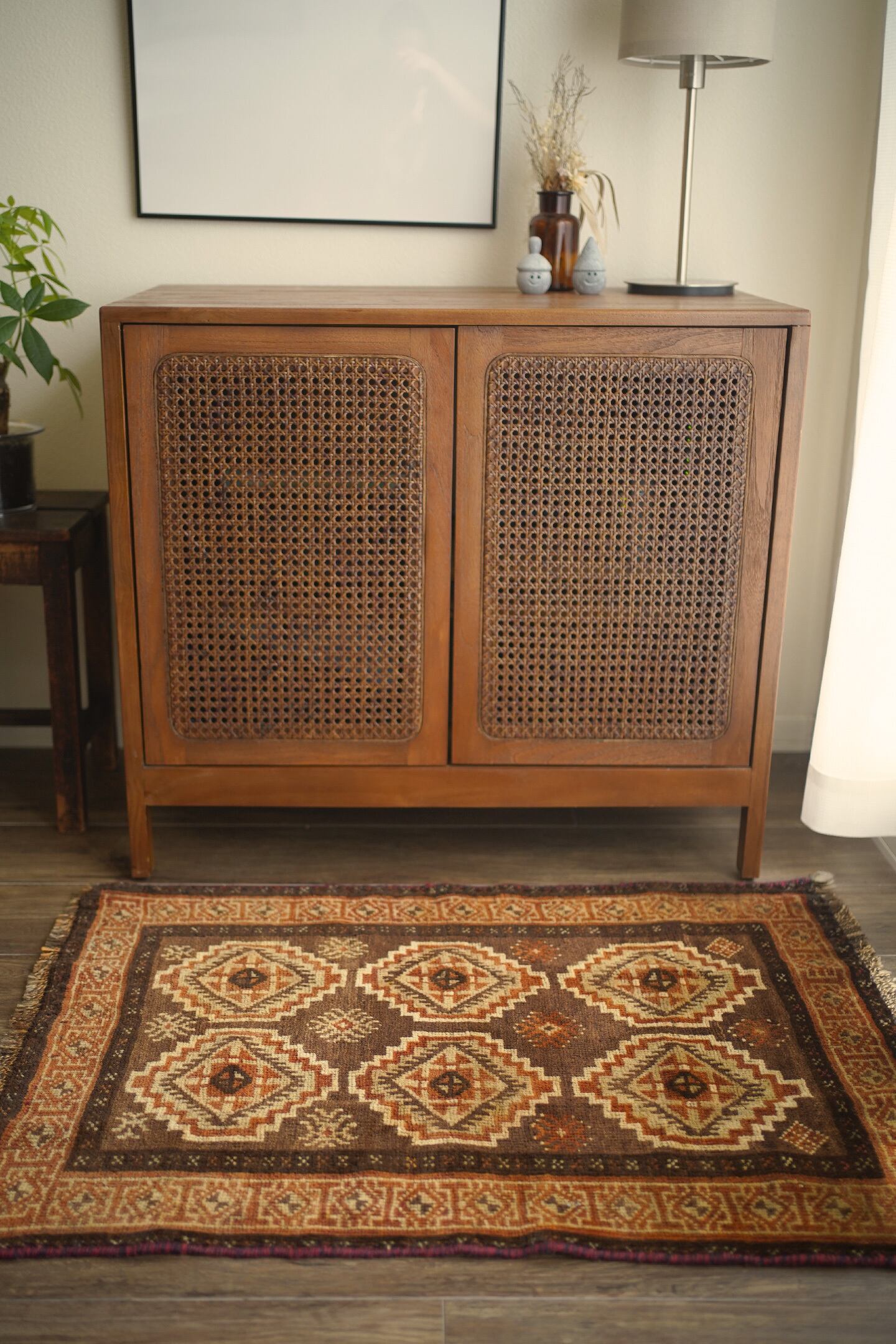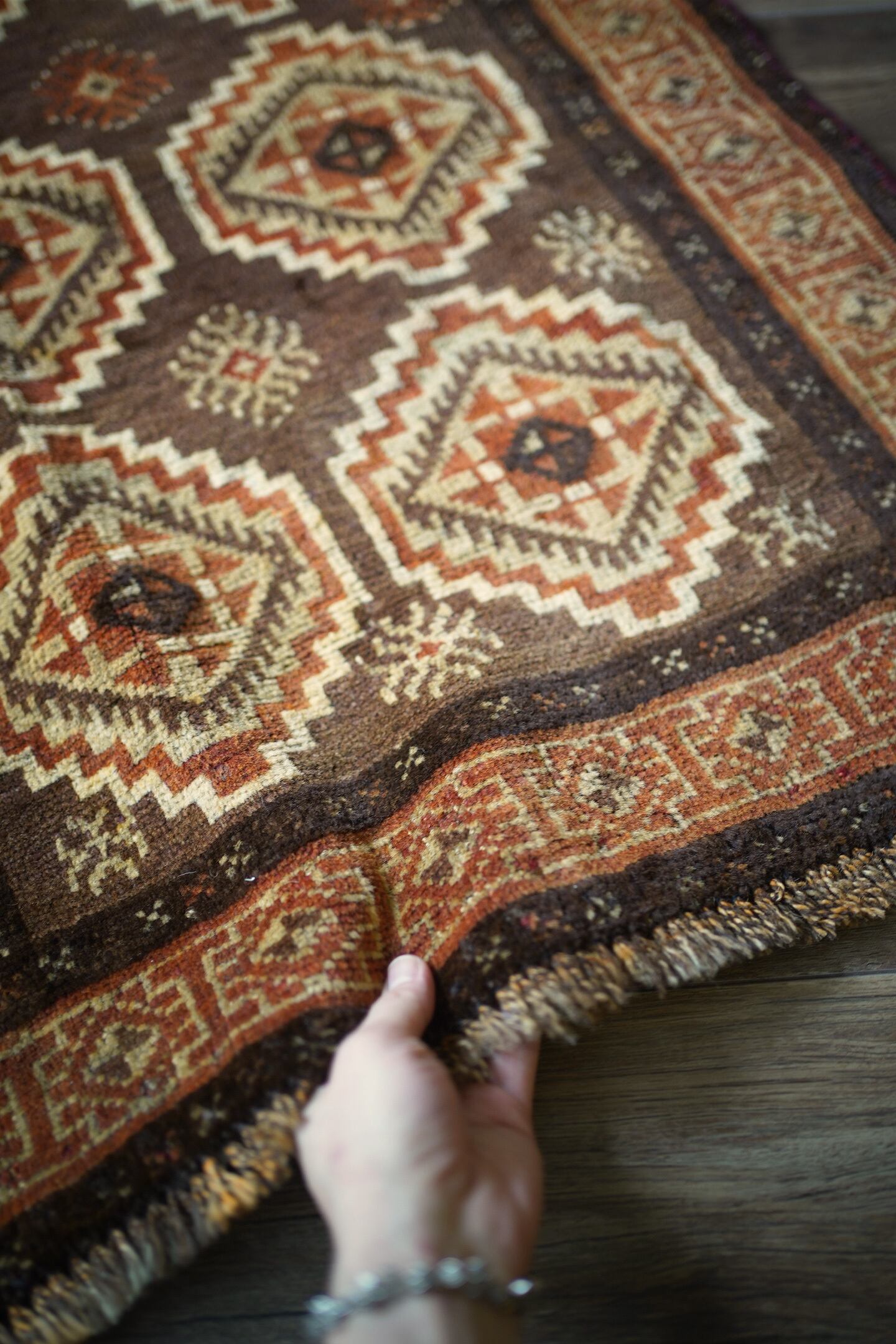 経年50年ほどのアフガニスタン産のバルーチラグ。ソフトウールでふわっと滑らかな気持ちの良い肌触りで、菱形紋様モチーフの洗練されたデザインがお洒落な一枚です。ブラウン、焦茶、ベージュ、暗いキャロットオレンジなどの配色で統一感のある色味が◎。厚みは5mm〜6mm程度。目立ったダメージや補修された跡もなく良好なコンディション。玄関や洗面スペース、キャビネット前などに♫