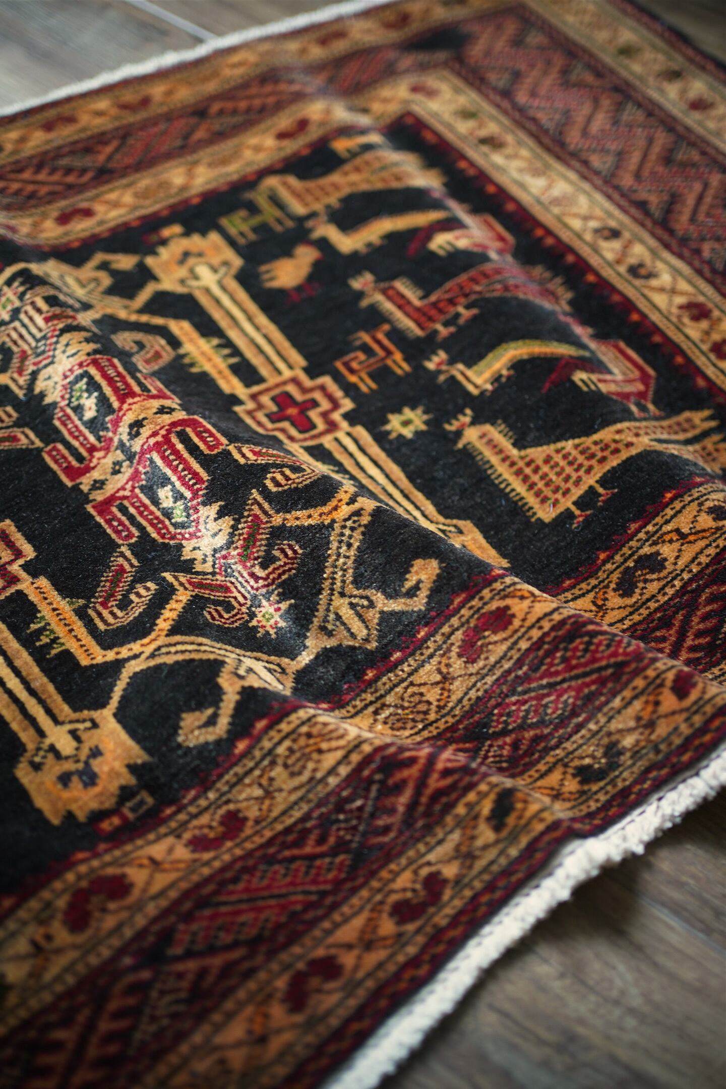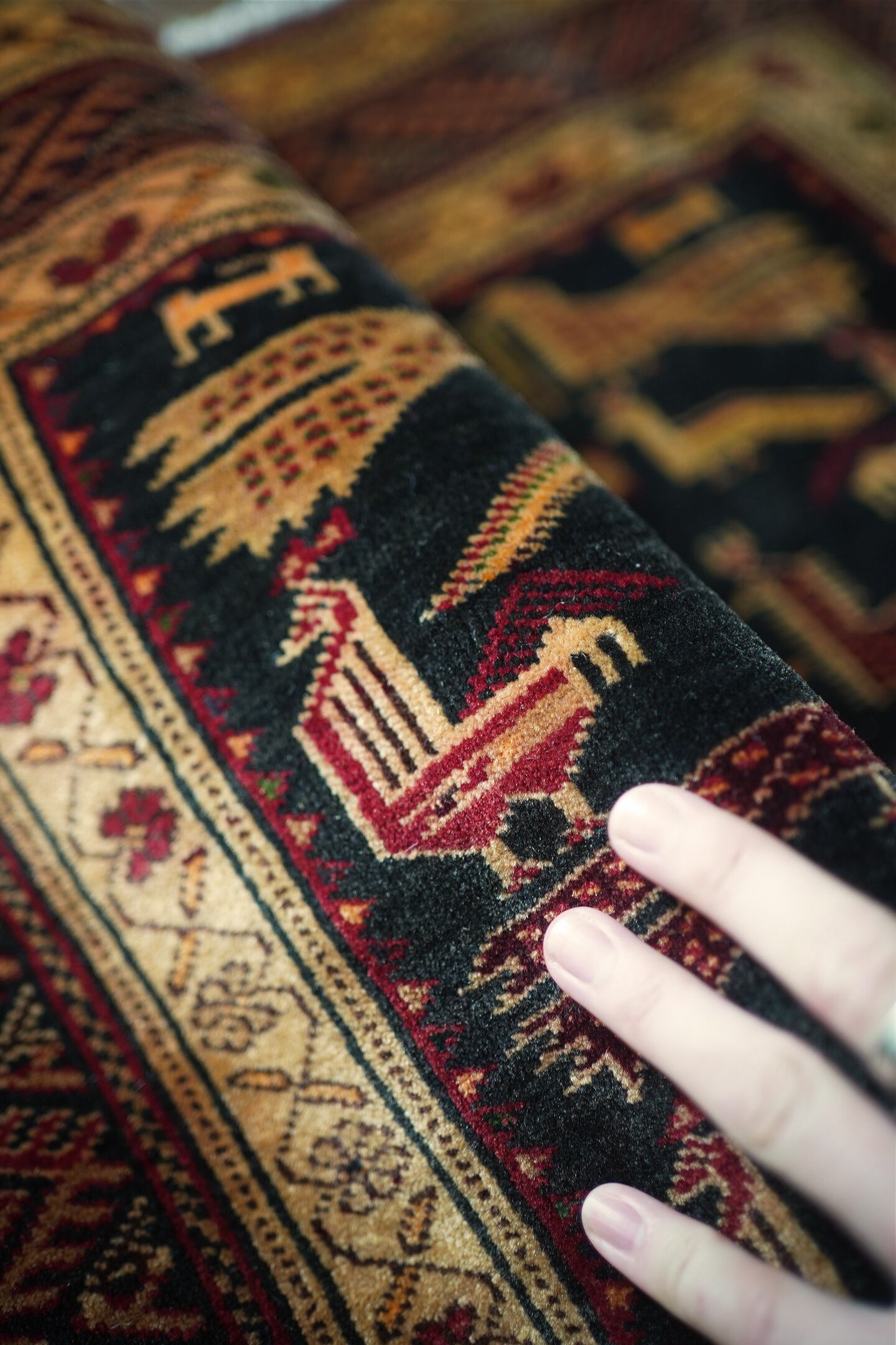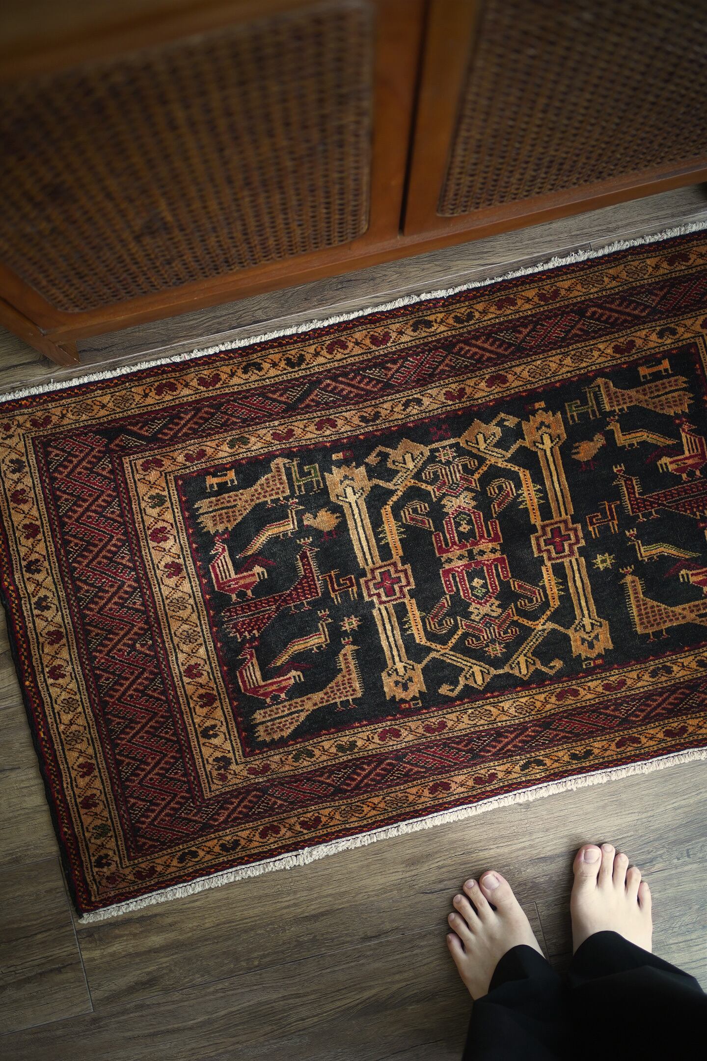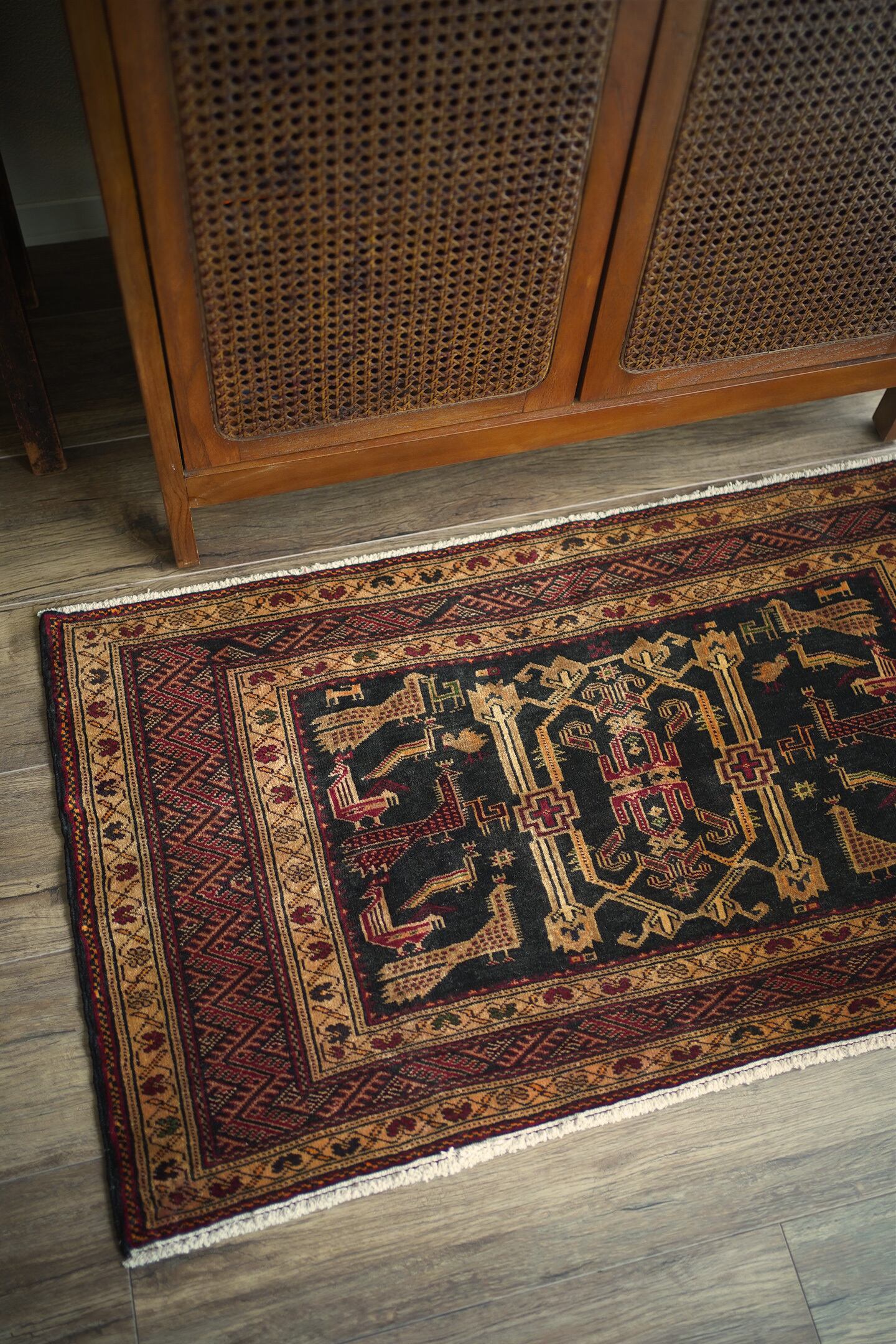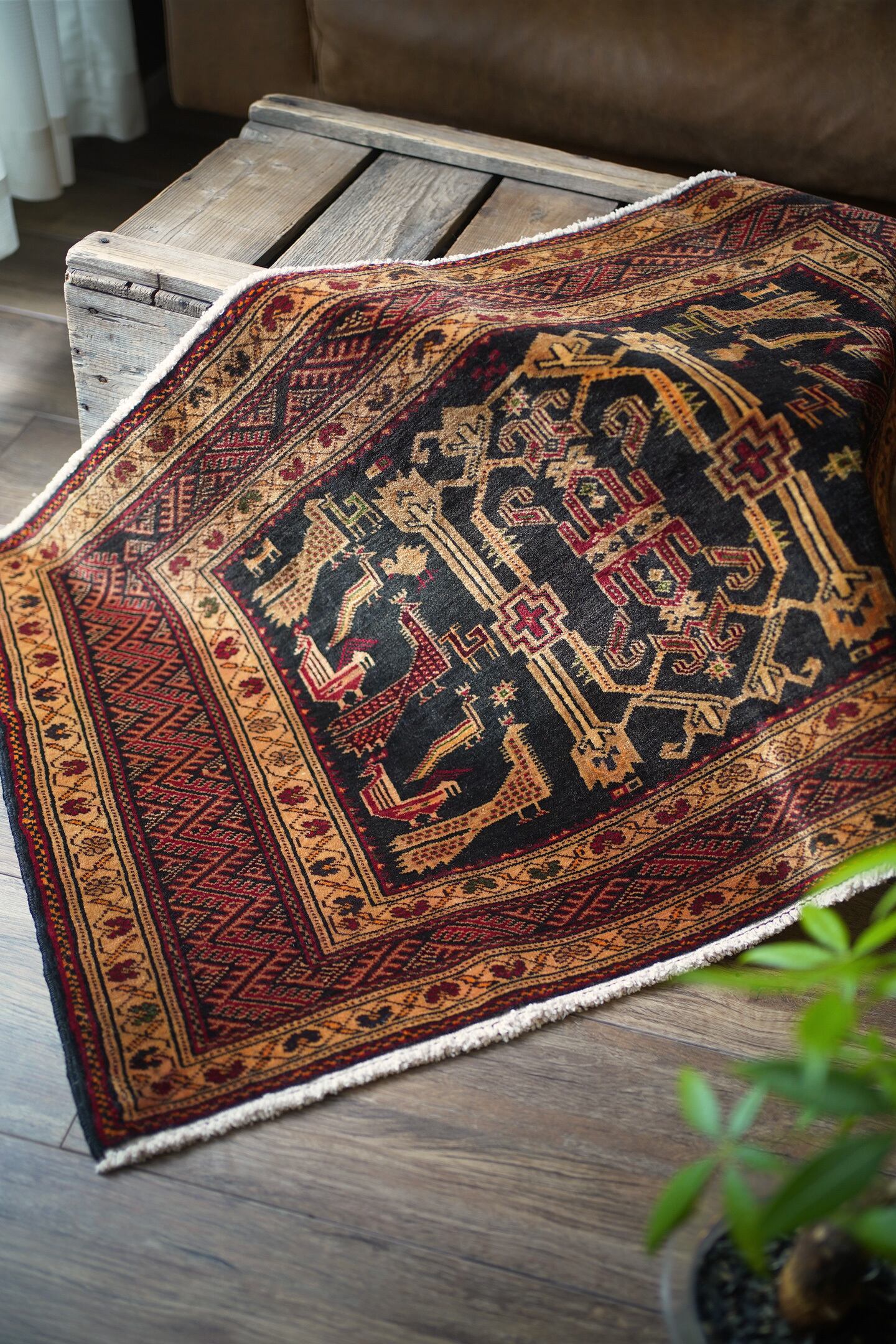 約40年前にバルーチ族によって織られたヴィンテージのラグです。様々な可愛い鳥たちが織り込まれた孔雀モチーフのデザインに一目惚れしました。全体的な配色はブラック、ダークレッド、ブラウン、薄いオレンジなど。パイルは目の詰まった質感で、フラットに整った長さの毛並みでとても上質感があります。表面はソフトウールで、さらモチっとした気持ちの良い肌触り。厚みは6mmほど。状態も非常に良くパーフェクト。タペストリーとしては大きめですが壁にかけて飾っても大変素敵かと思います。このサイズ感ではあまり見かけないタイプの珍しいデザインで店主イチオシです。