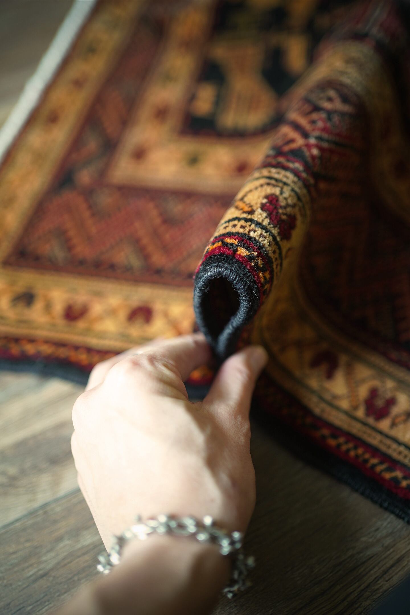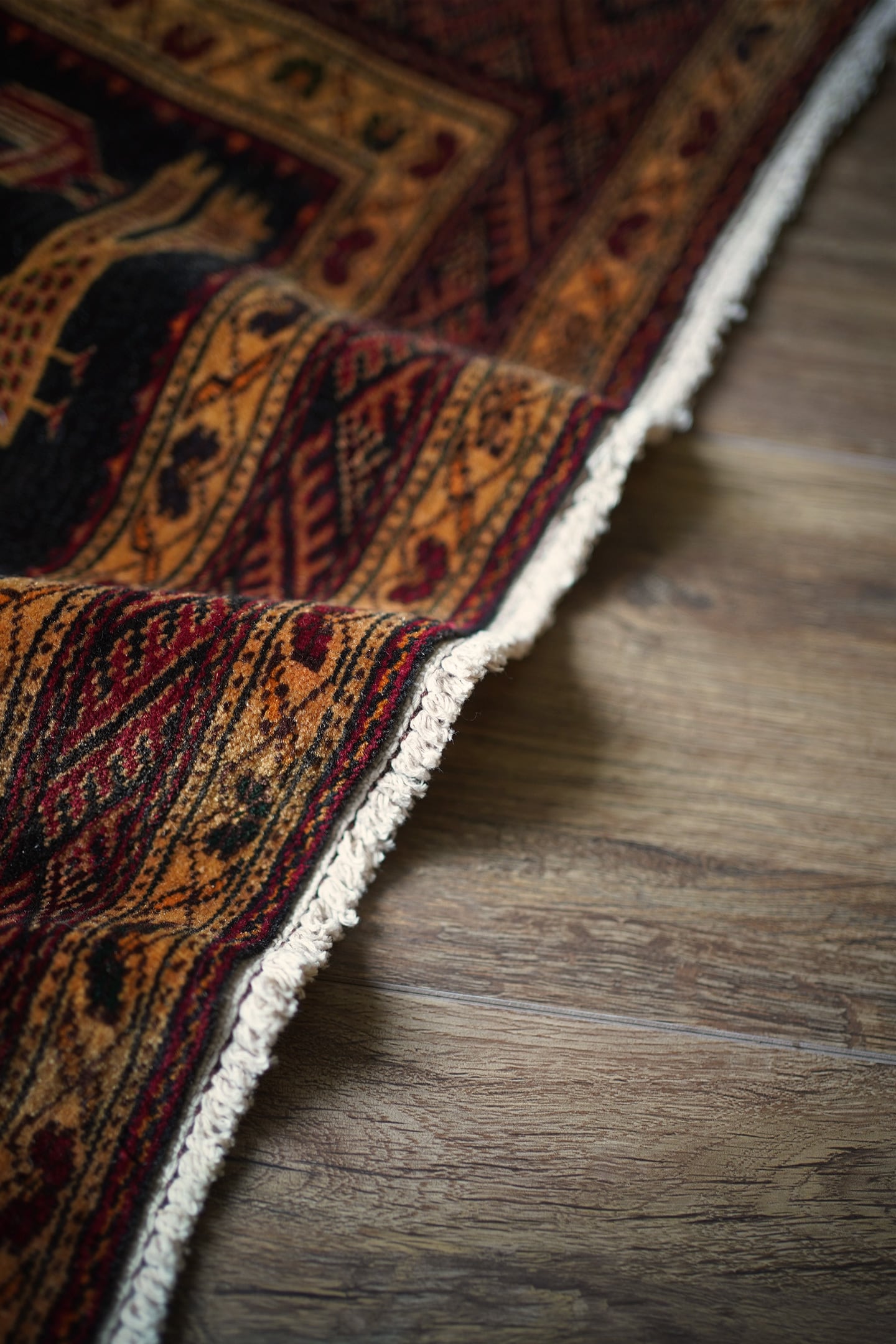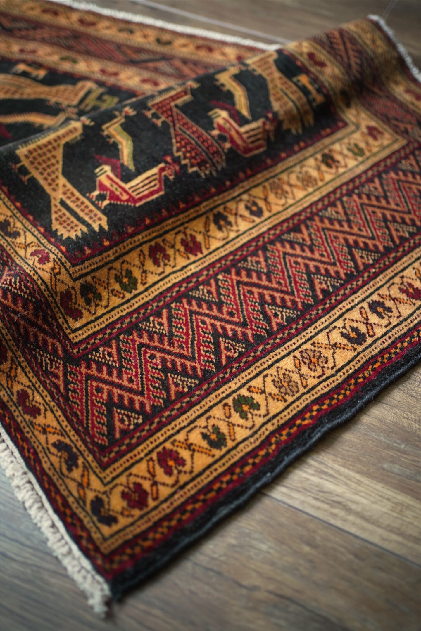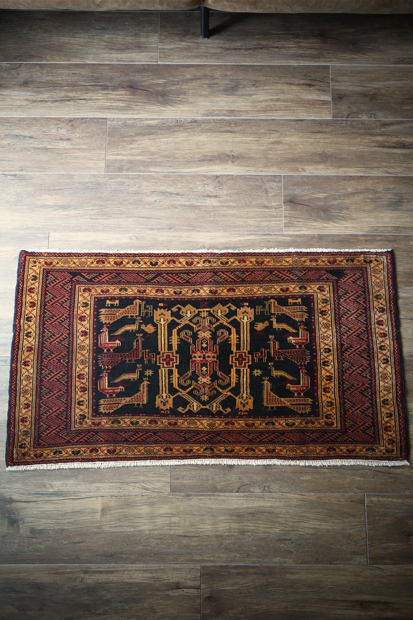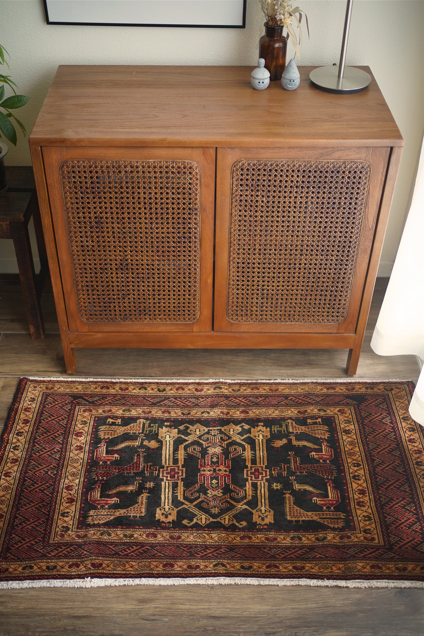 約40年前にバルーチ族によって織られたヴィンテージのラグです。様々な可愛い鳥たちが織り込まれた孔雀モチーフのデザインに一目惚れしました。全体的な配色はブラック、ダークレッド、ブラウン、薄いオレンジなど。パイルは目の詰まった質感で、フラットに整った長さの毛並みでとても上質感があります。表面はソフトウールで、さらモチっとした気持ちの良い肌触り。厚みは6mmほど。状態も非常に良くパーフェクト。タペストリーとしては大きめですが壁にかけて飾っても大変素敵かと思います。このサイズ感ではあまり見かけないタイプの珍しいデザインで店主イチオシです。