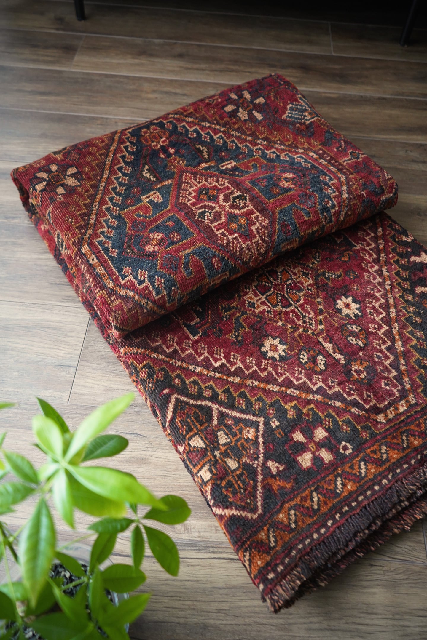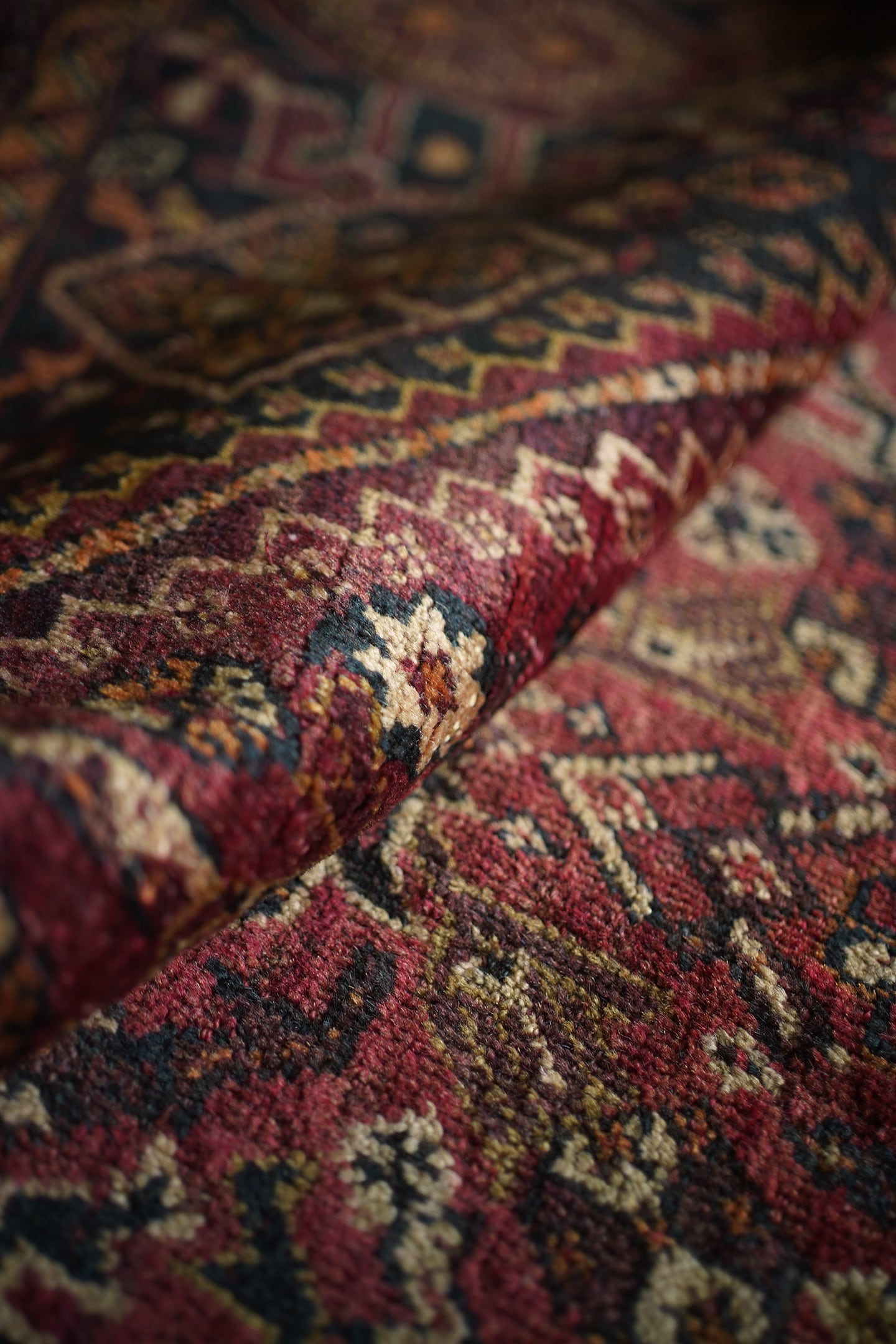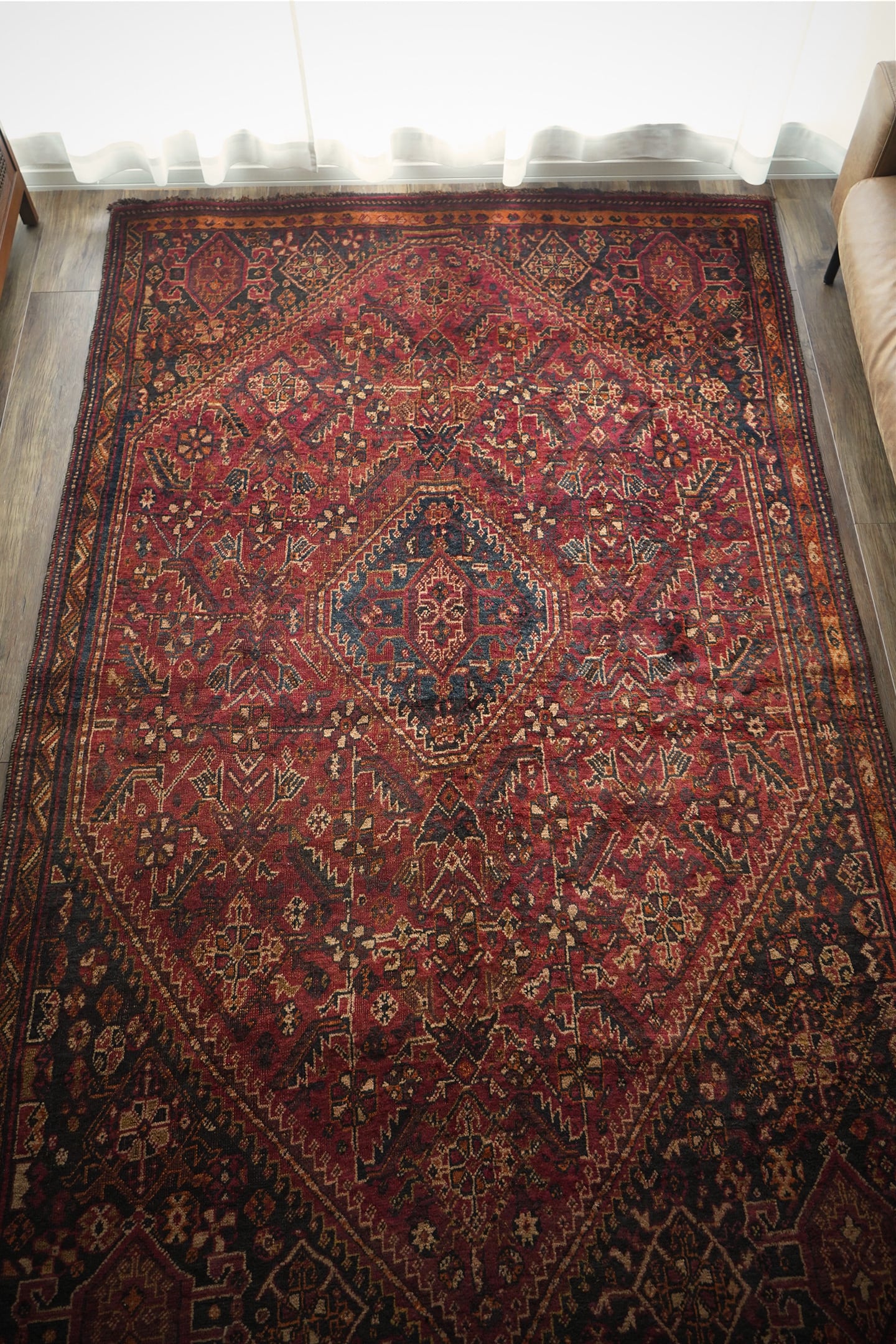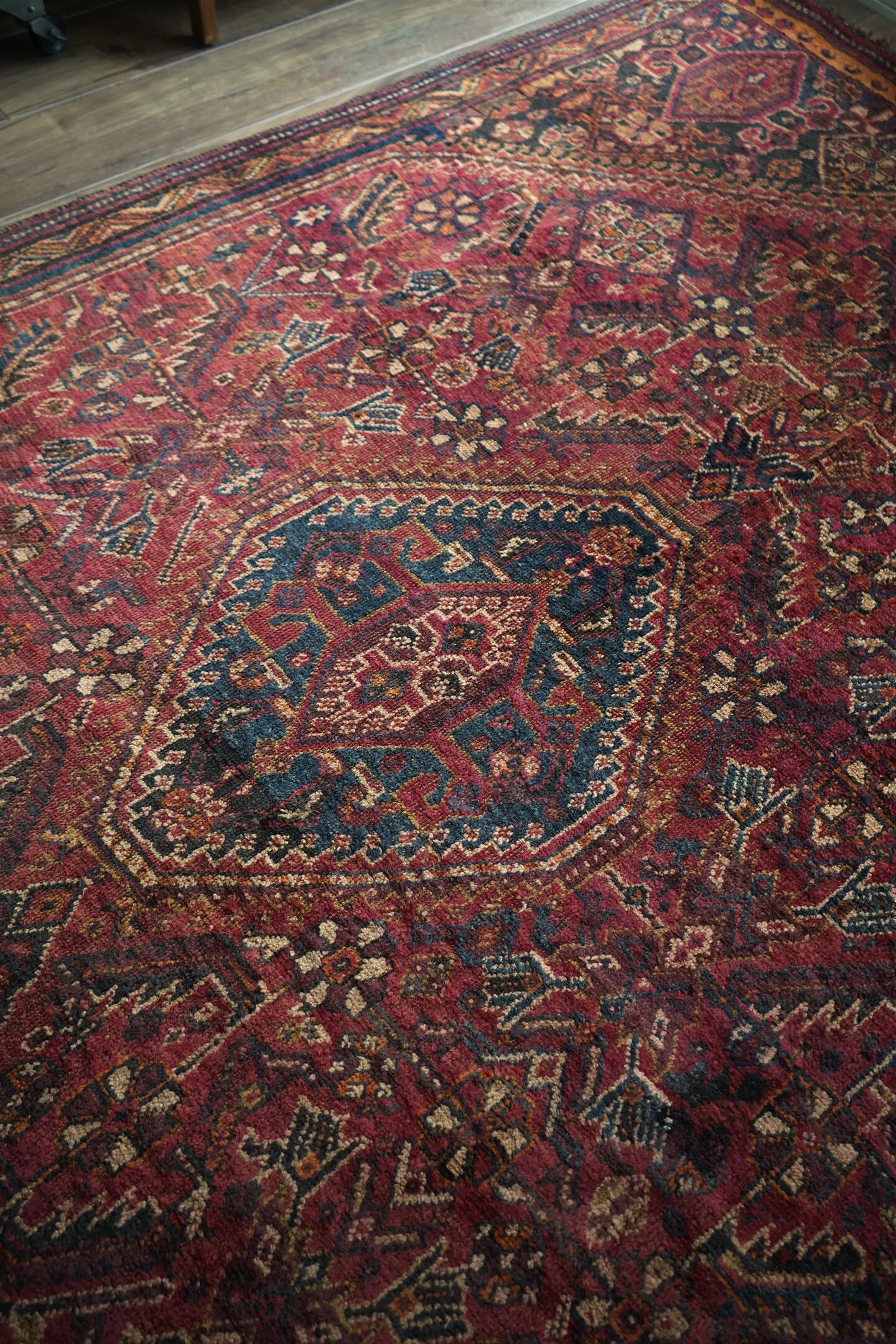 おおよそ60年前にイラン南西部に居住するカシュガイ族によって織られたラグです。経年を感じるヴィンテージ感あふれる渋い風合いが魅力的で、中央に配置されたメダリオンのネイビーとフィールドの奥行きのある暗めの赤のコントラストが目を惹きます。全体的に統一感のある色味のため、お部屋のインテリアに取り入れやすいかと思います。表面はサラふわっとした肌触りでオールシーズン快適にご使用いただける質感です。厚みは8mmほど。目立ったダメージなどもなく良好なコンディション。大判なのでリビングのソファ前はもちろん、大きなダイニングテーブルに合わせたりしても素敵かと思います。