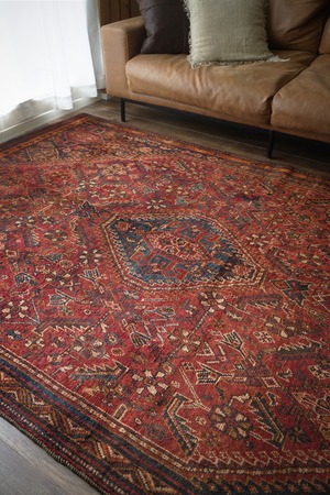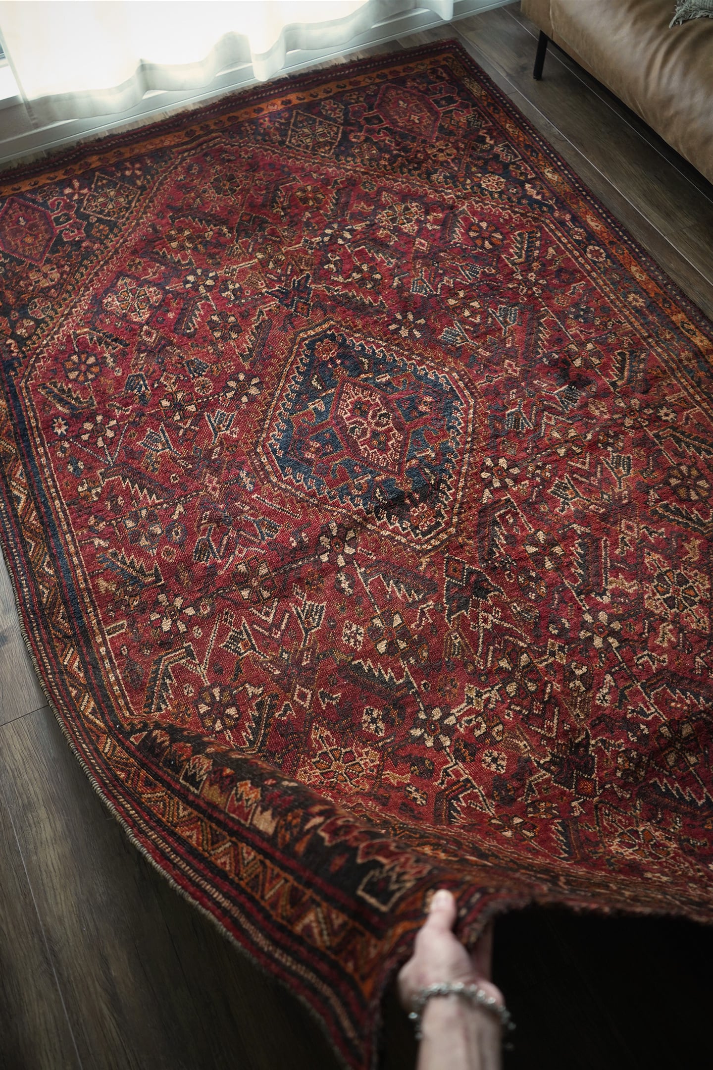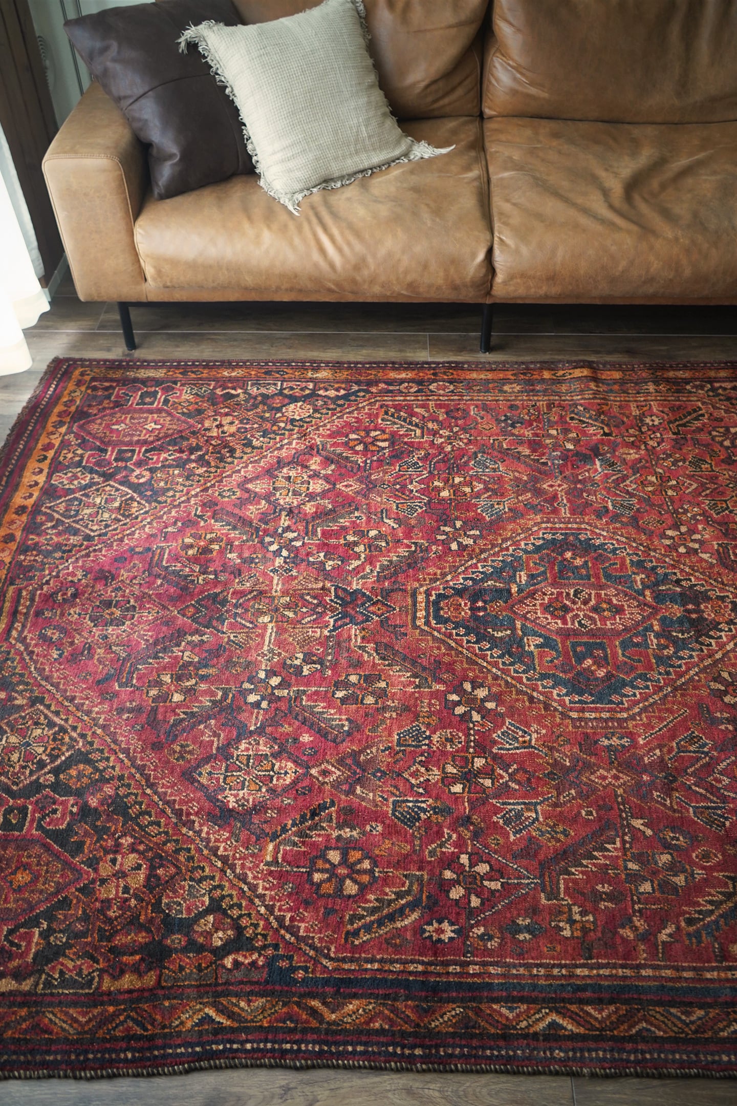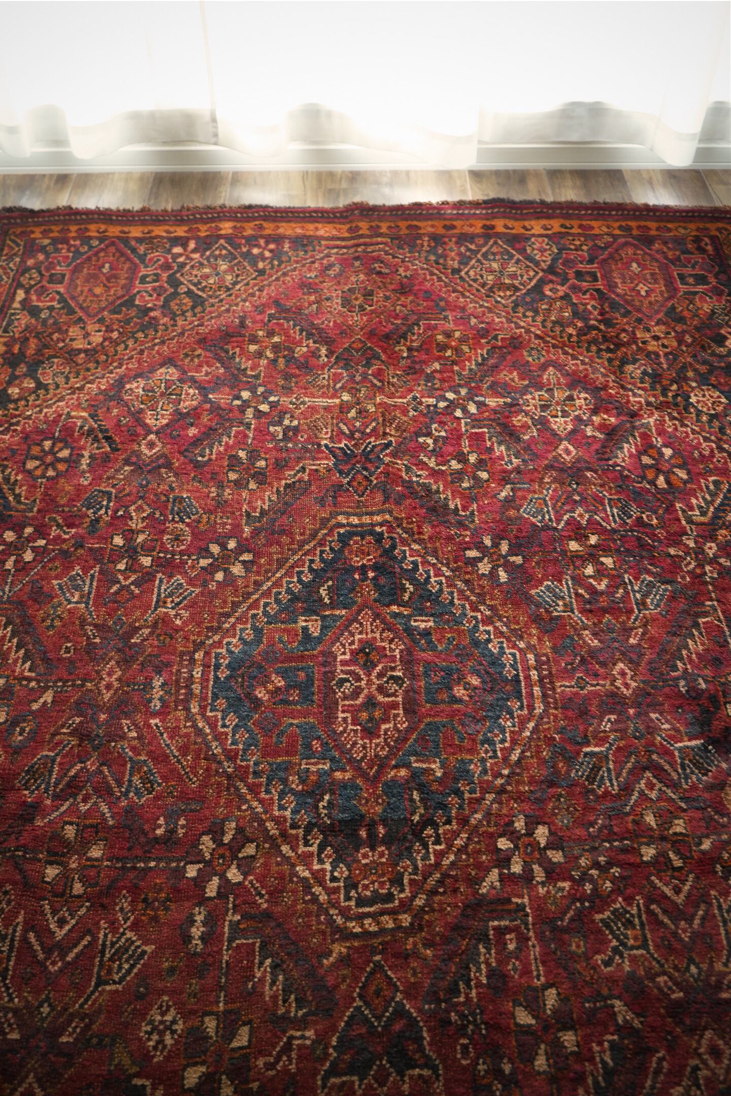 おおよそ60年前にイラン南西部に居住するカシュガイ族によって織られたラグです。経年を感じるヴィンテージ感あふれる渋い風合いが魅力的で、中央に配置されたメダリオンのネイビーとフィールドの奥行きのある暗めの赤のコントラストが目を惹きます。全体的に統一感のある色味のため、お部屋のインテリアに取り入れやすいかと思います。表面はサラふわっとした肌触りでオールシーズン快適にご使用いただける質感です。厚みは8mmほど。目立ったダメージなどもなく良好なコンディション。大判なのでリビングのソファ前はもちろん、大きなダイニングテーブルに合わせたりしても素敵かと思います。