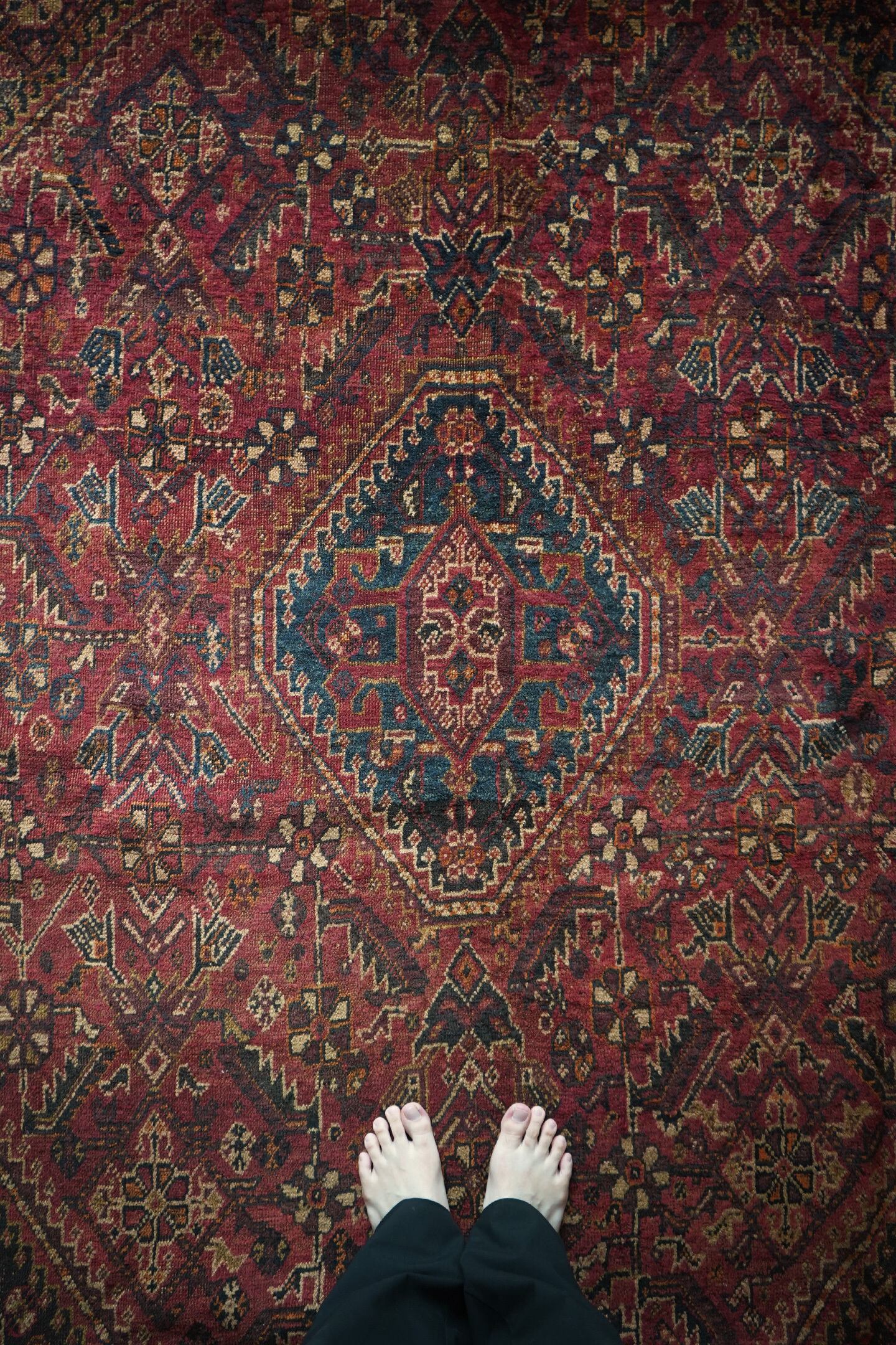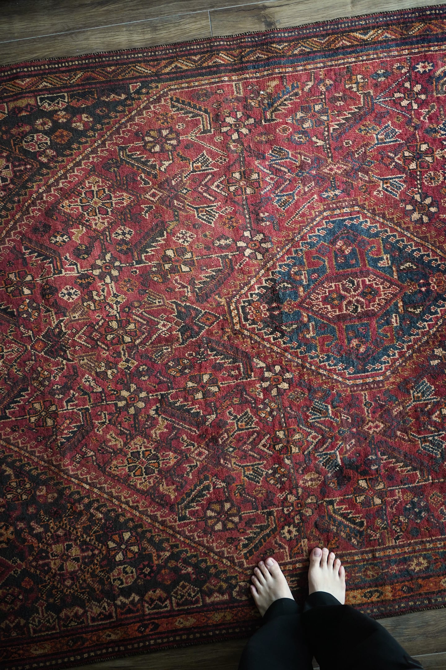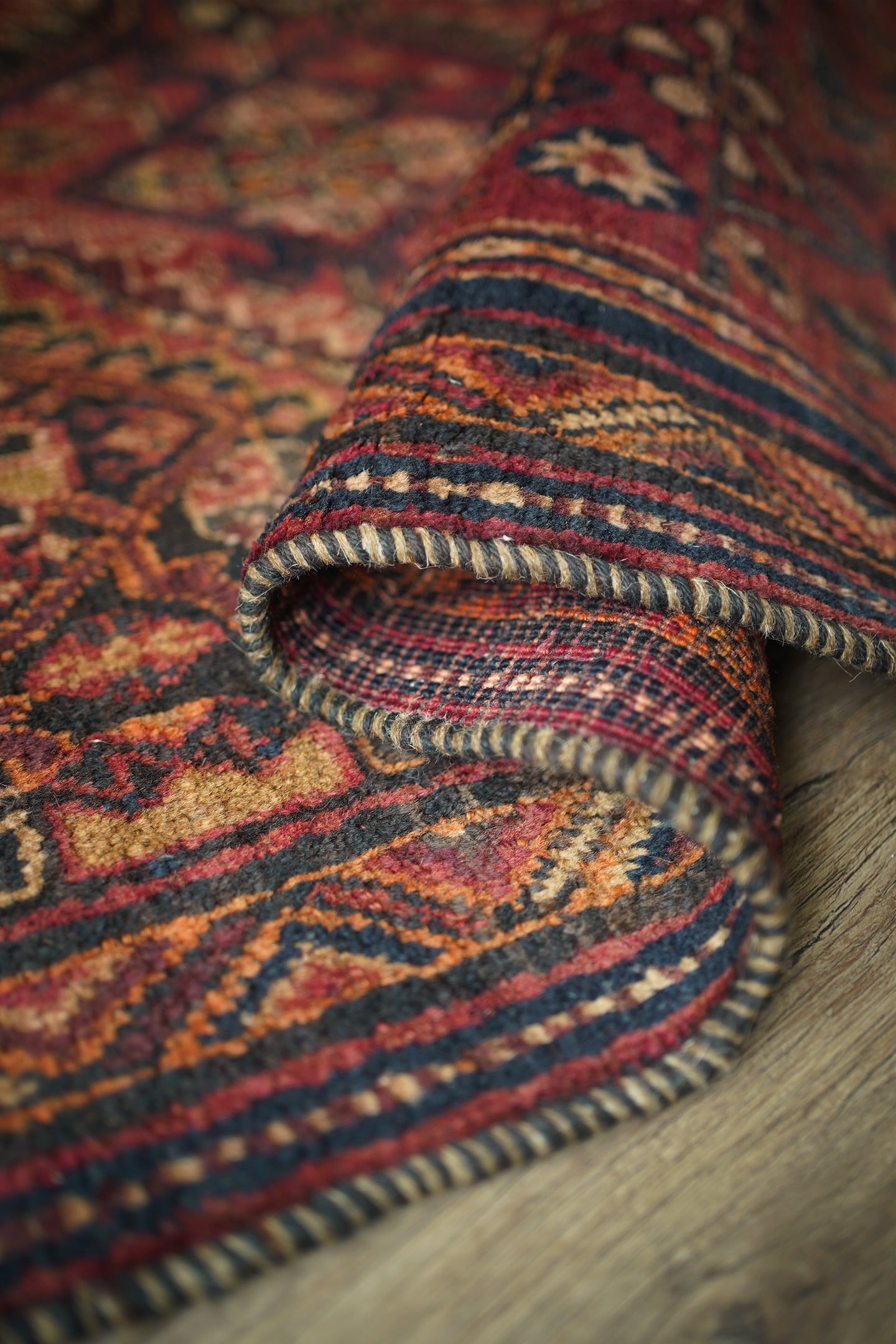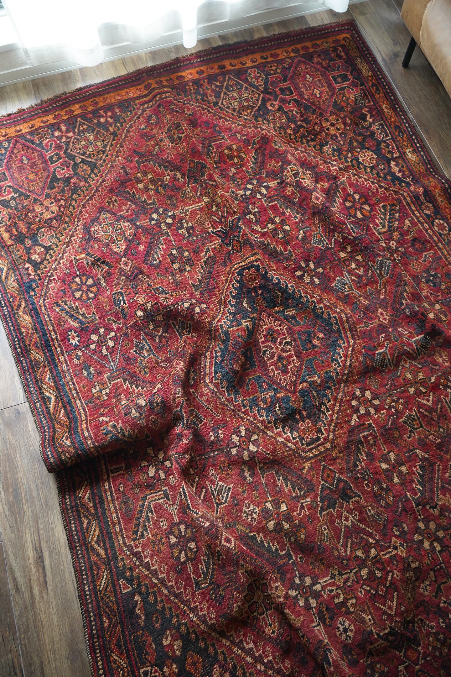 おおよそ60年前にイラン南西部に居住するカシュガイ族によって織られたラグです。経年を感じるヴィンテージ感あふれる渋い風合いが魅力的で、中央に配置されたメダリオンのネイビーとフィールドの奥行きのある暗めの赤のコントラストが目を惹きます。全体的に統一感のある色味のため、お部屋のインテリアに取り入れやすいかと思います。表面はサラふわっとした肌触りでオールシーズン快適にご使用いただける質感です。厚みは8mmほど。目立ったダメージなどもなく良好なコンディション。大判なのでリビングのソファ前はもちろん、大きなダイニングテーブルに合わせたりしても素敵かと思います。