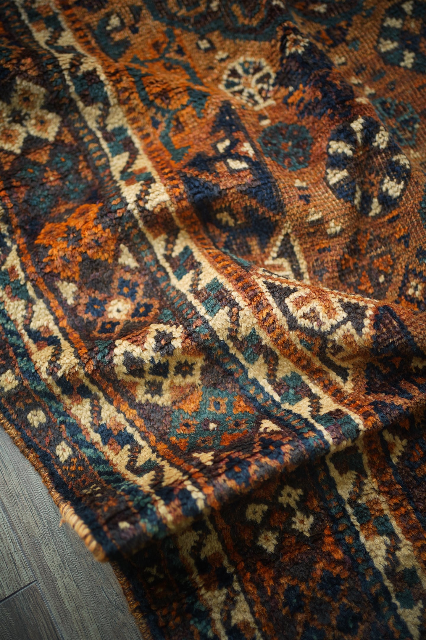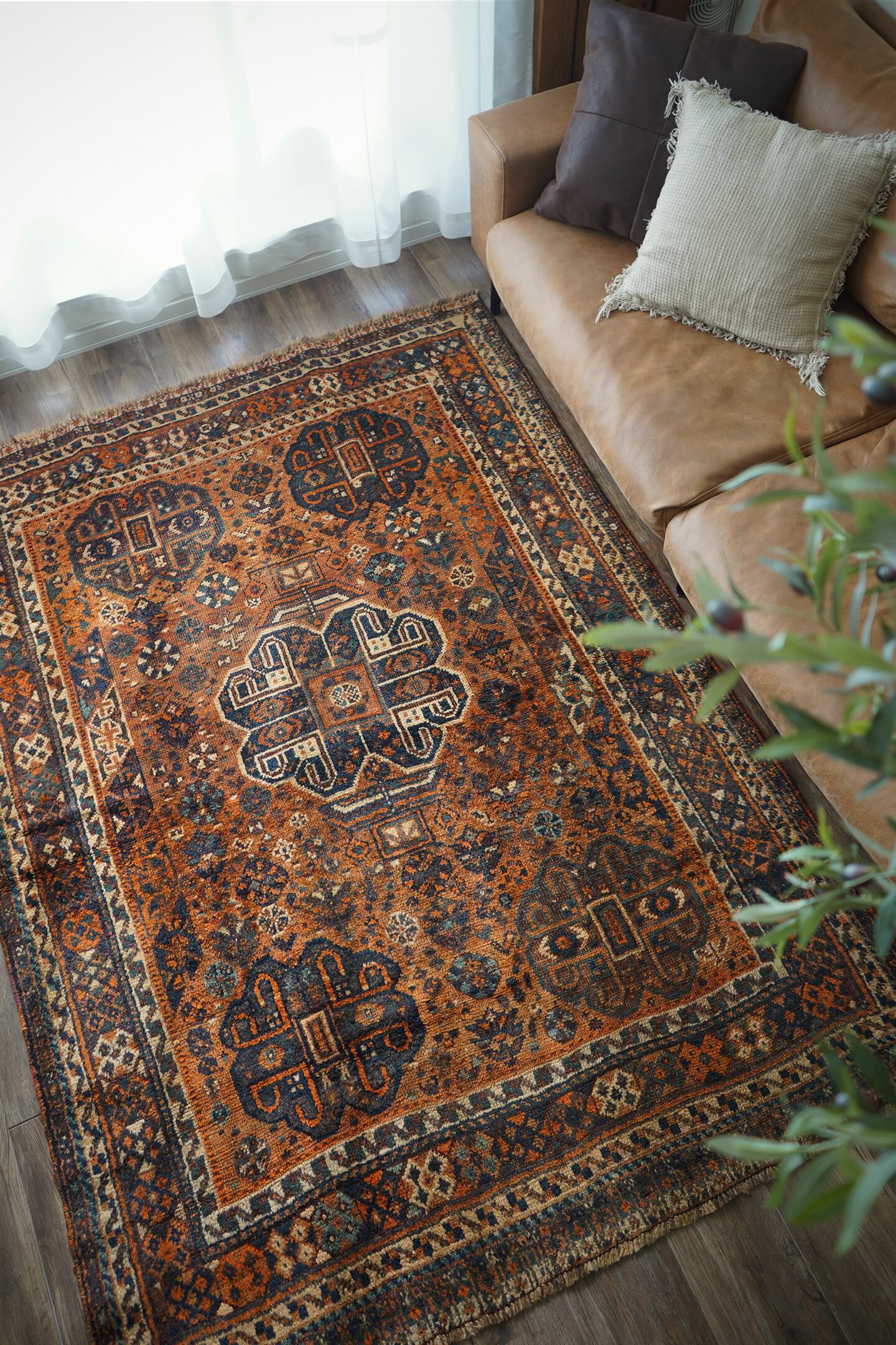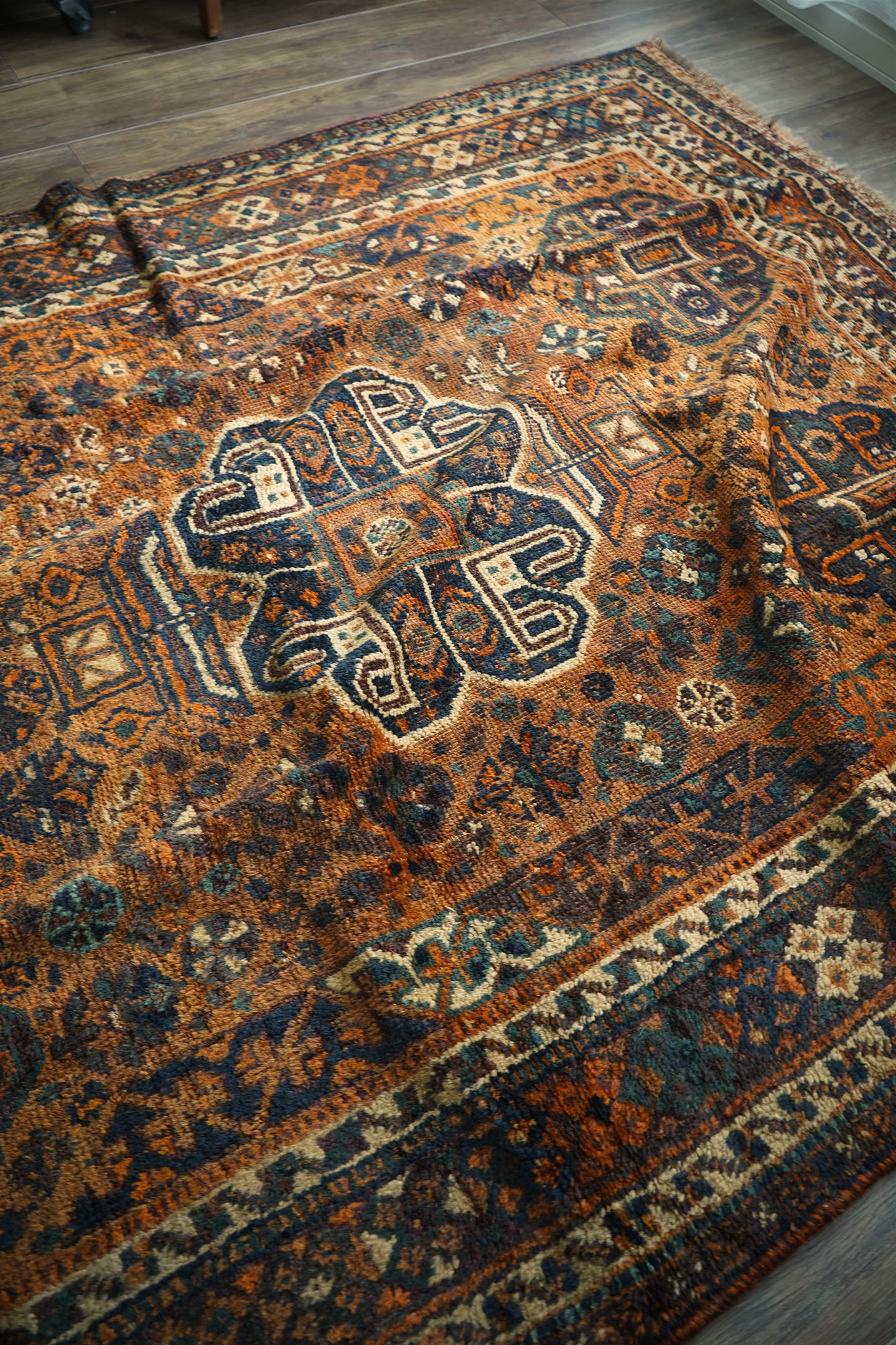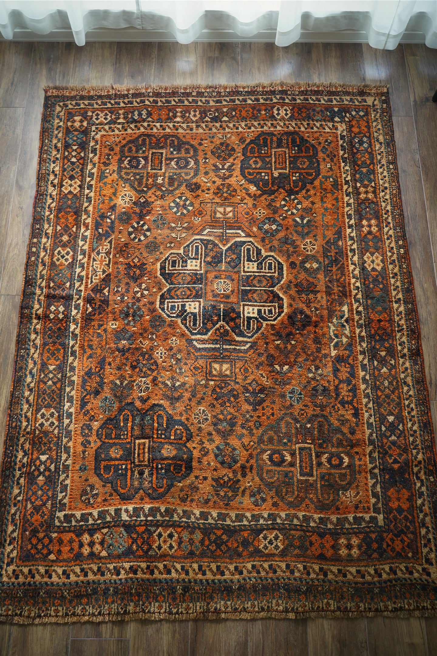 おおよそ80年前にイラン南西部に居住するカシュガイ族によって織られたセミアンティークのラグ。象徴的な可愛いフォルムのメダリオンの周りには魔除けを意味する"狼の足跡"やよく見ると鳥のような紋様も見受けられます。少しブラウンにも見える暗めなオレンジにアクセントカラーで使われたブルーグリーンが素敵な配色の一枚。経年を感じられる渋めの風合いで、アンティーク家具との相性も良さそうです。表面はふわっと柔らかく優しい肌触りで、厚みは8mm程度。パイルが低くなっている箇所もありますが、全体的に綺麗に毛並みも残っています。目立ったダメージや補修跡も見られず状態良好です。カシュガイラグをお探しの方に。