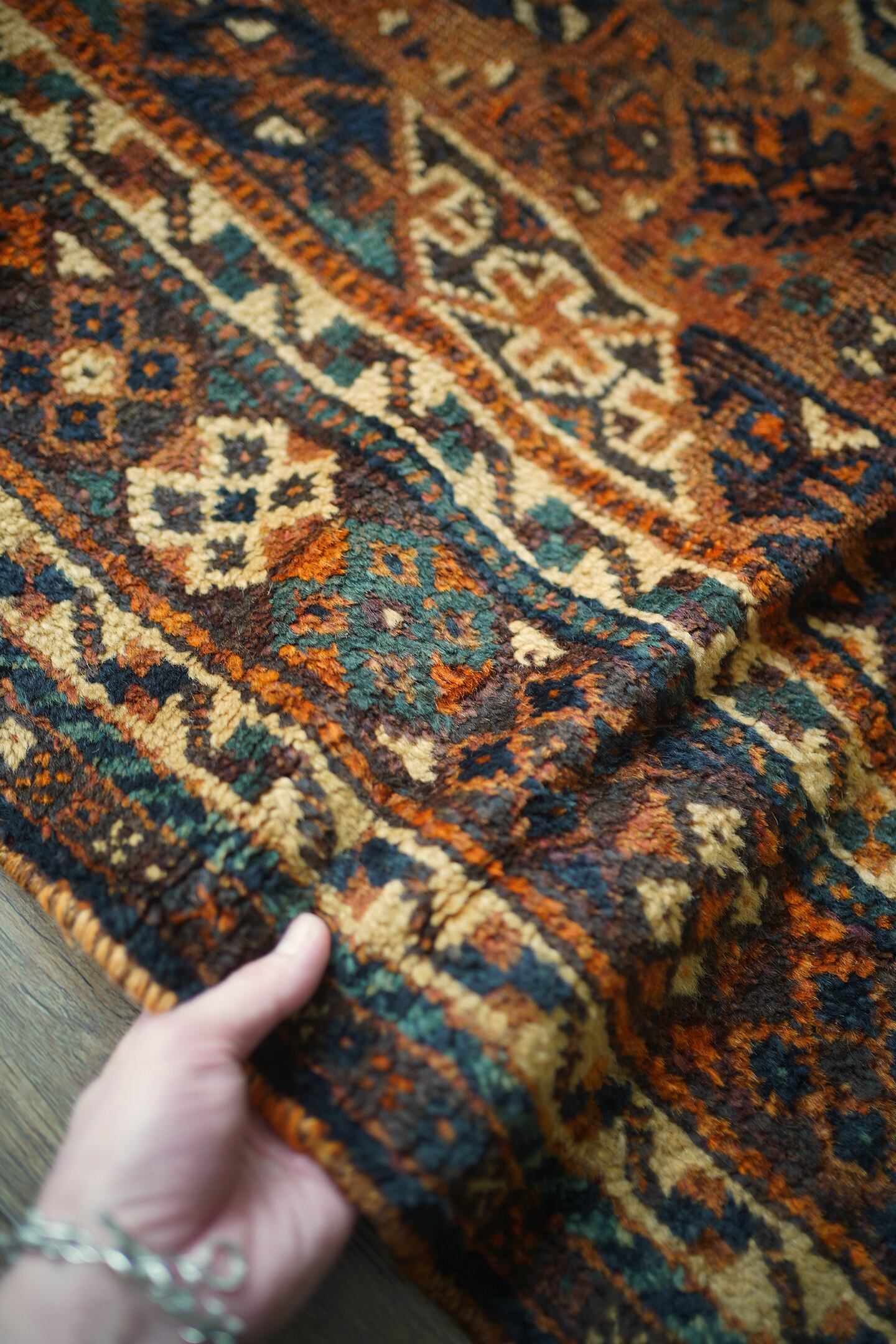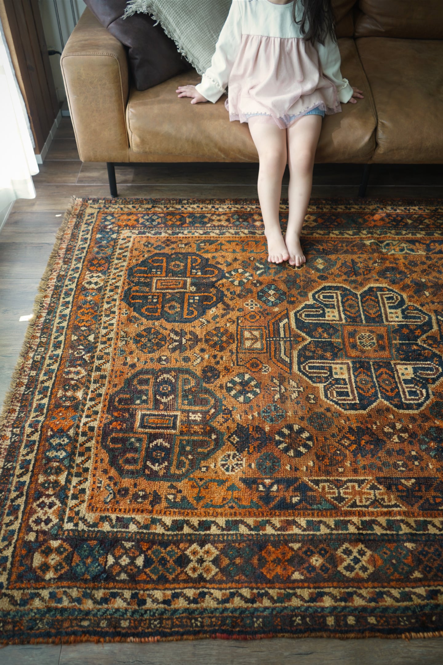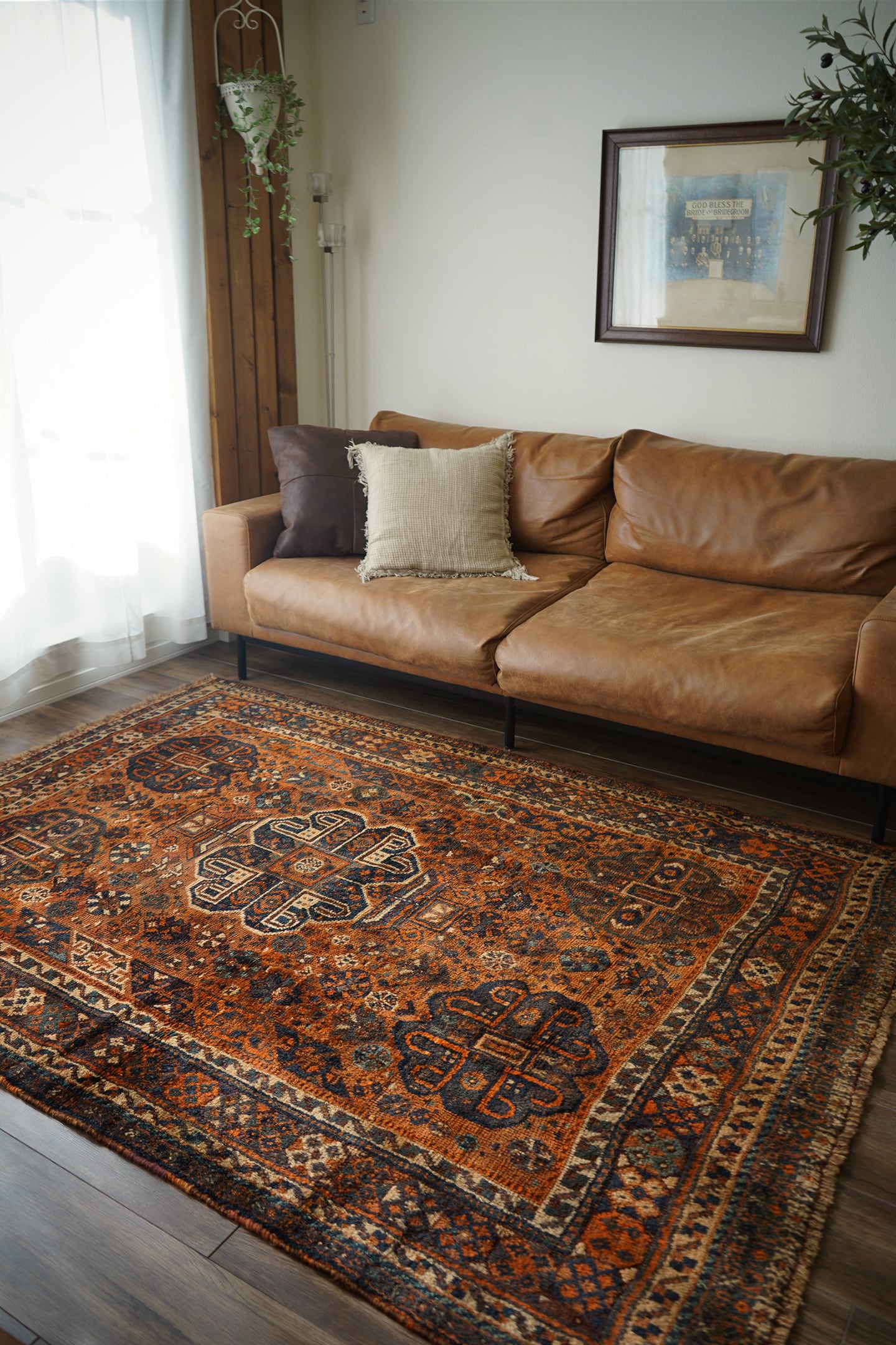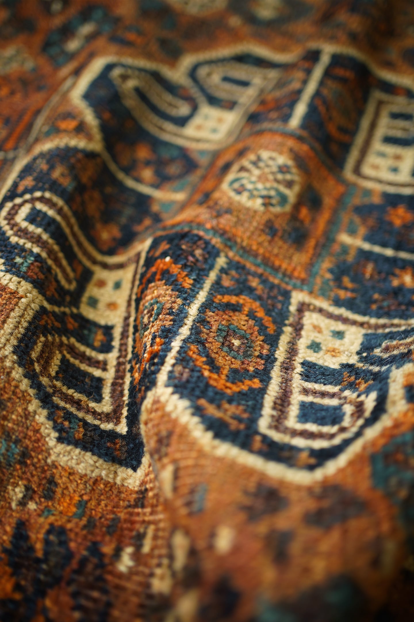 おおよそ80年前にイラン南西部に居住するカシュガイ族によって織られたセミアンティークのラグ。象徴的な可愛いフォルムのメダリオンの周りには魔除けを意味する"狼の足跡"やよく見ると鳥のような紋様も見受けられます。少しブラウンにも見える暗めなオレンジにアクセントカラーで使われたブルーグリーンが素敵な配色の一枚。経年を感じられる渋めの風合いで、アンティーク家具との相性も良さそうです。表面はふわっと柔らかく優しい肌触りで、厚みは8mm程度。パイルが低くなっている箇所もありますが、全体的に綺麗に毛並みも残っています。目立ったダメージや補修跡も見られず状態良好です。カシュガイラグをお探しの方に。