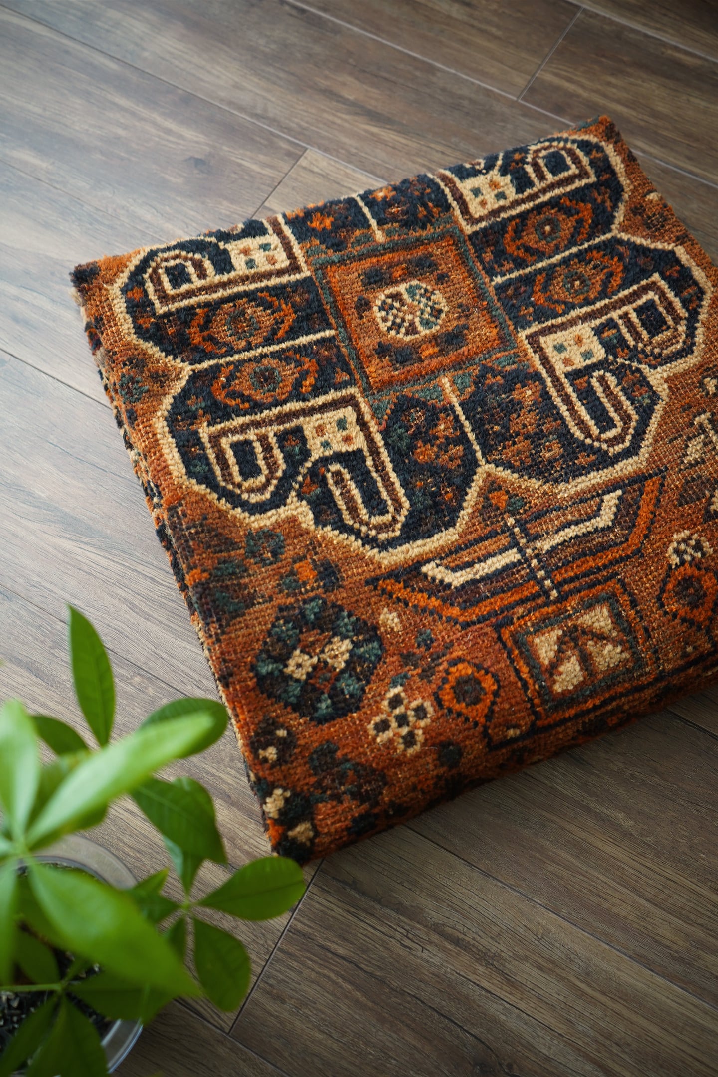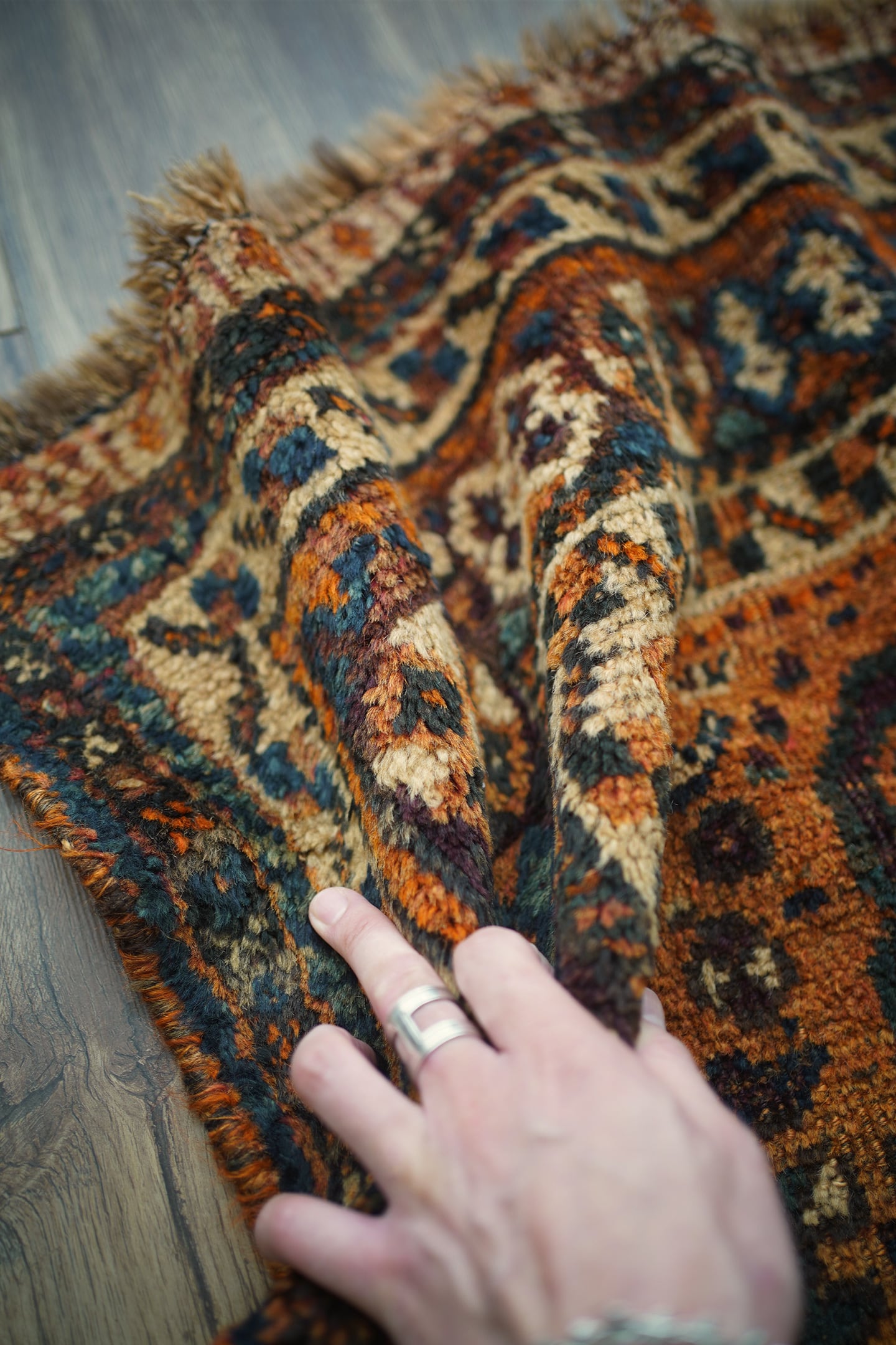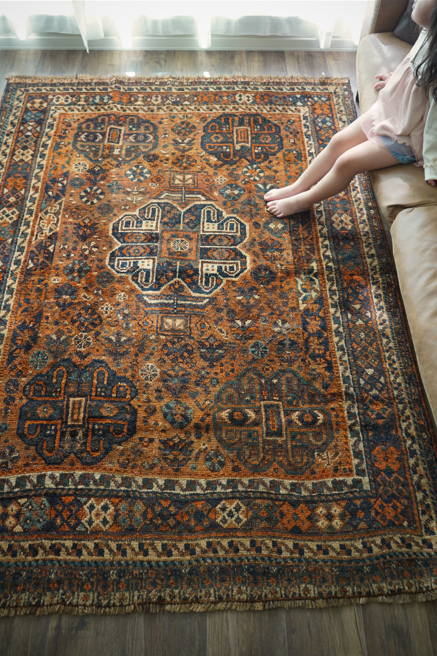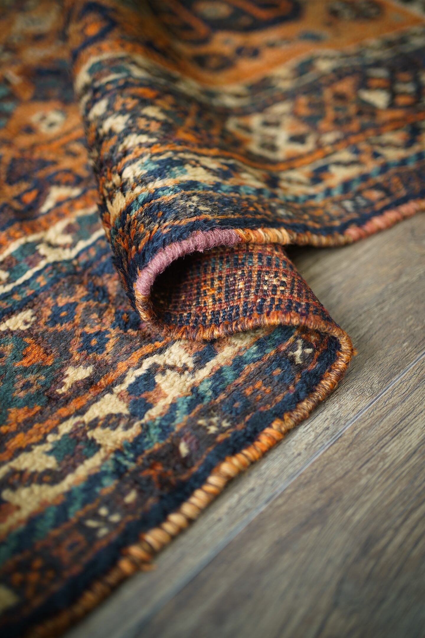 おおよそ80年前にイラン南西部に居住するカシュガイ族によって織られたセミアンティークのラグ。象徴的な可愛いフォルムのメダリオンの周りには魔除けを意味する"狼の足跡"やよく見ると鳥のような紋様も見受けられます。少しブラウンにも見える暗めなオレンジにアクセントカラーで使われたブルーグリーンが素敵な配色の一枚。経年を感じられる渋めの風合いで、アンティーク家具との相性も良さそうです。表面はふわっと柔らかく優しい肌触りで、厚みは8mm程度。パイルが低くなっている箇所もありますが、全体的に綺麗に毛並みも残っています。目立ったダメージや補修跡も見られず状態良好です。カシュガイラグをお探しの方に。
