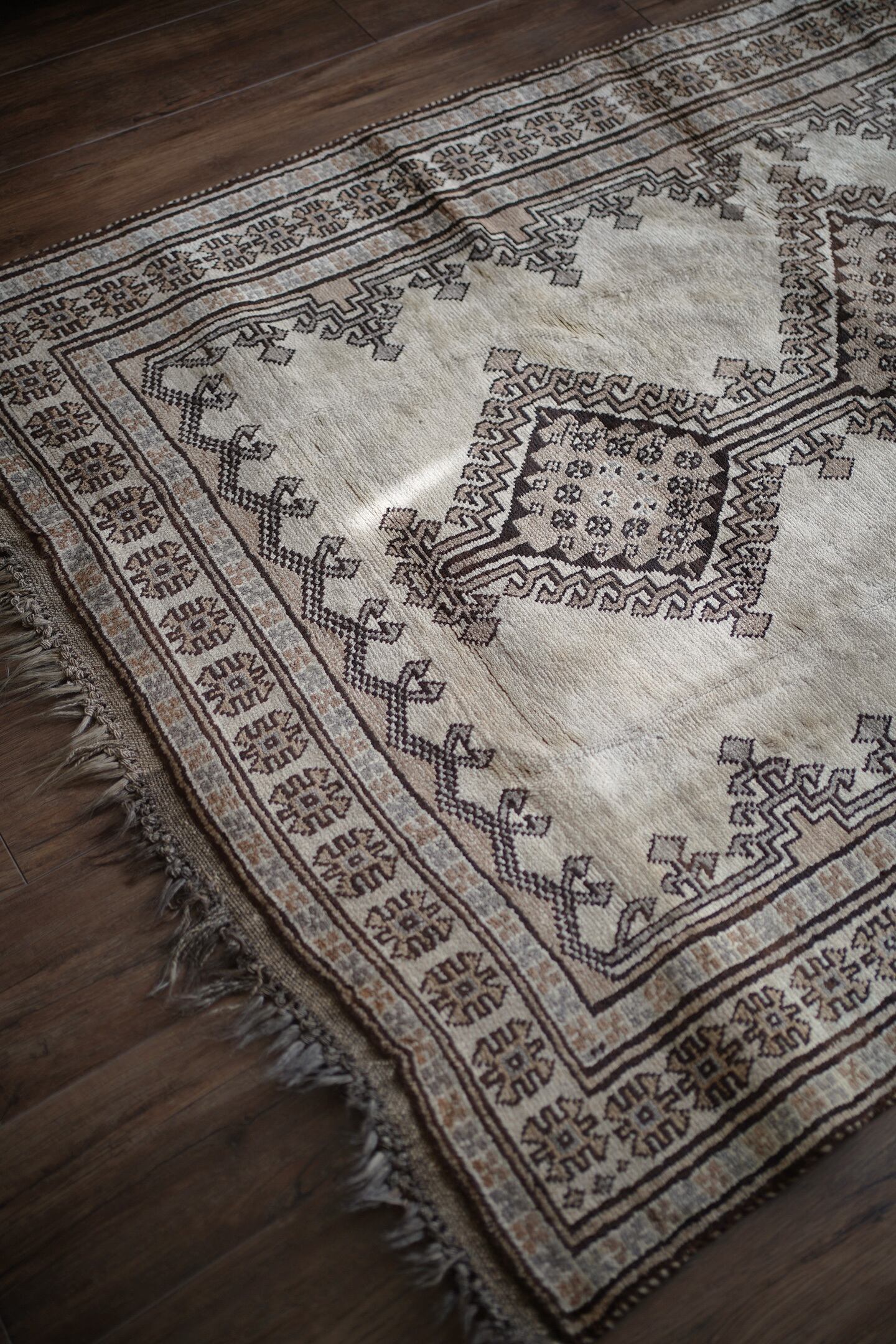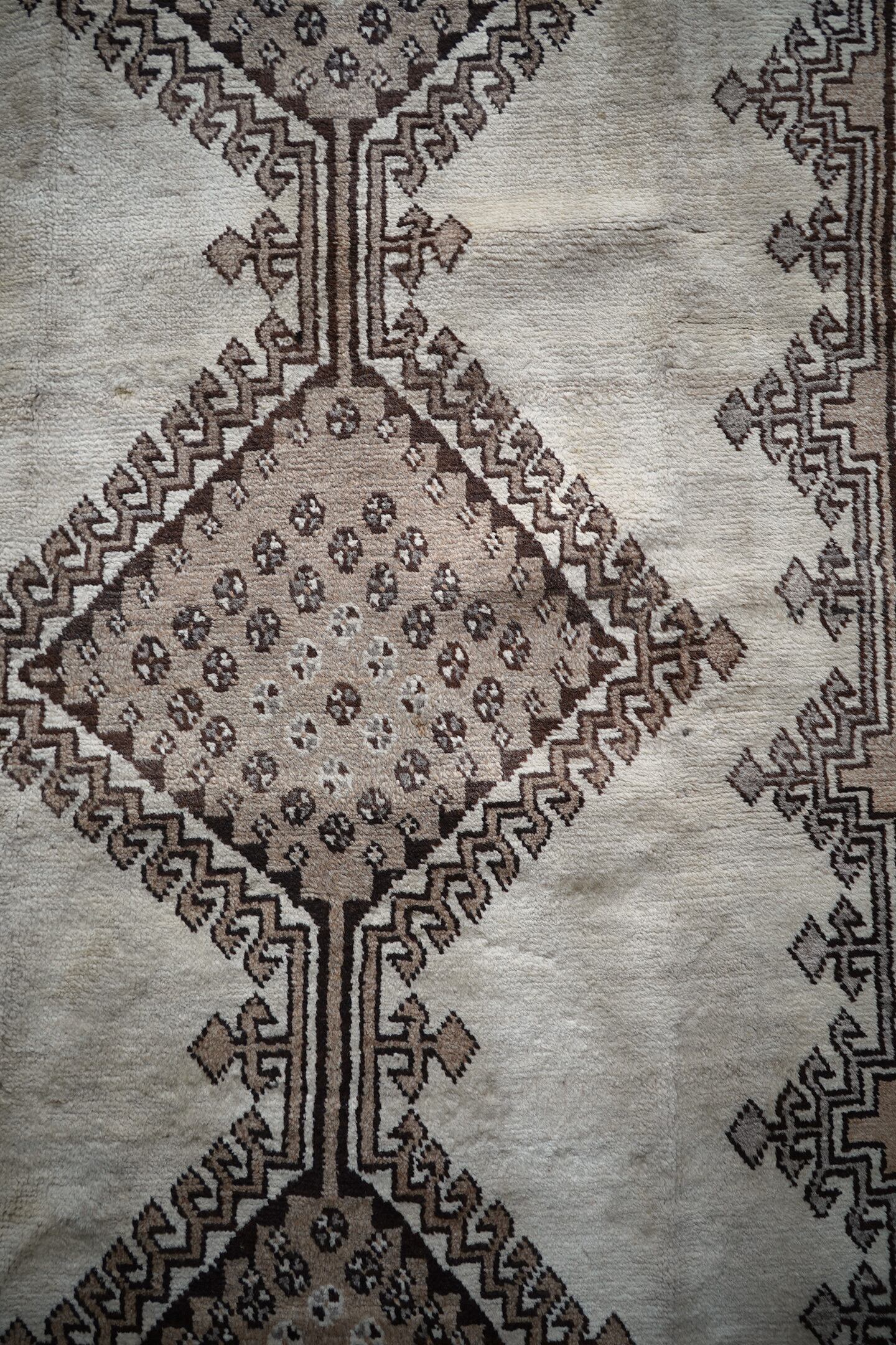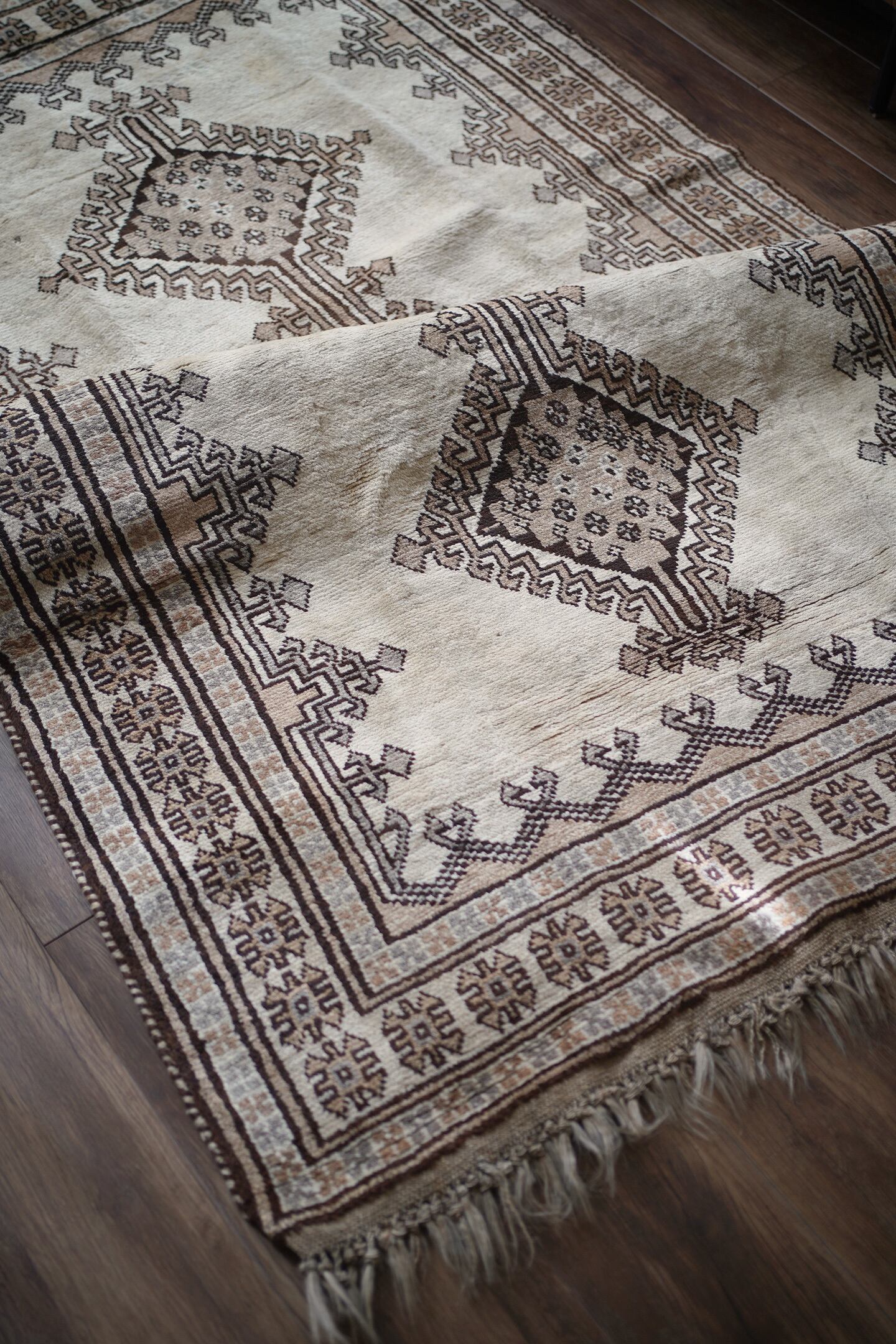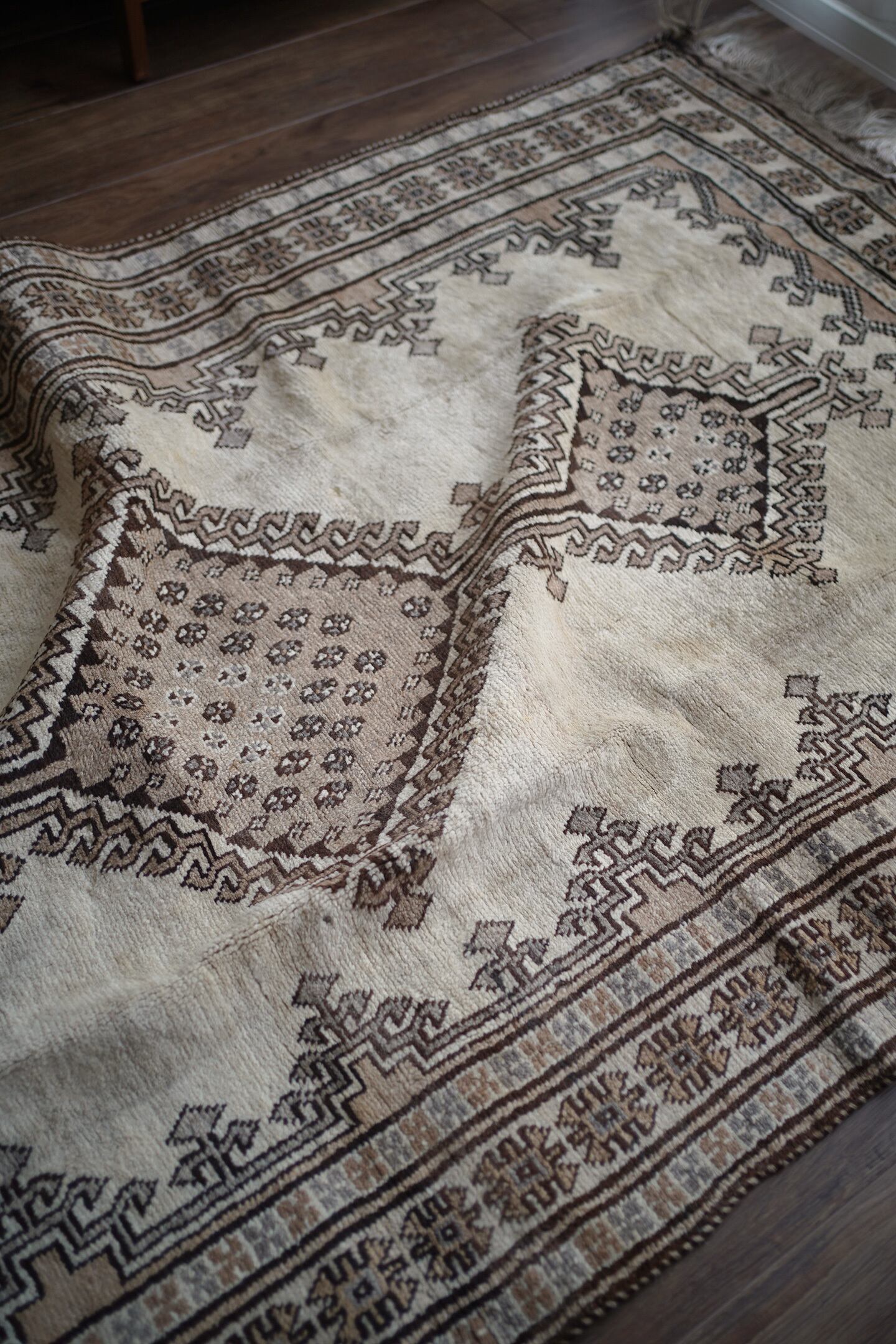 おおよそ50年〜60年前にイラン南西部に居住するカシュガイ族によって織られたラグです。クリーム色の柔らかい色合いが魅力的で、薄いブラウンや焦茶など統一感のある配色が使われたラグでお部屋に取り入れやすい一枚です。三連のフックドメダリオンと周りの余白がバランスが取れており非常にお洒落なデザインで、シラゼ(フレーム部分)のストライプも店主の好きなポイントです。表面はふわっと柔らかく優しい肌触りで、厚みは9mm程度。オールシーズン快適にご利用いただける質感かと思います。全体的に程よいヴィンテージ感もあり、フリンジは少し粗めの作りとなっています。目立ったダメージもなくグッドコンディションです。リビングのソファ前や寝室などにどうぞ♫