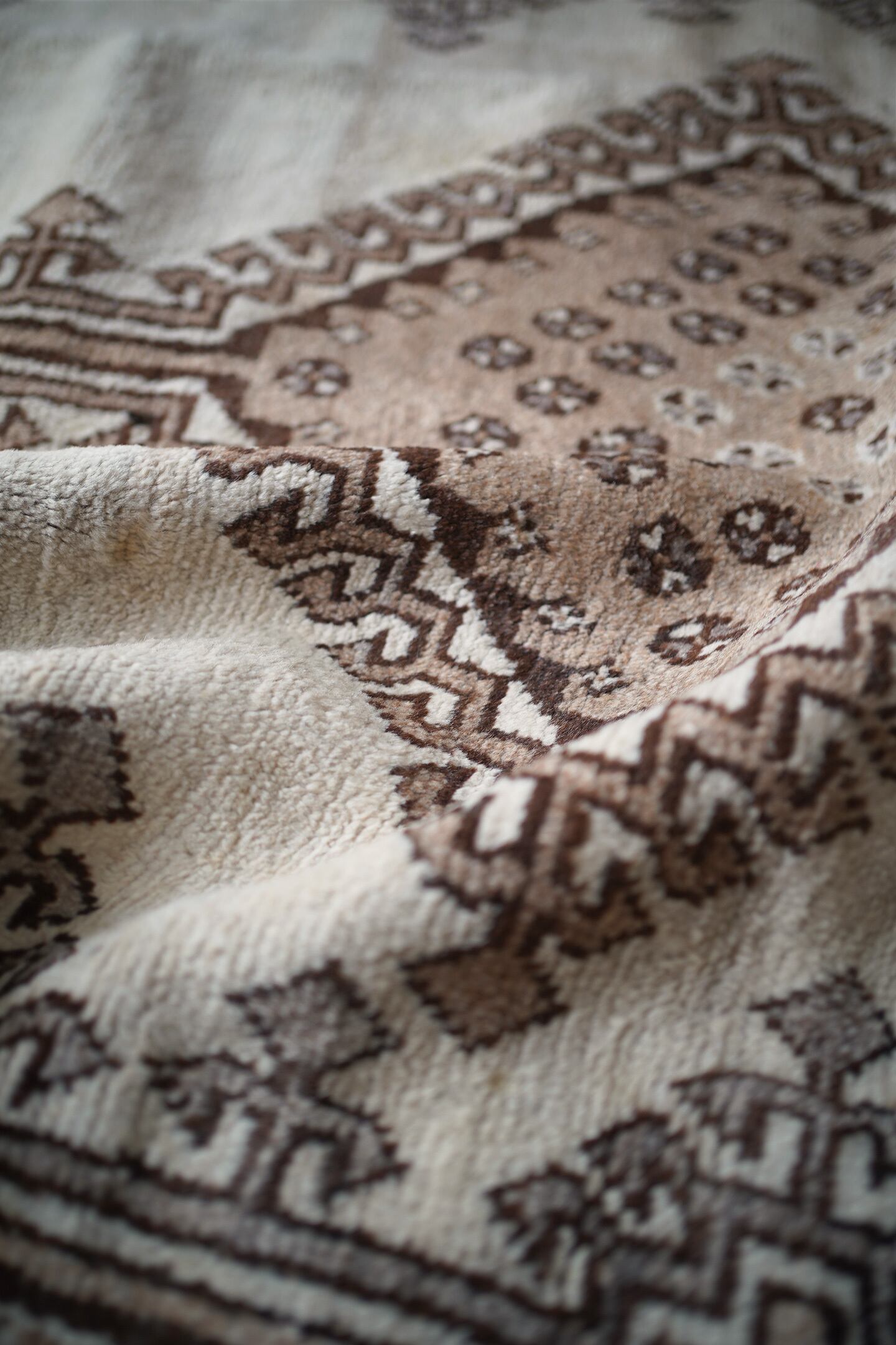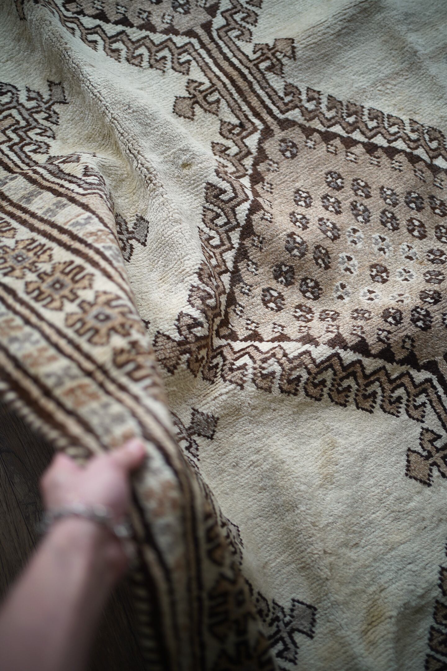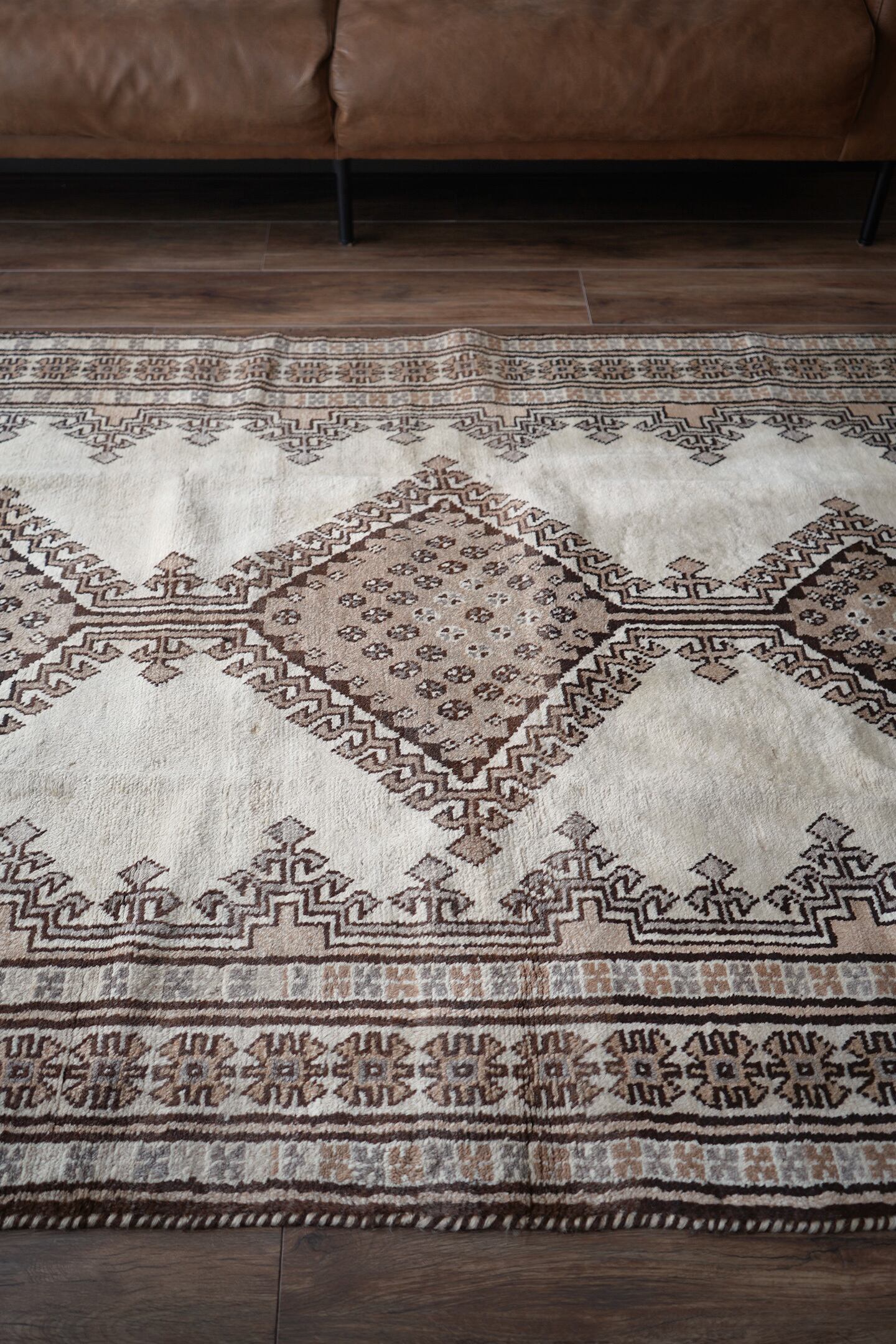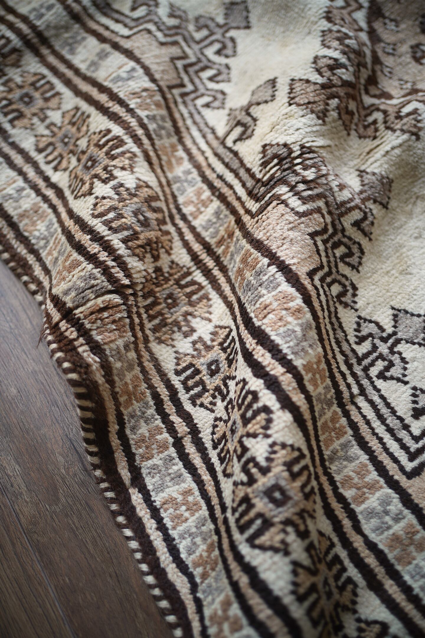 おおよそ50年〜60年前にイラン南西部に居住するカシュガイ族によって織られたラグです。クリーム色の柔らかい色合いが魅力的で、薄いブラウンや焦茶など統一感のある配色が使われたラグでお部屋に取り入れやすい一枚です。三連のフックドメダリオンと周りの余白がバランスが取れており非常にお洒落なデザインで、シラゼ(フレーム部分)のストライプも店主の好きなポイントです。表面はふわっと柔らかく優しい肌触りで、厚みは9mm程度。オールシーズン快適にご利用いただける質感かと思います。全体的に程よいヴィンテージ感もあり、フリンジは少し粗めの作りとなっています。目立ったダメージもなくグッドコンディションです。リビングのソファ前や寝室などにどうぞ♫