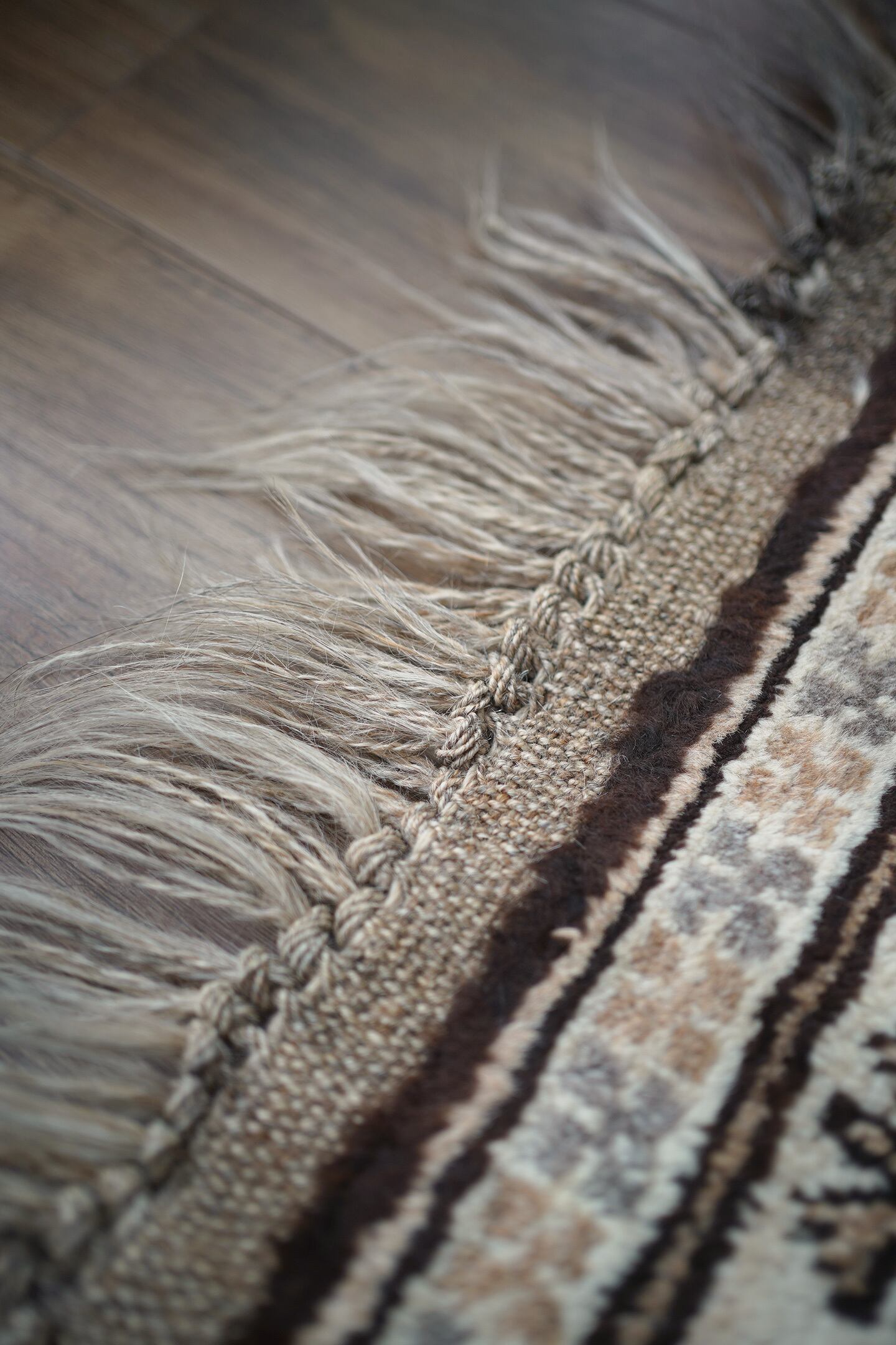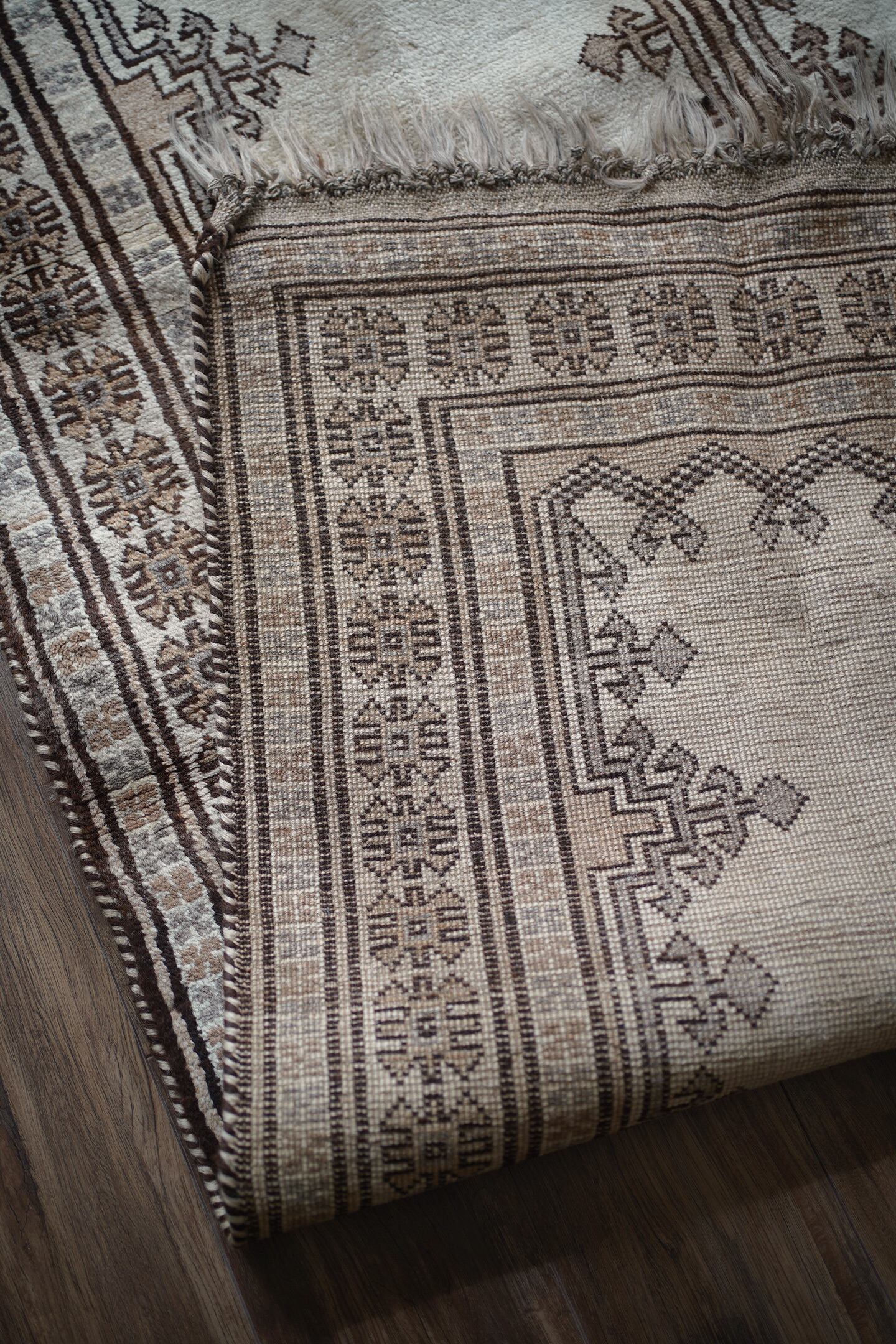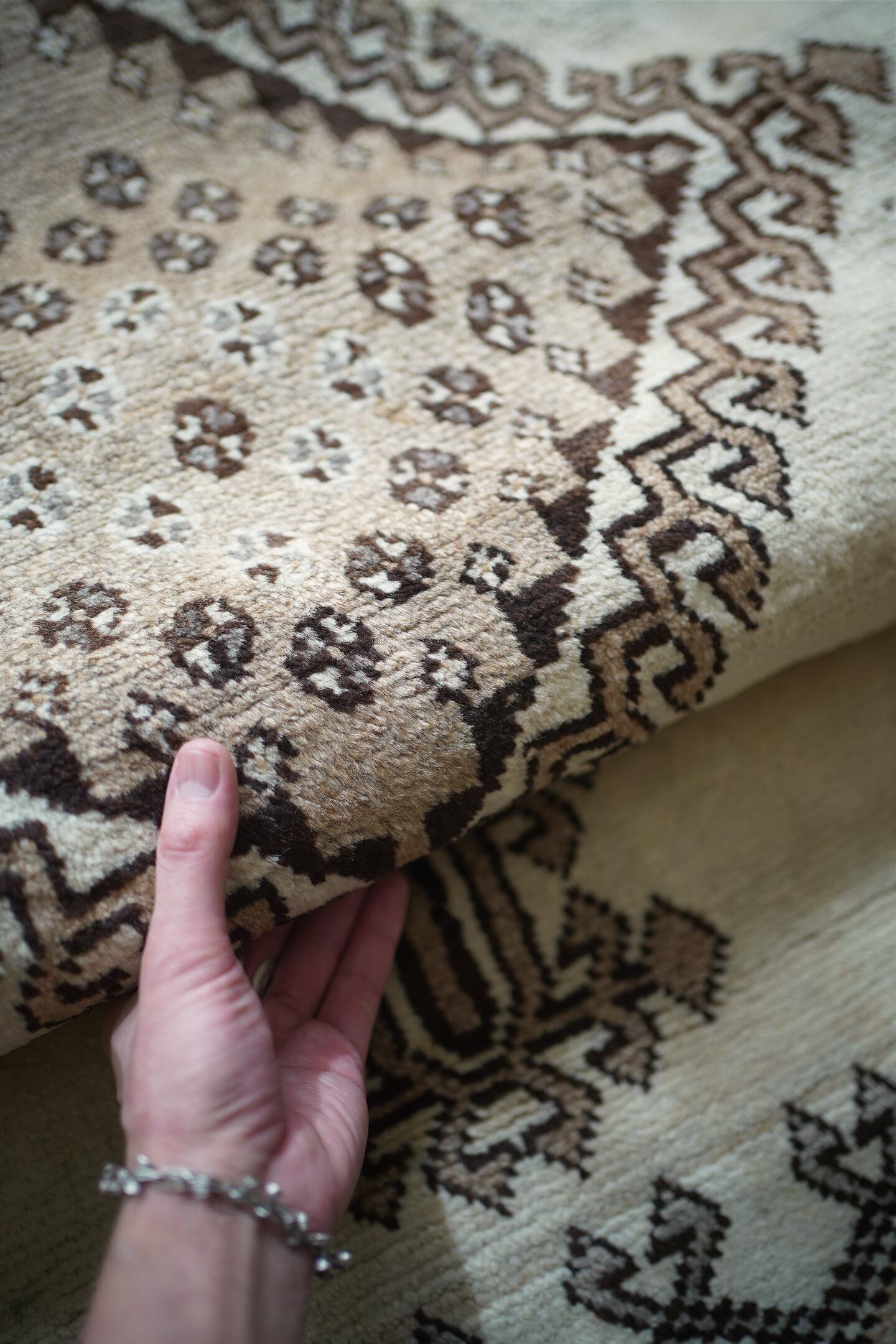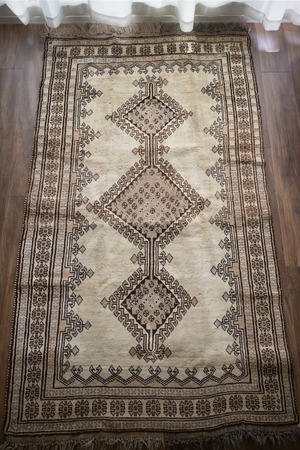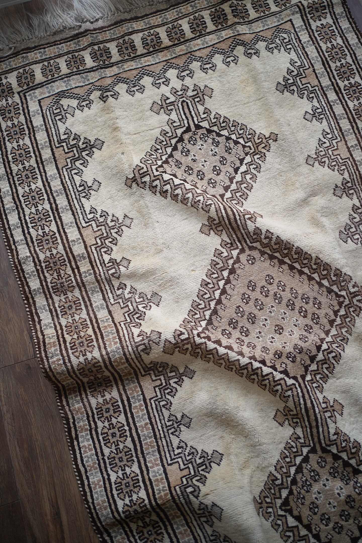 おおよそ50年〜60年前にイラン南西部に居住するカシュガイ族によって織られたラグです。クリーム色の柔らかい色合いが魅力的で、薄いブラウンや焦茶など統一感のある配色が使われたラグでお部屋に取り入れやすい一枚です。三連のフックドメダリオンと周りの余白がバランスが取れており非常にお洒落なデザインで、シラゼ(フレーム部分)のストライプも店主の好きなポイントです。表面はふわっと柔らかく優しい肌触りで、厚みは9mm程度。オールシーズン快適にご利用いただける質感かと思います。全体的に程よいヴィンテージ感もあり、フリンジは少し粗めの作りとなっています。目立ったダメージもなくグッドコンディションです。リビングのソファ前や寝室などにどうぞ♫