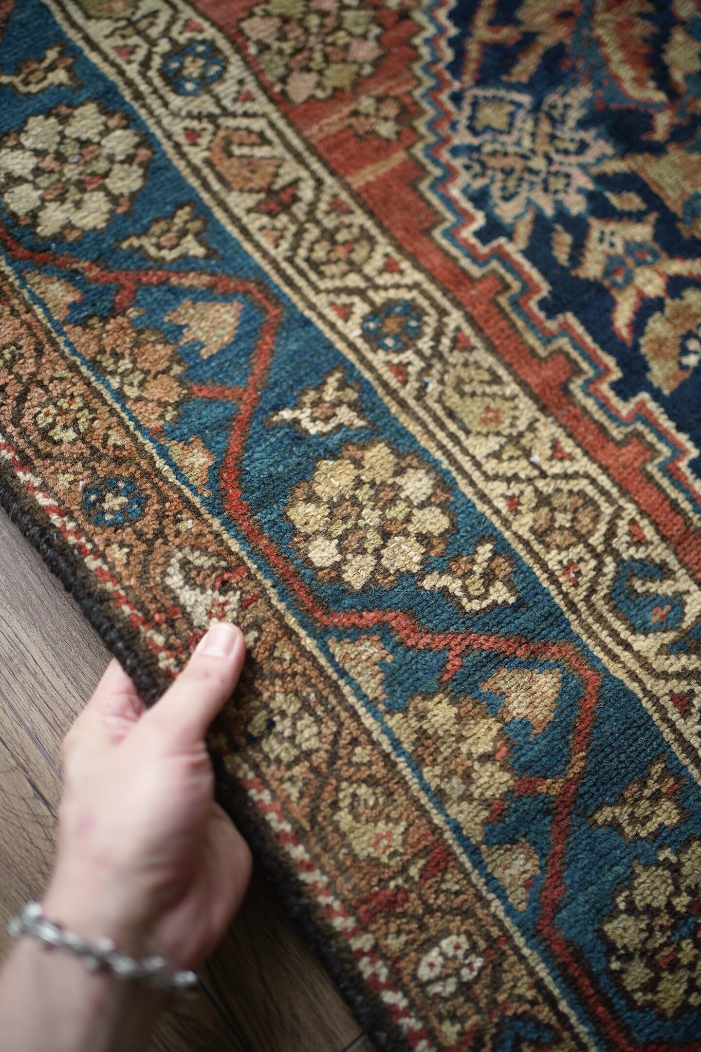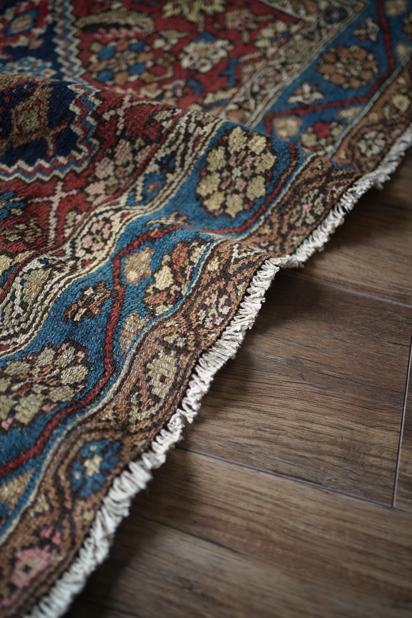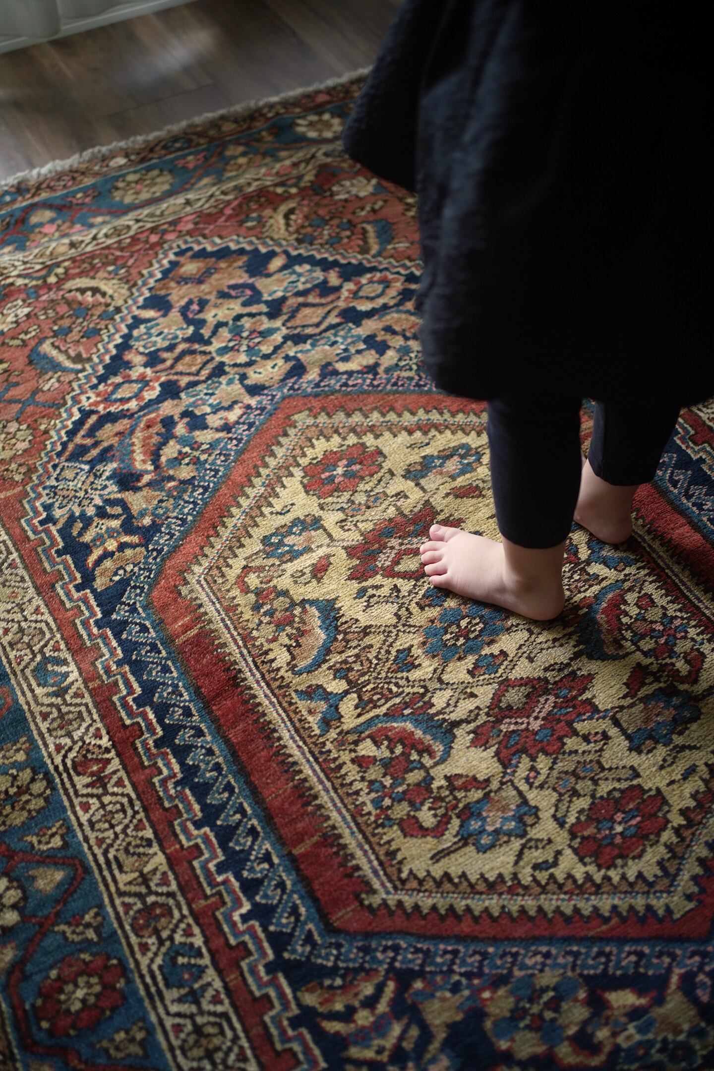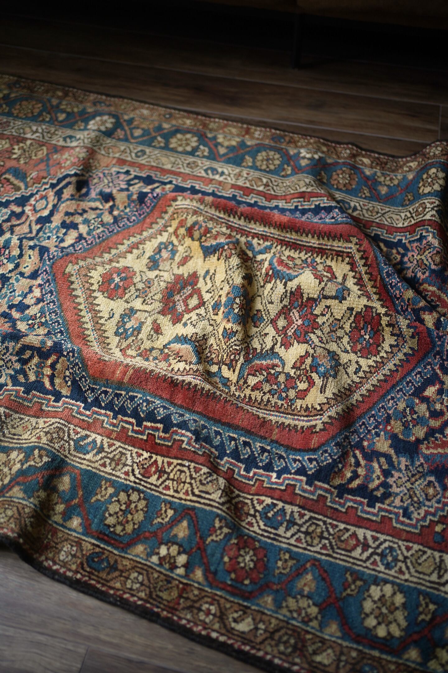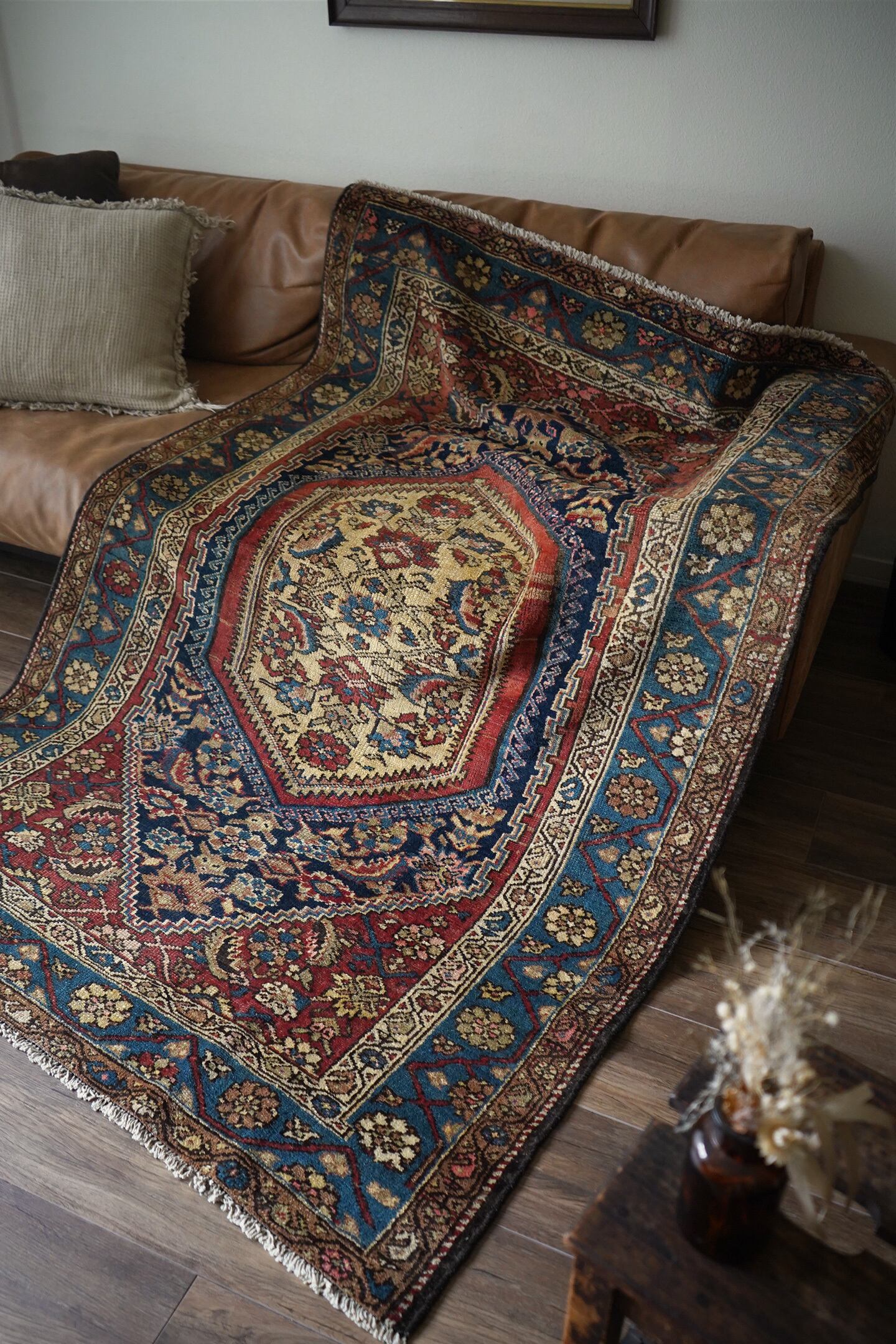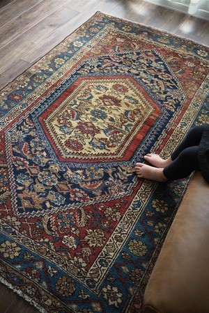 約80年ほど前に織られたイラン西部地域のマラーイェル産のアンティークラグ。美しい花紋様をモチーフにした華やかさとアンティークの渋さ、両方が楽しめる素晴らしい風合いの一枚。ブルーグリーン、ベージュ、暗めのオレンジブラウンの見事な色構成も魅力的です。パイルは短めですが、全体的に綺麗に残っており、ふわサラッとした肌触りをしています。厚みは5mm〜6mm程度。古いラグですが目立ったダメージなどもなく大変良好なコンディションです。リビングのソファ前、ダイニングテーブル下、ベッドサイド、書斎など、一枚このラグがあるだけでお部屋がグッとお洒落になること必至です。