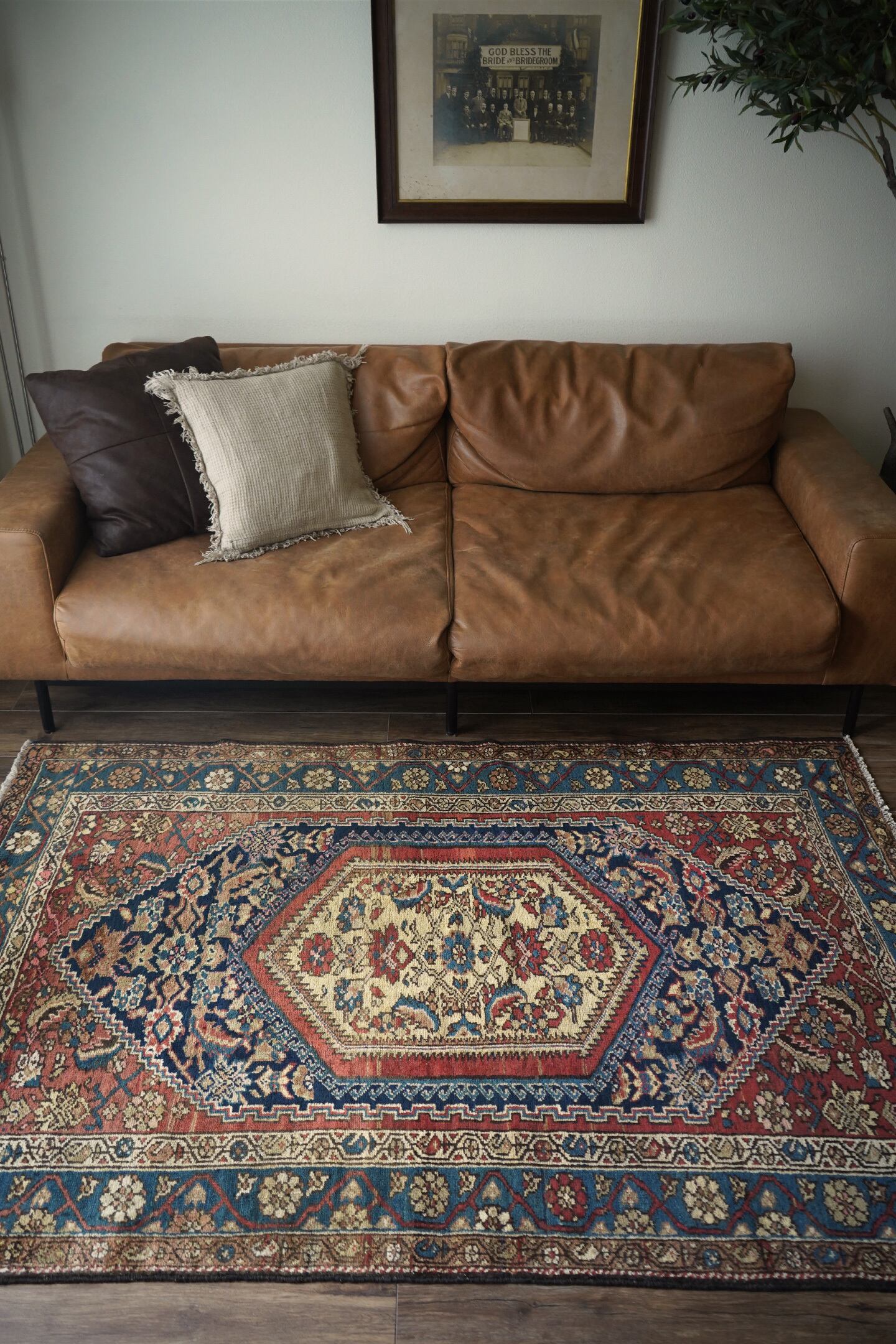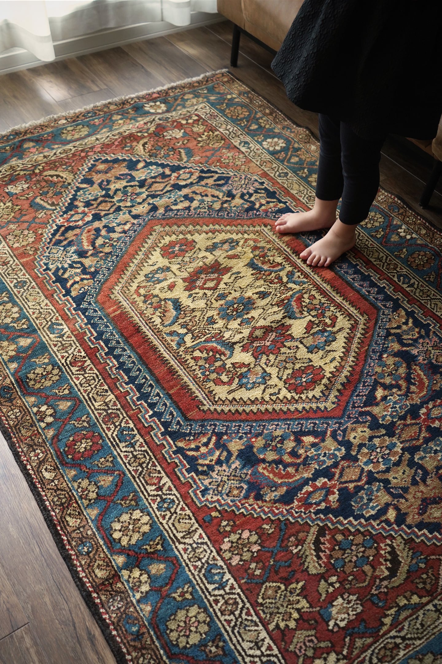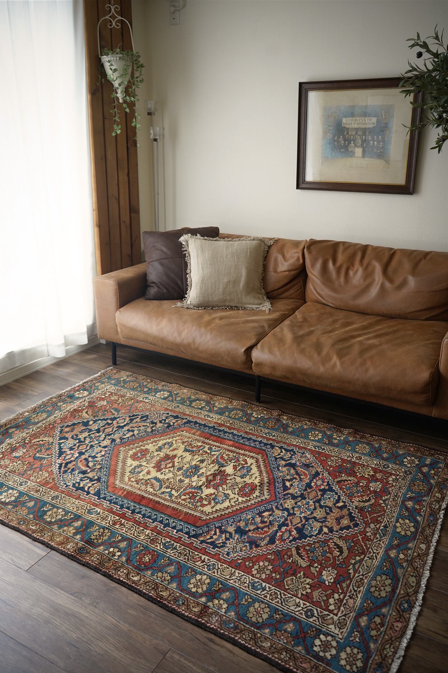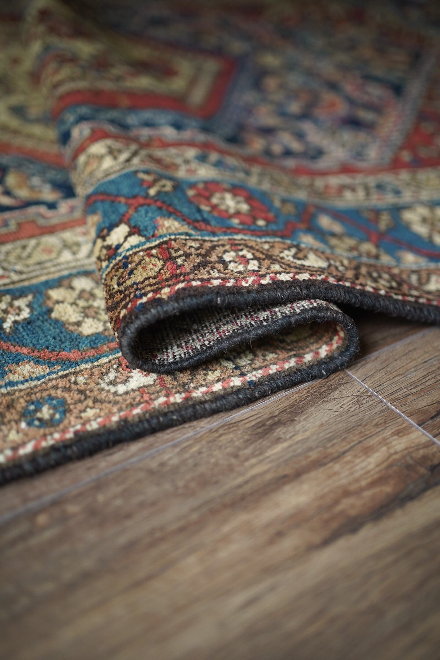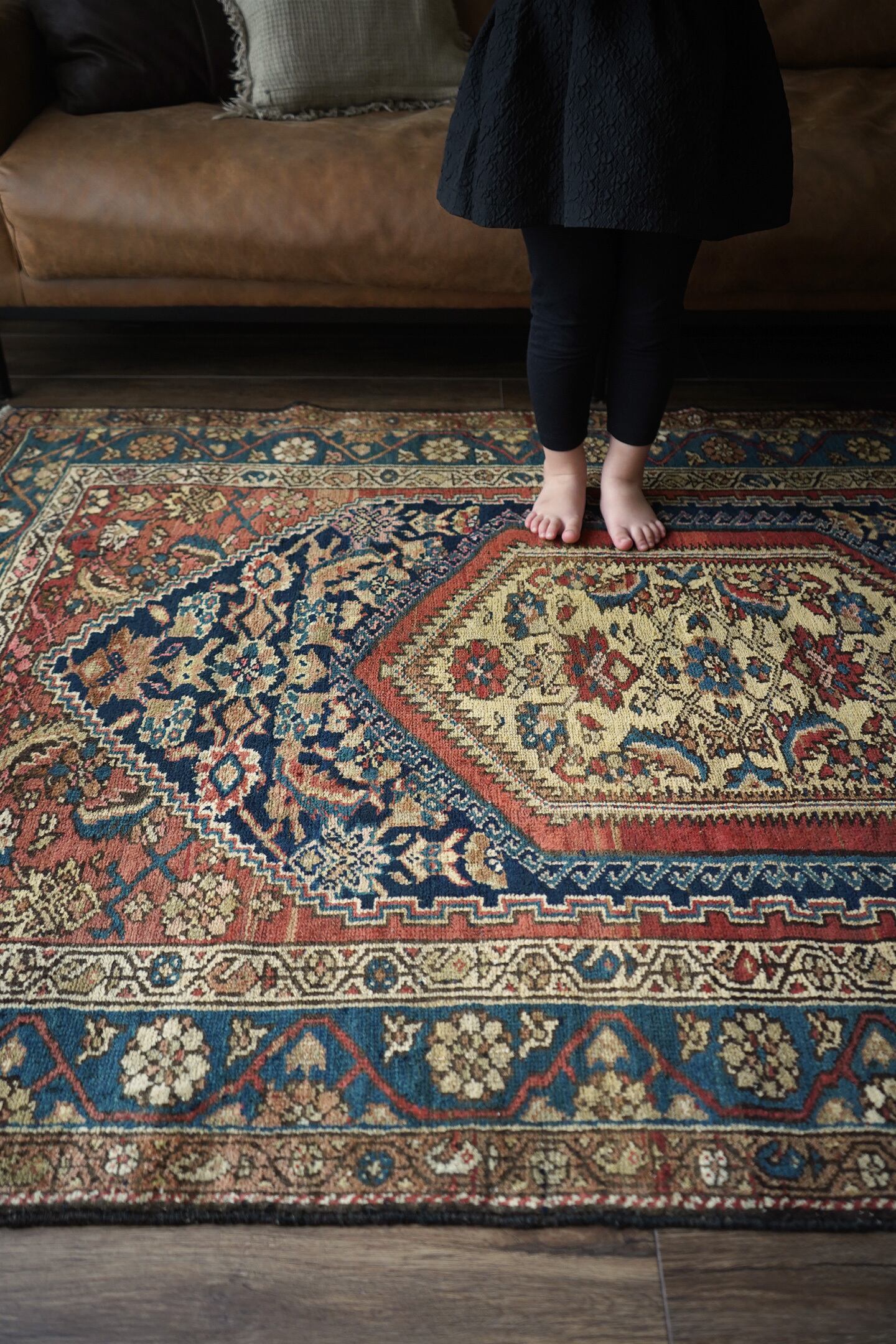 約80年ほど前に織られたイラン西部地域のマラーイェル産のアンティークラグ。美しい花紋様をモチーフにした華やかさとアンティークの渋さ、両方が楽しめる素晴らしい風合いの一枚。ブルーグリーン、ベージュ、暗めのオレンジブラウンの見事な色構成も魅力的です。パイルは短めですが、全体的に綺麗に残っており、ふわサラッとした肌触りをしています。厚みは5mm〜6mm程度。古いラグですが目立ったダメージなどもなく大変良好なコンディションです。リビングのソファ前、ダイニングテーブル下、ベッドサイド、書斎など、一枚このラグがあるだけでお部屋がグッとお洒落になること必至です。