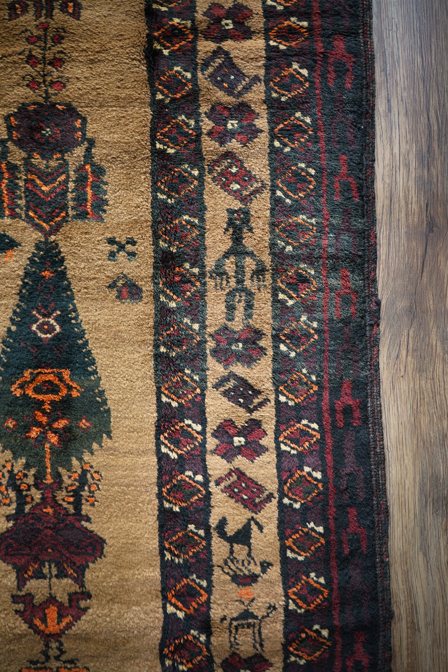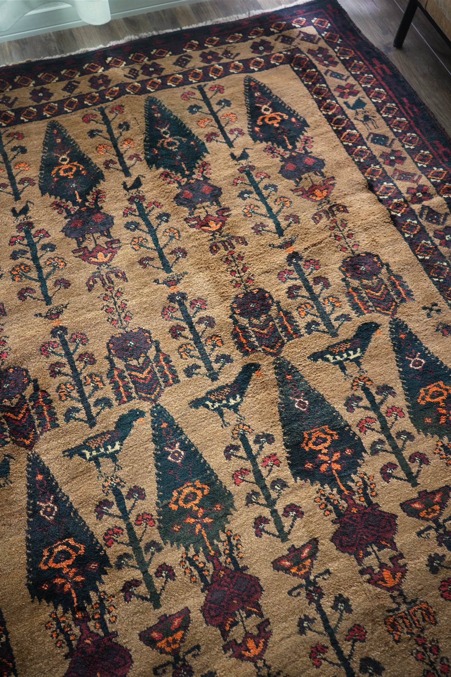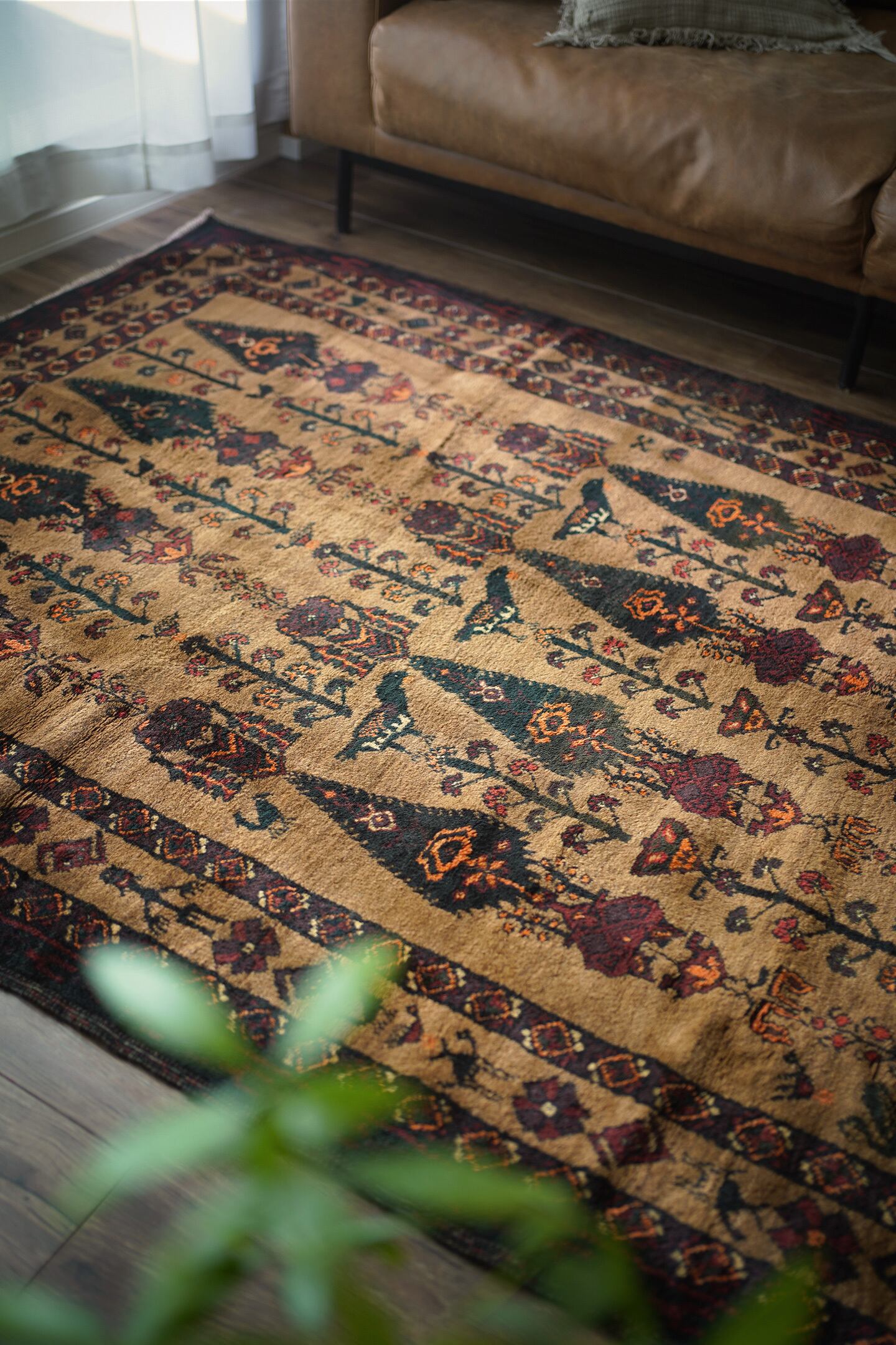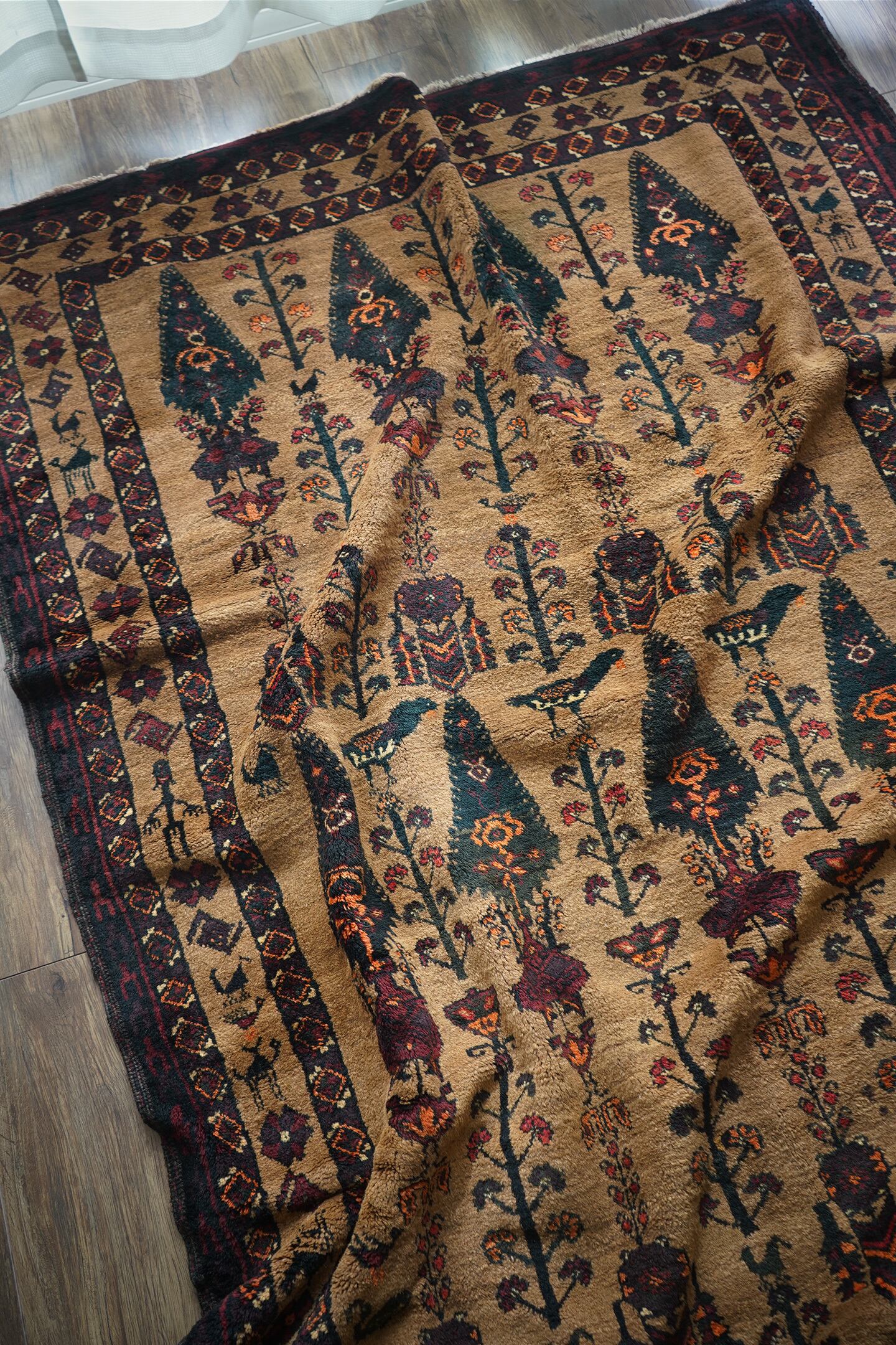 おおよそ70年前にイラン南東部のシスターン地方で織られたヴィンテージのバルーチラグです。大きく織り込まれた可愛らしい三羽の鳥をはじめ、糸杉の樹、小鳥や白鳥、ボーダーには人の紋様やラクダの紋様等、眺めているだけで心がワクワクするような高揚感を味わえる素晴らしいデザインの一枚。配色はキャメル、ダークグリーン、えんじ色、オレンジ、ベージュ、赤茶色など。これが人の手によって時間をかけて何十年も前に織られたと思うと織り手や職人さんの素晴らしい技術に感銘を受け、なんだか非常に感慨深いですよね。パイルは上質なソフトウールでふわふわしており、いつまでも絨毯の上にいたくなる心地良さ。厚みは6mmほど。フリンジ部分はキリムエンドの作りとなっています。ダメージや補修された跡も見受けられず、大変良好なコンディション。素晴らしいデザイン・質感・コンディション、どれをとっても言うことなし。滅多に出会えないラグかと思いますので、ときめいた方はどうぞお見逃しなく♫