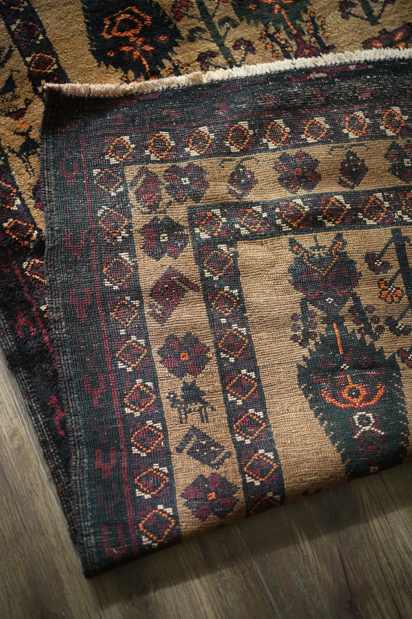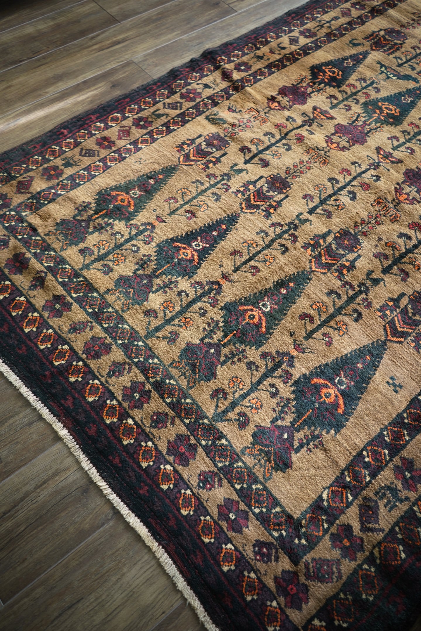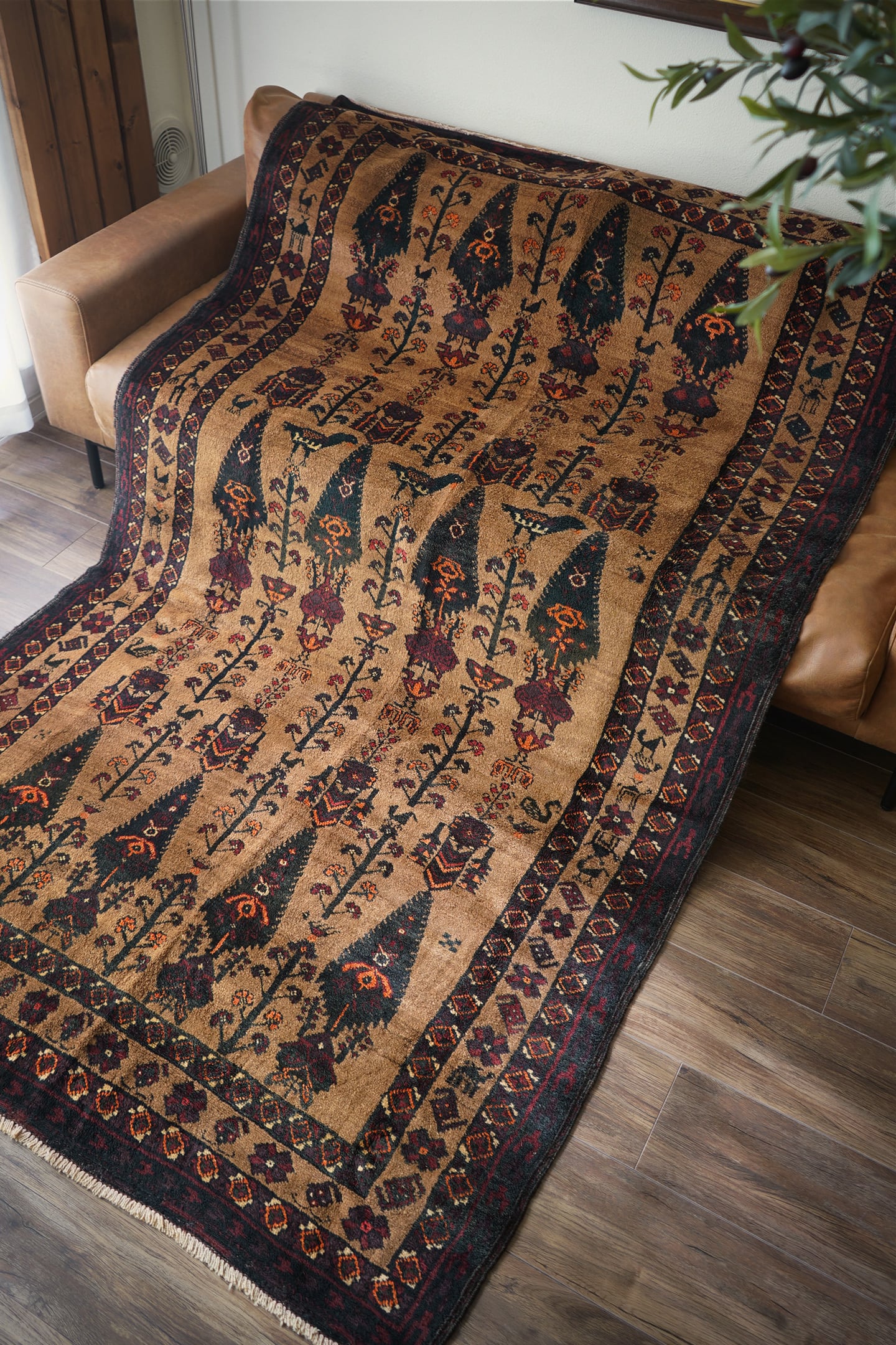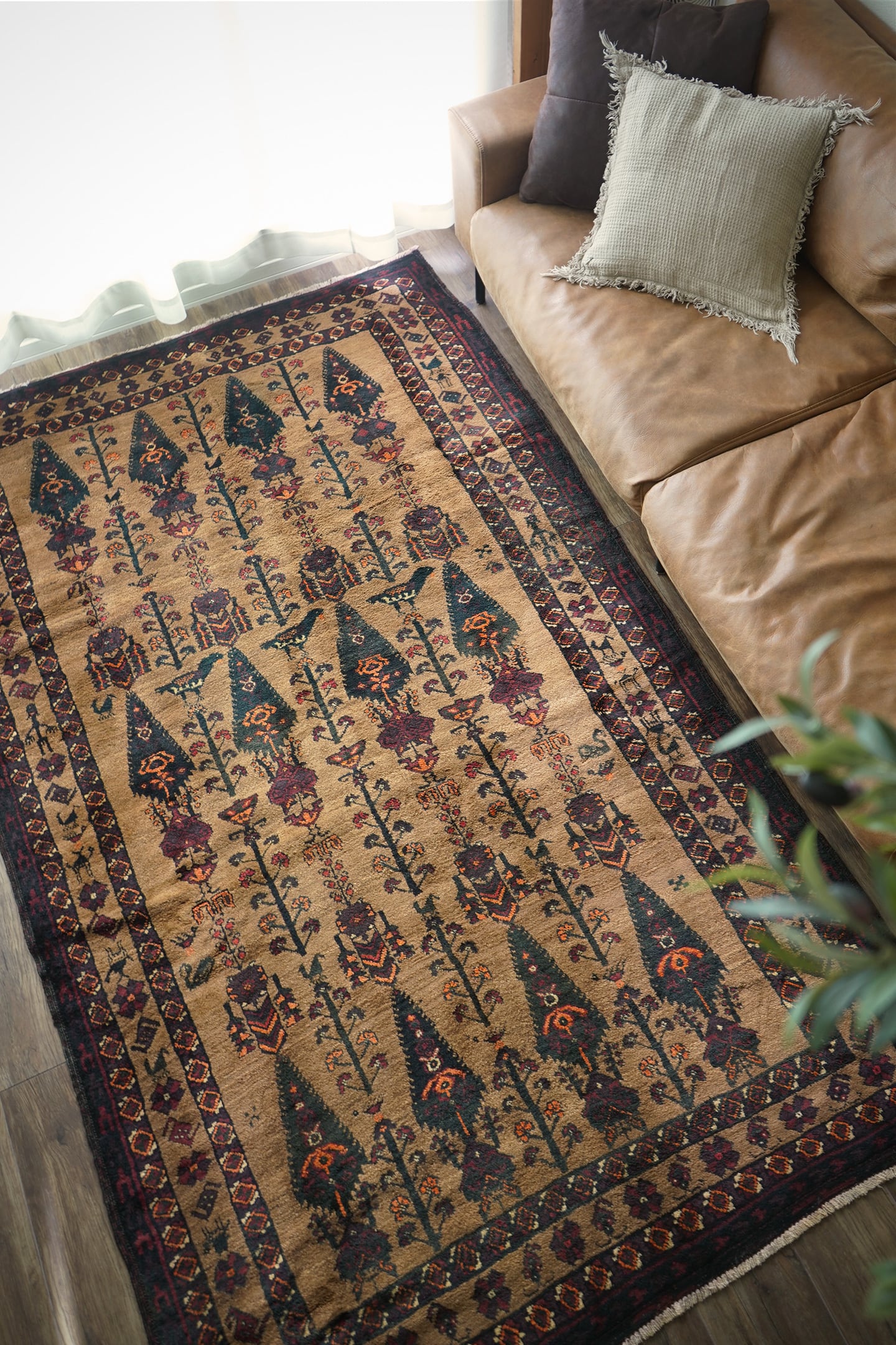 おおよそ70年前にイラン南東部のシスターン地方で織られたヴィンテージのバルーチラグです。大きく織り込まれた可愛らしい三羽の鳥をはじめ、糸杉の樹、小鳥や白鳥、ボーダーには人の紋様やラクダの紋様等、眺めているだけで心がワクワクするような高揚感を味わえる素晴らしいデザインの一枚。配色はキャメル、ダークグリーン、えんじ色、オレンジ、ベージュ、赤茶色など。これが人の手によって時間をかけて何十年も前に織られたと思うと織り手や職人さんの素晴らしい技術に感銘を受け、なんだか非常に感慨深いですよね。パイルは上質なソフトウールでふわふわしており、いつまでも絨毯の上にいたくなる心地良さ。厚みは6mmほど。フリンジ部分はキリムエンドの作りとなっています。ダメージや補修された跡も見受けられず、大変良好なコンディション。素晴らしいデザイン・質感・コンディション、どれをとっても言うことなし。滅多に出会えないラグかと思いますので、ときめいた方はどうぞお見逃しなく♫