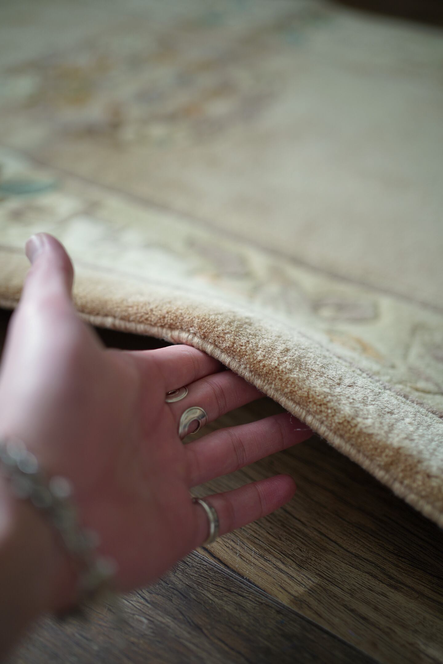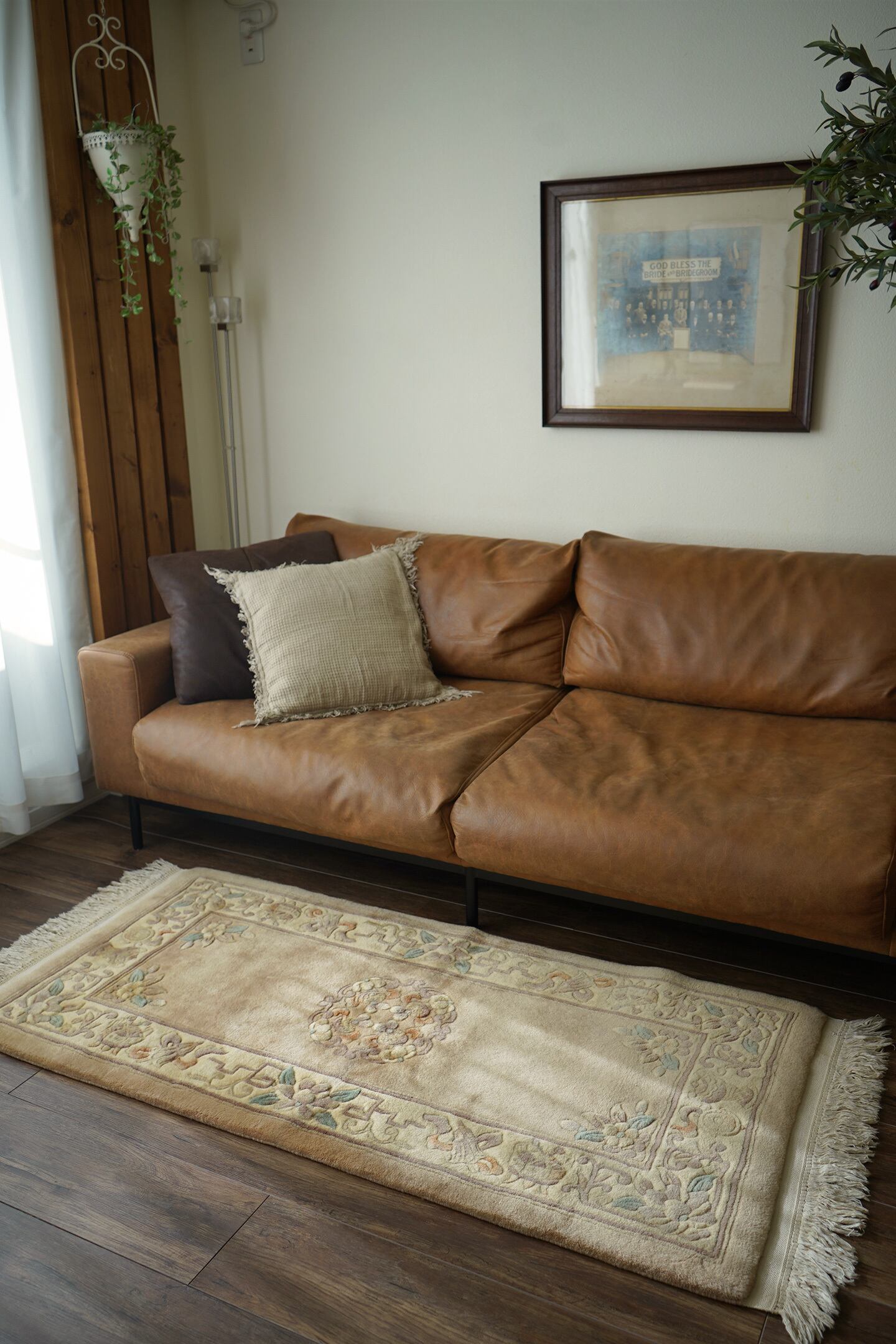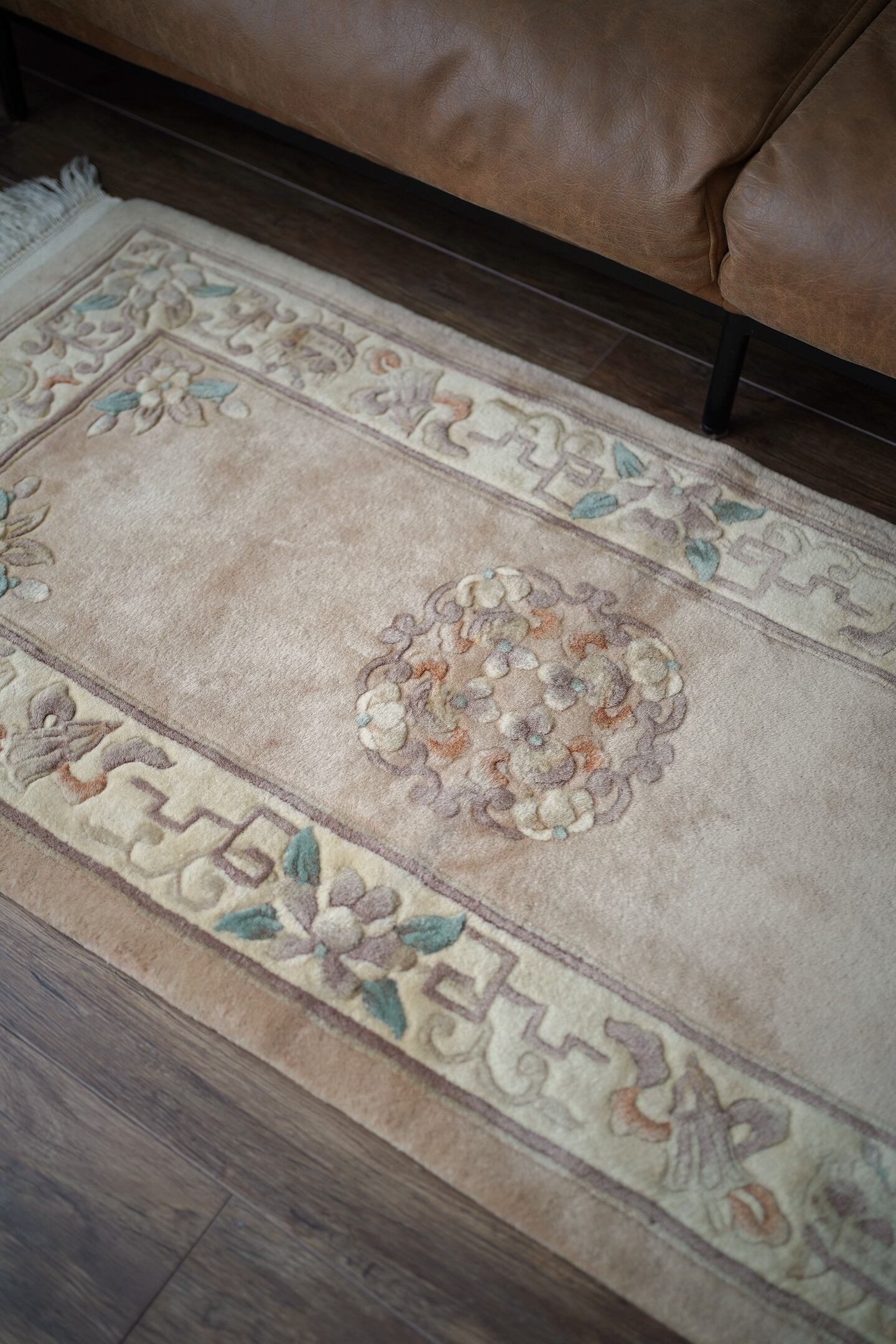 天使のような極上の肌触りがたまらない経年約40年の中国産ラグ(中国段通)です。きめ細かいソフトウールでふんわりしなやかでソフトタッチ、いつまでもラグの上に乗っていたくなるほどの気持ち良さ。今までたくさんのラグを見てきましたがトップクラスの肌触りです。お花をモチーフにした可憐なデザインで模様部分は少し凹凸を感じる立体的な作りとなっています。ベージュとアイボリーの柔らかい雰囲気の色味がとっても魅力的で、差し色で淡いエメラルドグリーンと薄いオレンジが使われています。厚みは1.5cm程度。キリムエンド部分に一部補修された形跡がありますが、ほとんど気にならない程度かと思います(お写真最後をご確認ください)。それ以外は素晴らしいコンディションです。ベッドサイドや廊下、ウォークインクローゼットなどにオススメのサイズ感♪