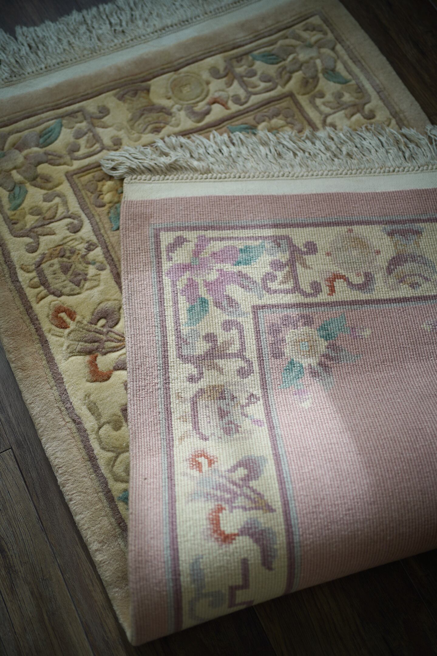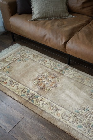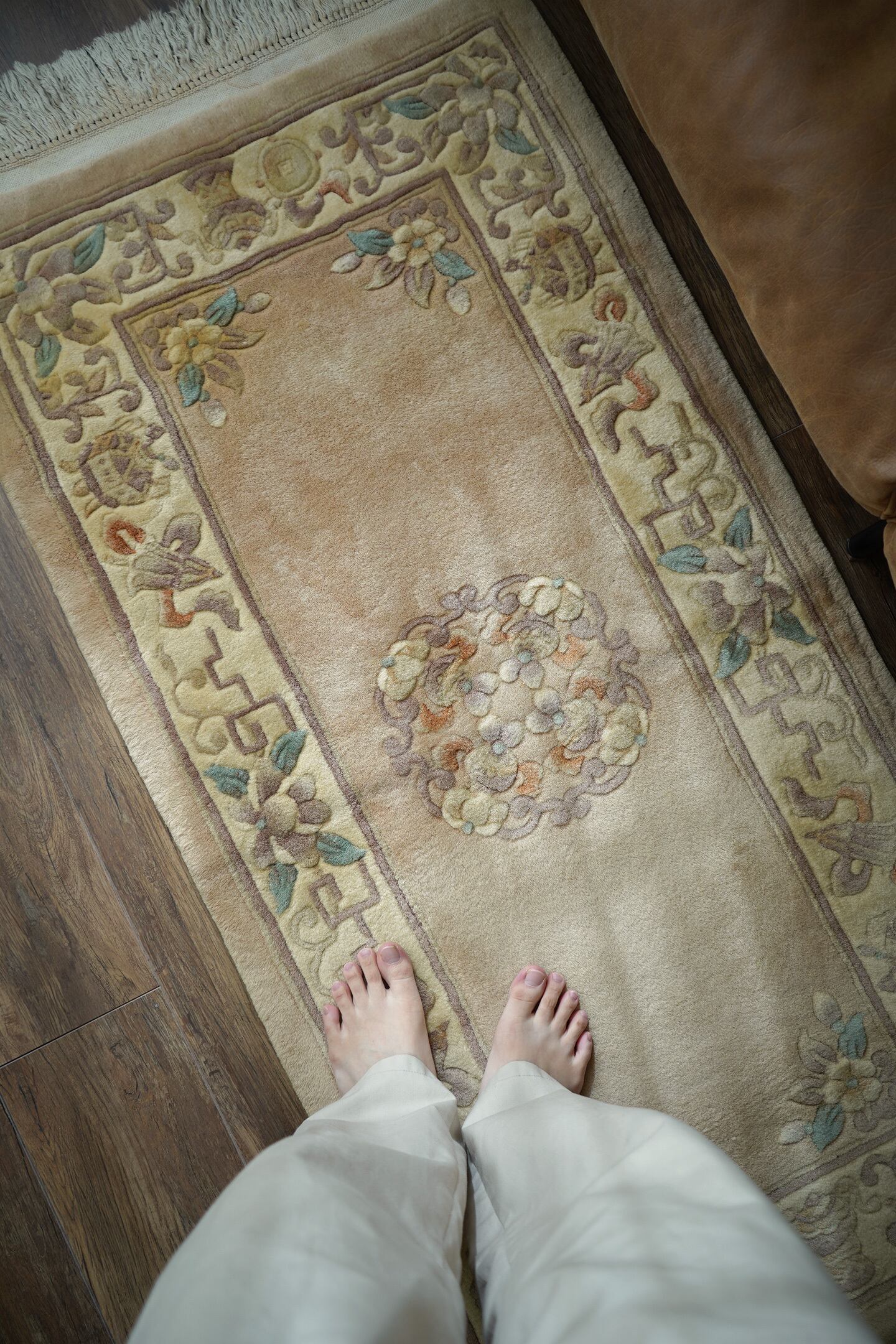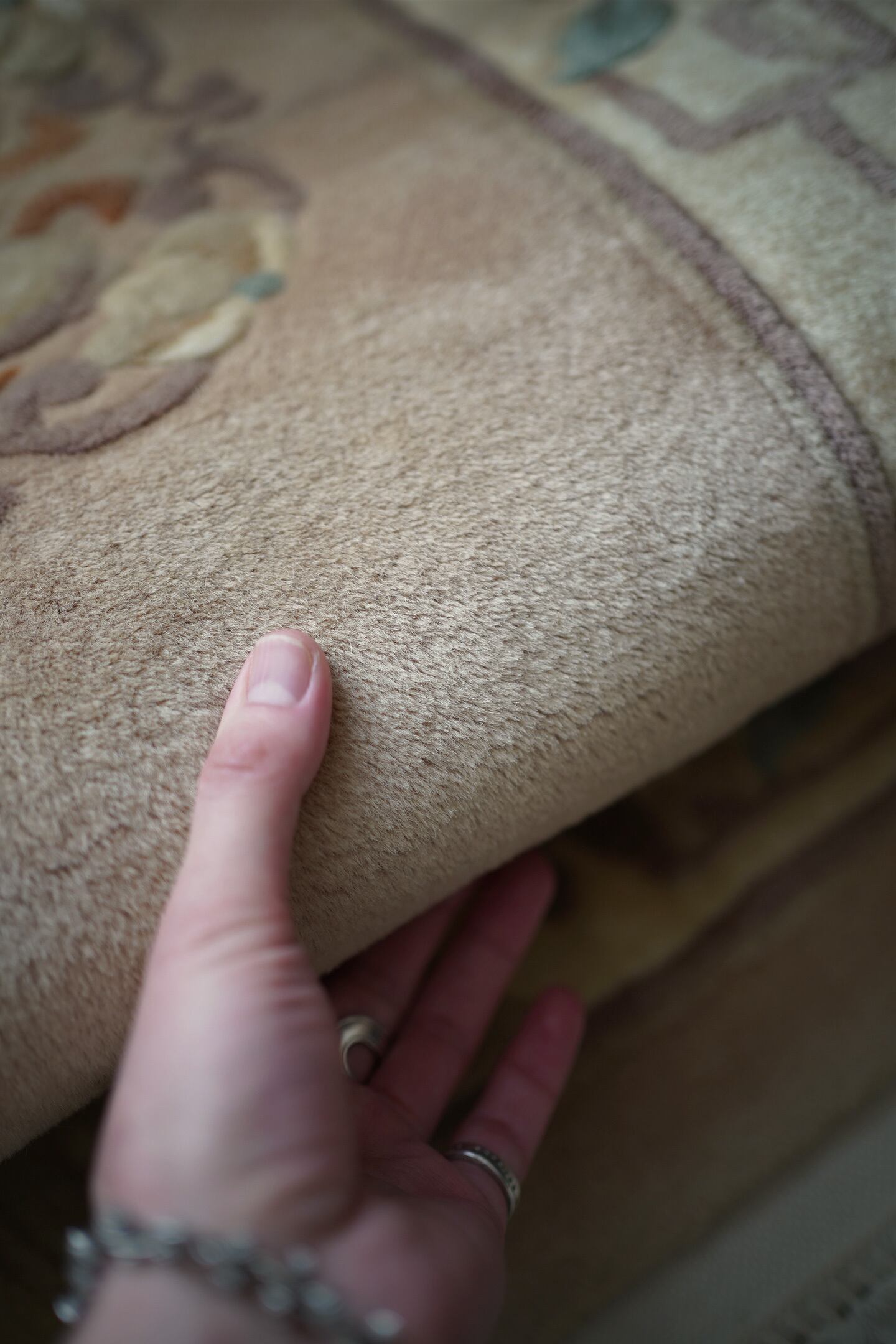 天使のような極上の肌触りがたまらない経年約40年の中国産ラグ(中国段通)です。きめ細かいソフトウールでふんわりしなやかでソフトタッチ、いつまでもラグの上に乗っていたくなるほどの気持ち良さ。今までたくさんのラグを見てきましたがトップクラスの肌触りです。お花をモチーフにした可憐なデザインで模様部分は少し凹凸を感じる立体的な作りとなっています。ベージュとアイボリーの柔らかい雰囲気の色味がとっても魅力的で、差し色で淡いエメラルドグリーンと薄いオレンジが使われています。厚みは1.5cm程度。キリムエンド部分に一部補修された形跡がありますが、ほとんど気にならない程度かと思います(お写真最後をご確認ください)。それ以外は素晴らしいコンディションです。ベッドサイドや廊下、ウォークインクローゼットなどにオススメのサイズ感♪