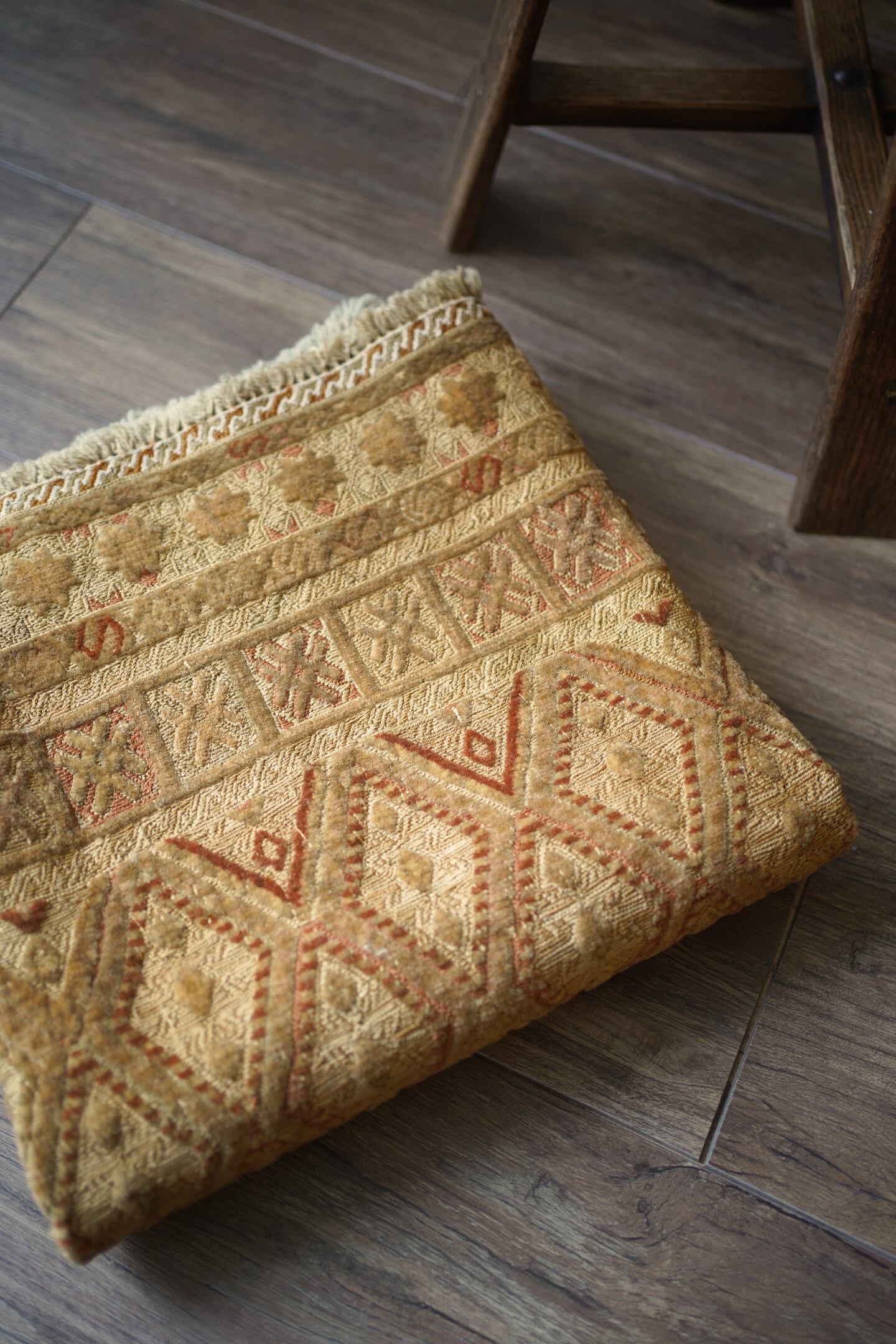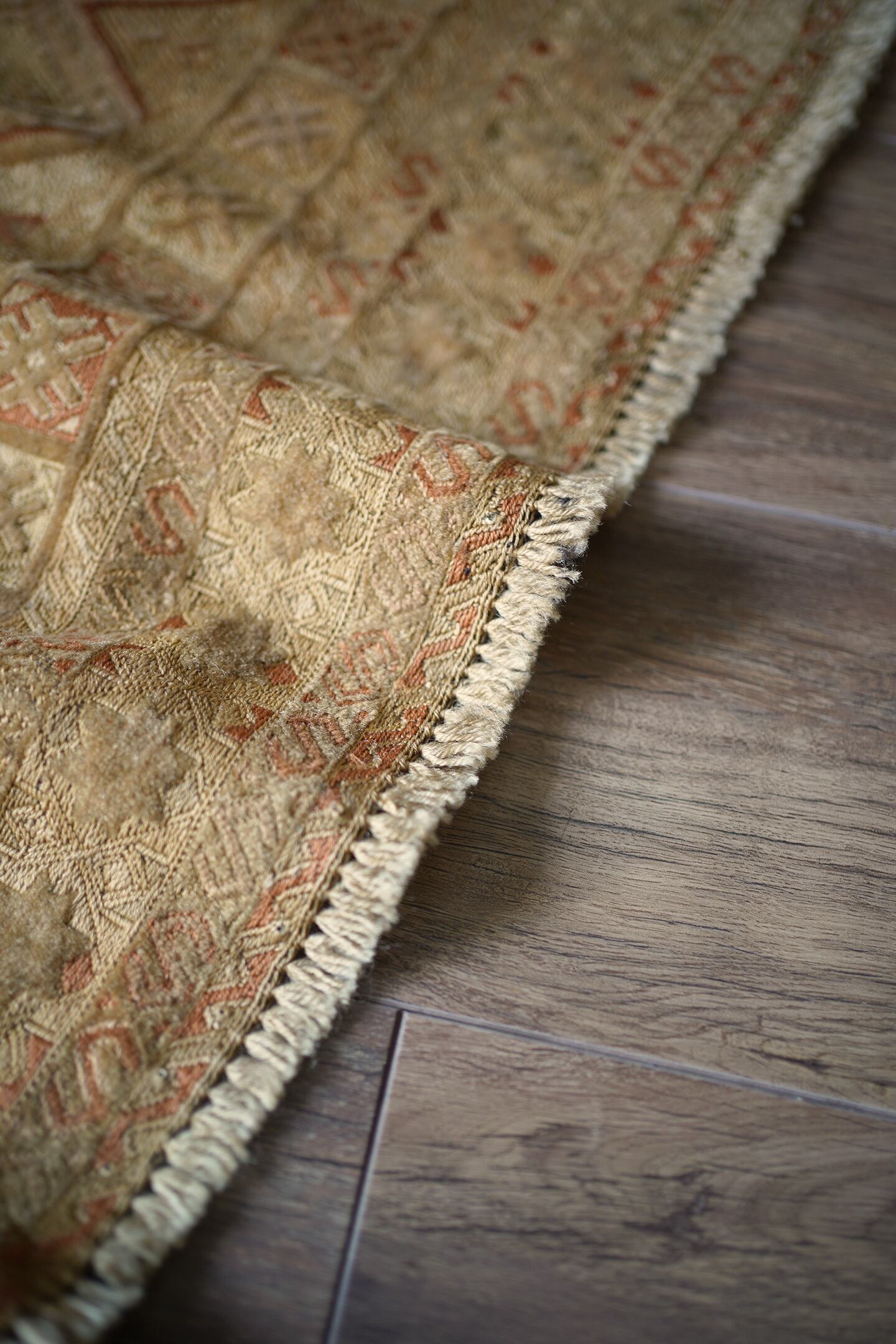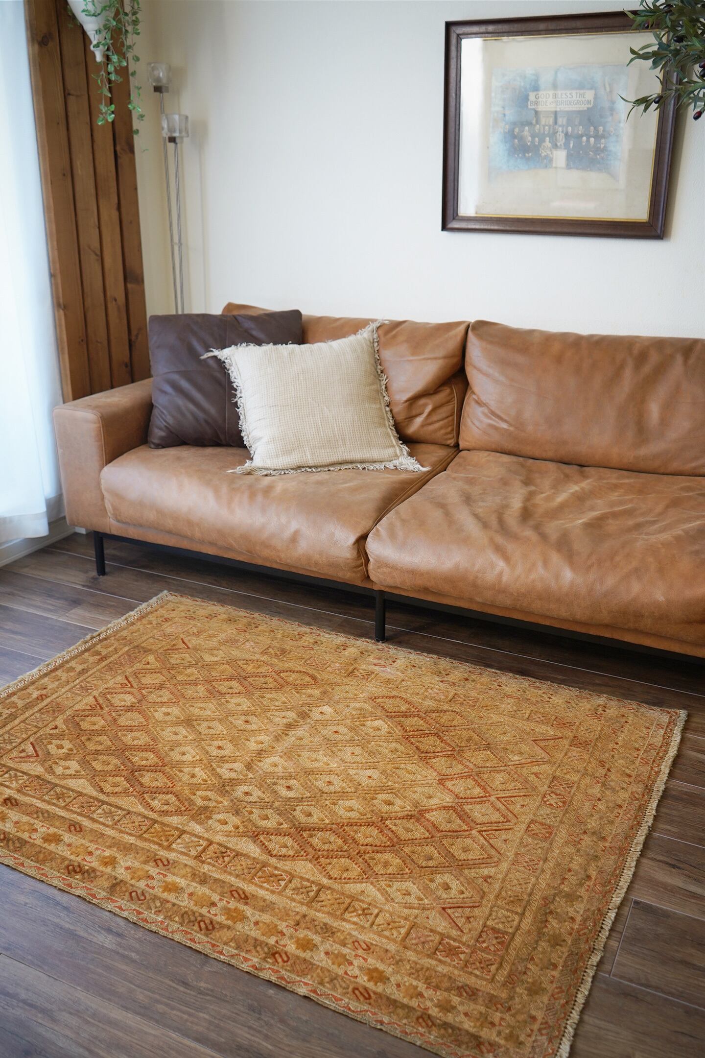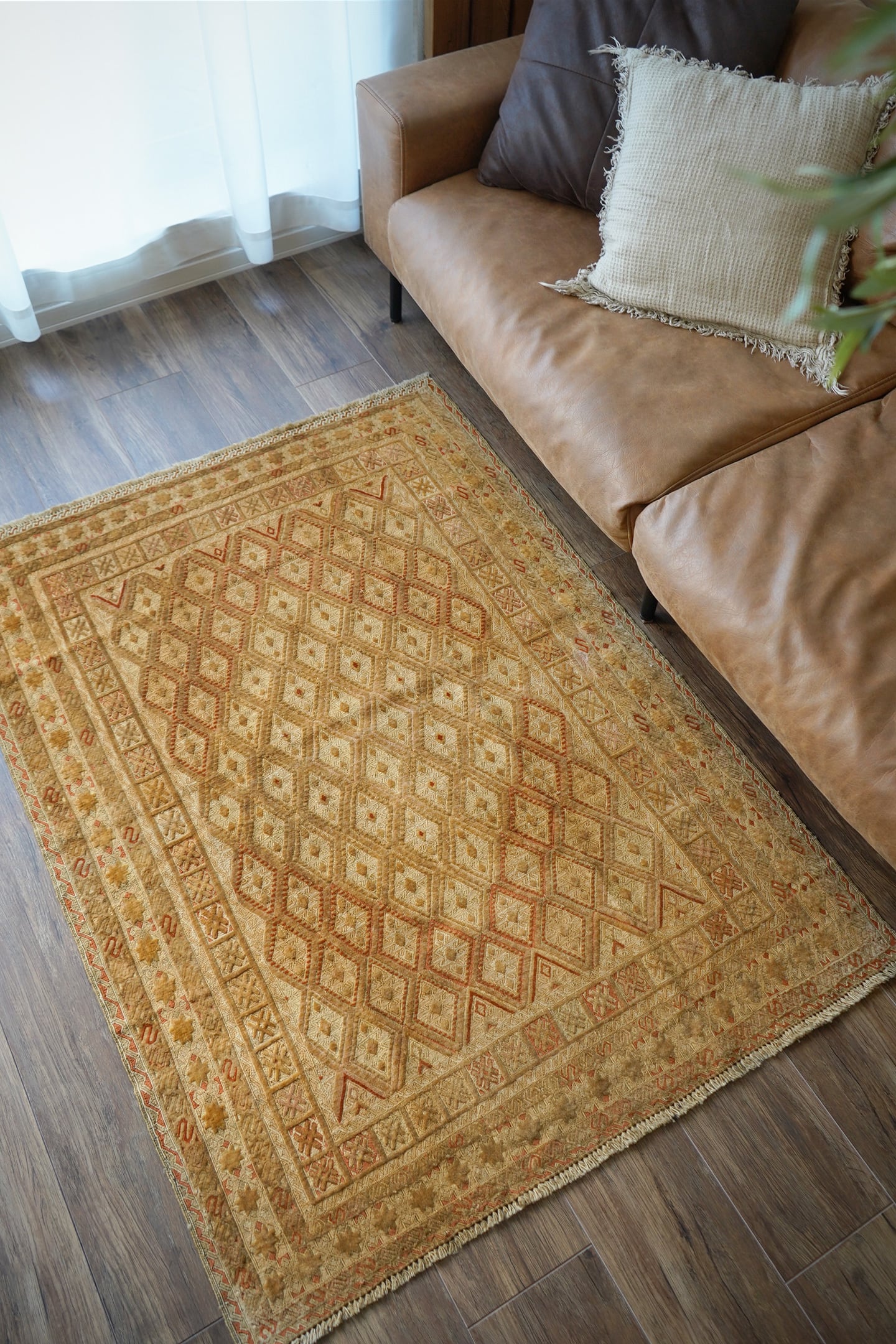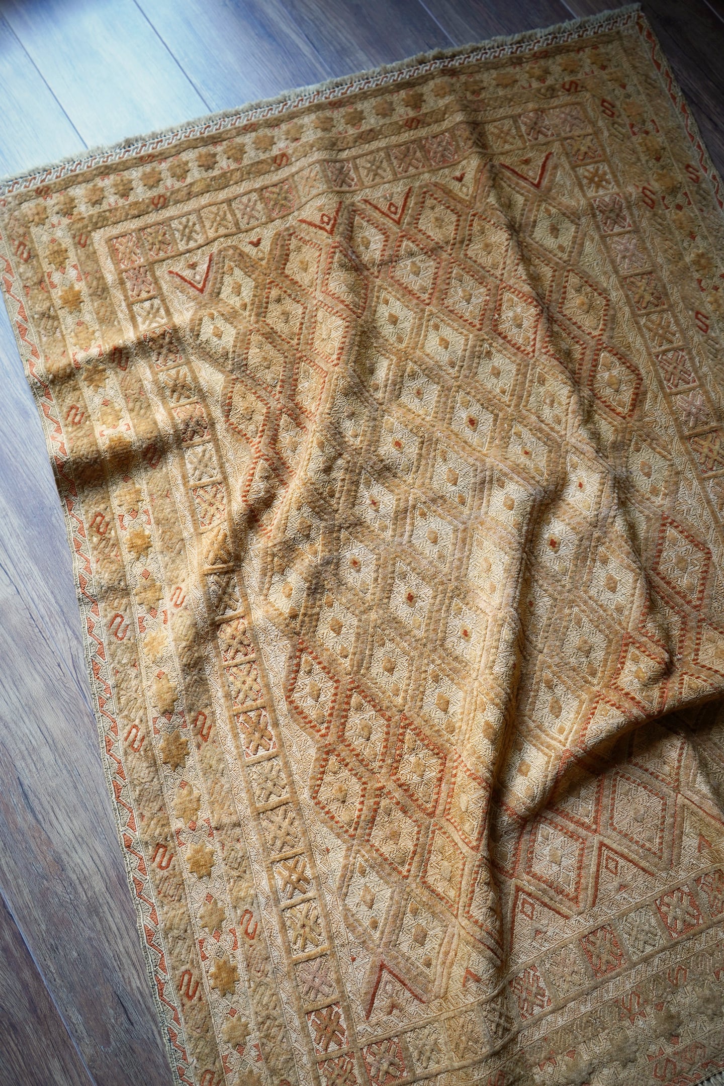 平織り(キリム)とパイル織り(絨毯)をミックスした技法で織られた人気のマシュワニラグ。ポコポコとした凹凸が特徴的で、美しい配列で織り込まれた菱形文様が特徴的なデザインです。くすんだベージュと暗めのオレンジの統一感のある配色で、使い込まれた渋いヴィンテージの風合いを感じられる一枚。ペラっとクタッとした薄手の質感で、表面はサラっとしつつも柔らかいパイルを感じる肌触り。厚みは3mm〜5mm程度です。目立ったダメージや補修された跡もなくグッドコンディション。アンティーク家具との相性も良さそうですね♪