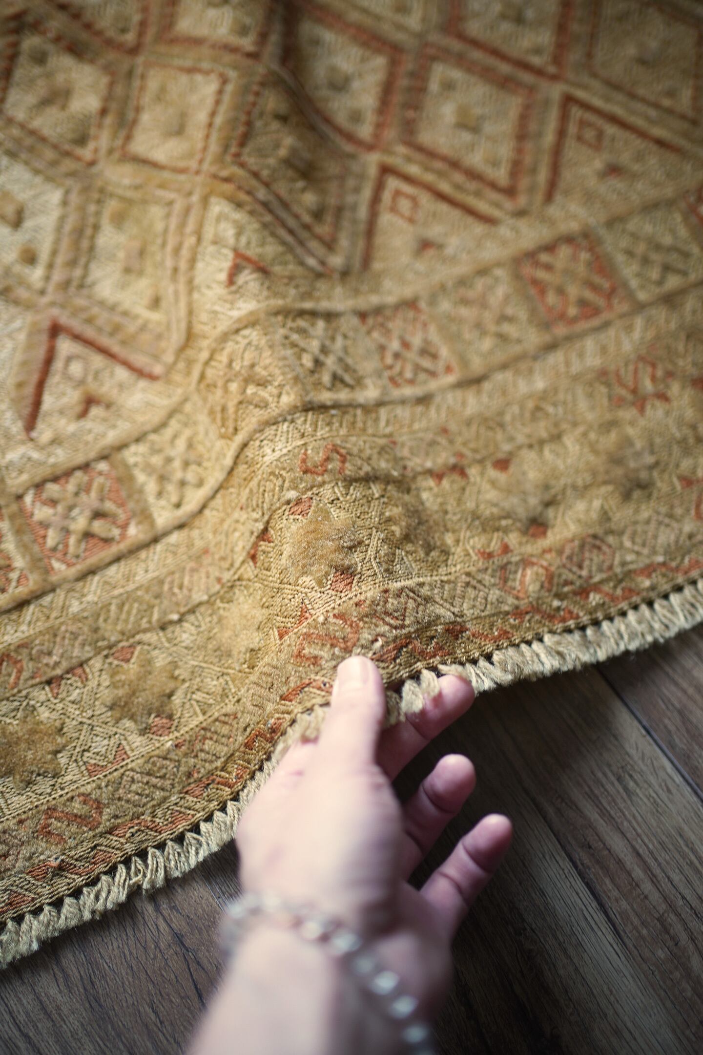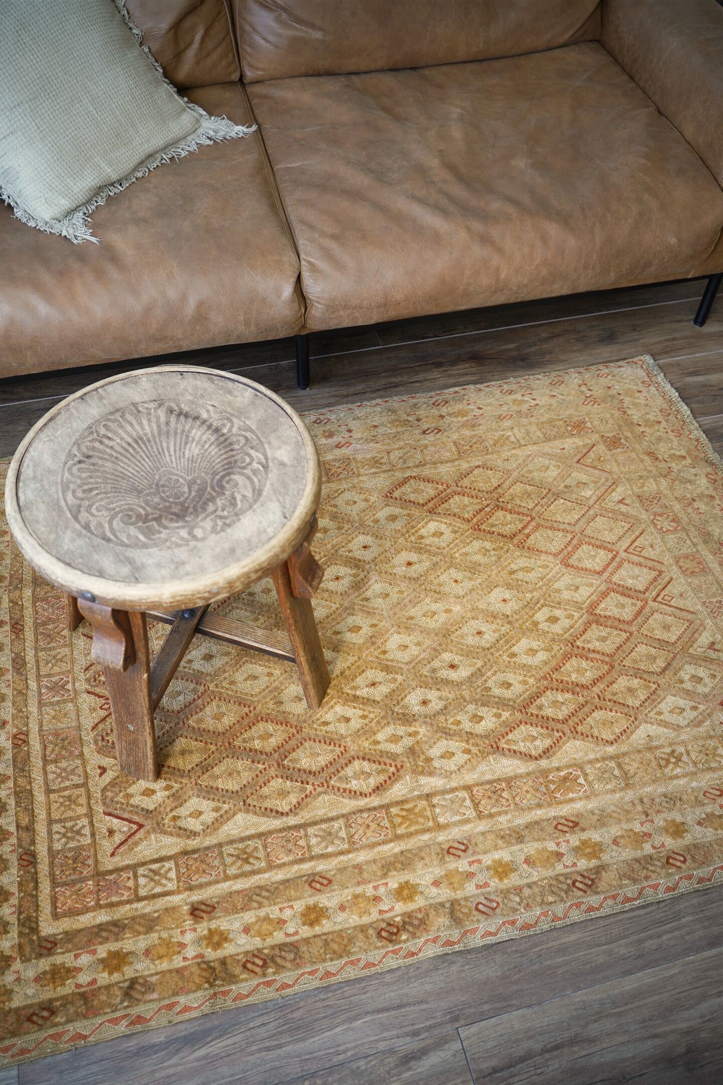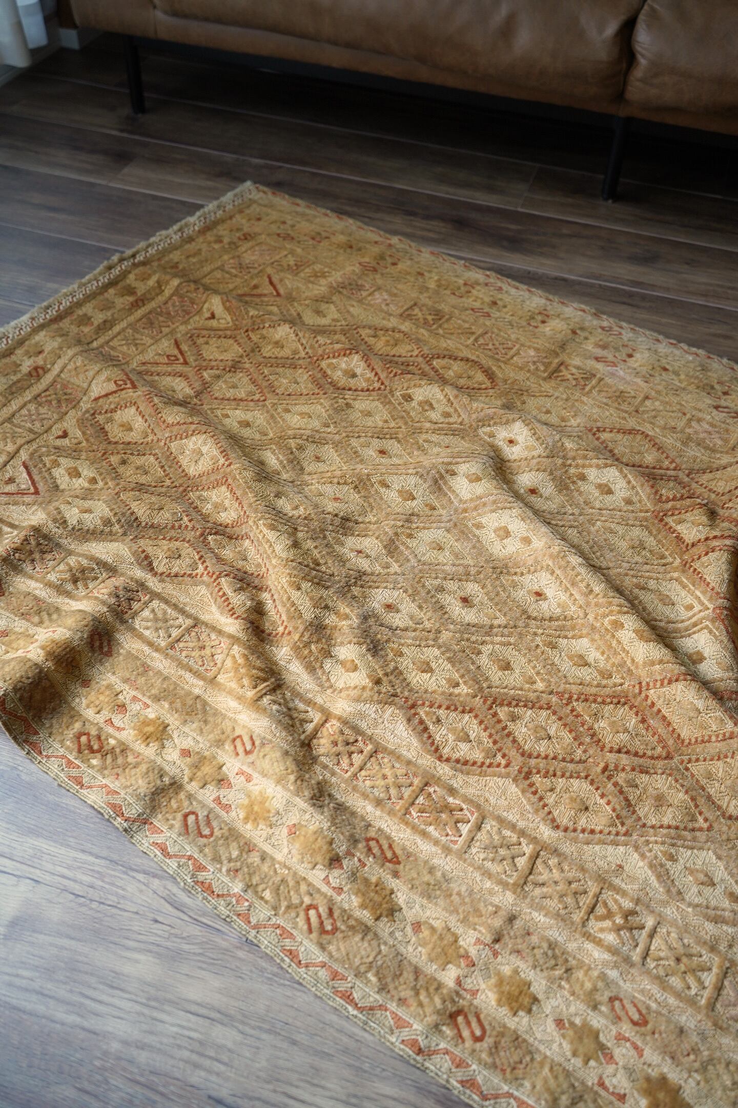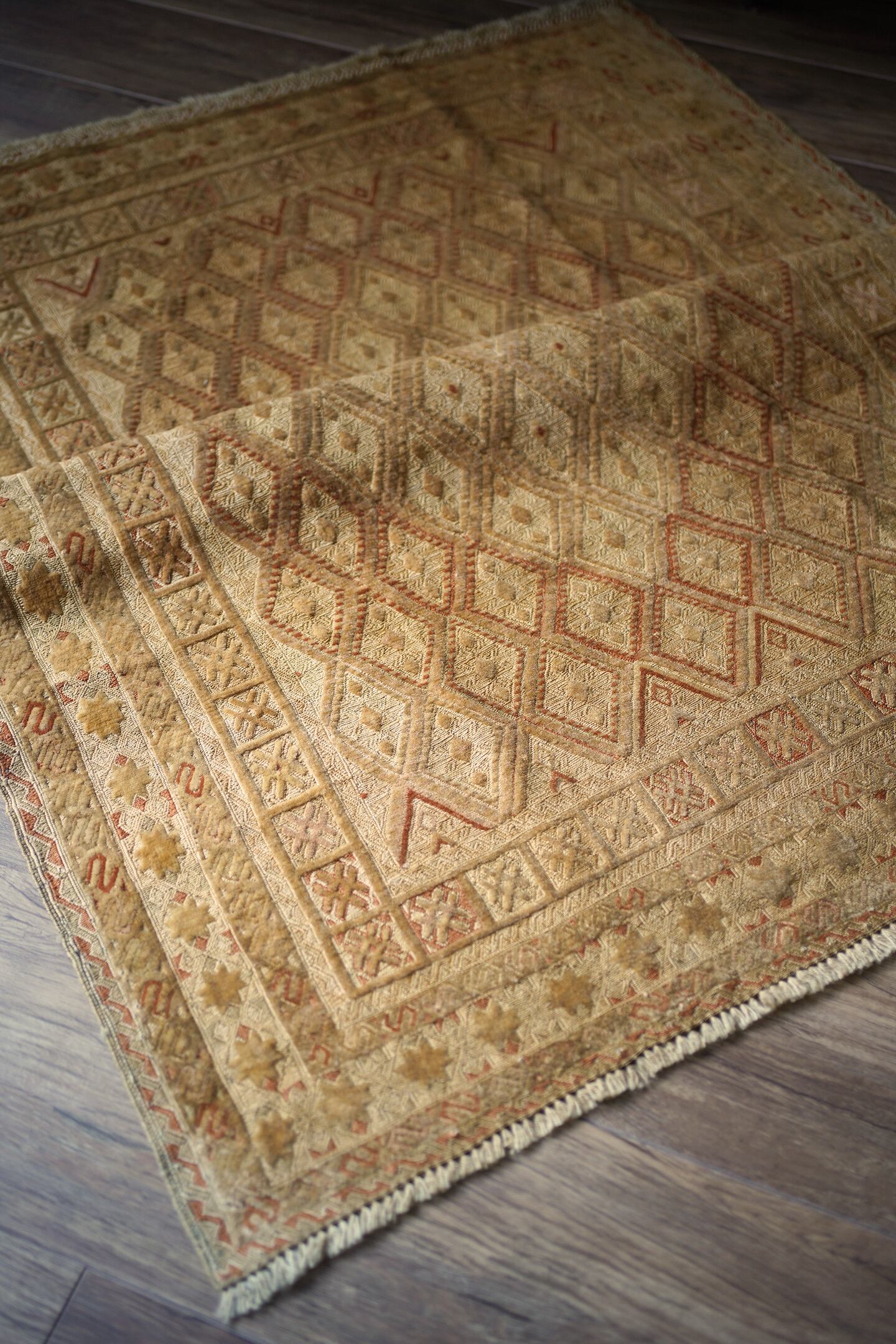 平織り(キリム)とパイル織り(絨毯)をミックスした技法で織られた人気のマシュワニラグ。ポコポコとした凹凸が特徴的で、美しい配列で織り込まれた菱形文様が特徴的なデザインです。くすんだベージュと暗めのオレンジの統一感のある配色で、使い込まれた渋いヴィンテージの風合いを感じられる一枚。ペラっとクタッとした薄手の質感で、表面はサラっとしつつも柔らかいパイルを感じる肌触り。厚みは3mm〜5mm程度です。目立ったダメージや補修された跡もなくグッドコンディション。アンティーク家具との相性も良さそうですね♪