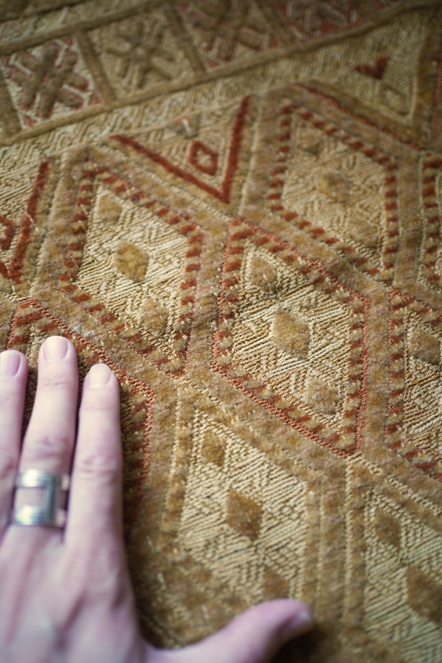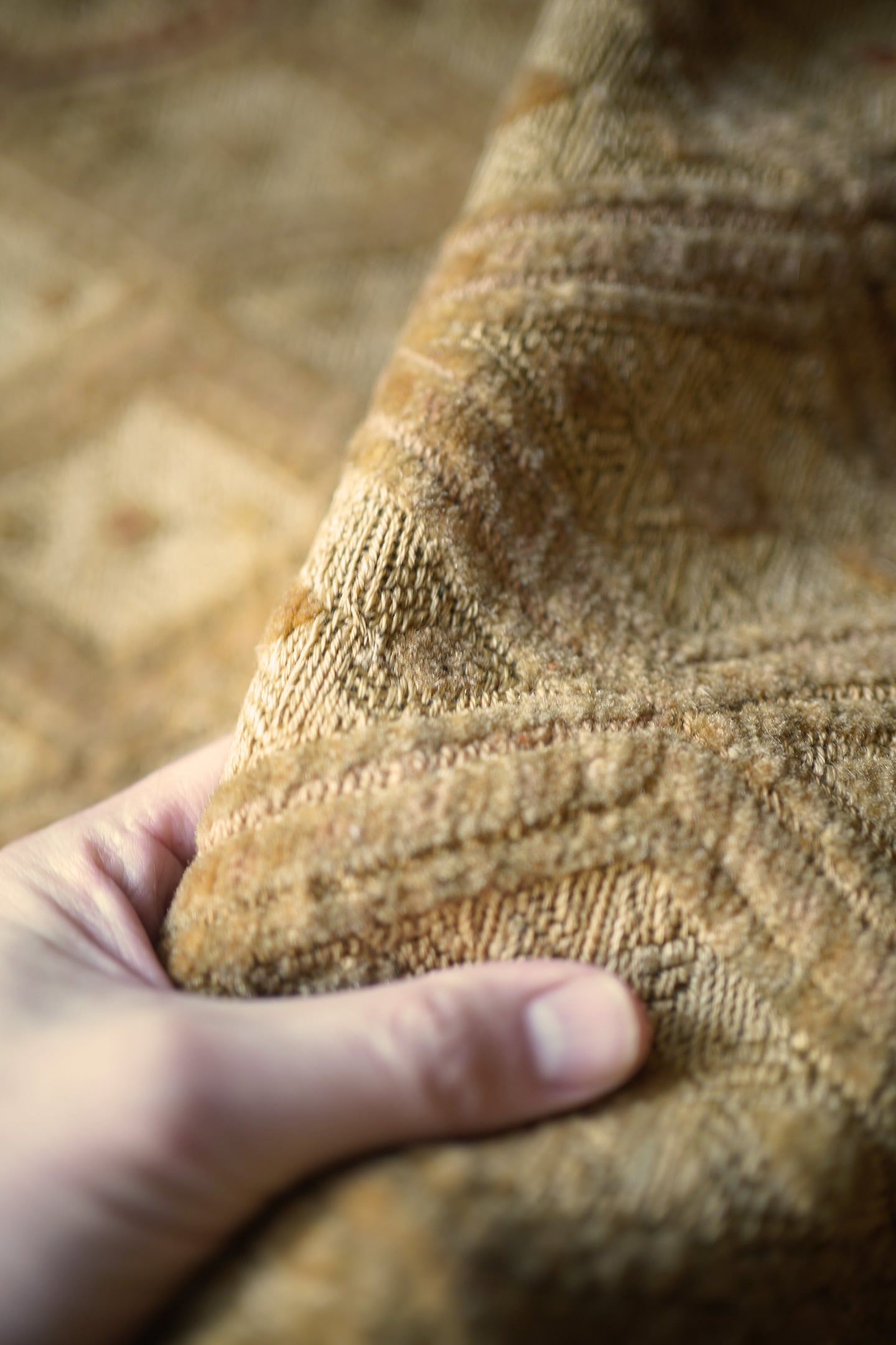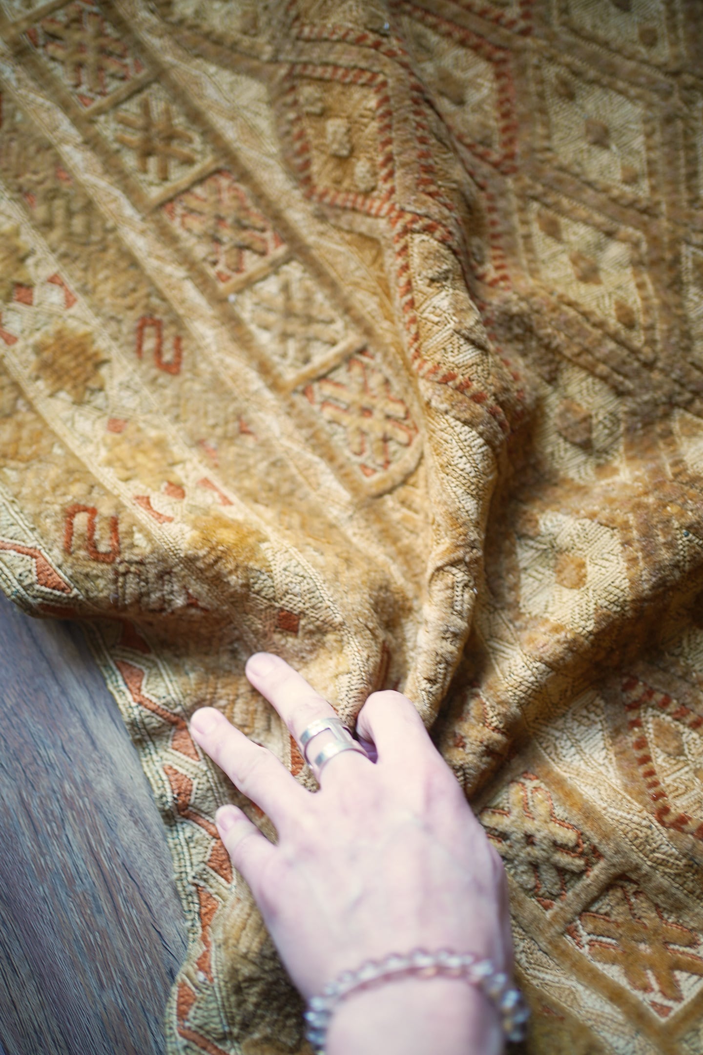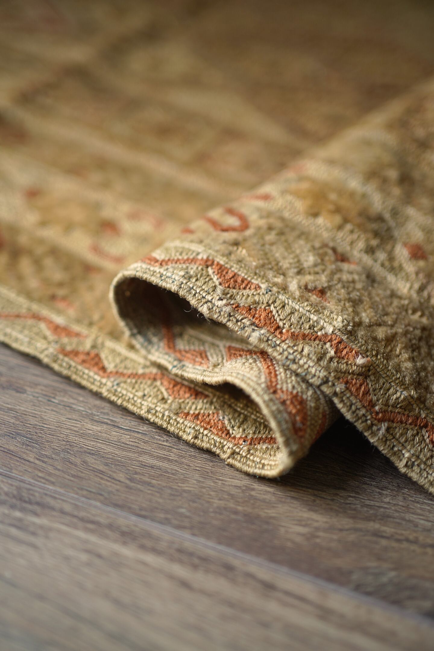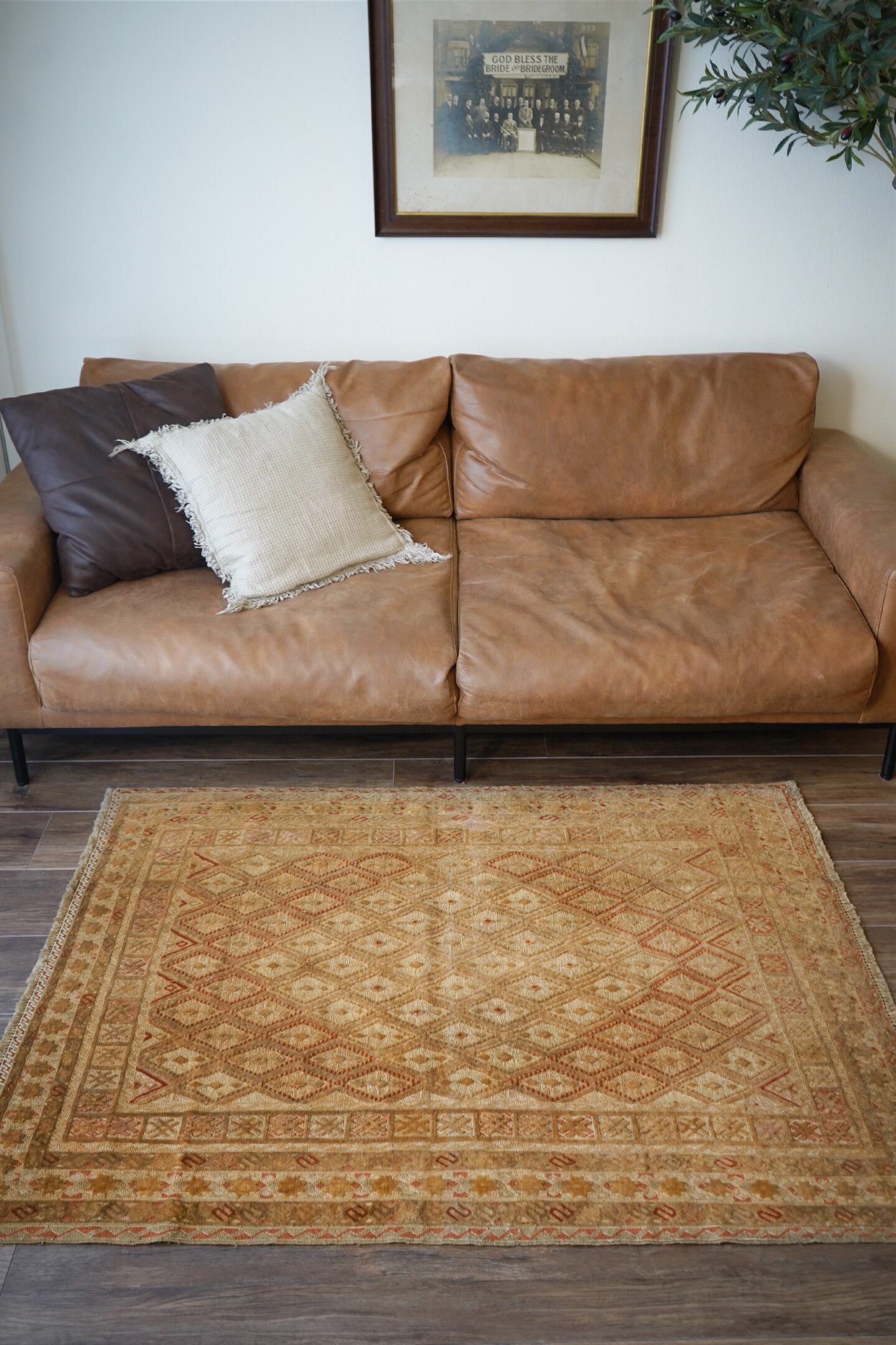 平織り(キリム)とパイル織り(絨毯)をミックスした技法で織られた人気のマシュワニラグ。ポコポコとした凹凸が特徴的で、美しい配列で織り込まれた菱形文様が特徴的なデザインです。くすんだベージュと暗めのオレンジの統一感のある配色で、使い込まれた渋いヴィンテージの風合いを感じられる一枚。ペラっとクタッとした薄手の質感で、表面はサラっとしつつも柔らかいパイルを感じる肌触り。厚みは3mm〜5mm程度です。目立ったダメージや補修された跡もなくグッドコンディション。アンティーク家具との相性も良さそうですね♪