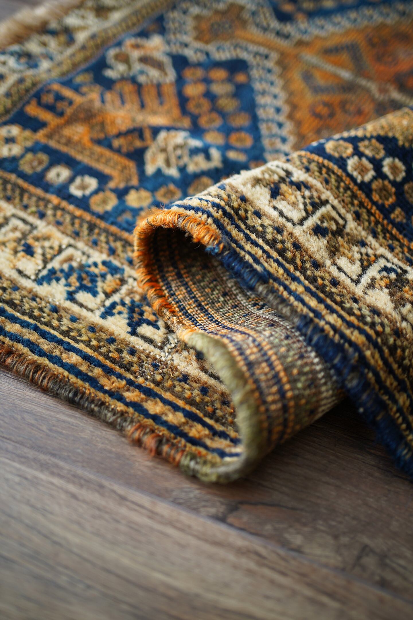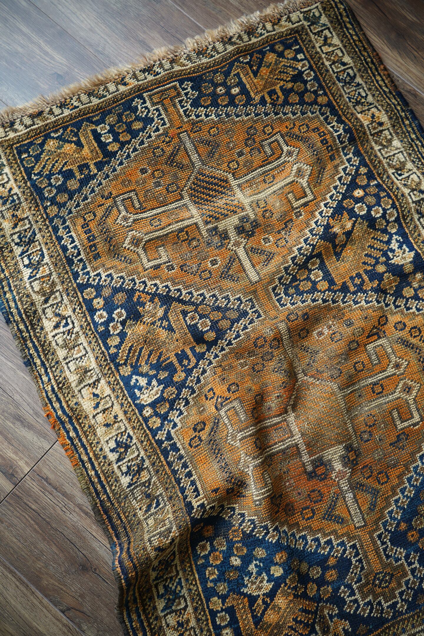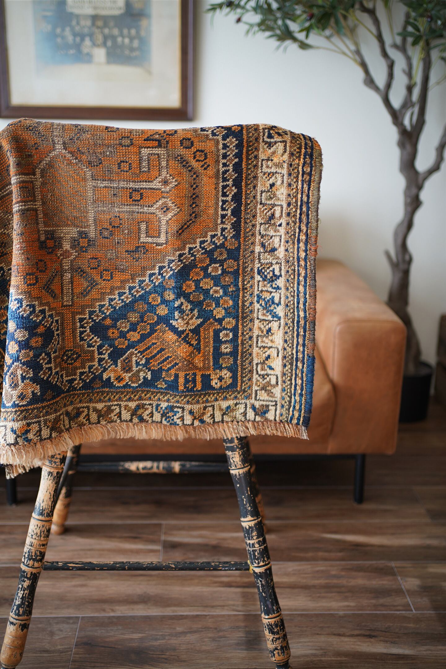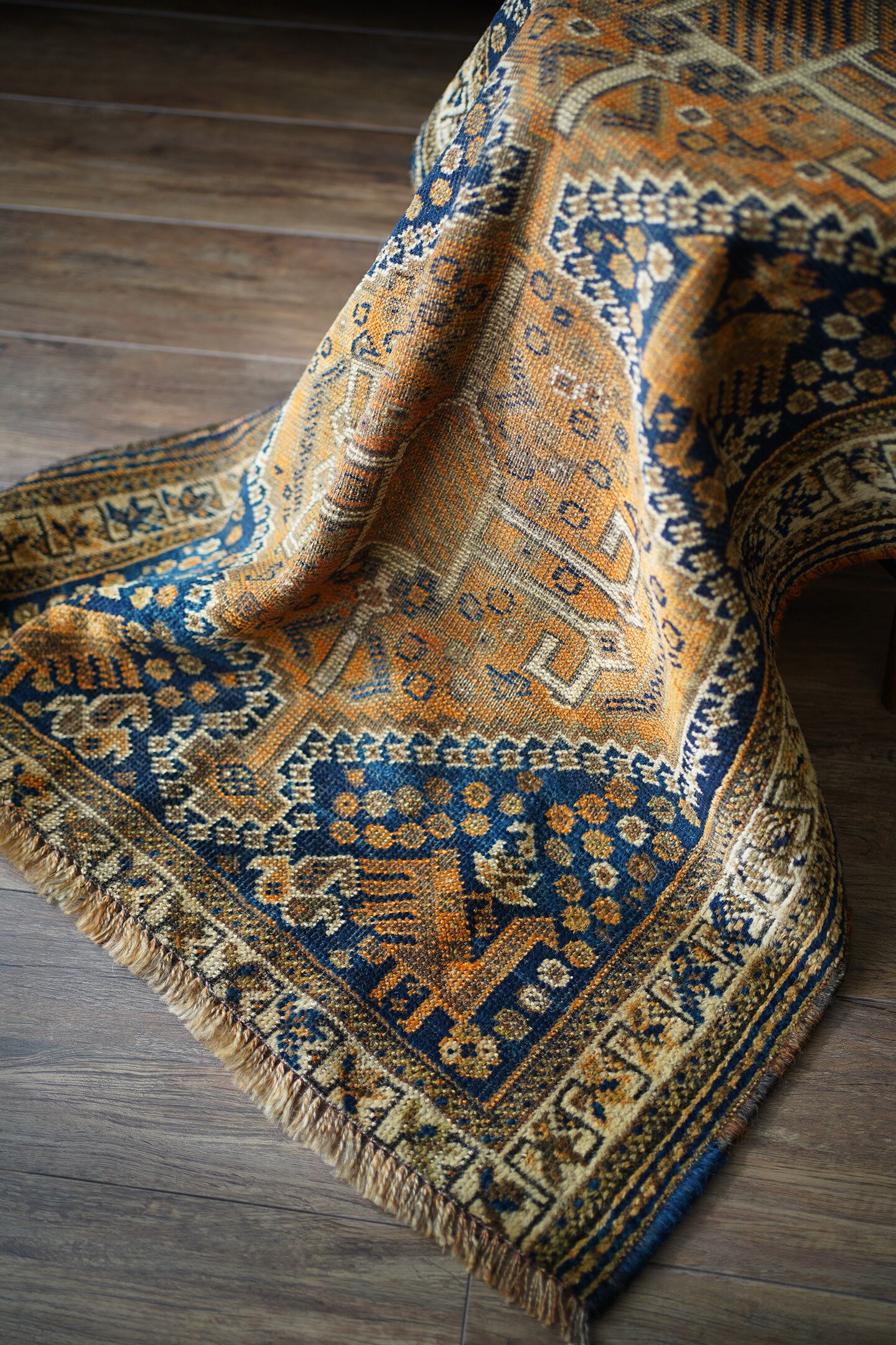 おおよそ100年前に織られたアンティークのカシュガイラグです。長い歴史を感じさせるアンティークの渋い風合いが非常に魅力的で、2連のメダリオン部分は経年による強い擦れがあります。配色は濃紺からネイビーへのグラデーションに、くすんだオレンジ、ベージュ、薄いブラウンなどの配色で、メダリオンの周りには美しい孔雀の紋様が織り込まれています。表面はサラッとした肌触りで、積み重ねた年月によりパイルの大半は残っていませんが、わずかに柔らかいパイルの質感を感じることができます。厚みは4mm〜5mm程度。目立ったダメージや補修された跡も見受けられずグッドコンデションです。少し大きめですが壁に掛けてタペストリーとして飾ったり、これからの季節はヒーターなどの暖房器具を上に乗せても非常にカッコ良い空間になると思います。
