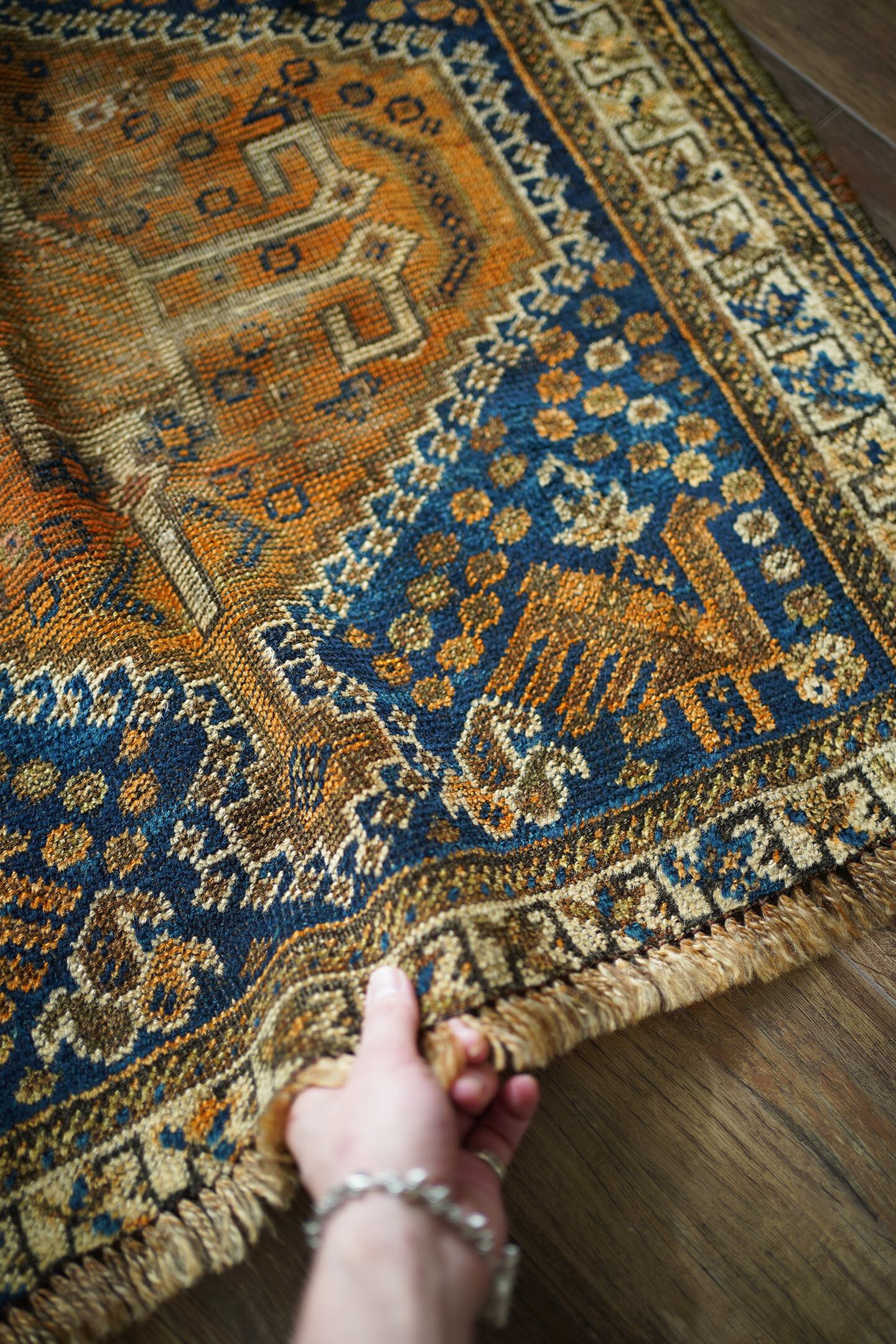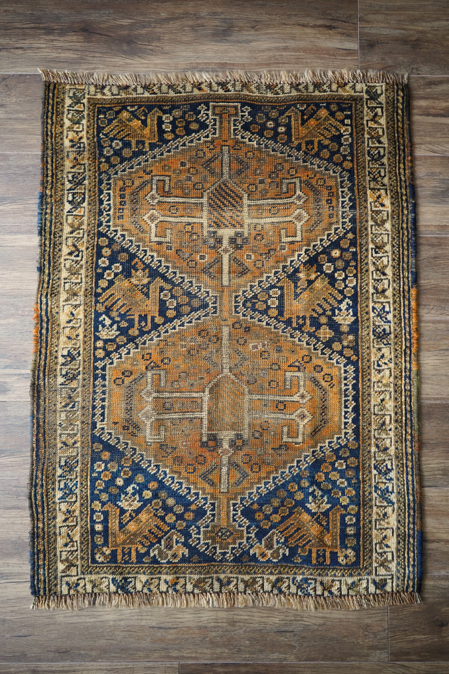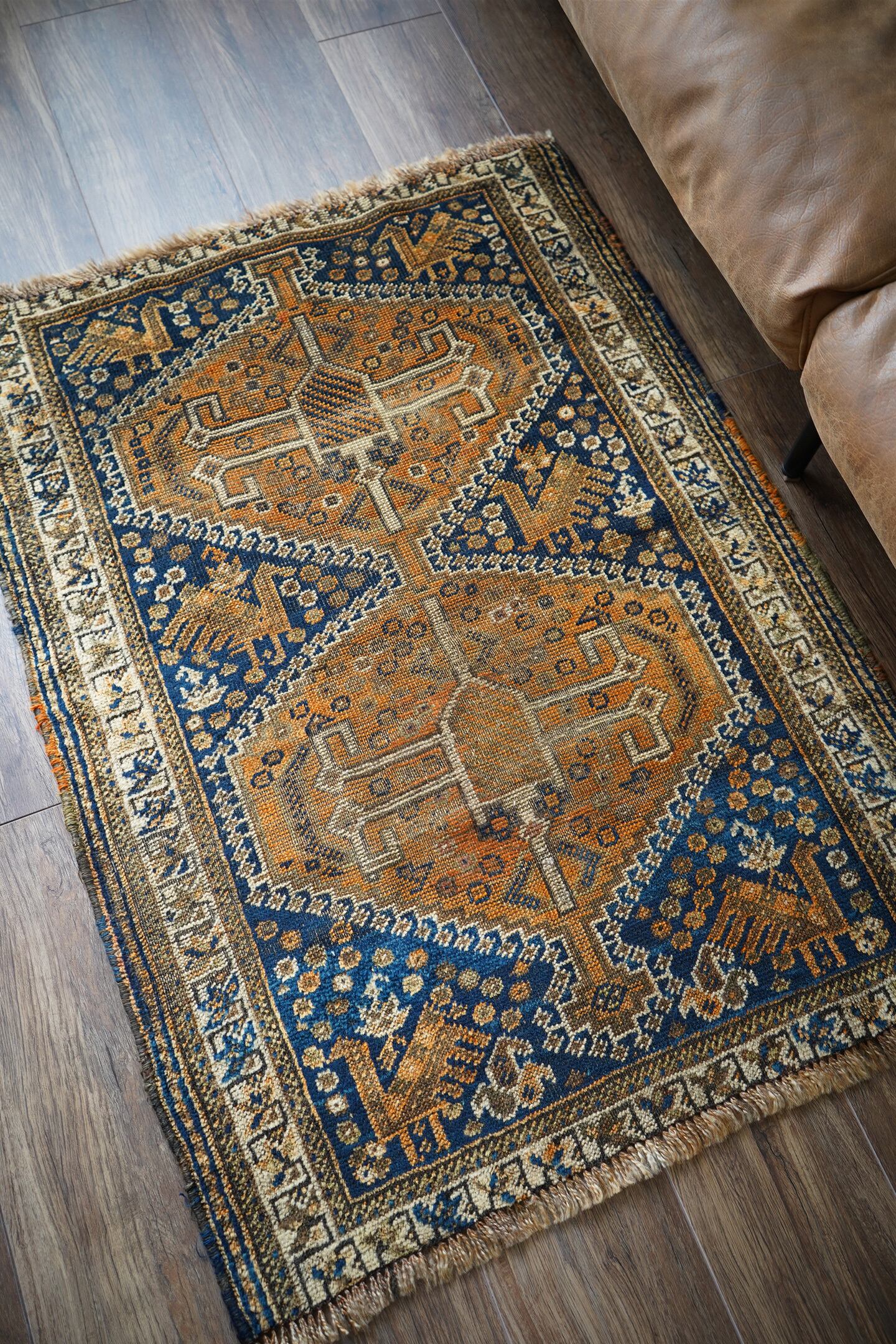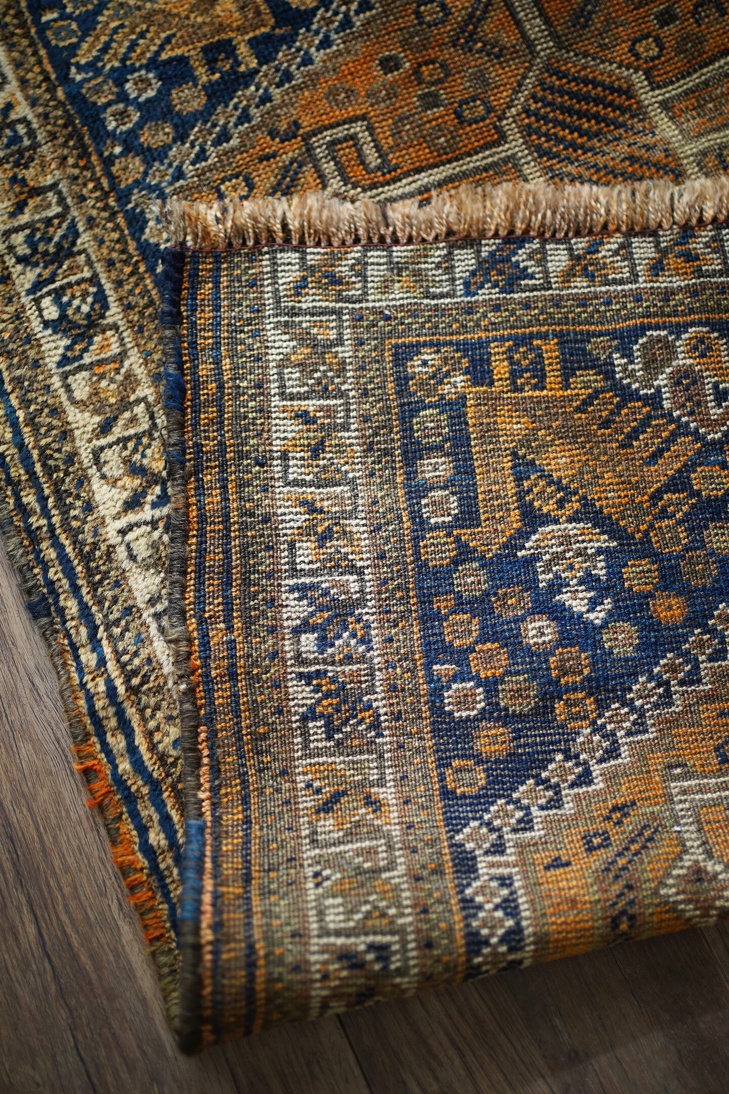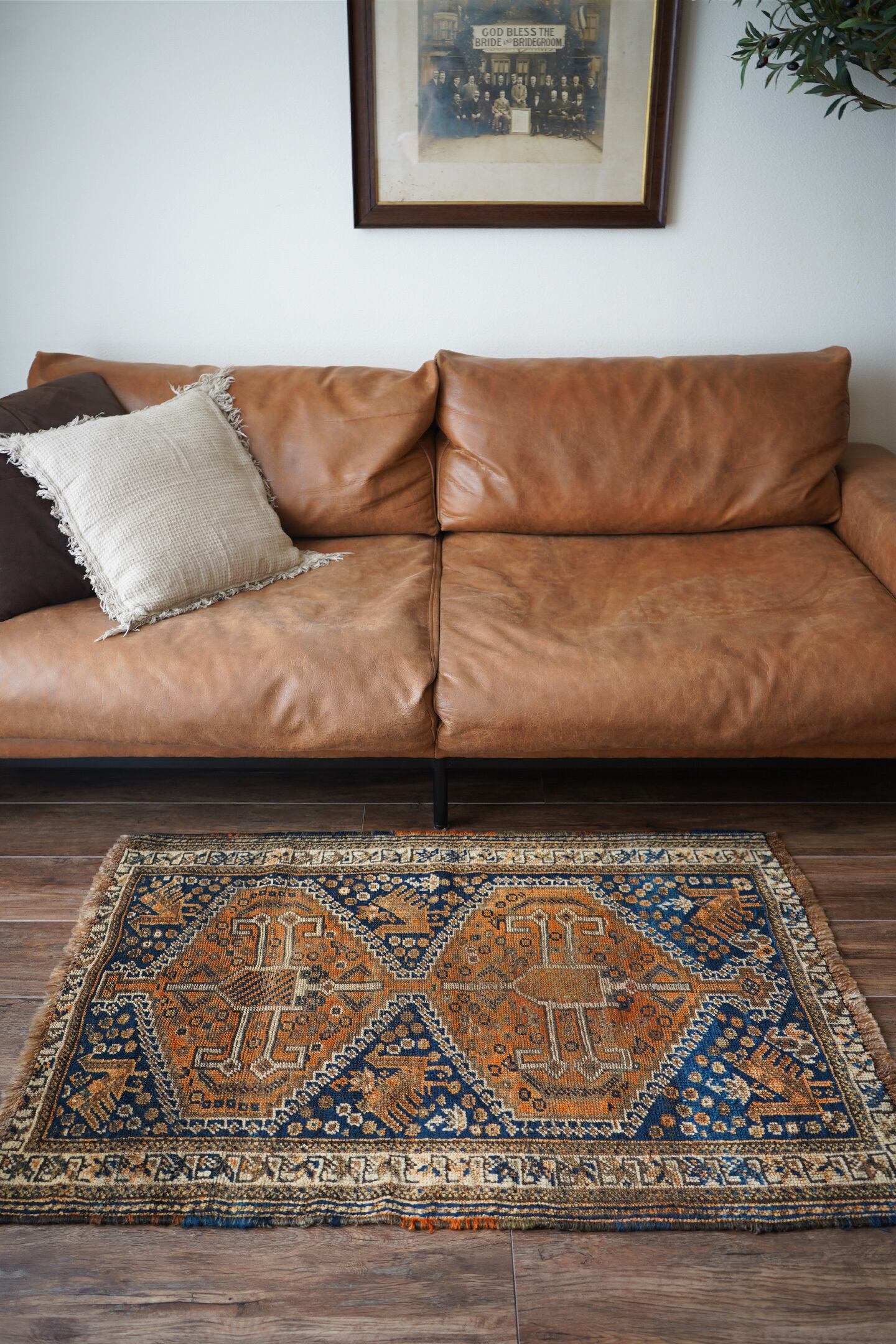 おおよそ100年前に織られたアンティークのカシュガイラグです。長い歴史を感じさせるアンティークの渋い風合いが非常に魅力的で、2連のメダリオン部分は経年による強い擦れがあります。配色は濃紺からネイビーへのグラデーションに、くすんだオレンジ、ベージュ、薄いブラウンなどの配色で、メダリオンの周りには美しい孔雀の紋様が織り込まれています。表面はサラッとした肌触りで、積み重ねた年月によりパイルの大半は残っていませんが、わずかに柔らかいパイルの質感を感じることができます。厚みは4mm〜5mm程度。目立ったダメージや補修された跡も見受けられずグッドコンデションです。少し大きめですが壁に掛けてタペストリーとして飾ったり、これからの季節はヒーターなどの暖房器具を上に乗せても非常にカッコ良い空間になると思います。