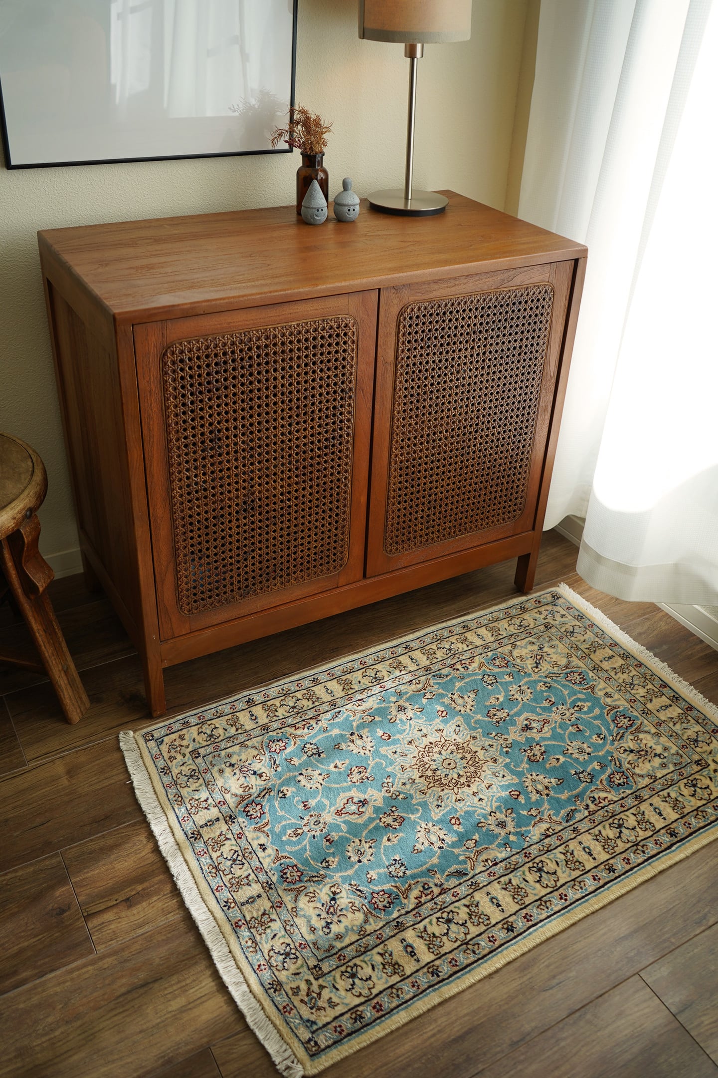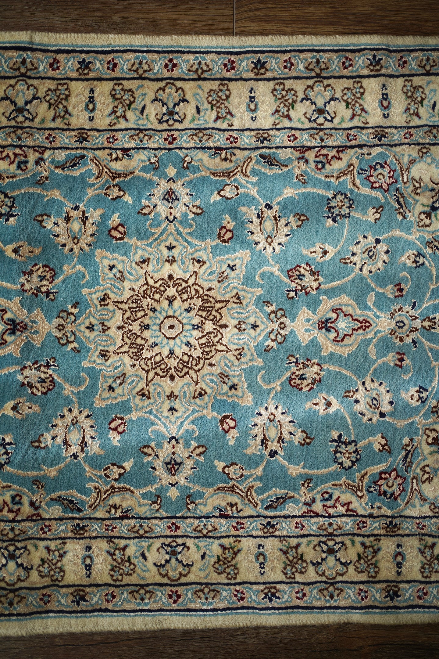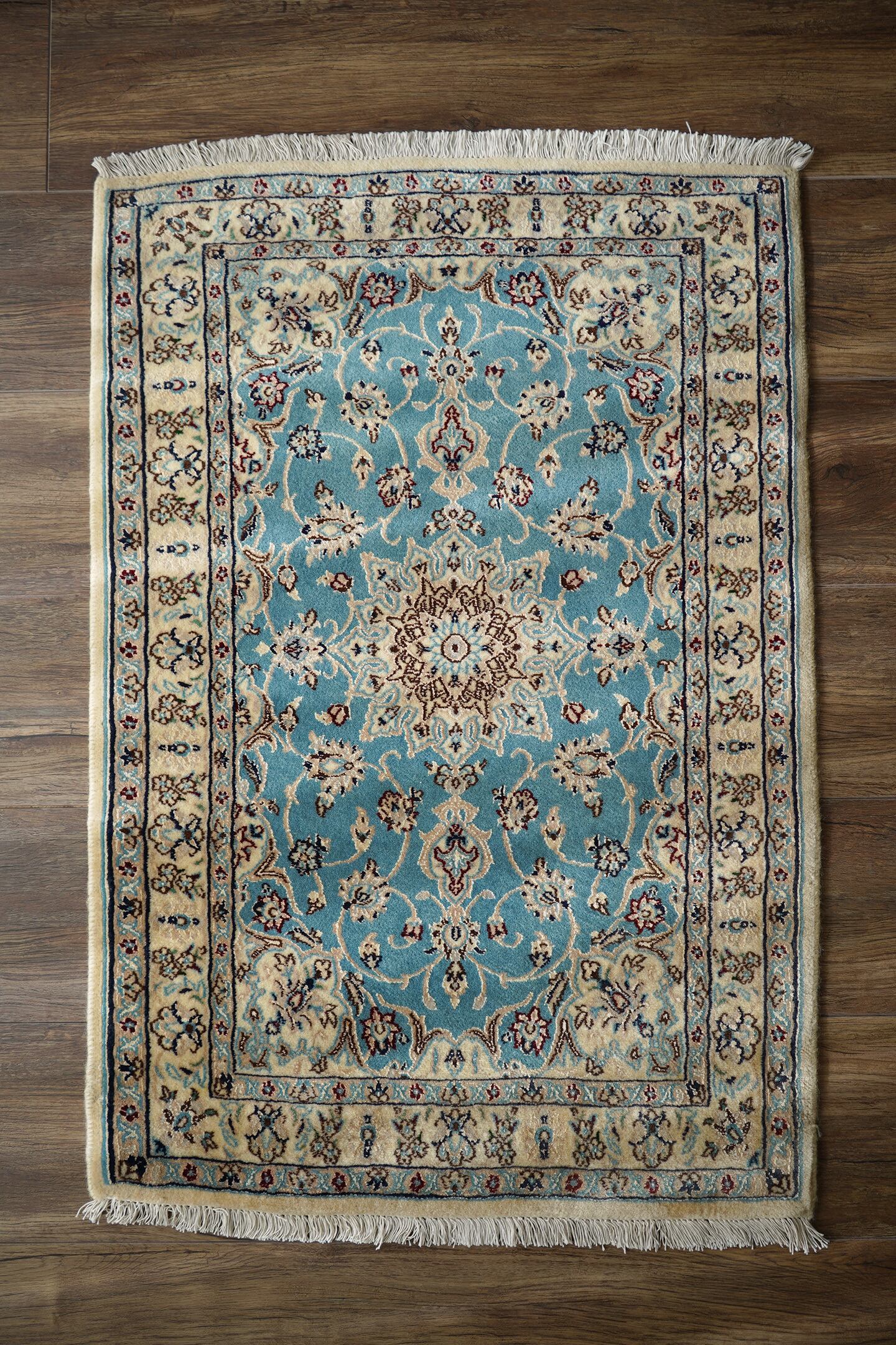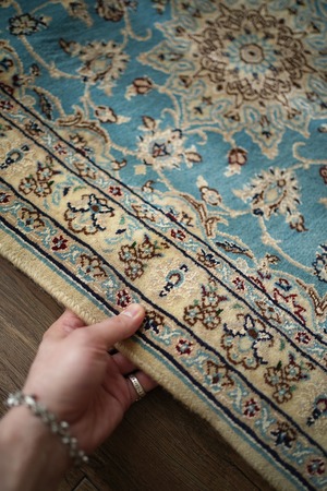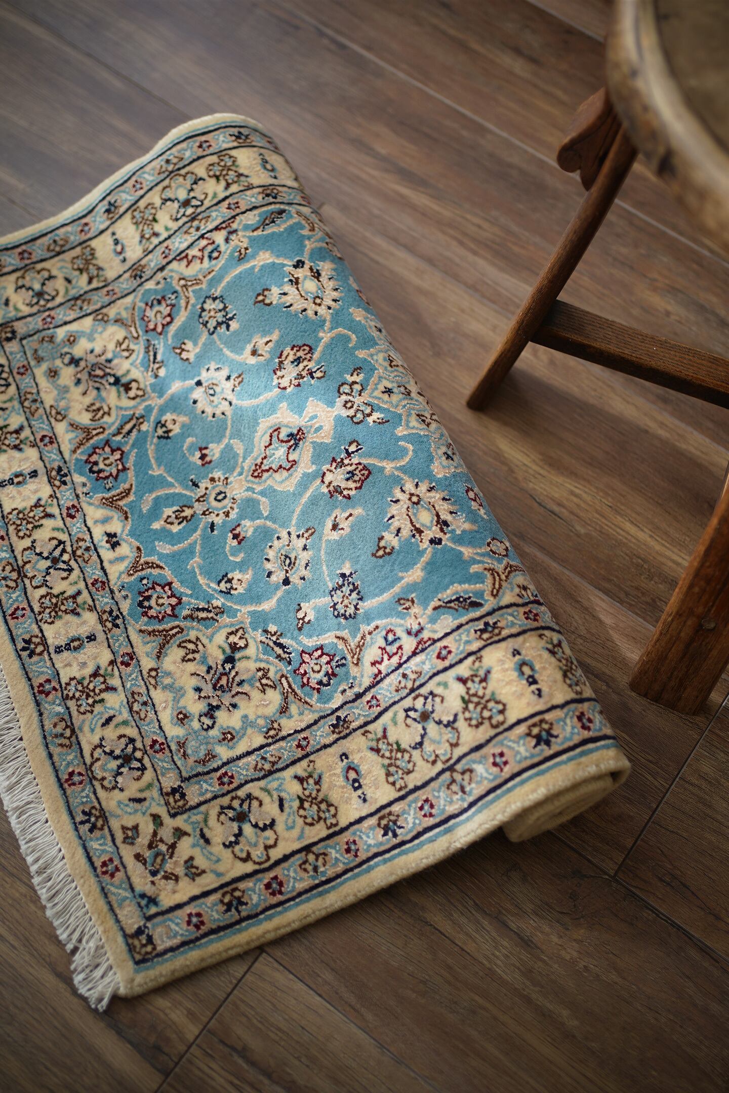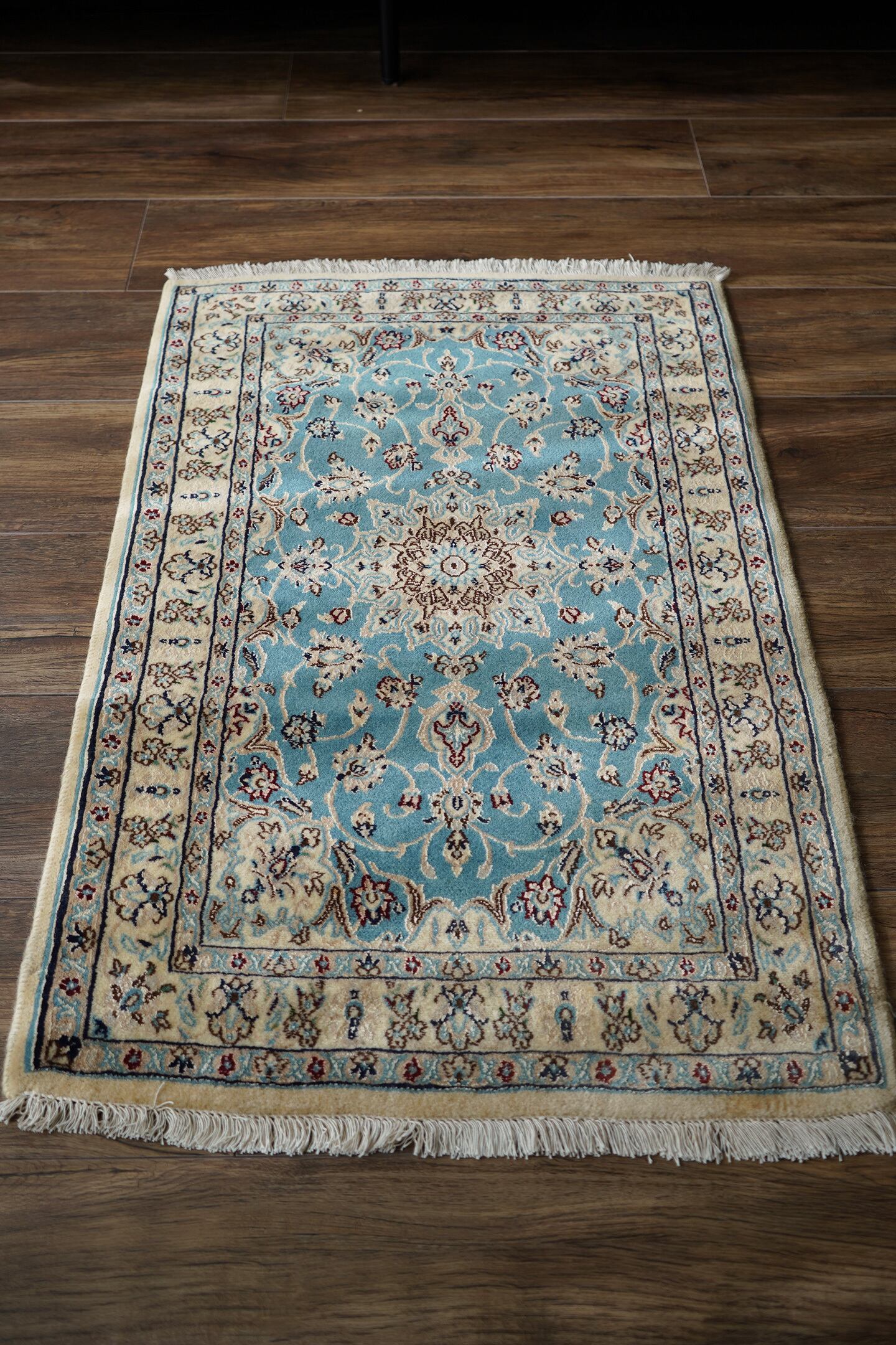 優美で落ち着いたデザインで人気のイラン中央部の都市ナイン産ラグ。ペルシャ絨毯5大産地の一つで華やかな草花モチーフのパターンが代表的です。ライトブルーとクリーム色の上品なコントラストが目を惹く一枚で、美しく洗練されたデザインが魅力的です。アクセントカラーにワインレッドとグリーンがさりげなく使われているところも店主の好きなポイント。フラットに整った長さの上質感を感じるパイルの質感で、厚みは8mm程度。表面はふわっと柔らかく優しい肌触りで、心地よい弾力のある踏み心地をしています。コンディションとしては一部ほとんど目立ちませんが薄ら擦れのような跡がございます。それ以外は大変良好なコンディションです。玄関をはじめ、全身鏡の前やキャビネットの前、洗面スペースなど色んな場所でご使用いただけます。