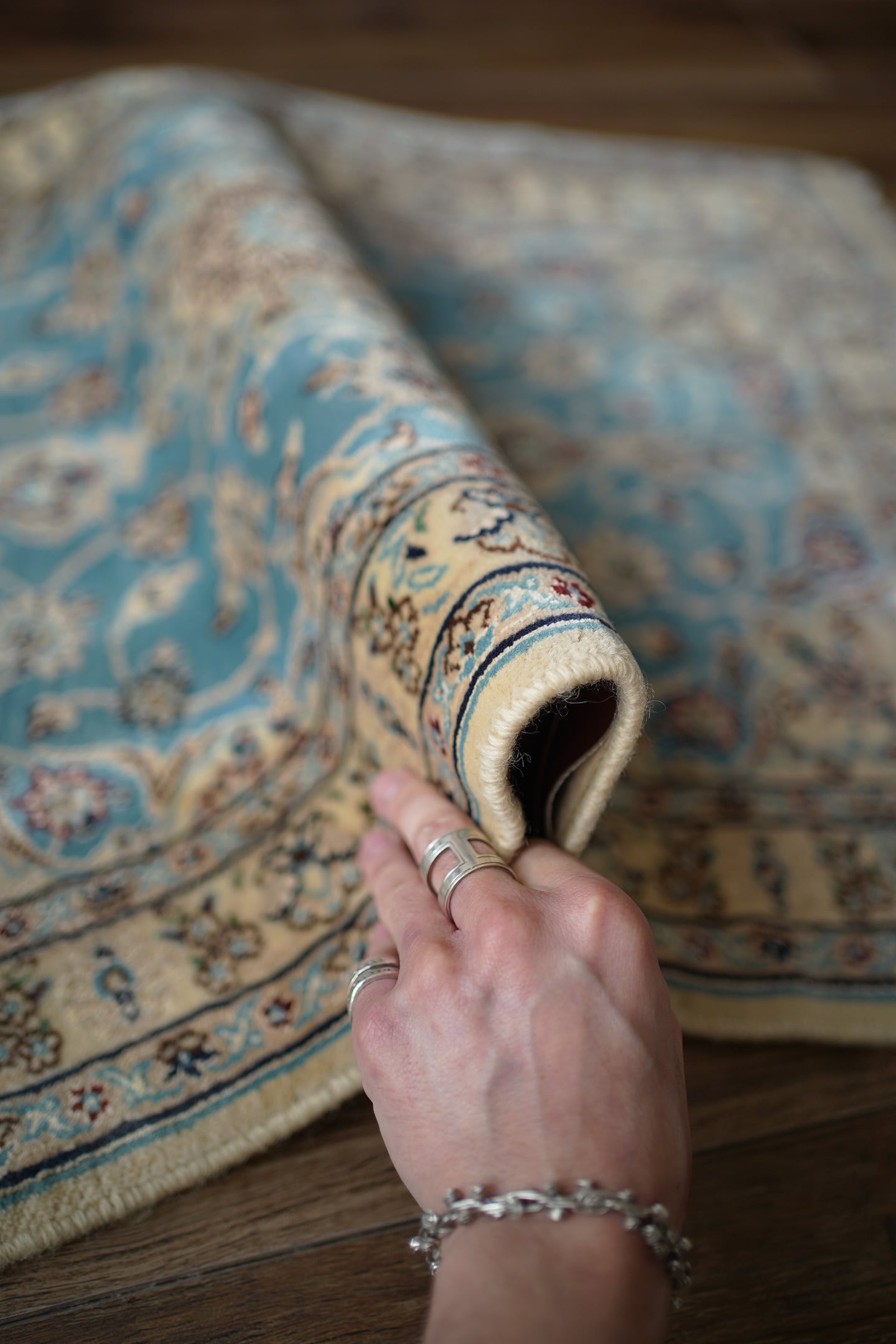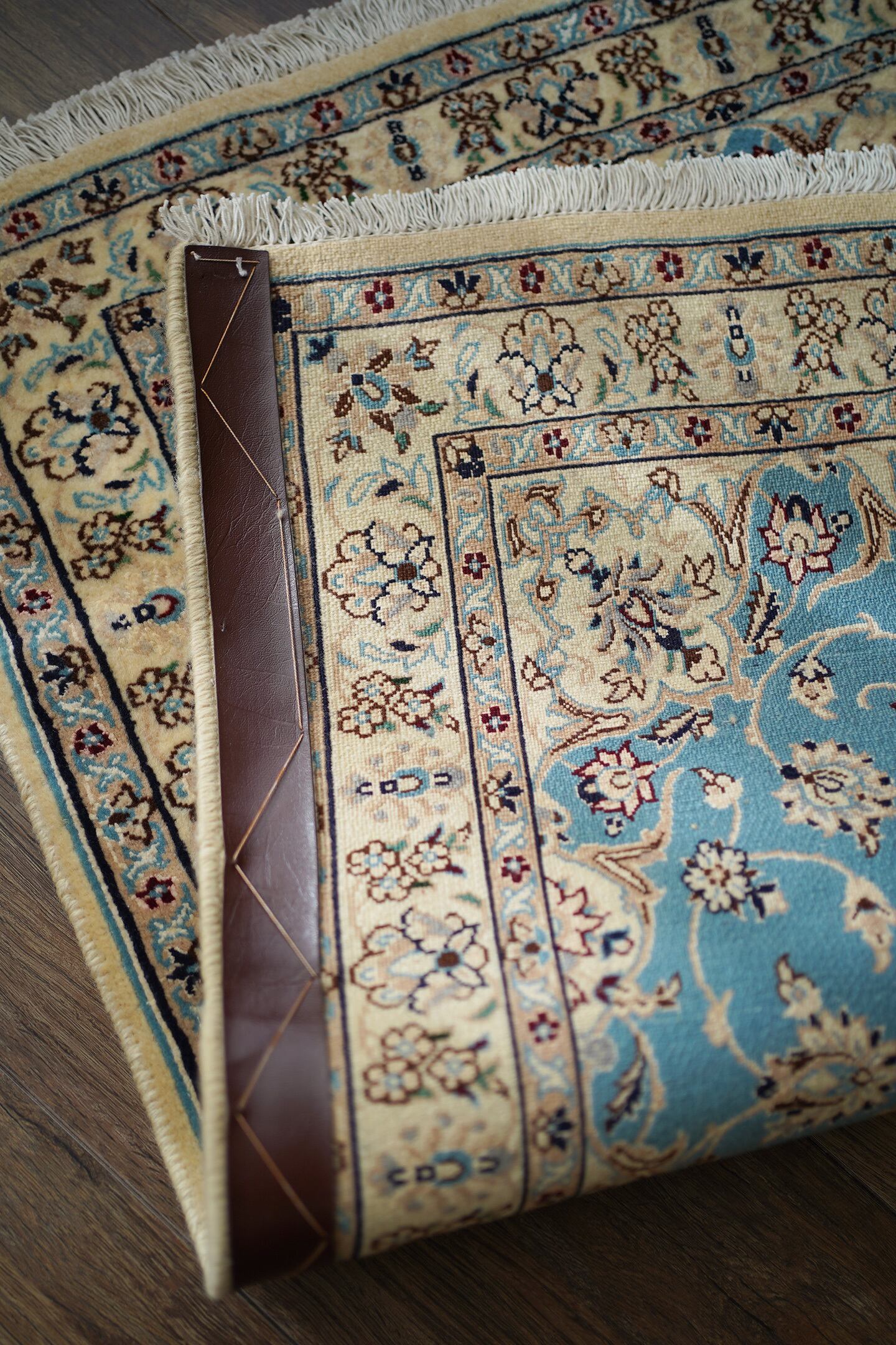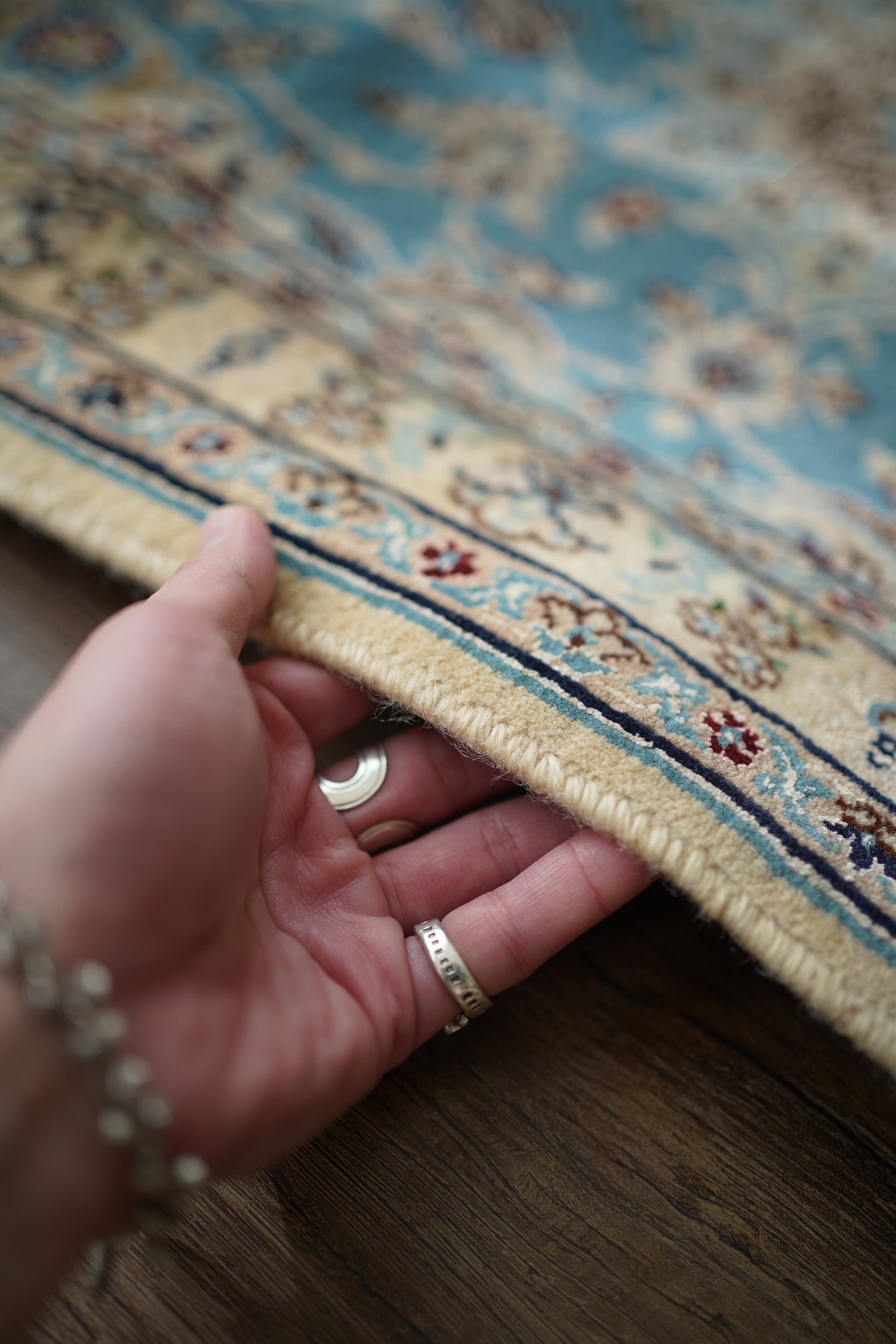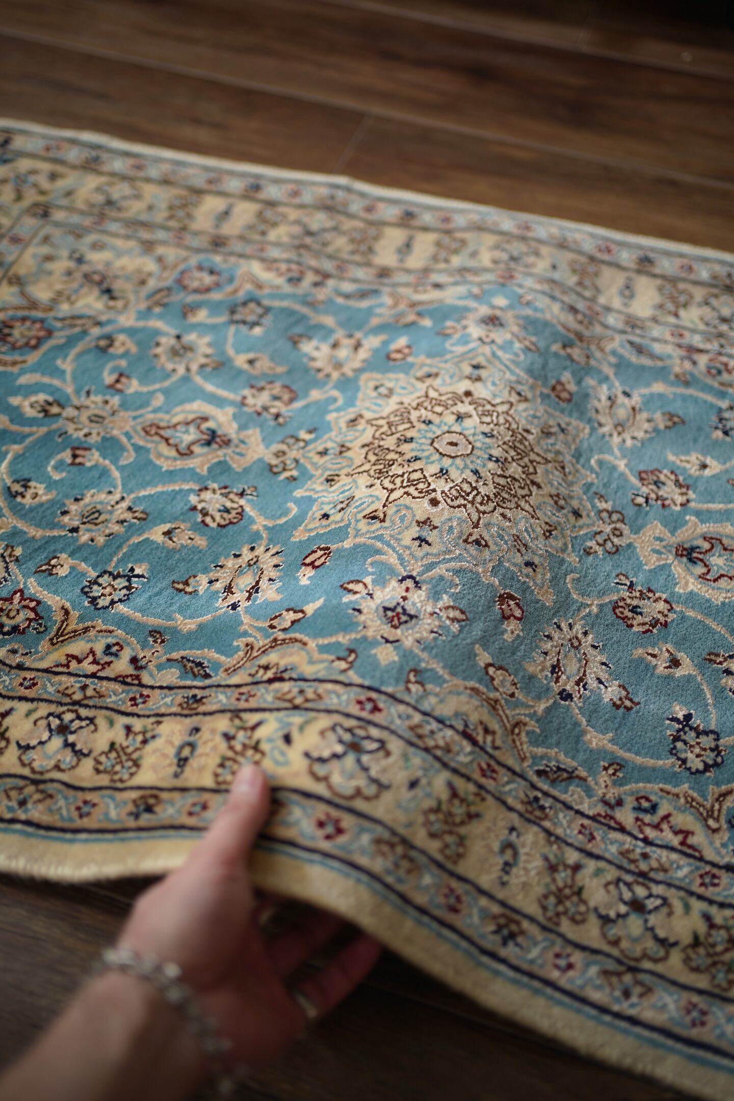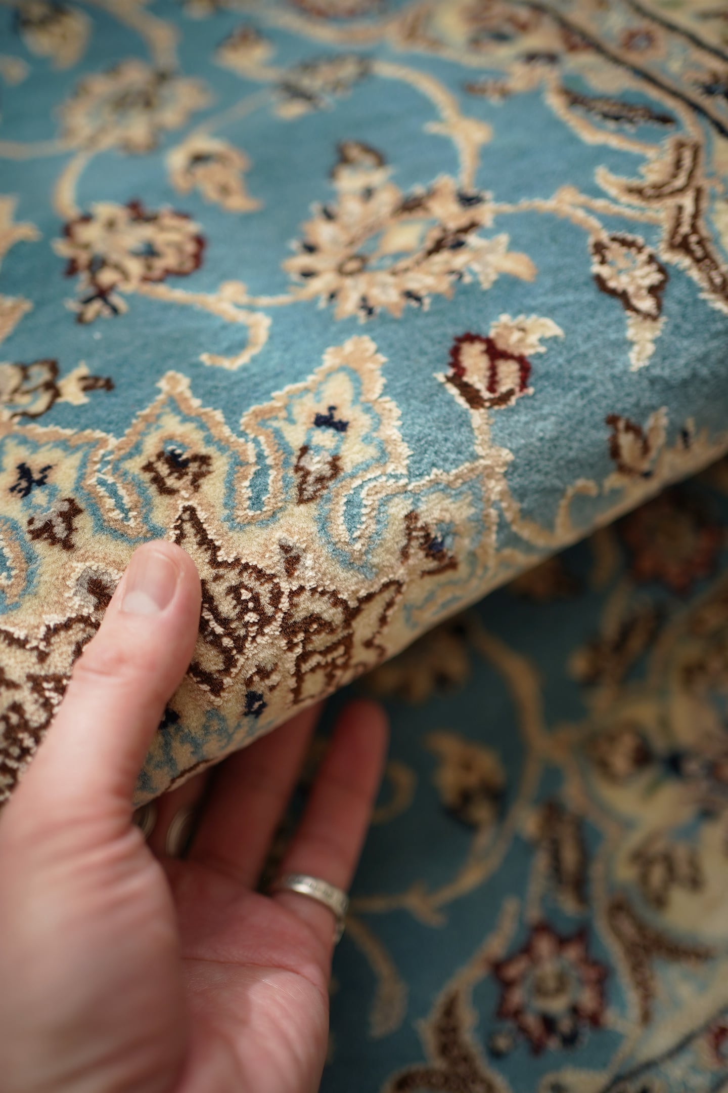 優美で落ち着いたデザインで人気のイラン中央部の都市ナイン産ラグ。ペルシャ絨毯5大産地の一つで華やかな草花モチーフのパターンが代表的です。ライトブルーとクリーム色の上品なコントラストが目を惹く一枚で、美しく洗練されたデザインが魅力的です。アクセントカラーにワインレッドとグリーンがさりげなく使われているところも店主の好きなポイント。フラットに整った長さの上質感を感じるパイルの質感で、厚みは8mm程度。表面はふわっと柔らかく優しい肌触りで、心地よい弾力のある踏み心地をしています。コンディションとしては一部ほとんど目立ちませんが薄ら擦れのような跡がございます。それ以外は大変良好なコンディションです。玄関をはじめ、全身鏡の前やキャビネットの前、洗面スペースなど色んな場所でご使用いただけます。