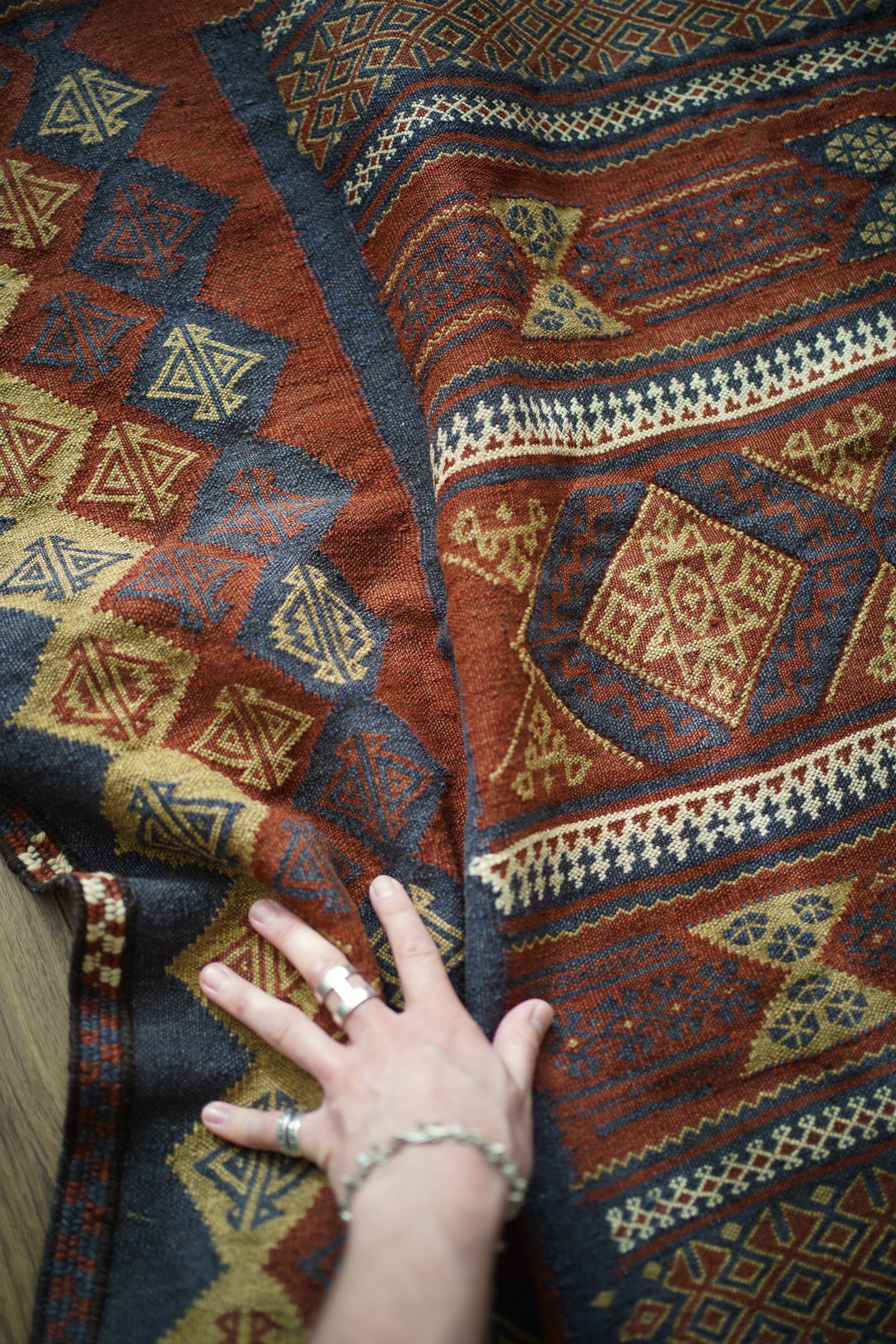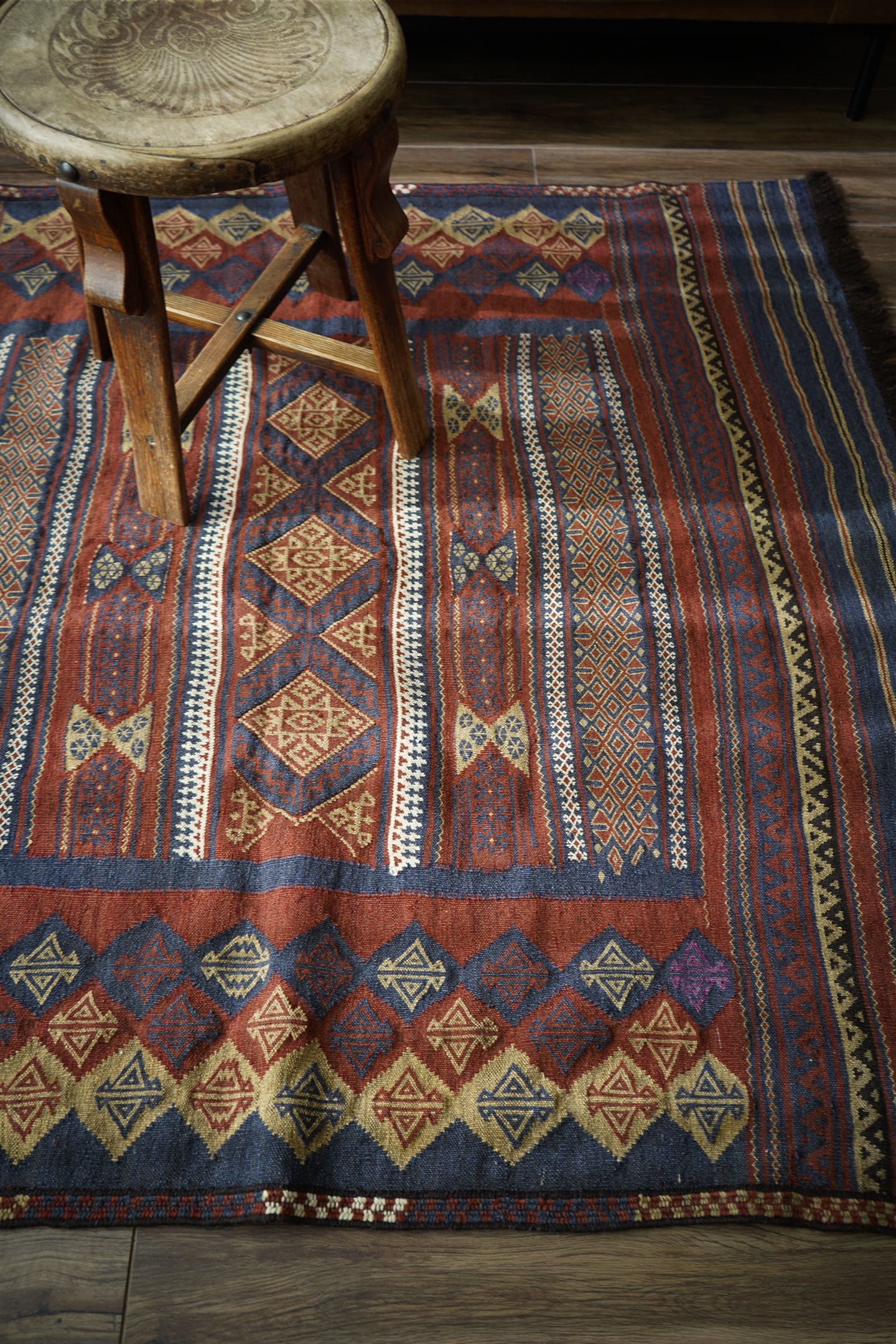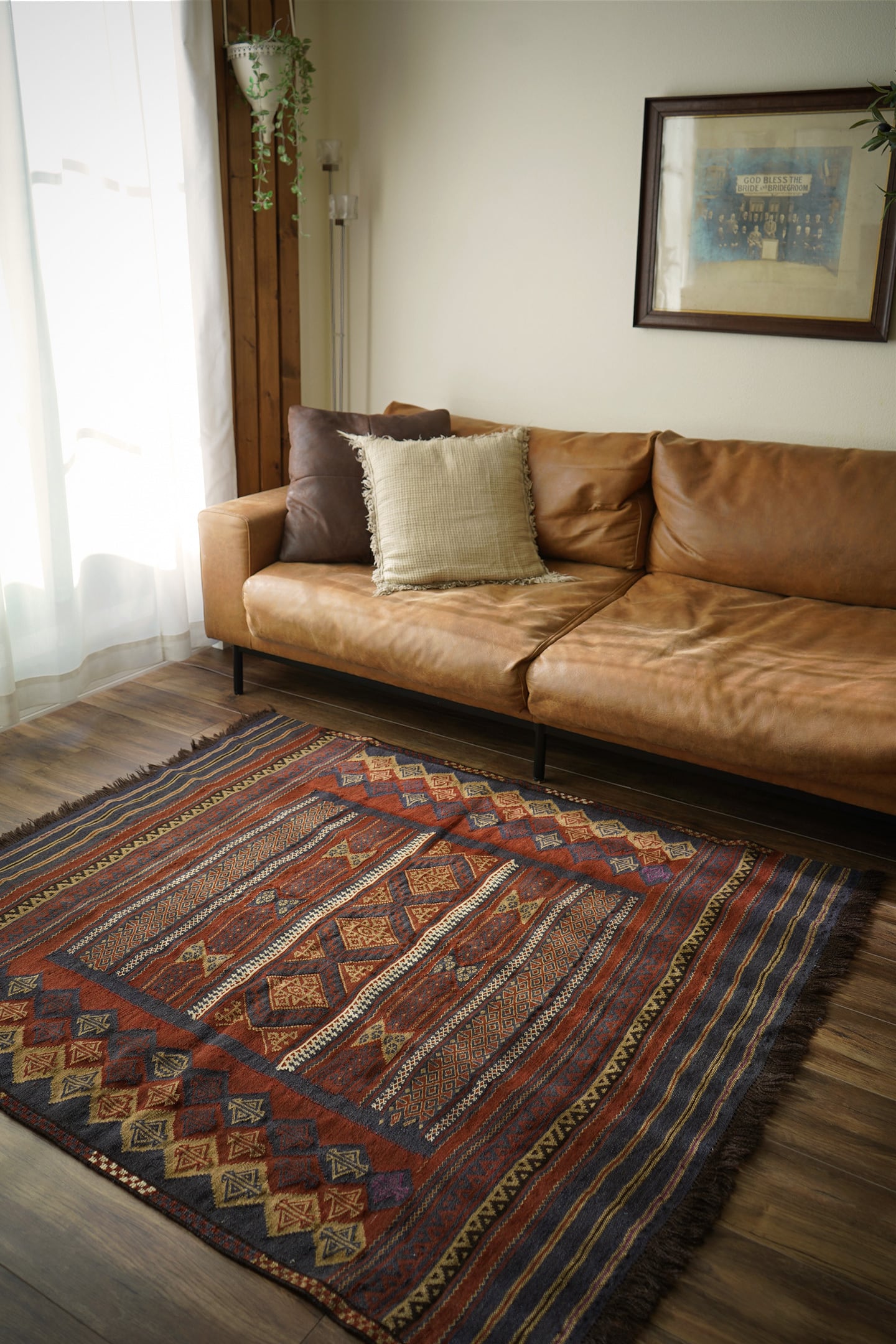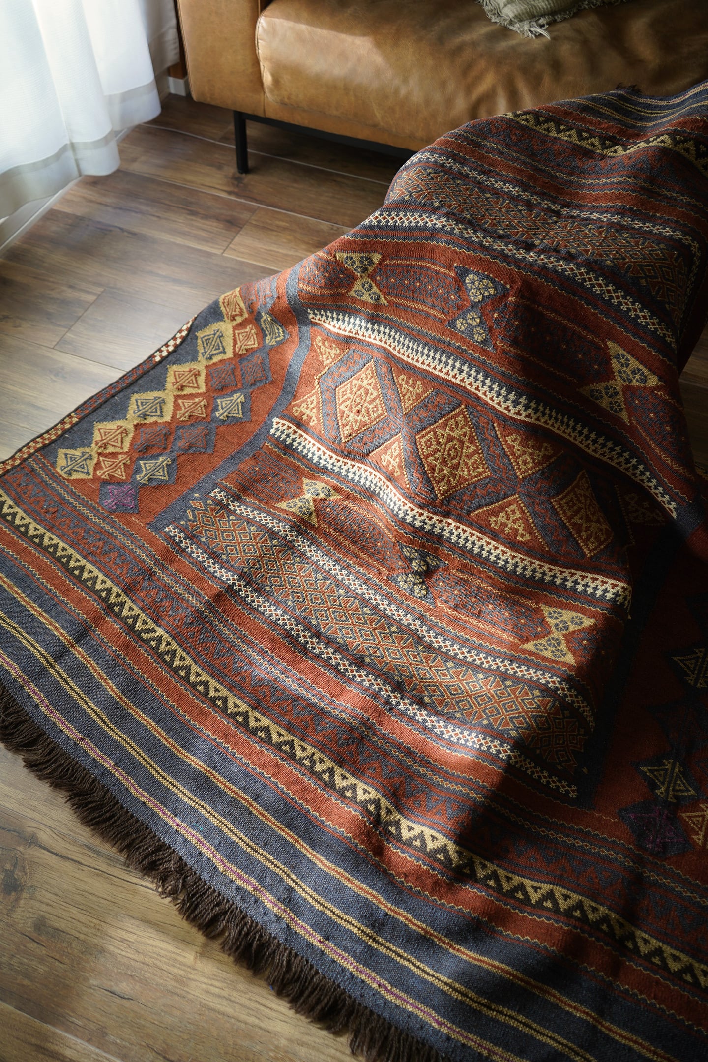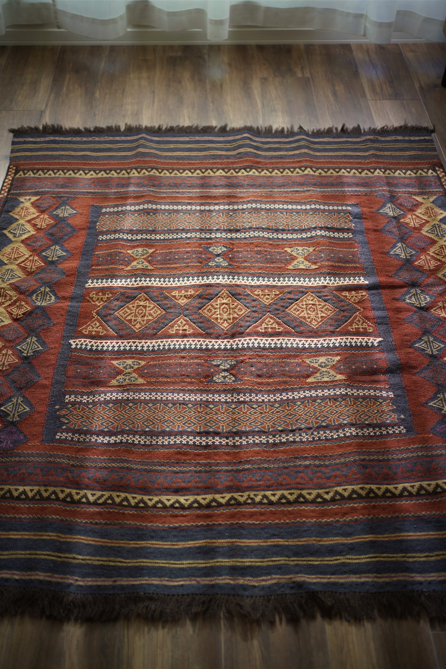 約50年前にアフガニスタンのバルーチ族によって織られたキリムです。"ソフレ"と呼ばれる食卓布で、食事の敷物やテーブルクロスとして使用され、通常は食事の際にお皿を置くために地面に広げられて使われます。細部にかけてこだわりが感じられるデザインで、紋様の配置や色遣いなどセンス抜群の一枚です。配色は暗めのえんじ色、グレーとネイビーの中間色、オフホワイト、薄いブラウンなど。一部だけ紫色が使われている部分も非常にユニークです。表面はサラッとサッパリとしたキリム特有の質感で、3mm〜4mm程度の厚みです。ダメージなどもなく大変良好なコンディション。ダイニングテーブル下やデスクマットとしてなどお好きな使い方で楽しんでください♪