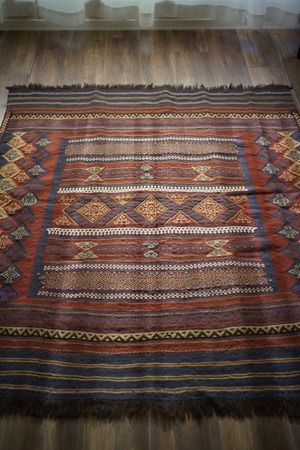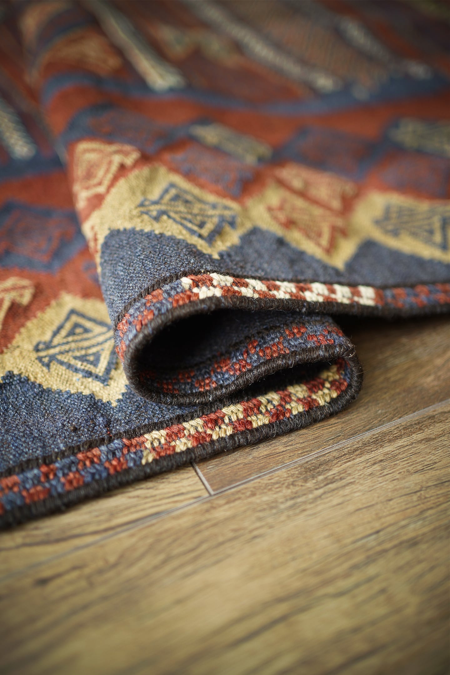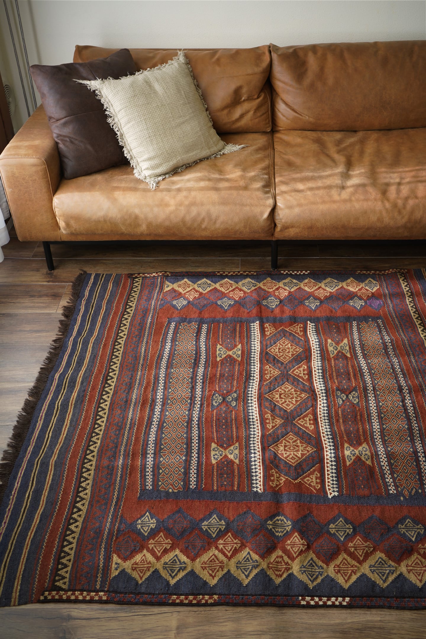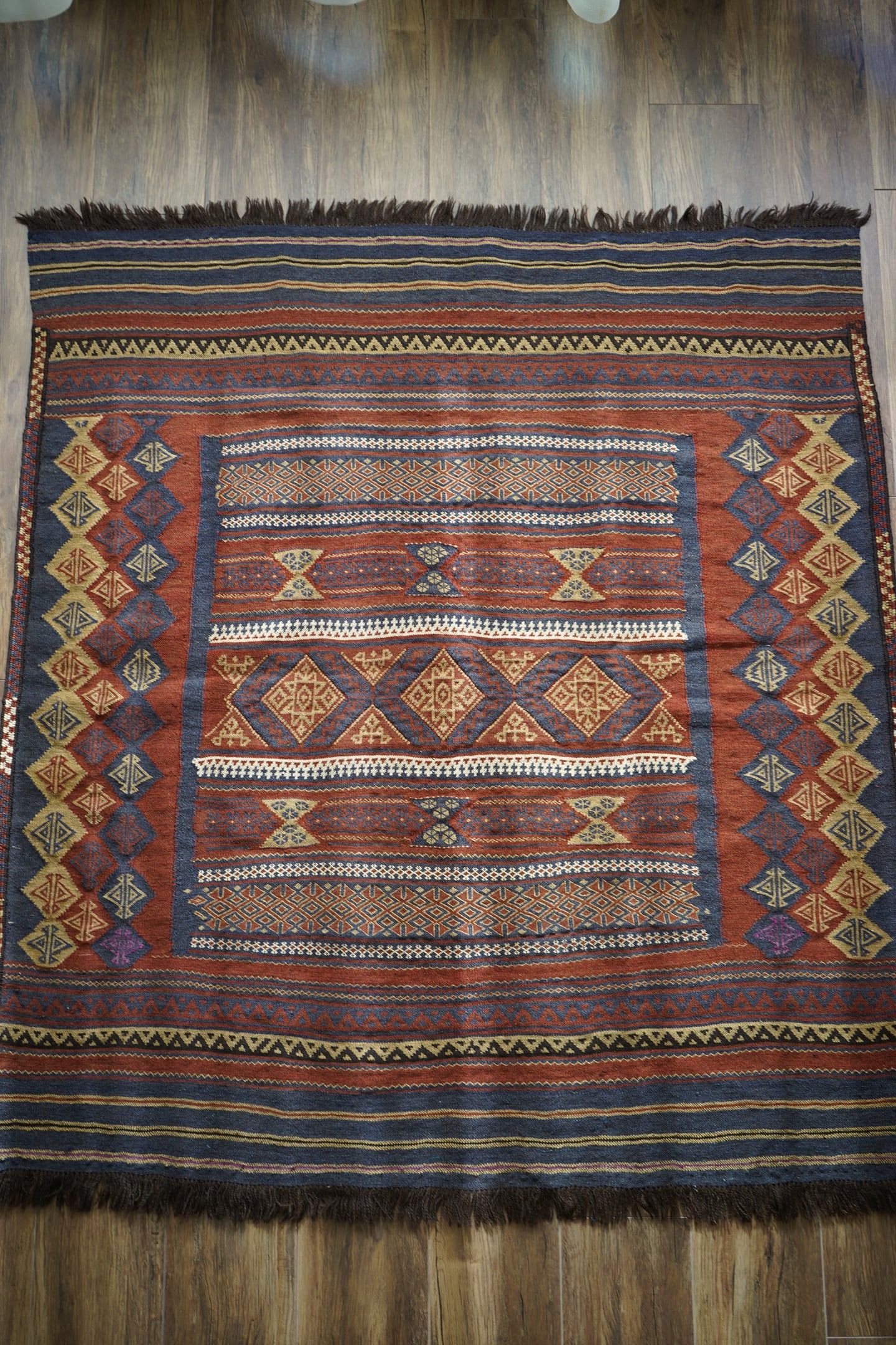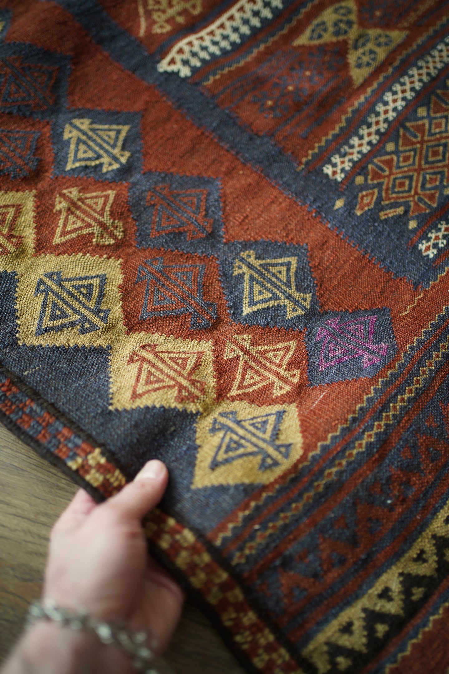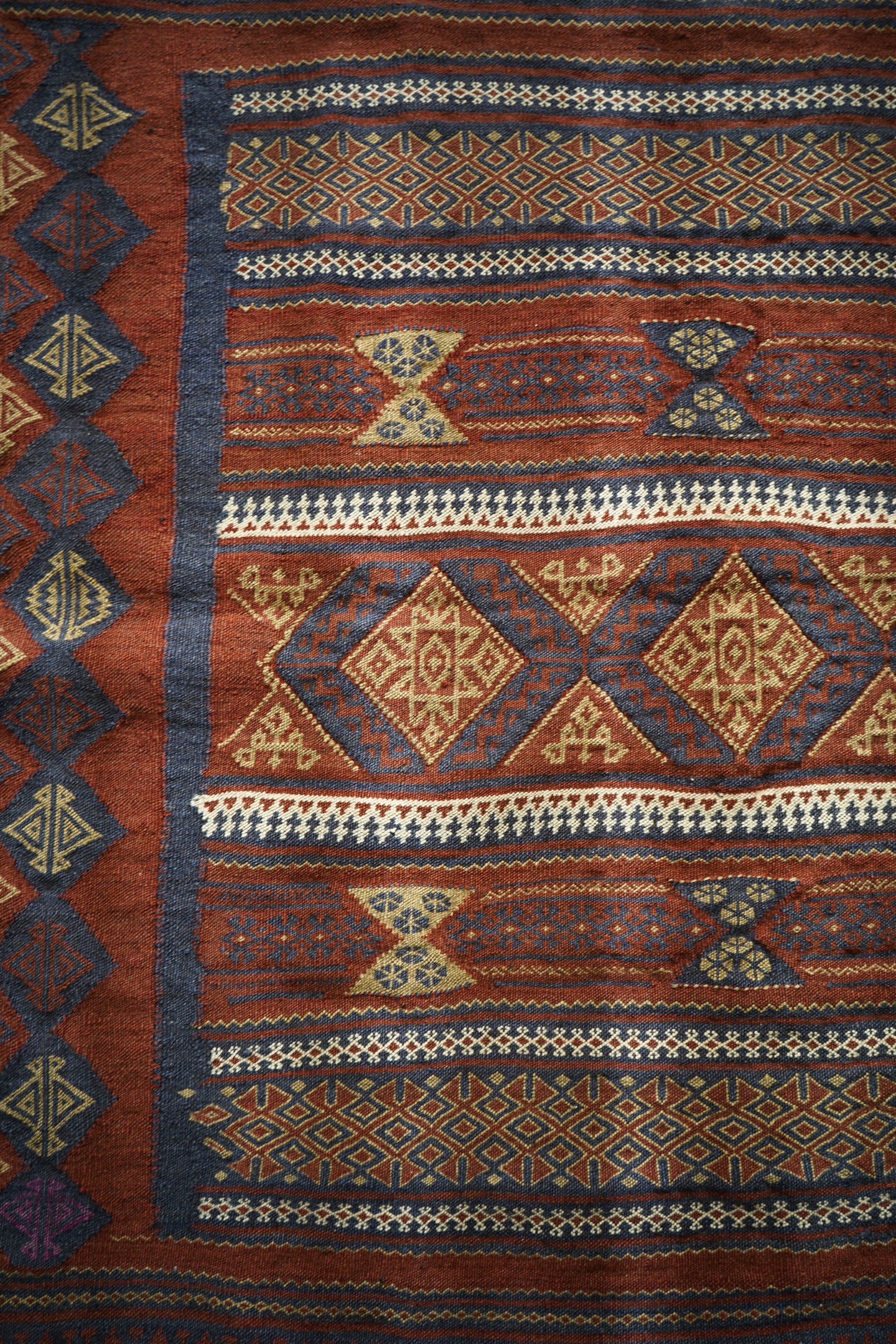 約50年前にアフガニスタンのバルーチ族によって織られたキリムです。"ソフレ"と呼ばれる食卓布で、食事の敷物やテーブルクロスとして使用され、通常は食事の際にお皿を置くために地面に広げられて使われます。細部にかけてこだわりが感じられるデザインで、紋様の配置や色遣いなどセンス抜群の一枚です。配色は暗めのえんじ色、グレーとネイビーの中間色、オフホワイト、薄いブラウンなど。一部だけ紫色が使われている部分も非常にユニークです。表面はサラッとサッパリとしたキリム特有の質感で、3mm〜4mm程度の厚みです。ダメージなどもなく大変良好なコンディション。ダイニングテーブル下やデスクマットとしてなどお好きな使い方で楽しんでください♪