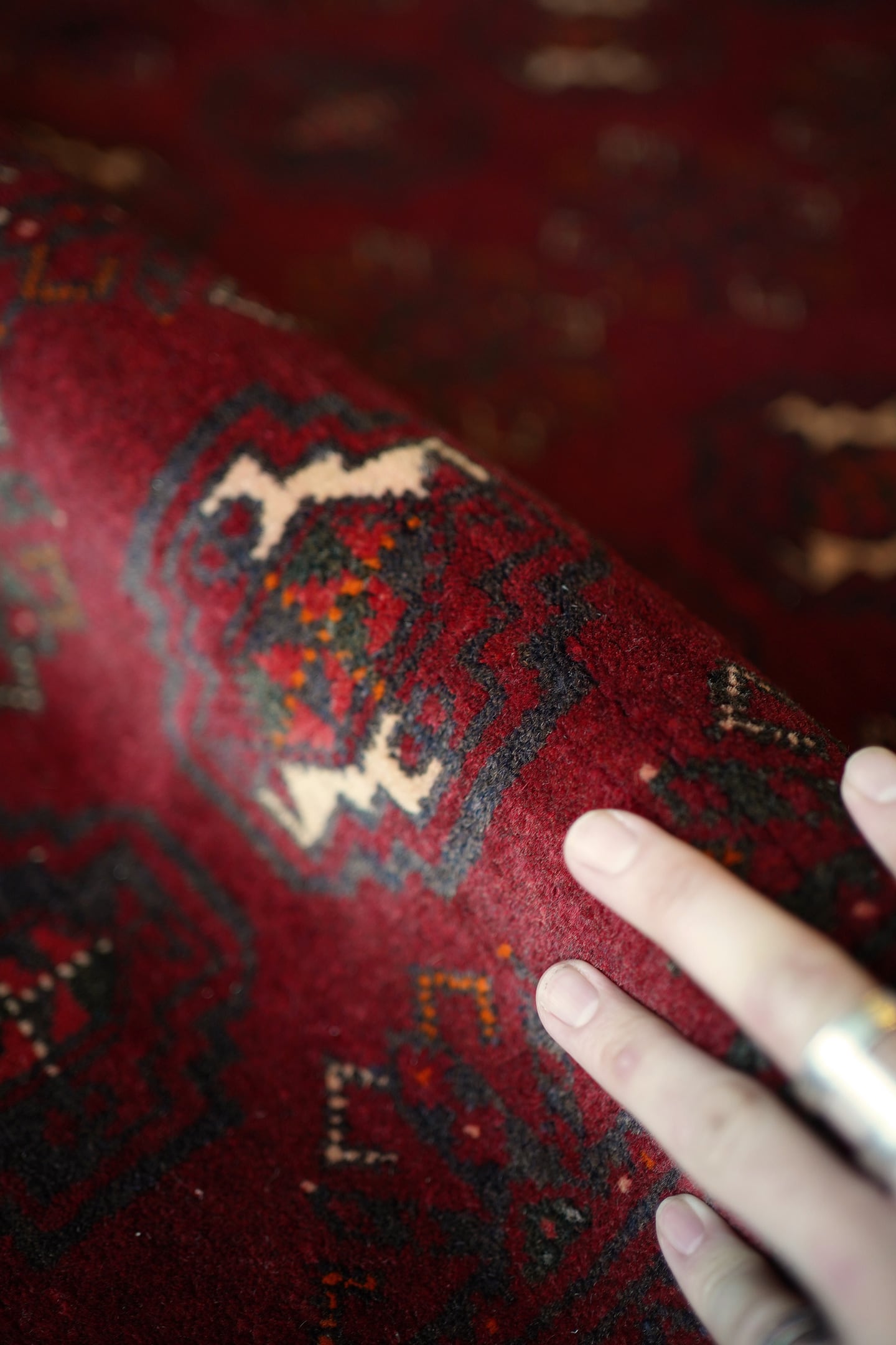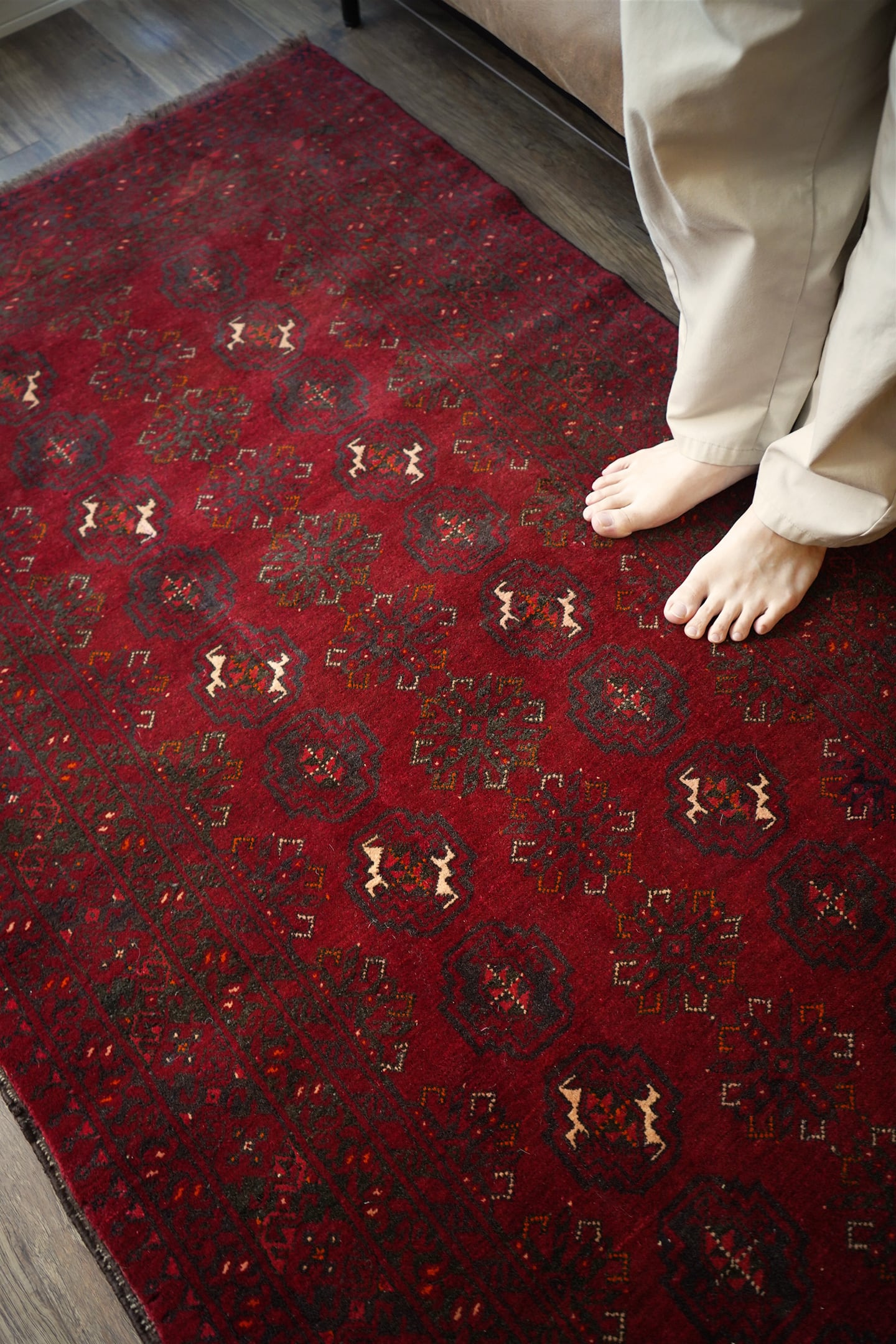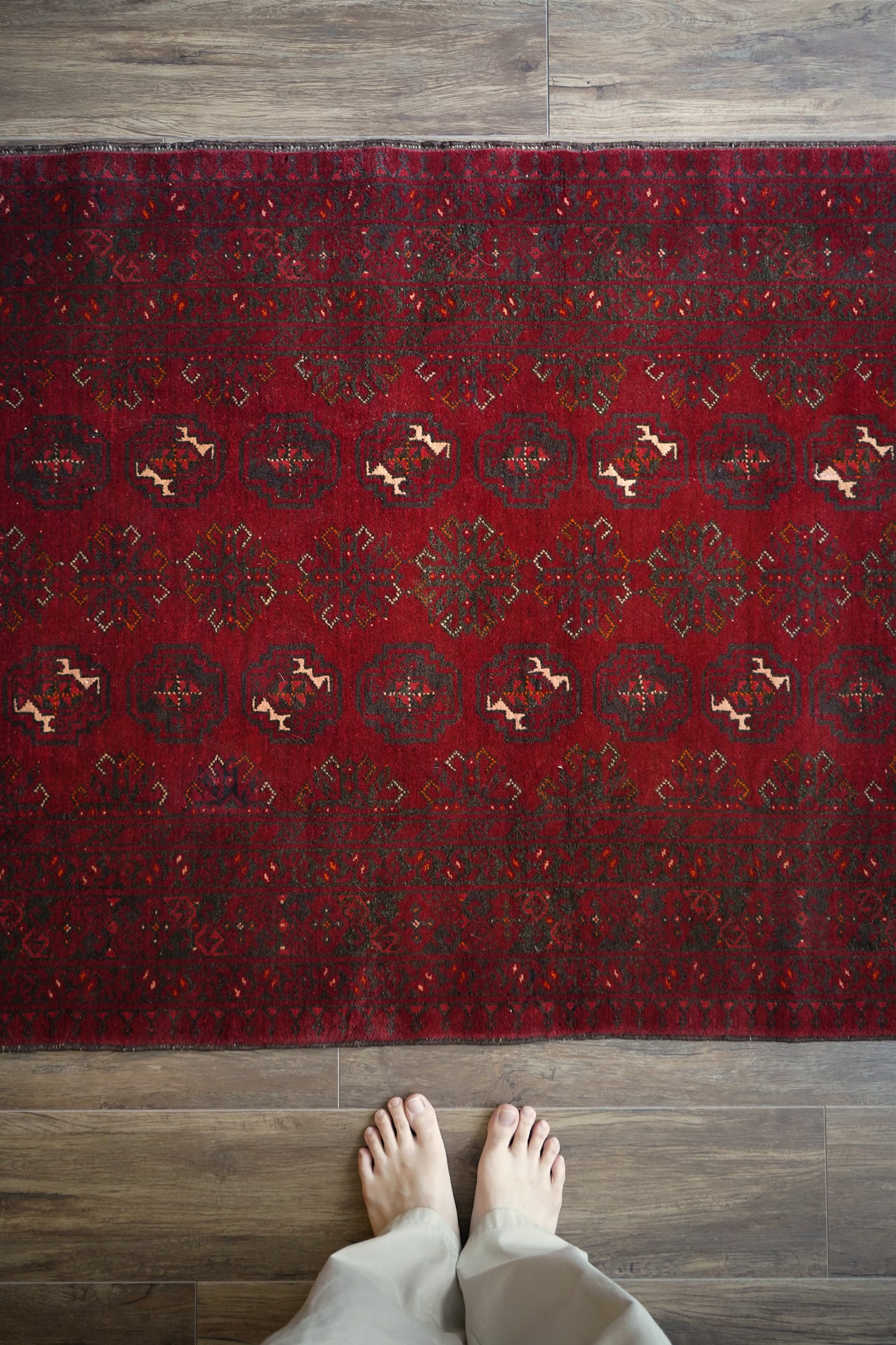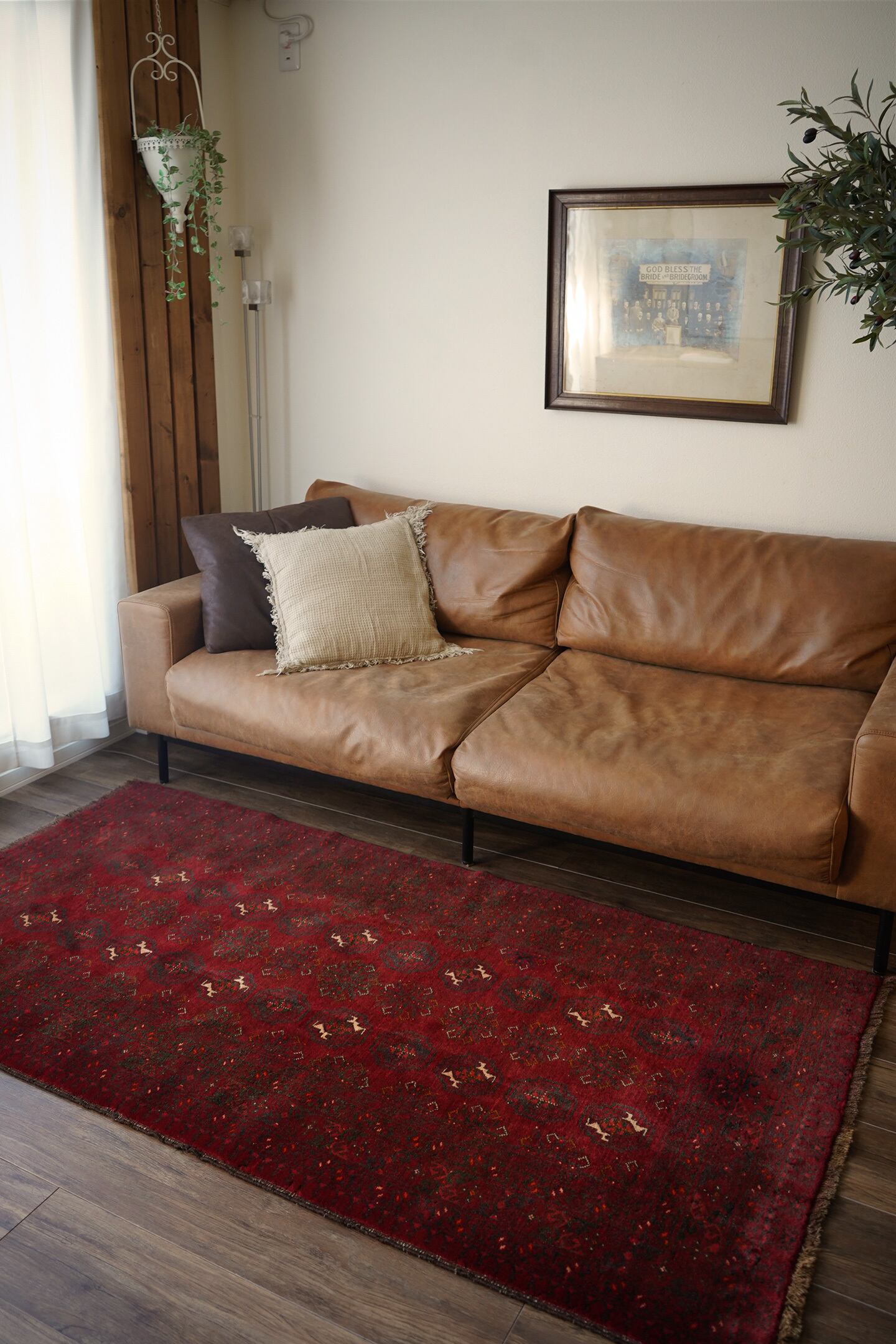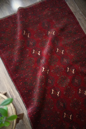 重厚感あふれる深みのある赤色が美しいトルクメンラグ。大きなラグにはあまり使われないチュワルギュルが織り込まれており、紋様の色合いが薄い黒なので、薄らと控えめに見えるタイプで、お部屋にも非常に合わせやすいかと思います。パイル全体に艶が広がっており、トルクメン特有の目の詰まったパイルの質感で、表面はしっとりふわっとした滑らかな肌触り。重みのある堅牢な作りで、厚みは9mmほど。一部少しだけパイルが薄くなっているところもありますが、全体的に大変良好なコンディションです。通年で気持ちよくお使いいただける一枚、ソファ前やベッドサイドなどにいかがでしょうか。