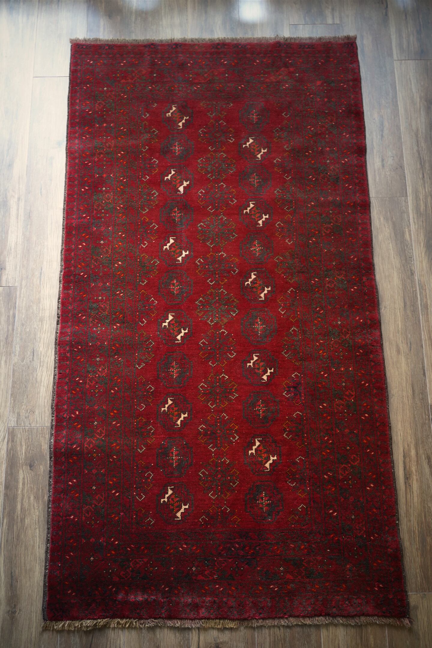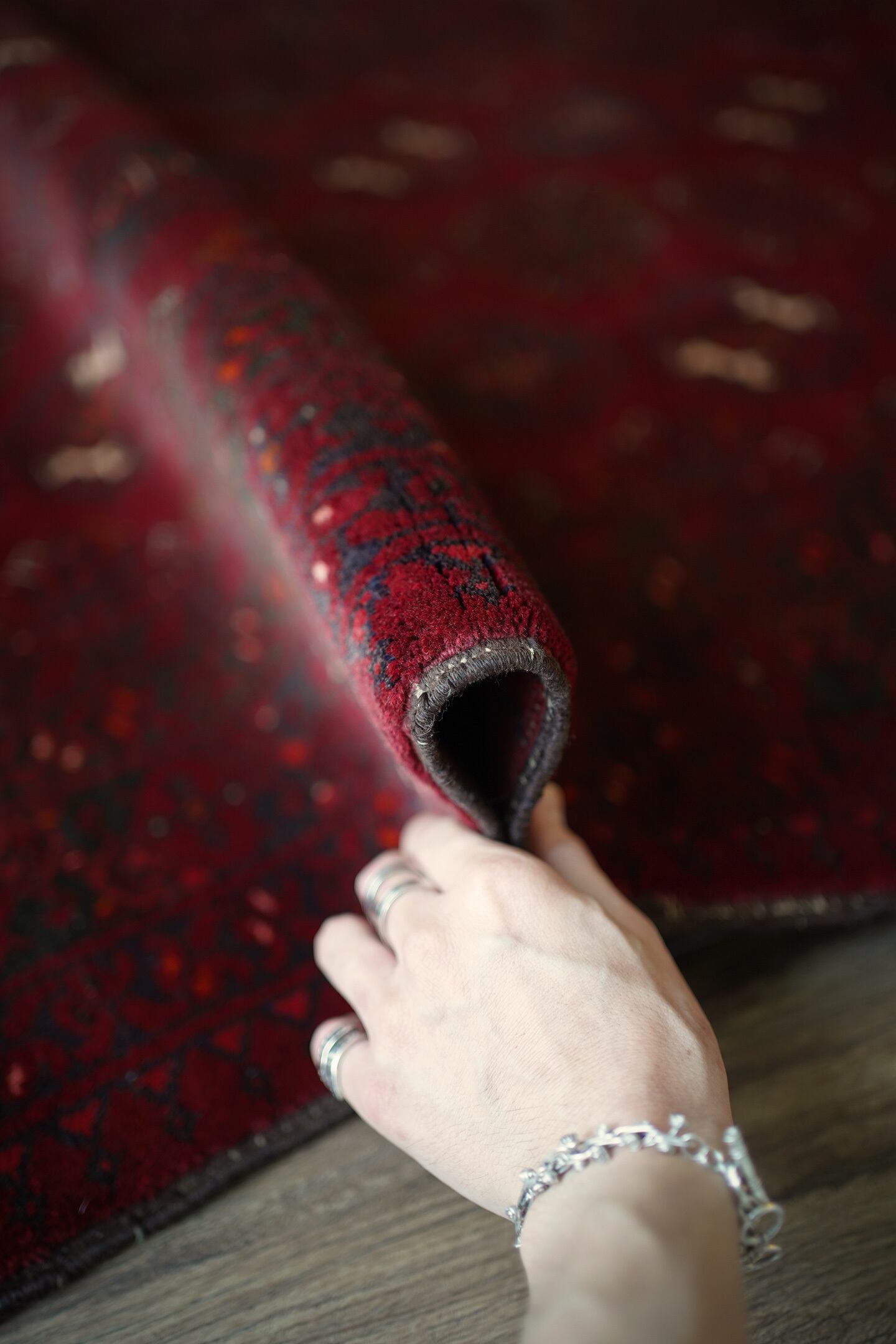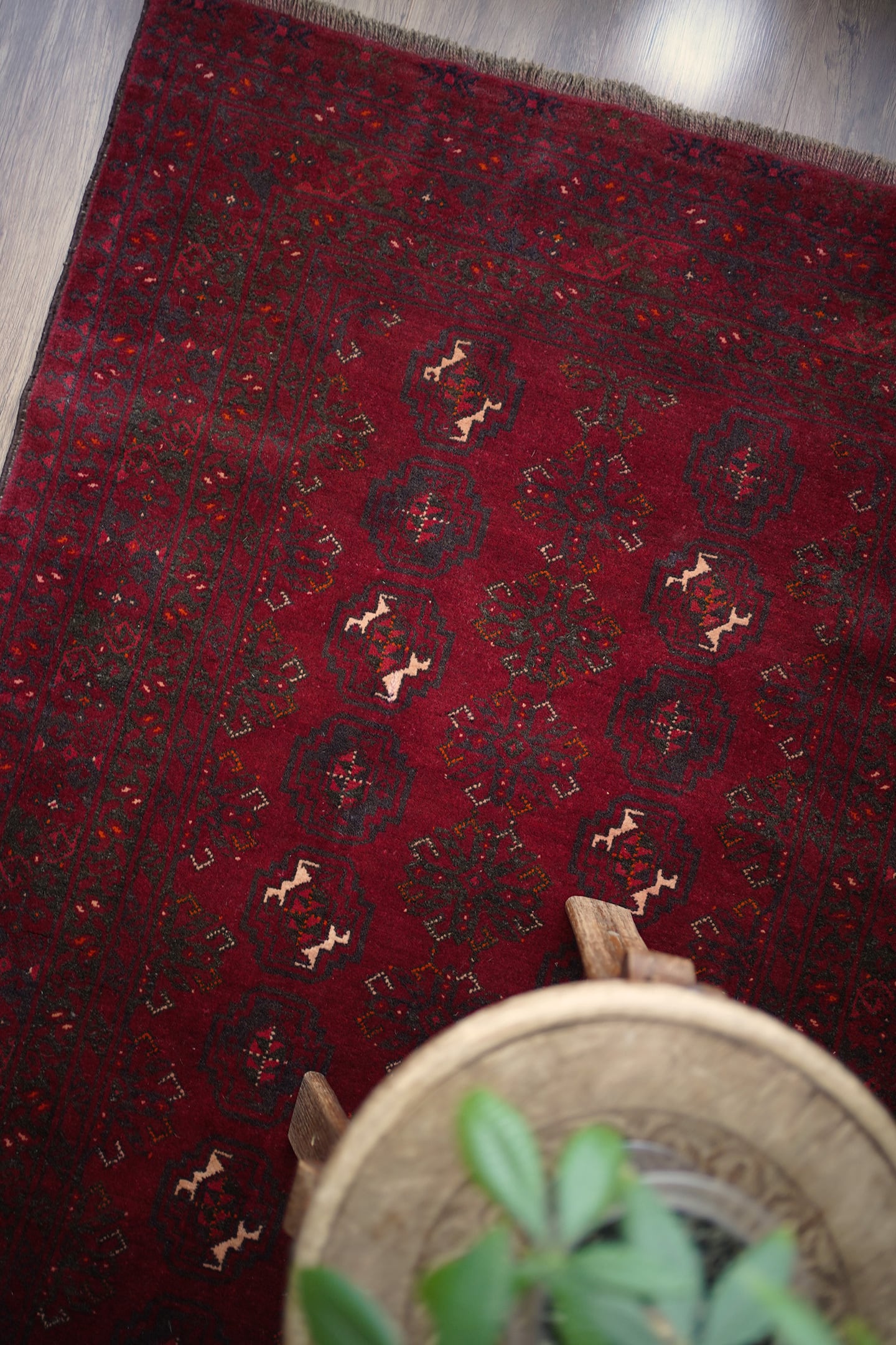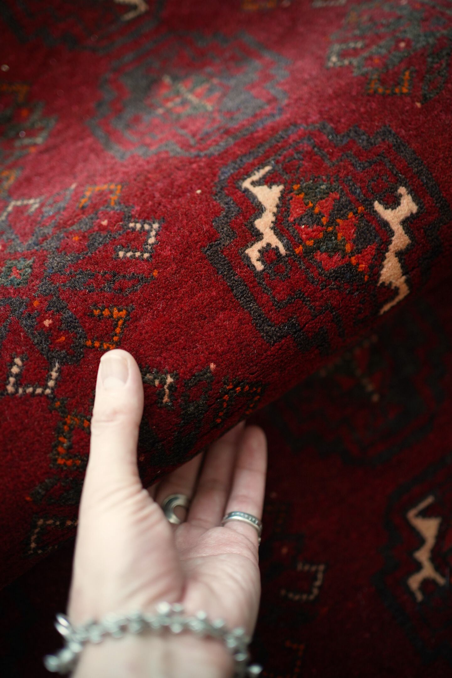 重厚感あふれる深みのある赤色が美しいトルクメンラグ。大きなラグにはあまり使われないチュワルギュルが織り込まれており、紋様の色合いが薄い黒なので、薄らと控えめに見えるタイプで、お部屋にも非常に合わせやすいかと思います。パイル全体に艶が広がっており、トルクメン特有の目の詰まったパイルの質感で、表面はしっとりふわっとした滑らかな肌触り。重みのある堅牢な作りで、厚みは9mmほど。一部少しだけパイルが薄くなっているところもありますが、全体的に大変良好なコンディションです。通年で気持ちよくお使いいただける一枚、ソファ前やベッドサイドなどにいかがでしょうか。