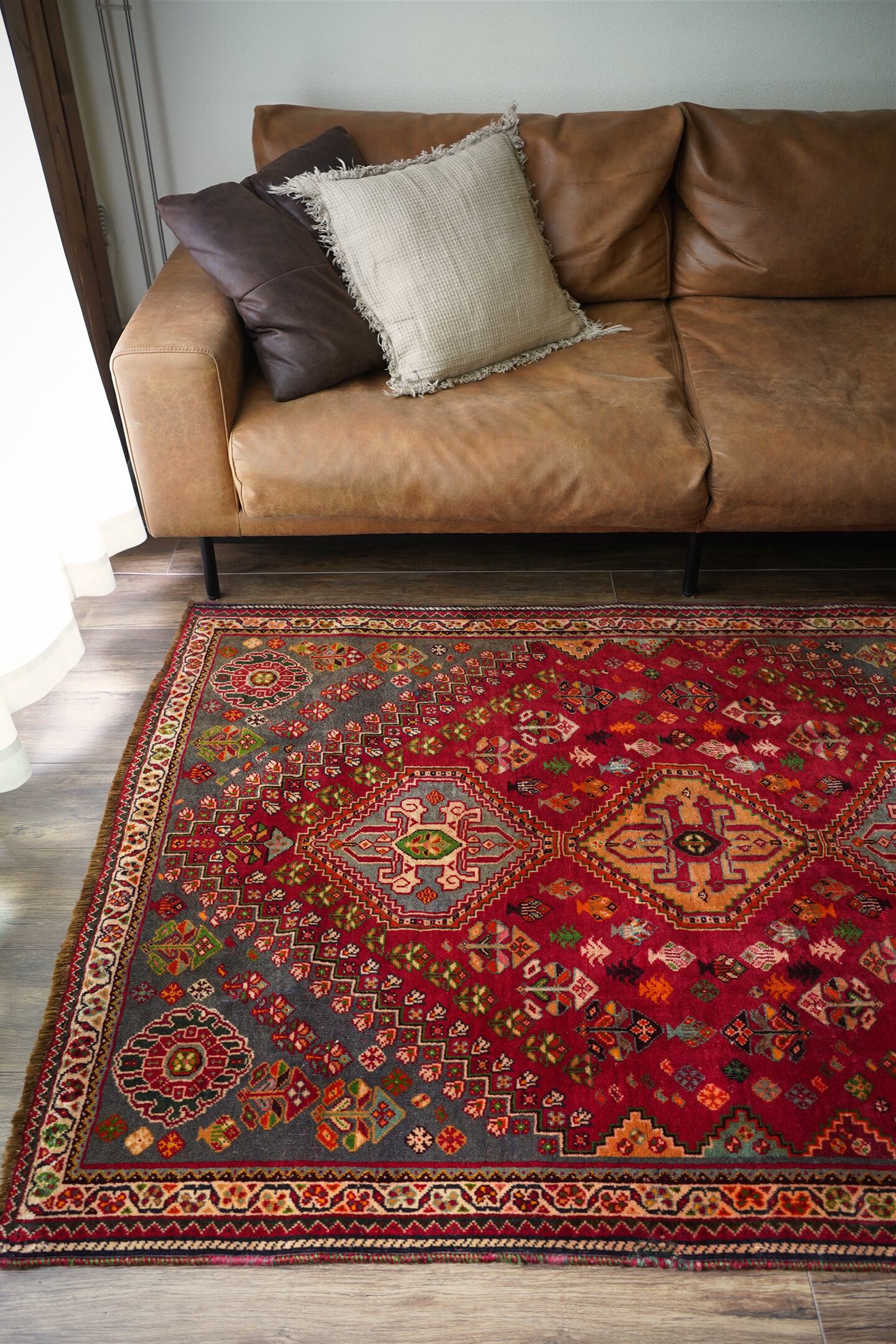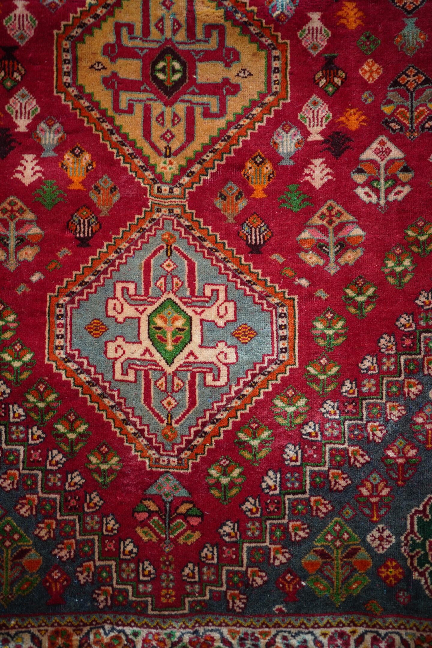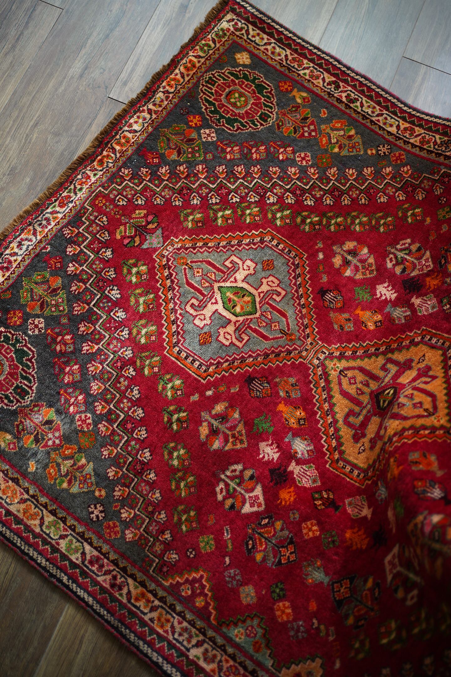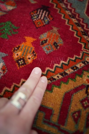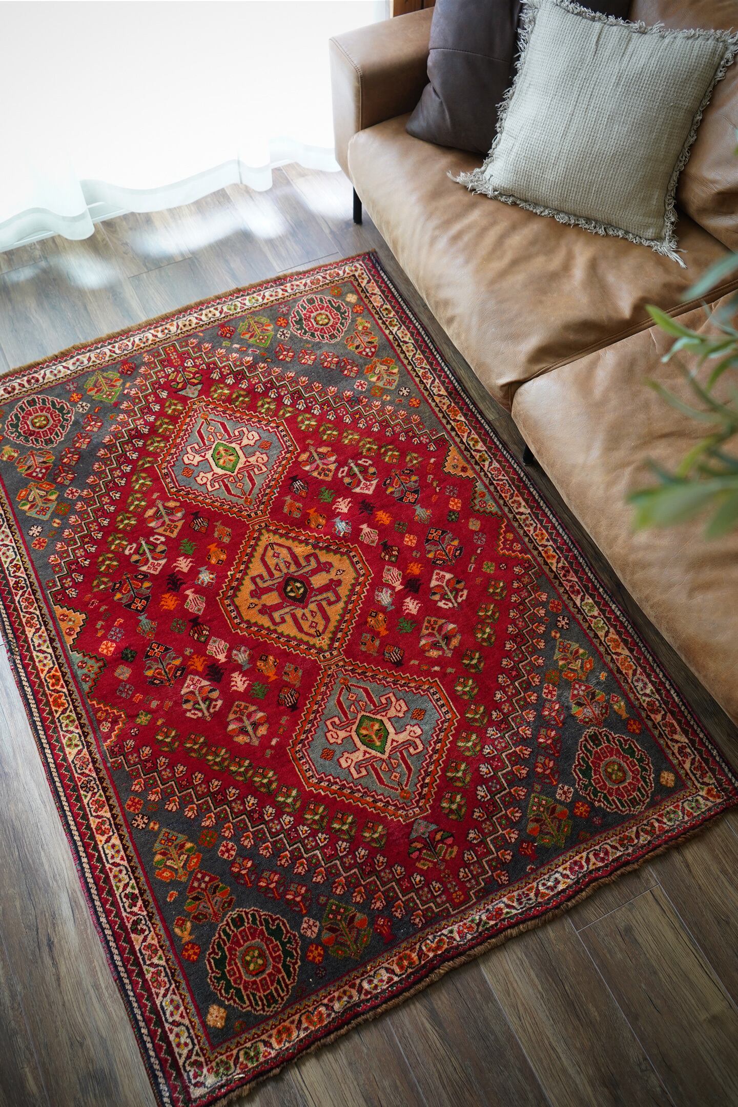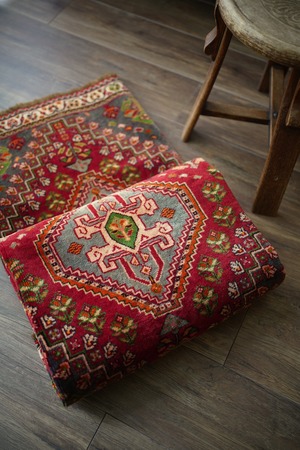 約50年前にイラン南西部に居住するカシュガイ族によって織られたヴィンテージラグです。深みのある濃い赤のフィールドには三連メダリオンと大小の花紋様がバランスよく散りばめられています。小さな紋様に使われたカラフルな色遣いがとても素敵で目を惹きます。全体的に見ると落ち着いた渋い色合いですので、お部屋にも合わせやすい一枚かと思います。表面はソフトウールでふわっと柔らかく気持ちの良い肌触り。厚みは8mm〜9mmほど。いくつかパイルが薄くなっている箇所がある点、また補修された跡がございますが綺麗に修理されているので、よく見ないとわからない程度かと思います(お写真最後の3枚をご確認ください)。カッコいい雰囲気のカシュガイラグをお探しの方に。