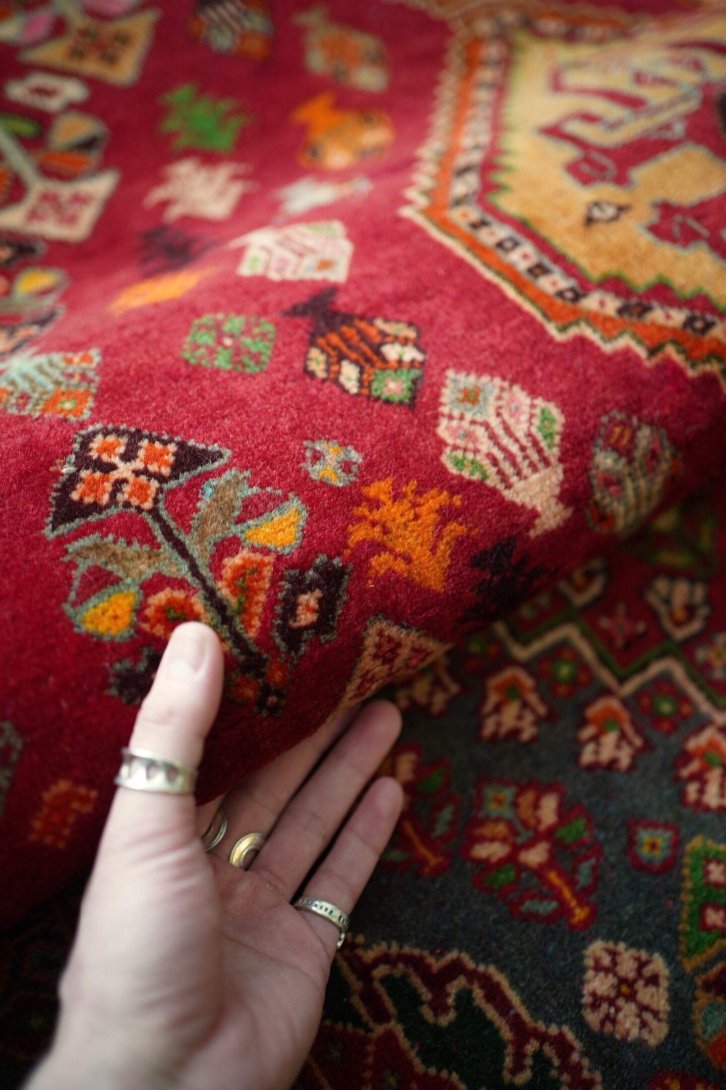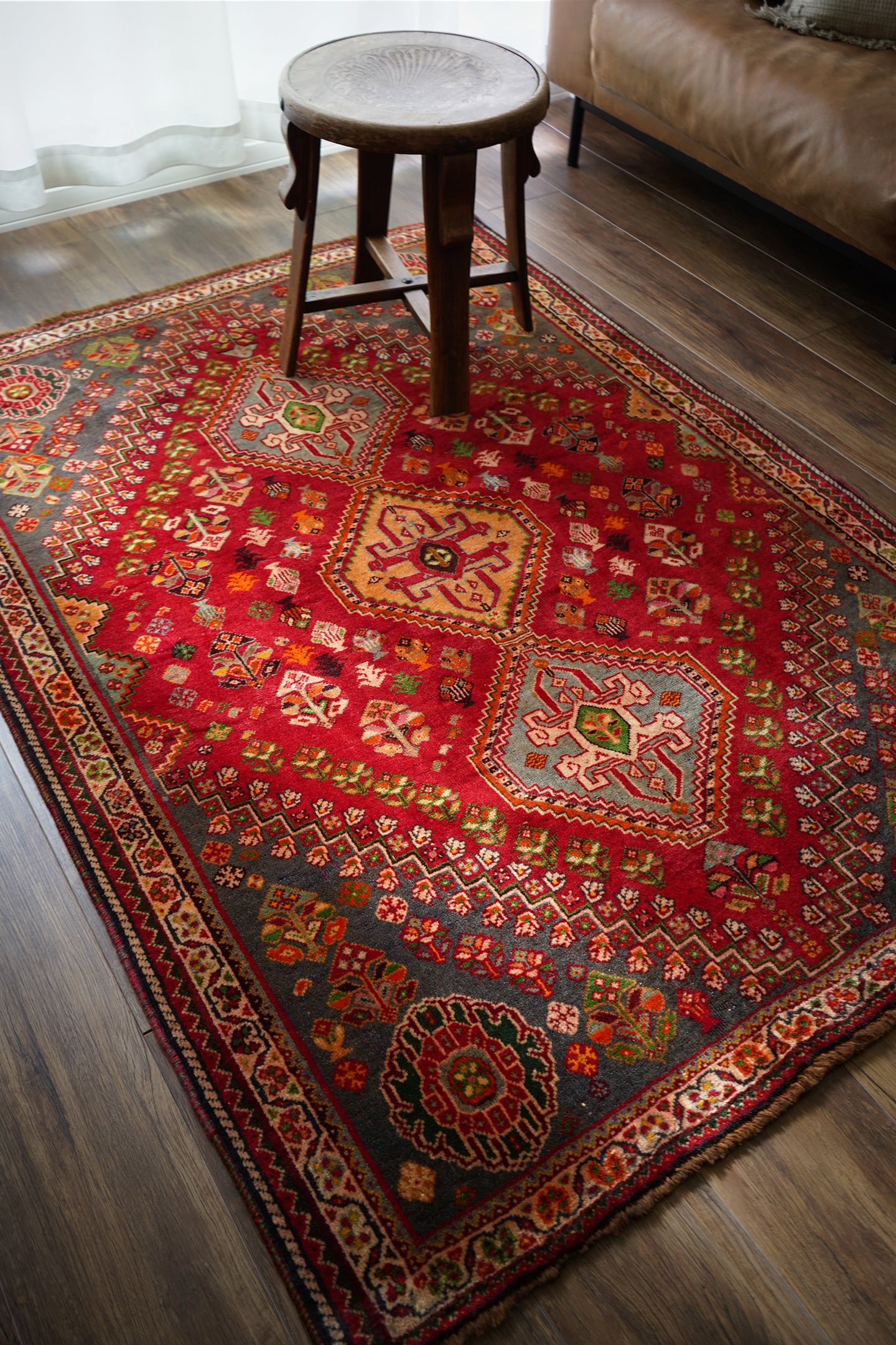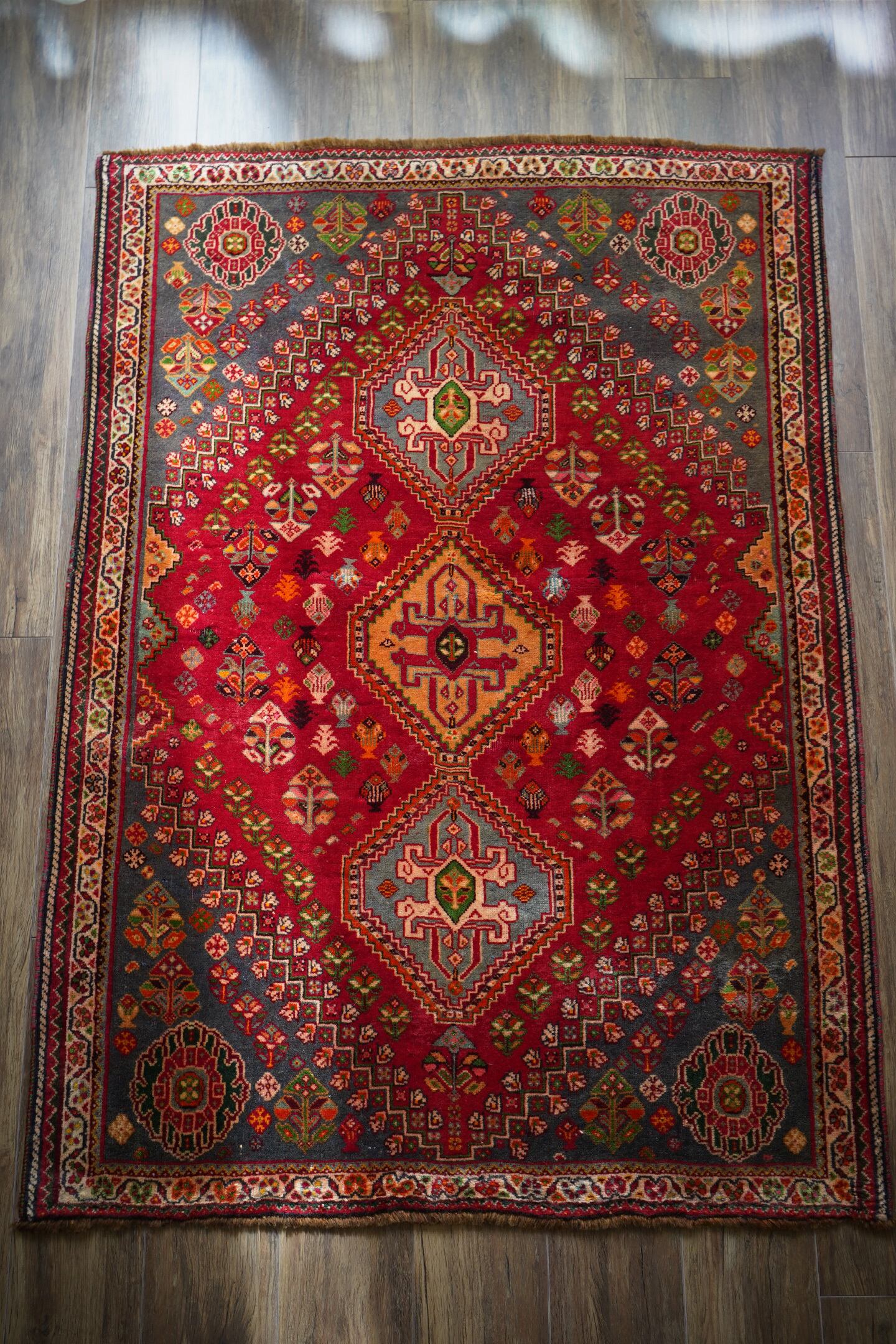 約50年前にイラン南西部に居住するカシュガイ族によって織られたヴィンテージラグです。深みのある濃い赤のフィールドには三連メダリオンと大小の花紋様がバランスよく散りばめられています。小さな紋様に使われたカラフルな色遣いがとても素敵で目を惹きます。全体的に見ると落ち着いた渋い色合いですので、お部屋にも合わせやすい一枚かと思います。表面はソフトウールでふわっと柔らかく気持ちの良い肌触り。厚みは8mm〜9mmほど。いくつかパイルが薄くなっている箇所がある点、また補修された跡がございますが綺麗に修理されているので、よく見ないとわからない程度かと思います(お写真最後の3枚をご確認ください)。カッコいい雰囲気のカシュガイラグをお探しの方に。