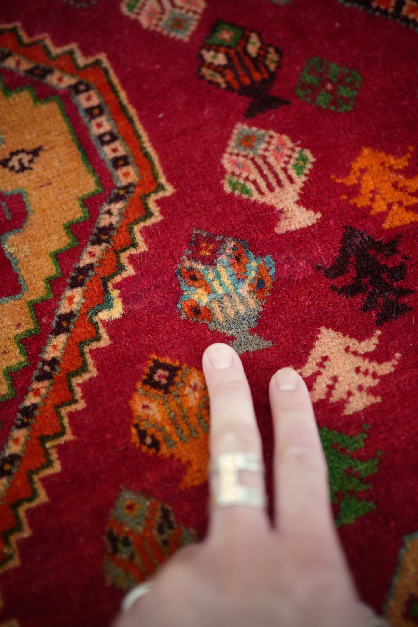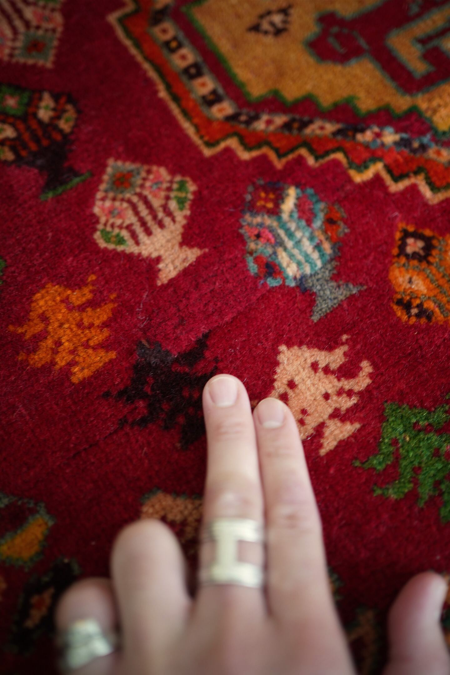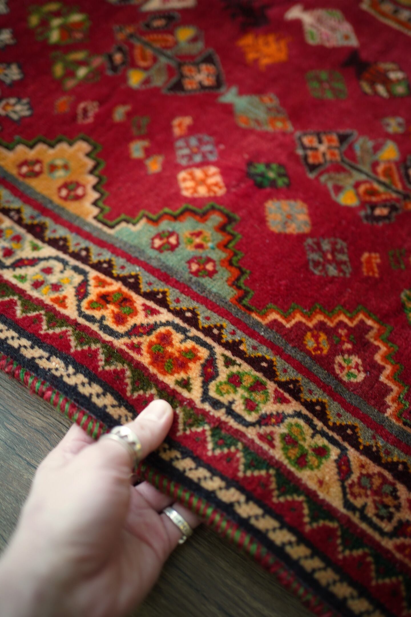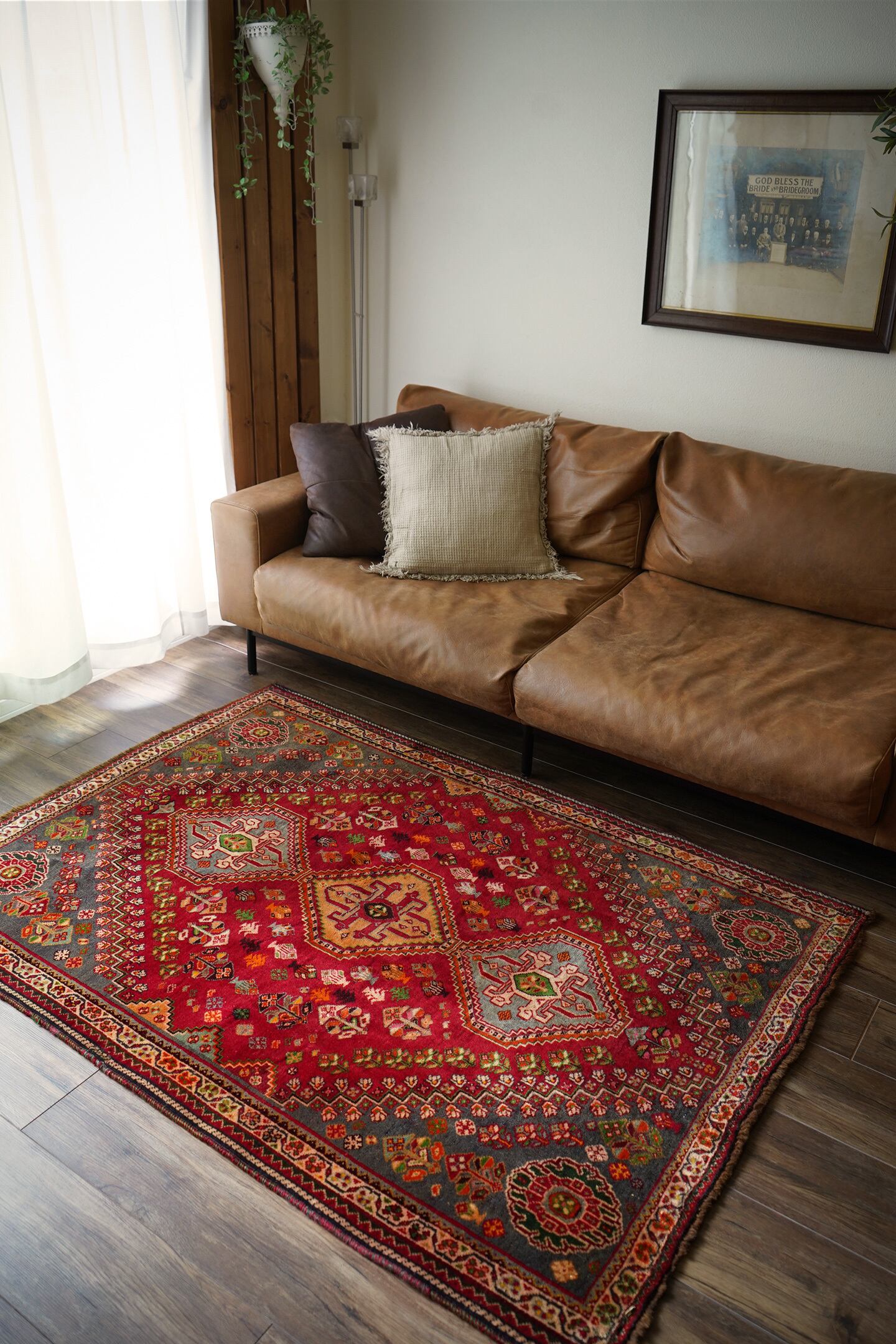 約50年前にイラン南西部に居住するカシュガイ族によって織られたヴィンテージラグです。深みのある濃い赤のフィールドには三連メダリオンと大小の花紋様がバランスよく散りばめられています。小さな紋様に使われたカラフルな色遣いがとても素敵で目を惹きます。全体的に見ると落ち着いた渋い色合いですので、お部屋にも合わせやすい一枚かと思います。表面はソフトウールでふわっと柔らかく気持ちの良い肌触り。厚みは8mm〜9mmほど。いくつかパイルが薄くなっている箇所がある点、また補修された跡がございますが綺麗に修理されているので、よく見ないとわからない程度かと思います(お写真最後の3枚をご確認ください)。カッコいい雰囲気のカシュガイラグをお探しの方に。