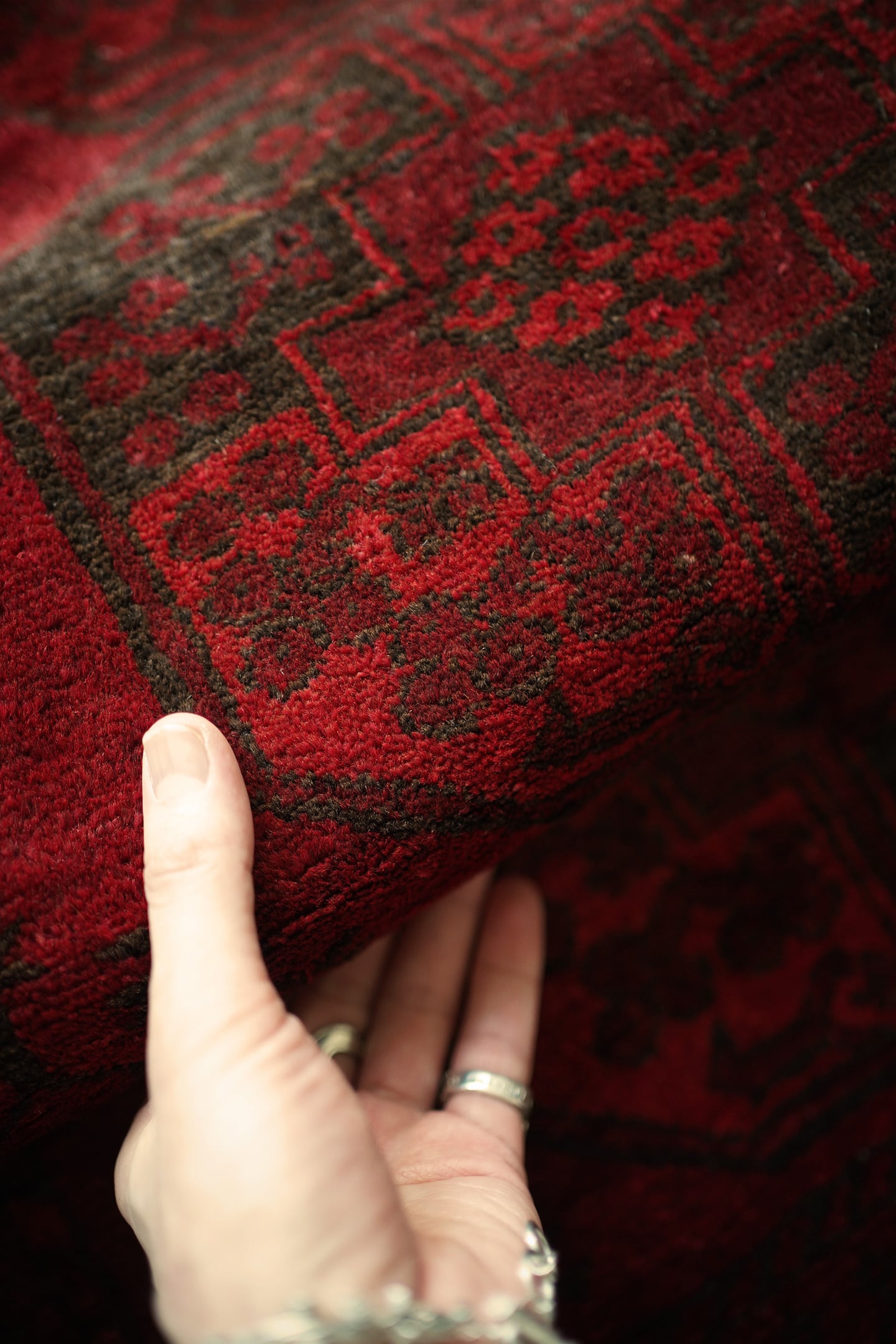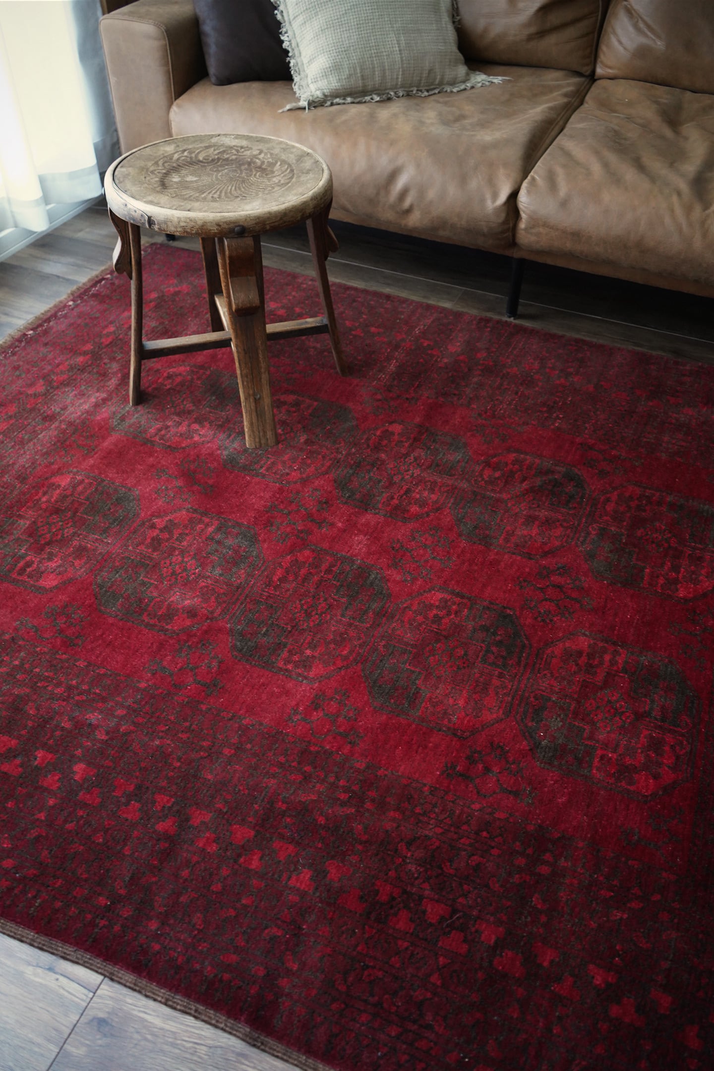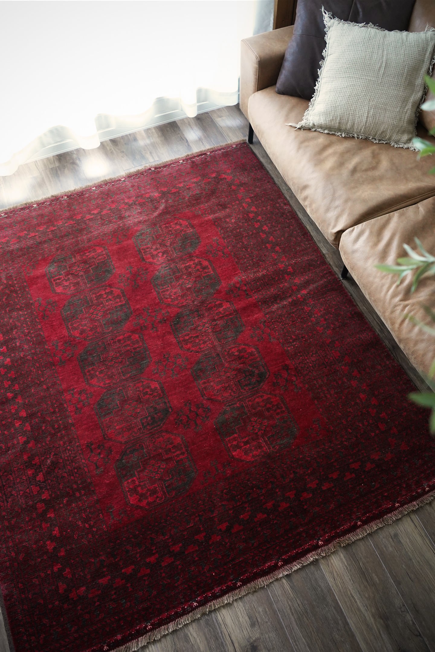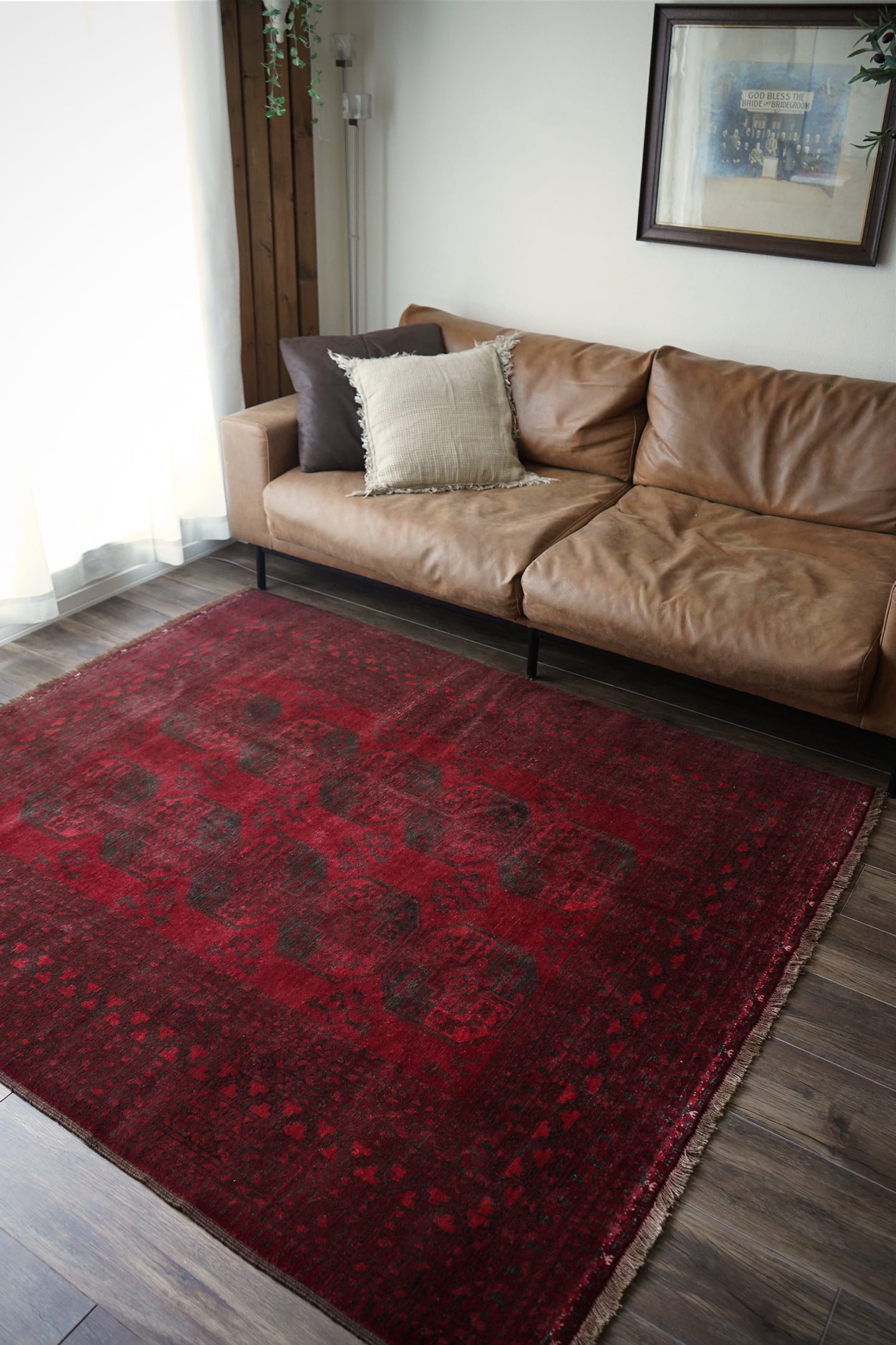 重厚感あふれる深みのある赤色とパイル全体に広がる光沢感のある艶が美しいトルクメンラグ。四方の三つ葉のクローバーのようなデザインは"エルサリ"と呼ばれる部族の家紋由来の紋様で、大きなギュルが特徴的でフィルパイとも呼ばれています。紋様の色合いが薄い黒なので、薄らと控えめに見えるタイプで、お部屋にも非常に合わせやすいかと思います。ソフトウールで表面はふわっとしっとり、滑らかな気持ちの良い肌触り。トルクメン特有の重みのある堅牢な作りで、目の詰まったパイルの質感です。厚みは8mm〜9mm程度。ダメージや補修跡もなく、パーフェクトなコンディションです。パイルの肌触り・艶の光沢感・コンディション、素晴らしい三拍子が揃った非常に高品質な一枚。正方形に近いサイズ感でリビングのソファ前はもちろん、ダイニングテーブル下などにもオススメです。