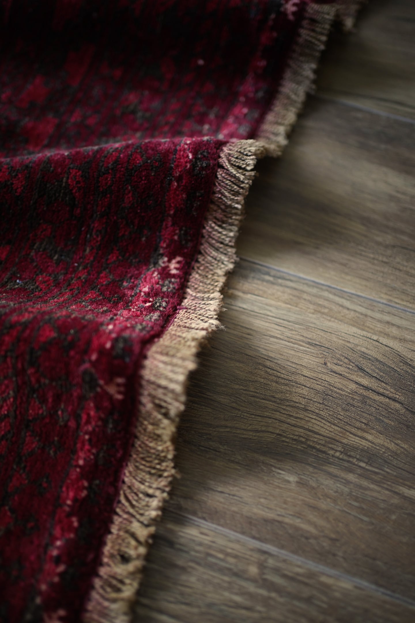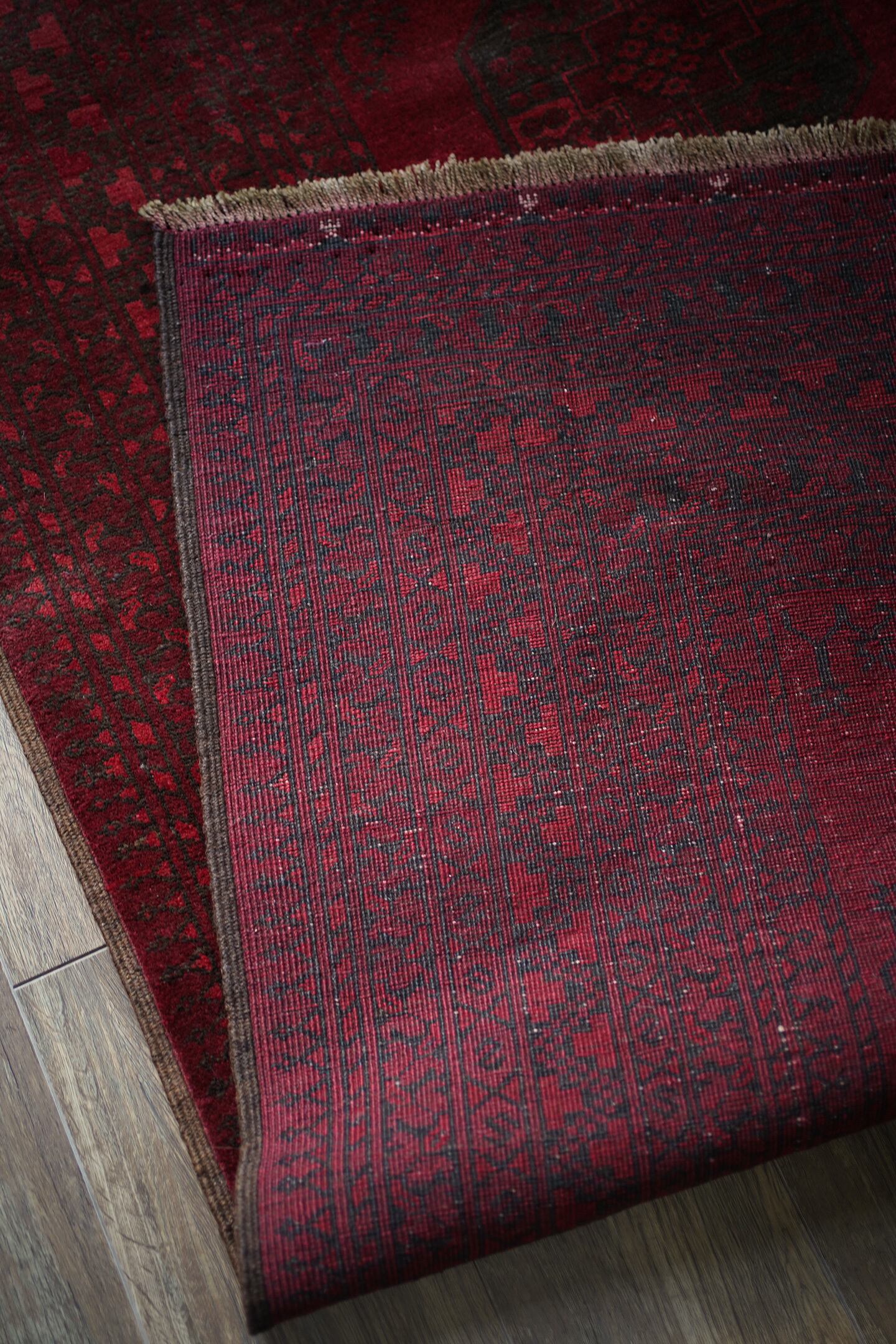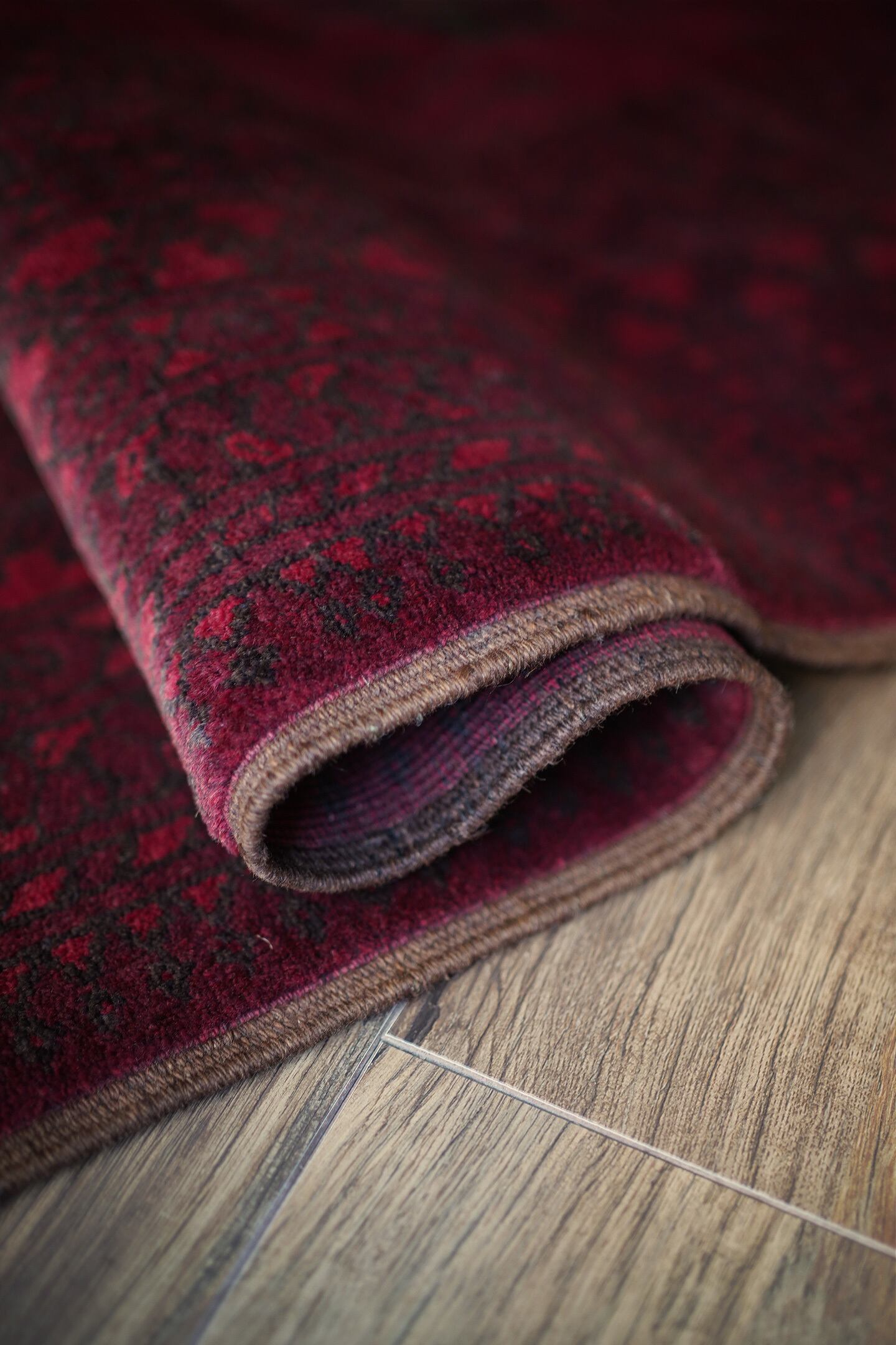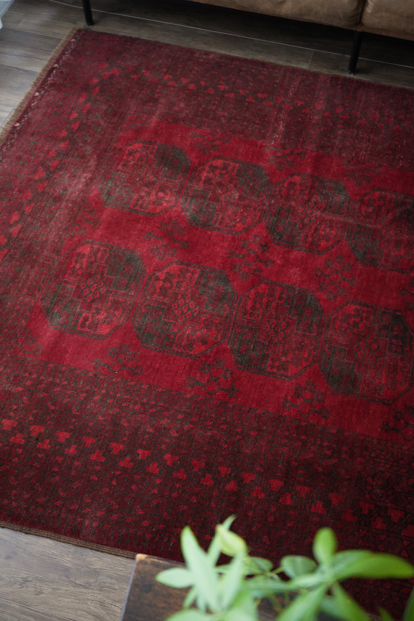 重厚感あふれる深みのある赤色とパイル全体に広がる光沢感のある艶が美しいトルクメンラグ。四方の三つ葉のクローバーのようなデザインは"エルサリ"と呼ばれる部族の家紋由来の紋様で、大きなギュルが特徴的でフィルパイとも呼ばれています。紋様の色合いが薄い黒なので、薄らと控えめに見えるタイプで、お部屋にも非常に合わせやすいかと思います。ソフトウールで表面はふわっとしっとり、滑らかな気持ちの良い肌触り。トルクメン特有の重みのある堅牢な作りで、目の詰まったパイルの質感です。厚みは8mm〜9mm程度。ダメージや補修跡もなく、パーフェクトなコンディションです。パイルの肌触り・艶の光沢感・コンディション、素晴らしい三拍子が揃った非常に高品質な一枚。正方形に近いサイズ感でリビングのソファ前はもちろん、ダイニングテーブル下などにもオススメです。