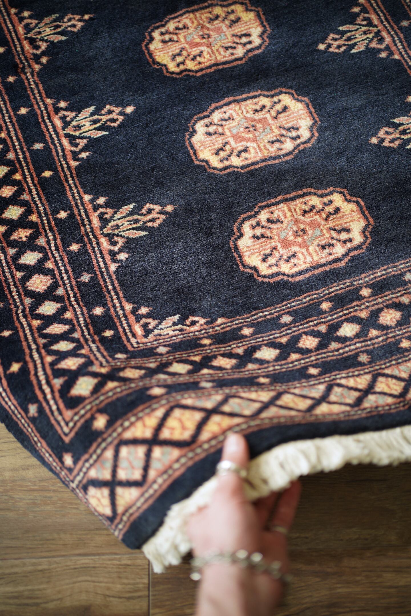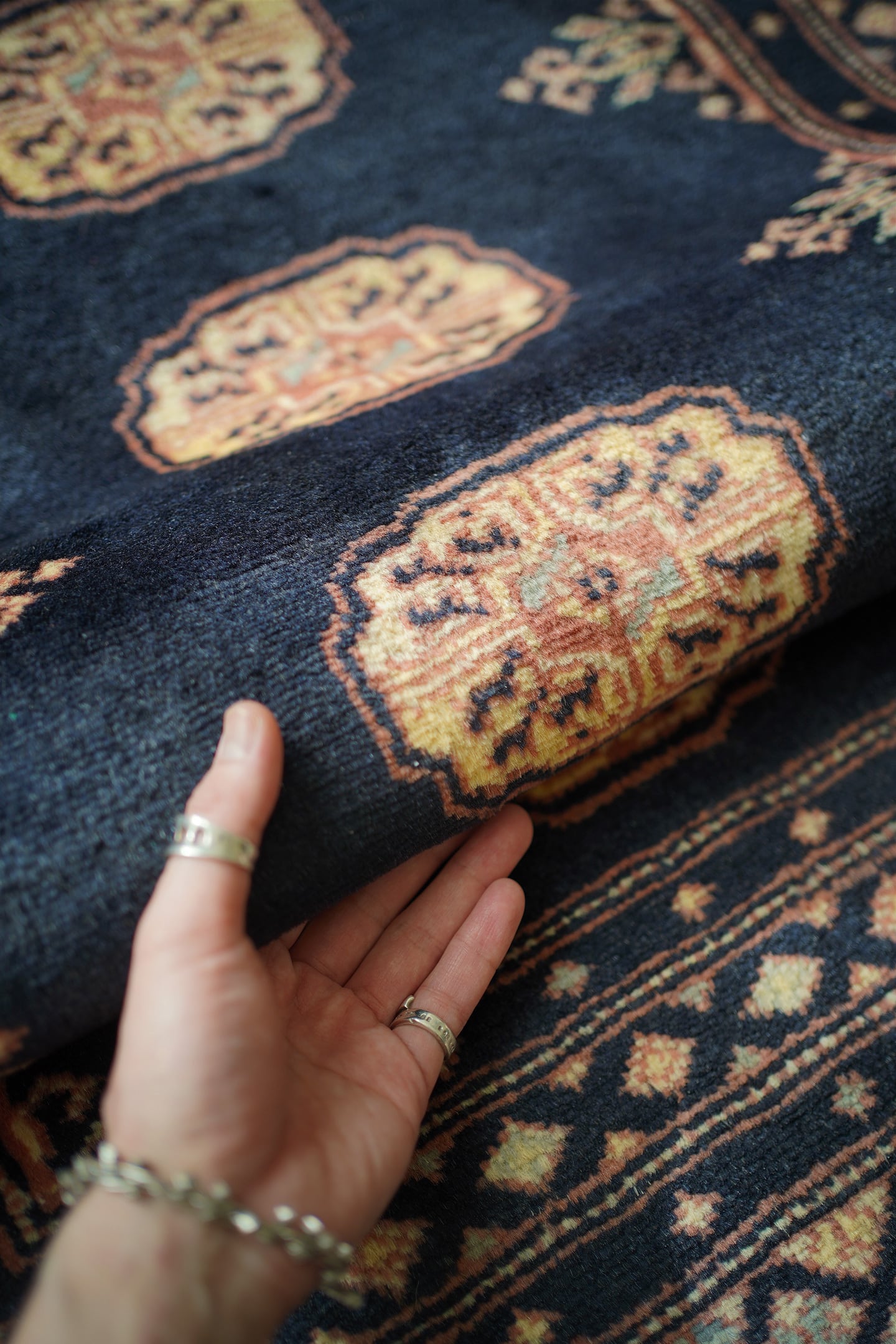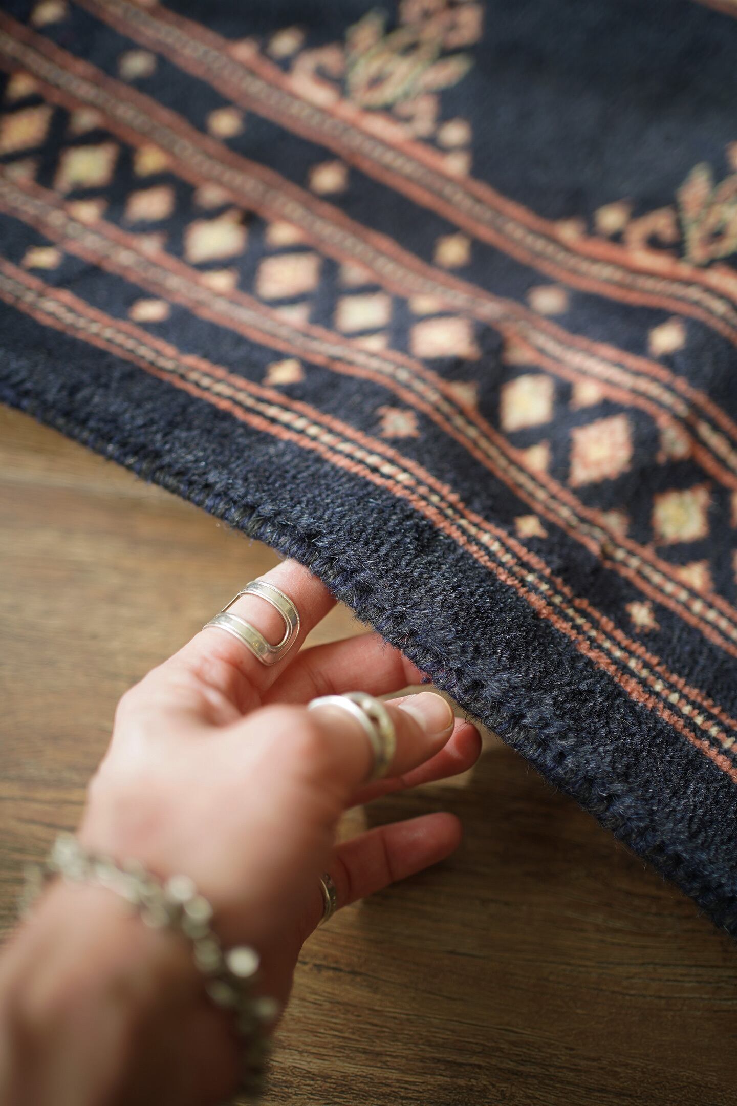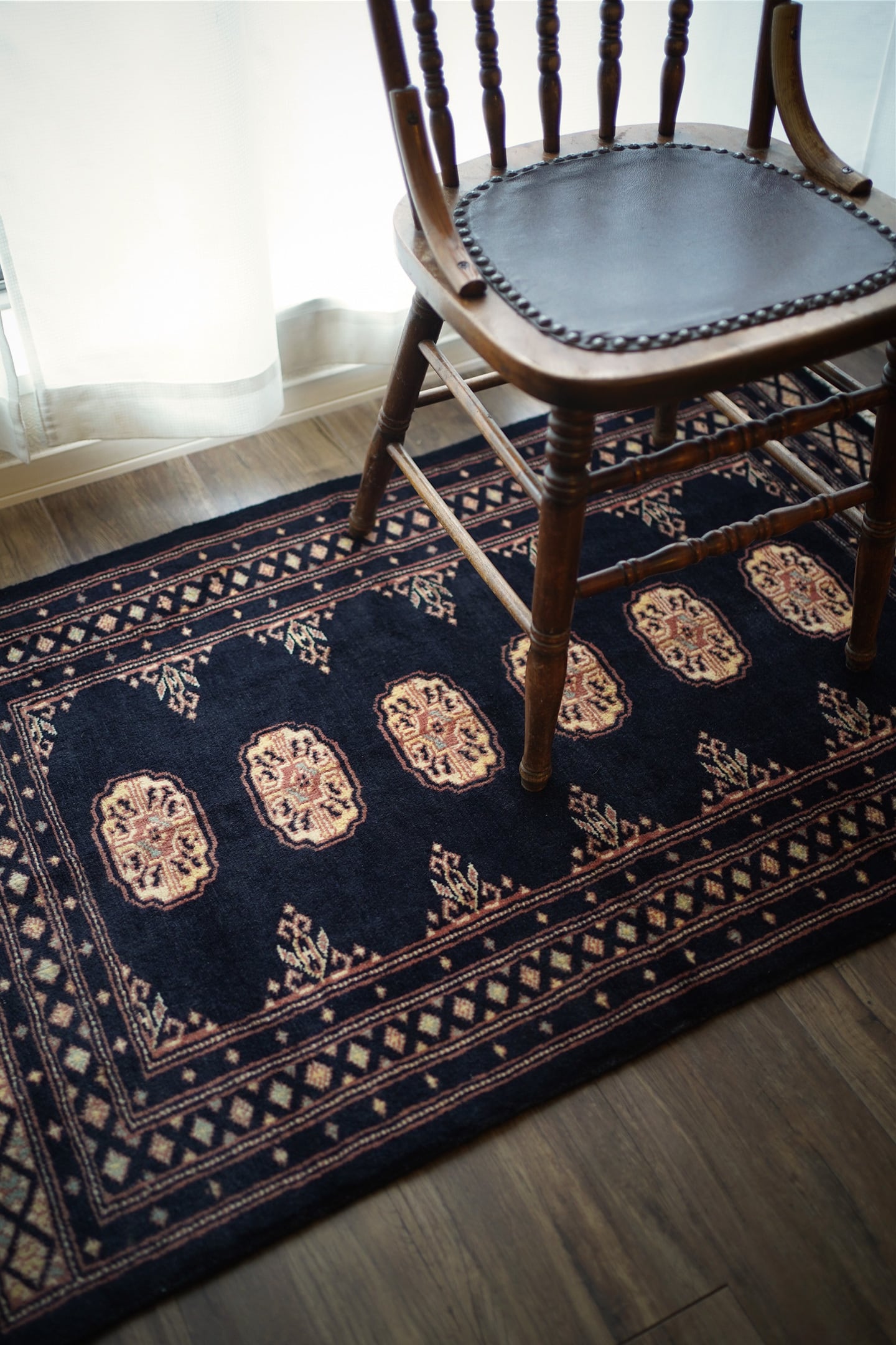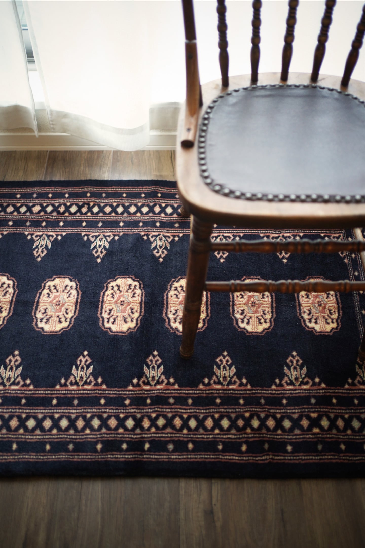 パキスタン北東部の都市ラホールで織られたヴィンテージラグ。"ボハラ"と呼ばれる象の足跡をモデルにしたとされる紋様が織り込まれたデザインで、パキスタンラグ特有の光沢感のある艶が美しい一枚。黒に近い濃紺をベースに、淡いピンク、アイボリーの色構成で、アクセントカラーに薄い水色が使われています。表面はふわふわとした気持ちの良い優しい肌触りで、厚みは9mm程度。ダメージなどもなく、パーフェクトなコンディションです。大きめのキャビネット前やブックシェルフ前、洗面スペースやウォークインクローゼットなどにどうぞ。