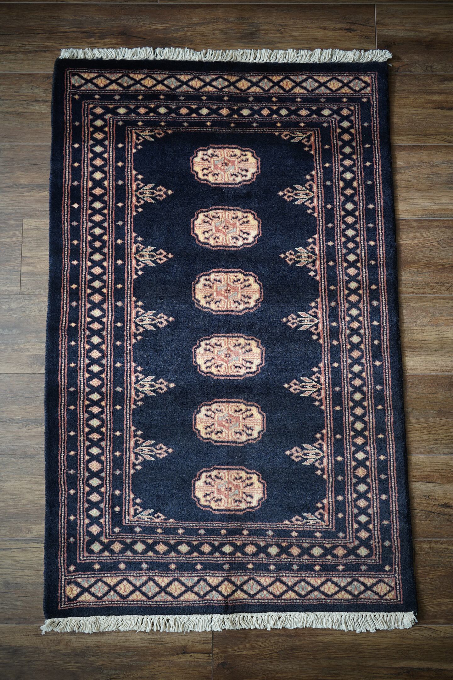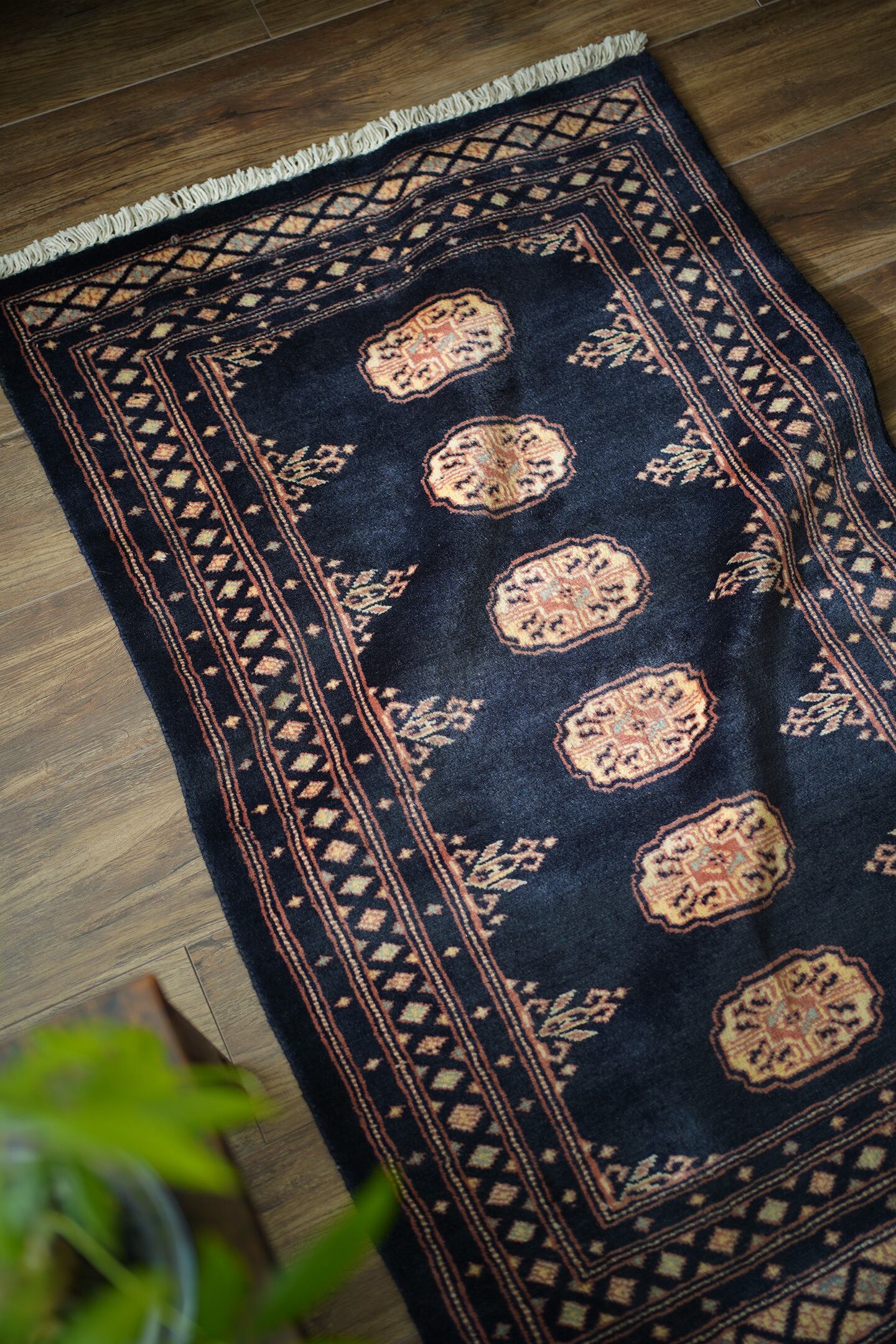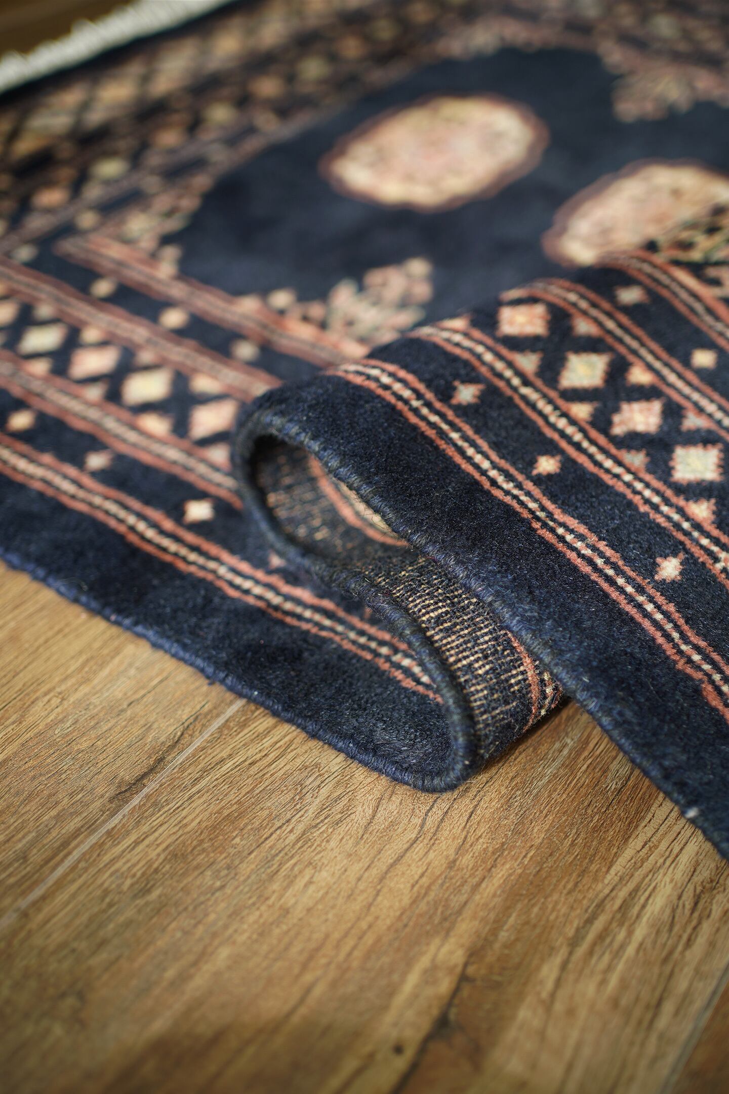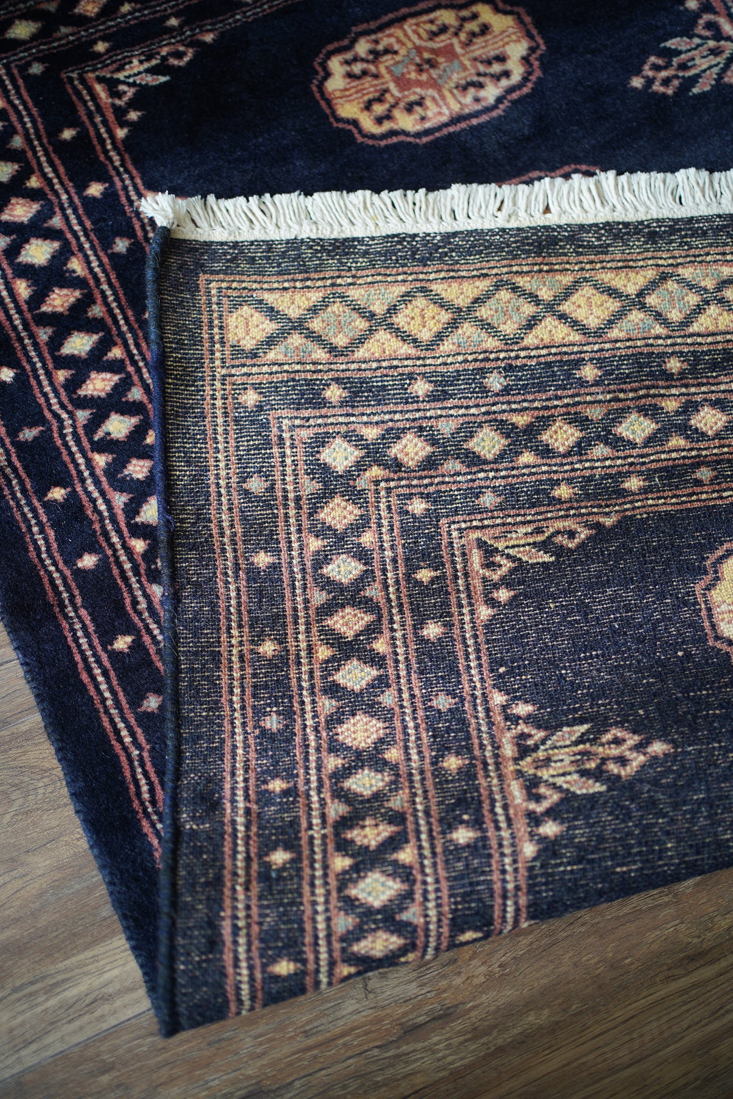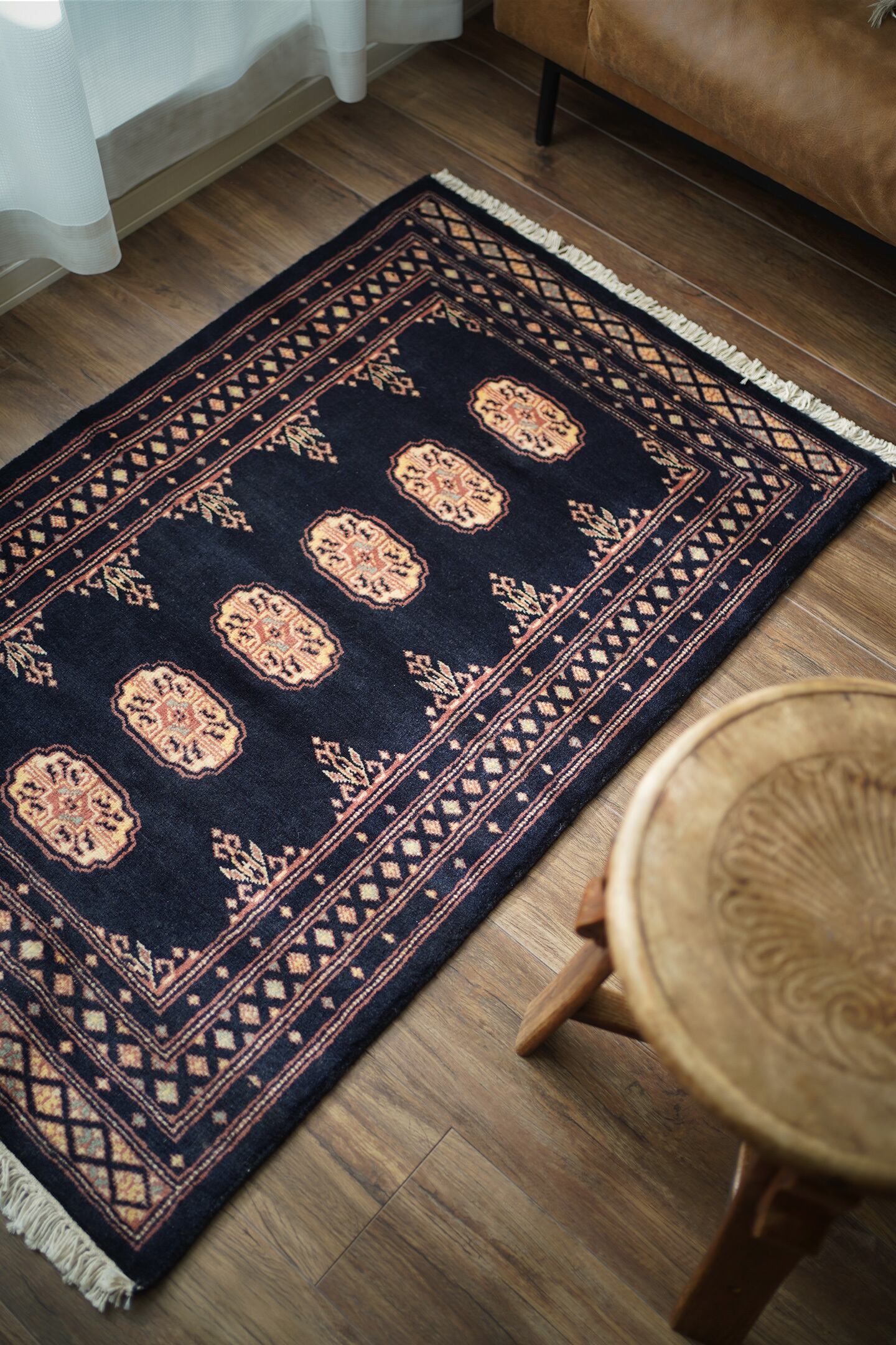 パキスタン北東部の都市ラホールで織られたヴィンテージラグ。"ボハラ"と呼ばれる象の足跡をモデルにしたとされる紋様が織り込まれたデザインで、パキスタンラグ特有の光沢感のある艶が美しい一枚。黒に近い濃紺をベースに、淡いピンク、アイボリーの色構成で、アクセントカラーに薄い水色が使われています。表面はふわふわとした気持ちの良い優しい肌触りで、厚みは9mm程度。ダメージなどもなく、パーフェクトなコンディションです。大きめのキャビネット前やブックシェルフ前、洗面スペースやウォークインクローゼットなどにどうぞ。