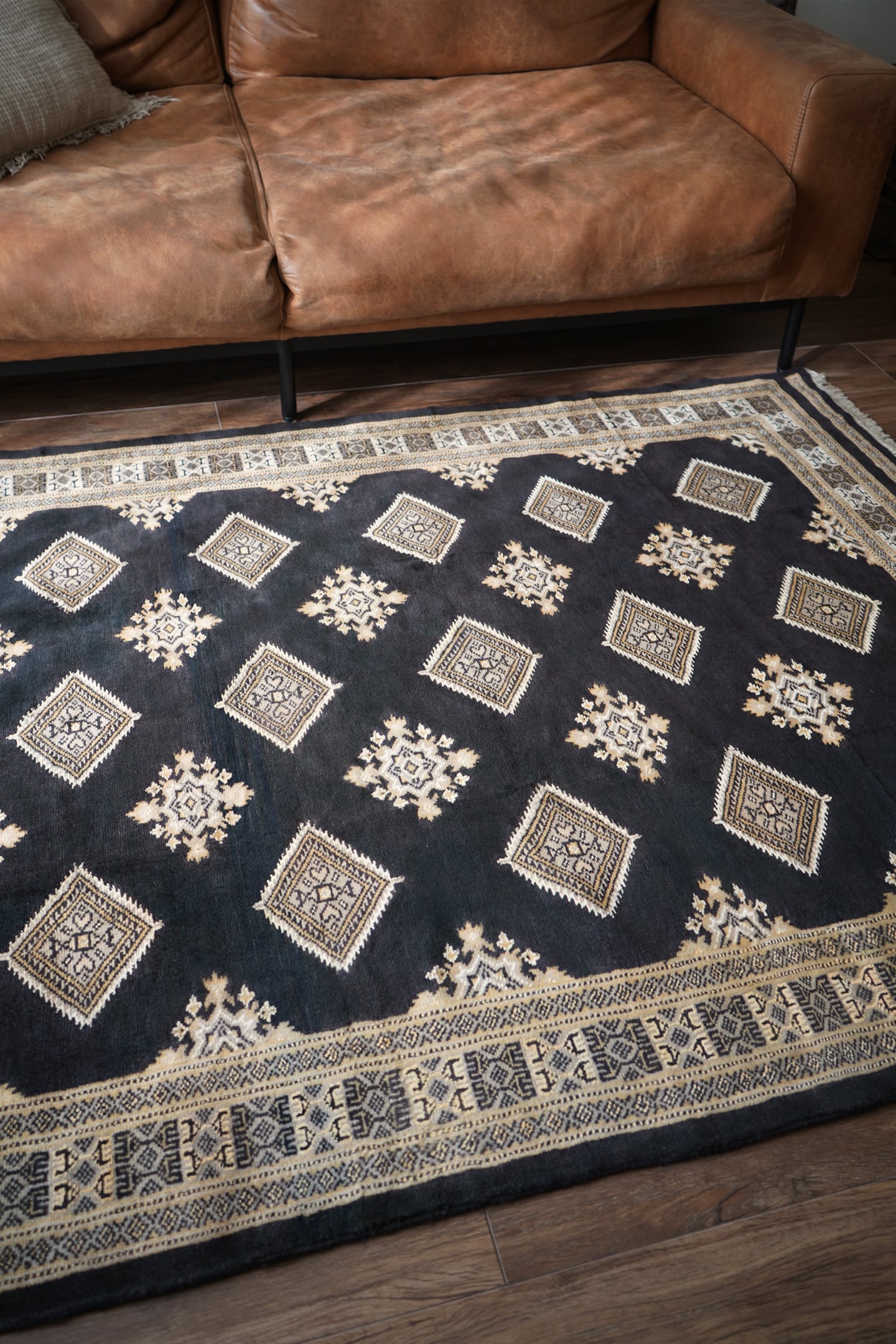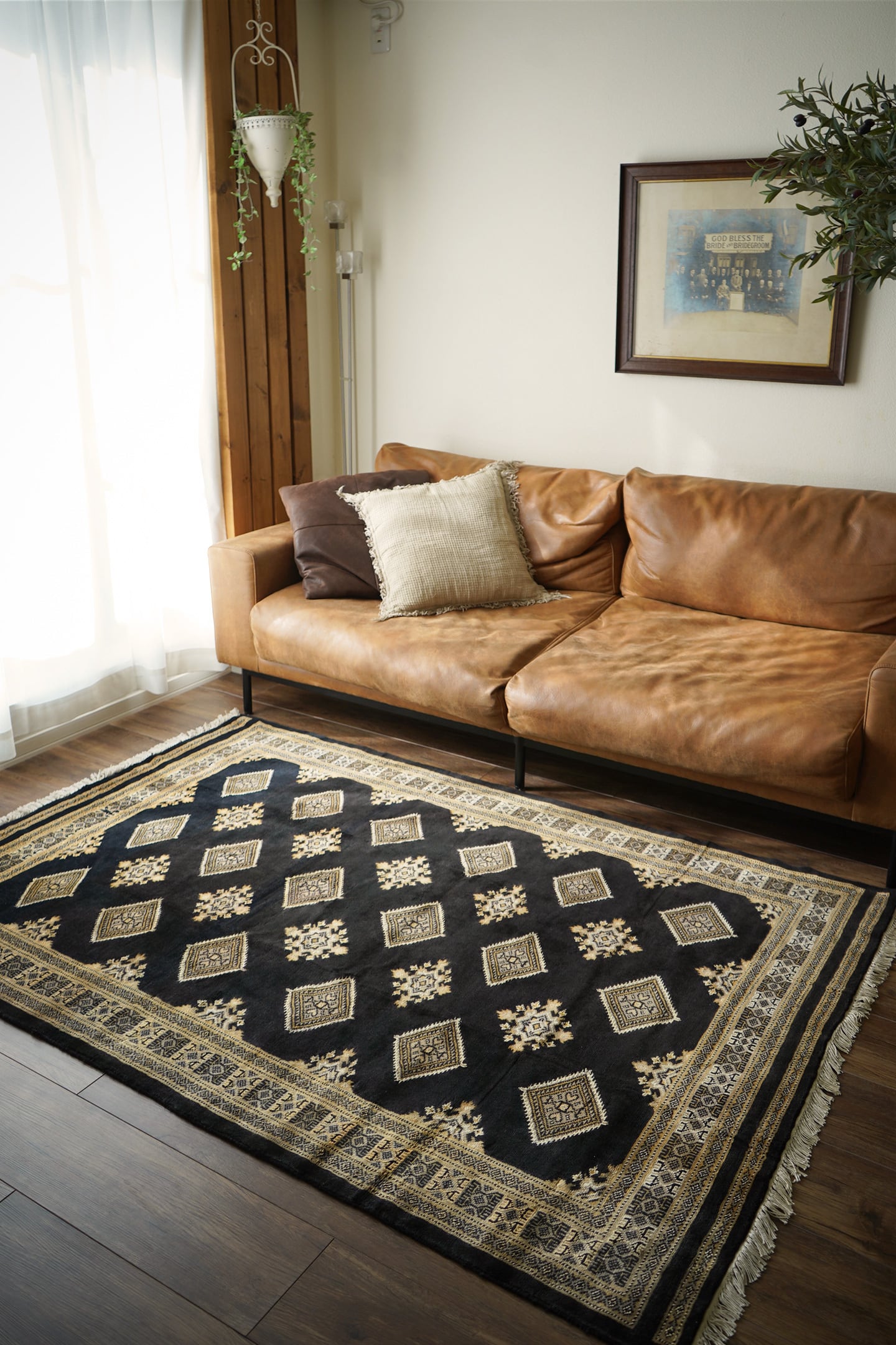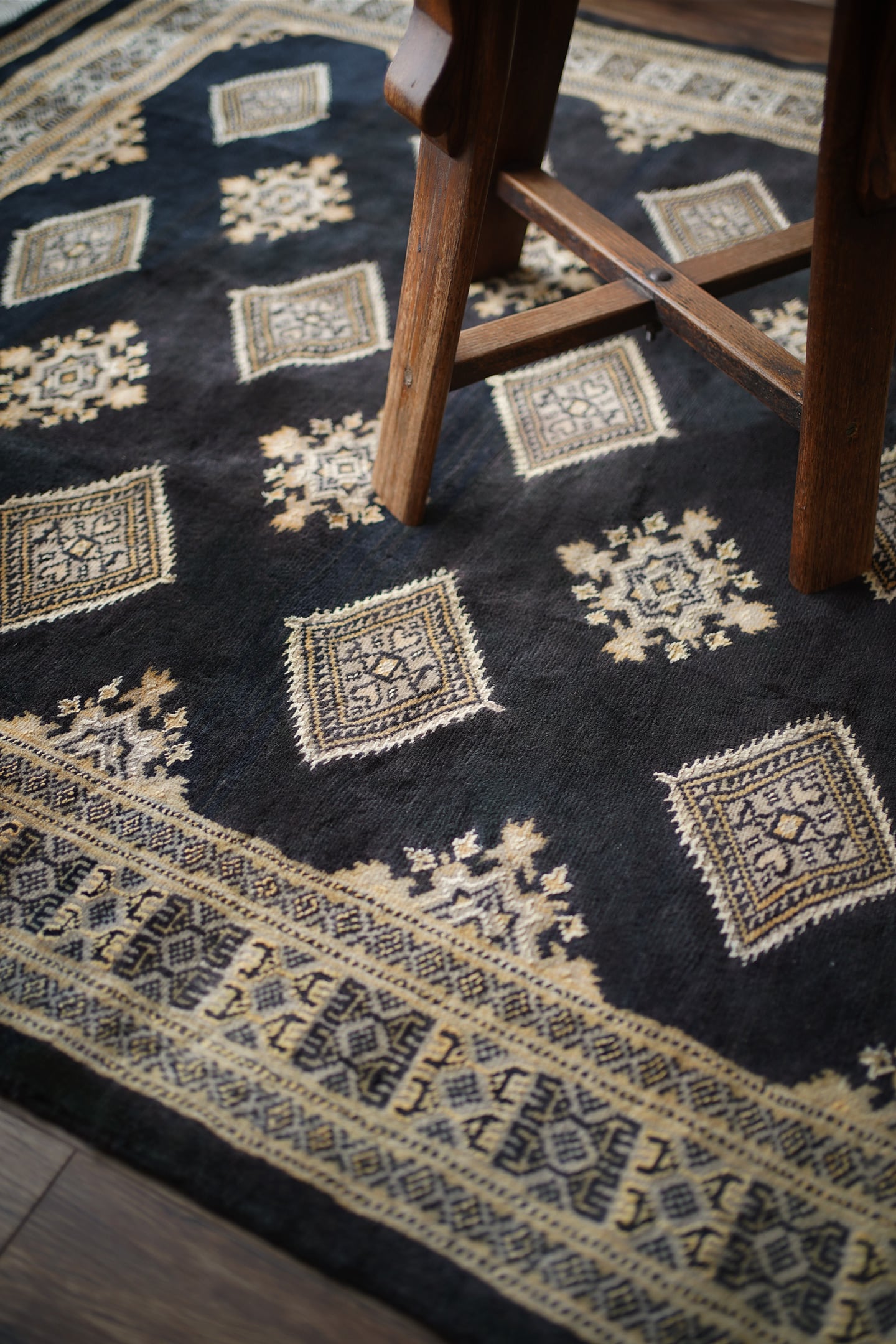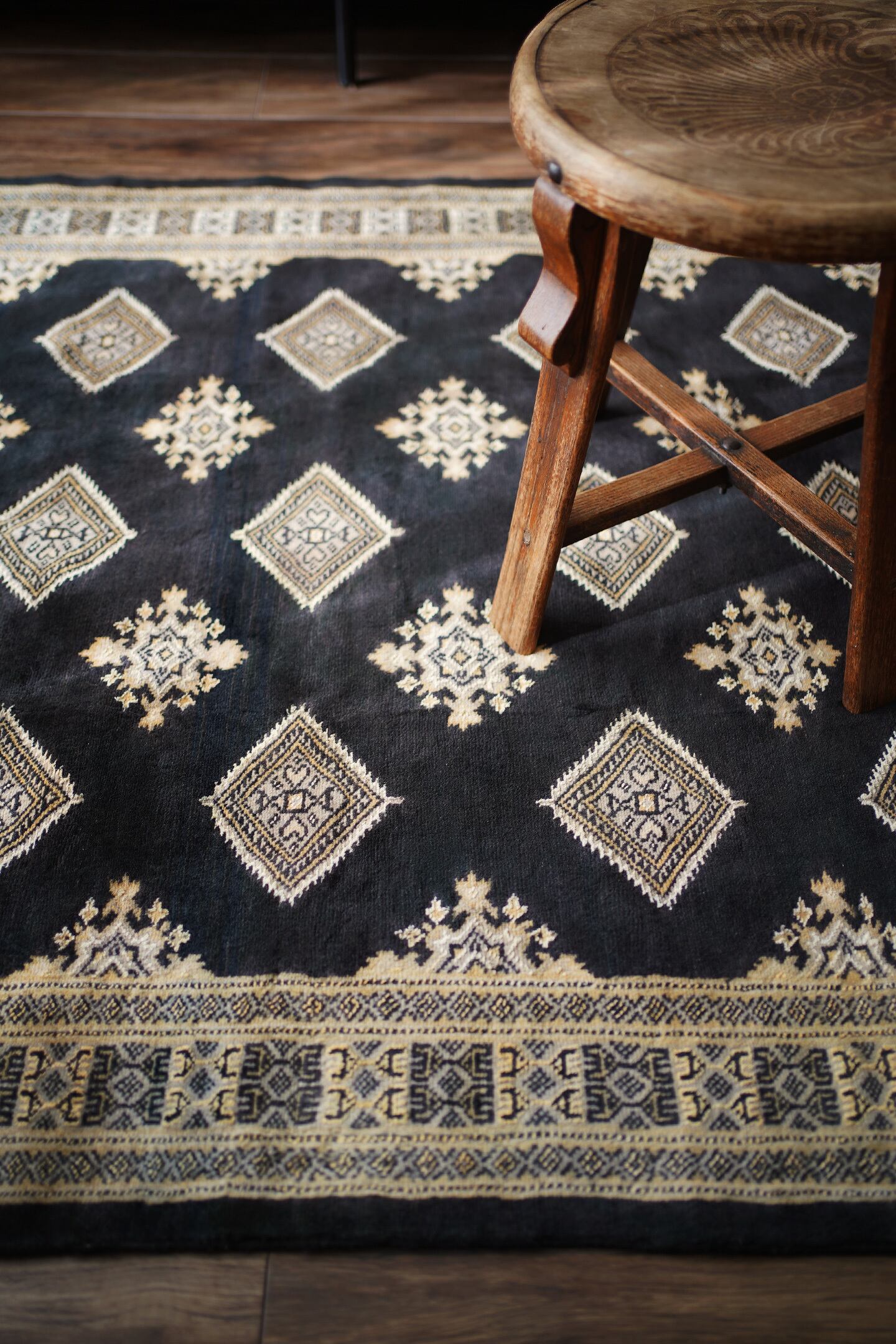 パキスタン北東部の都市ラホールで織られたヴィンテージラグ。パキスタンラグ特有の幾何学模様が織り込まれたデザインで、光沢感のある艶が美しい一枚。パキスタンラグでは珍しい黒色ベースの配色で、その他クリーム色、ベージュ、薄い黄土色などが使われたシックでカッコいい雰囲気です。ふわっと柔らかく、優しいタッチの心地良い肌触りで、厚みは9mm程度。統一感のあるフラットな毛並みで非常に上質感があります。ダメージも見受けられずパーフェクトなコンディション。リビングのソファ前やベッドサイドサイド、テーブル下にもオススメです。